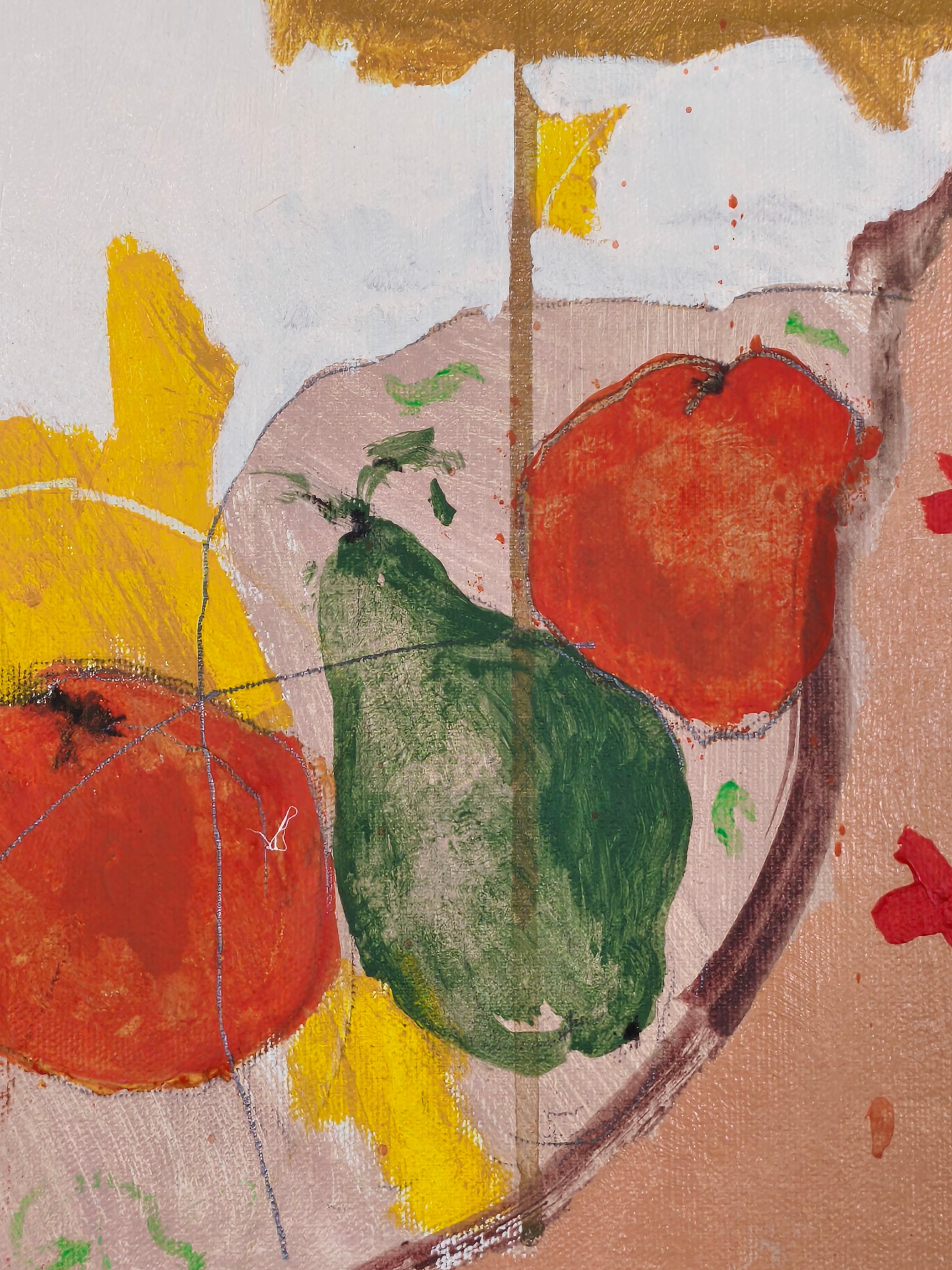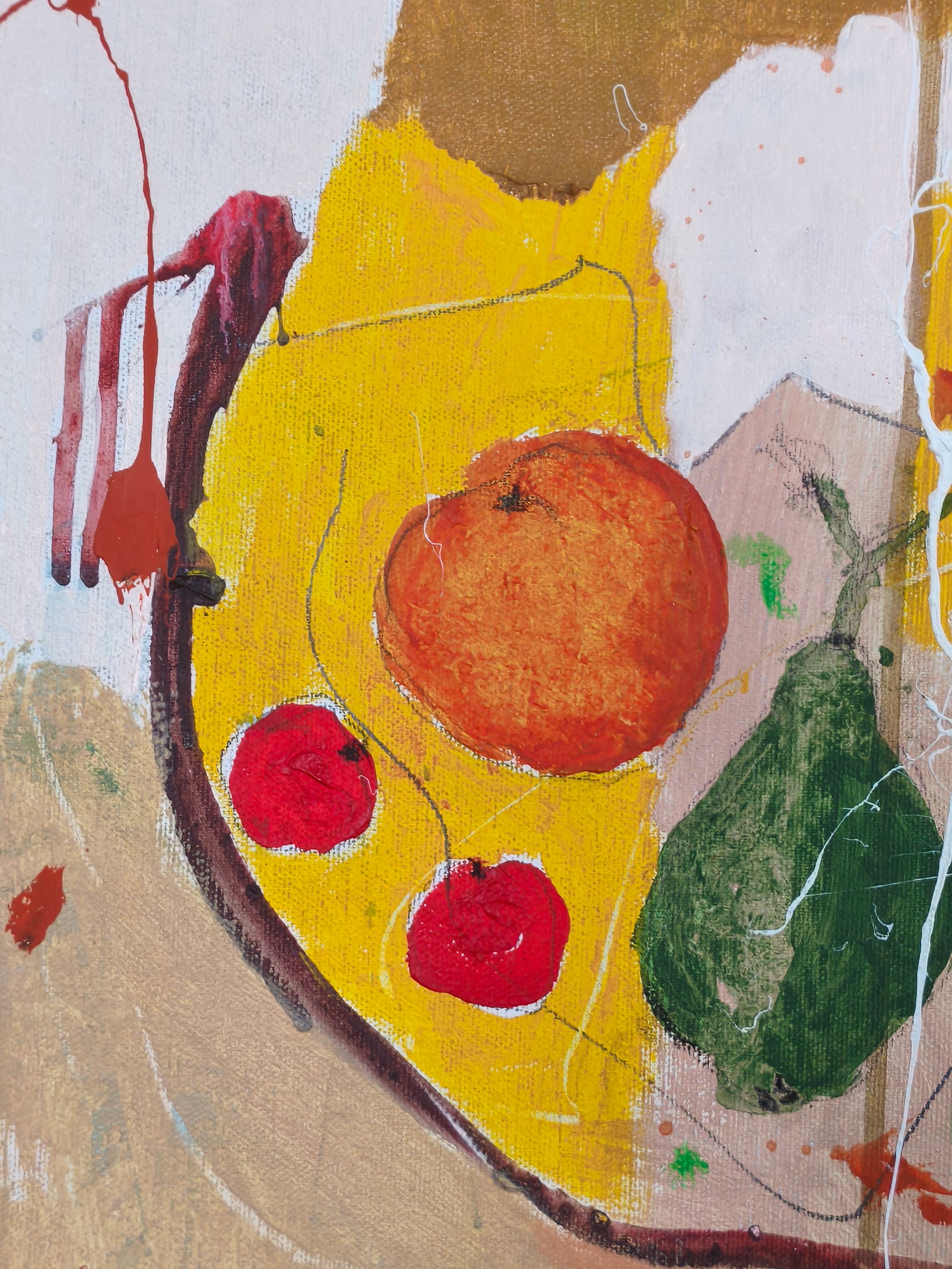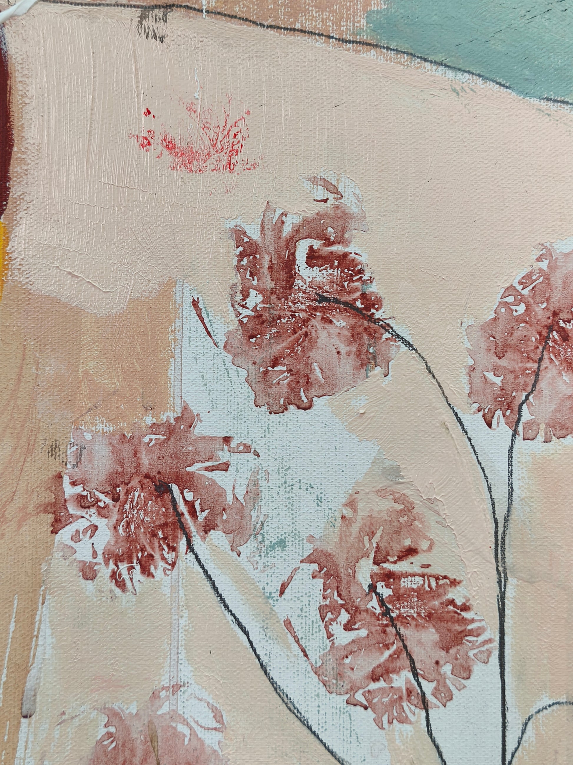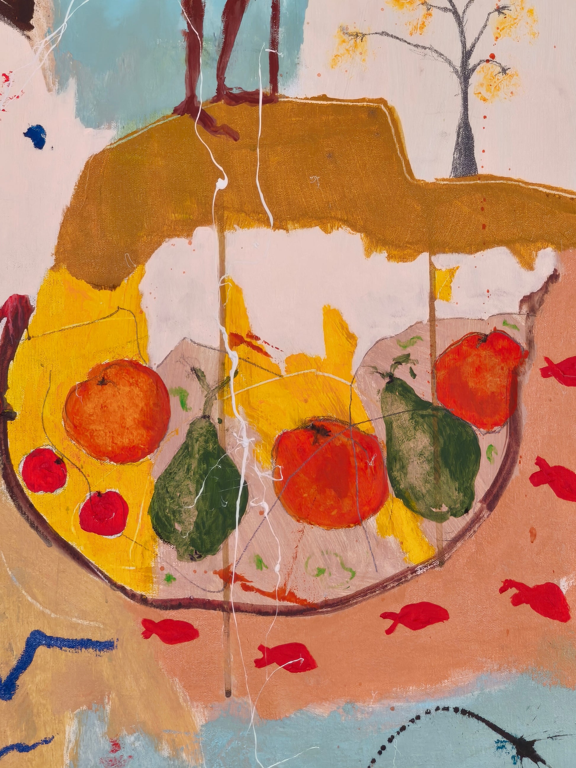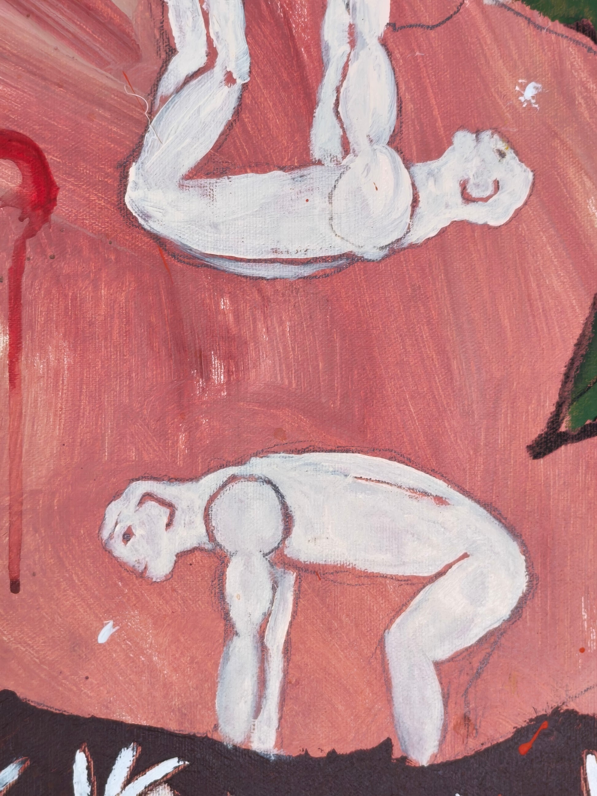 Pintura gestual, intuitiva, que deja que las cosas pasen y se apoya sobre lo que aparece. Aprovechando el accidente y aceptando las consecuencias.