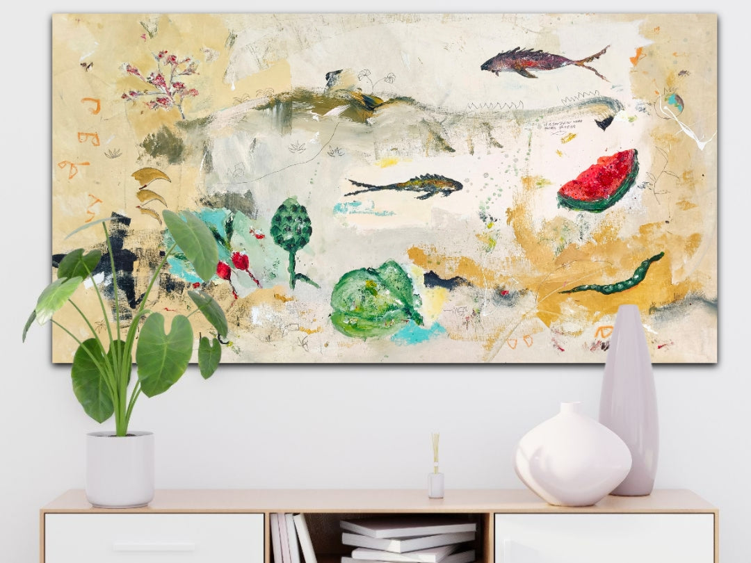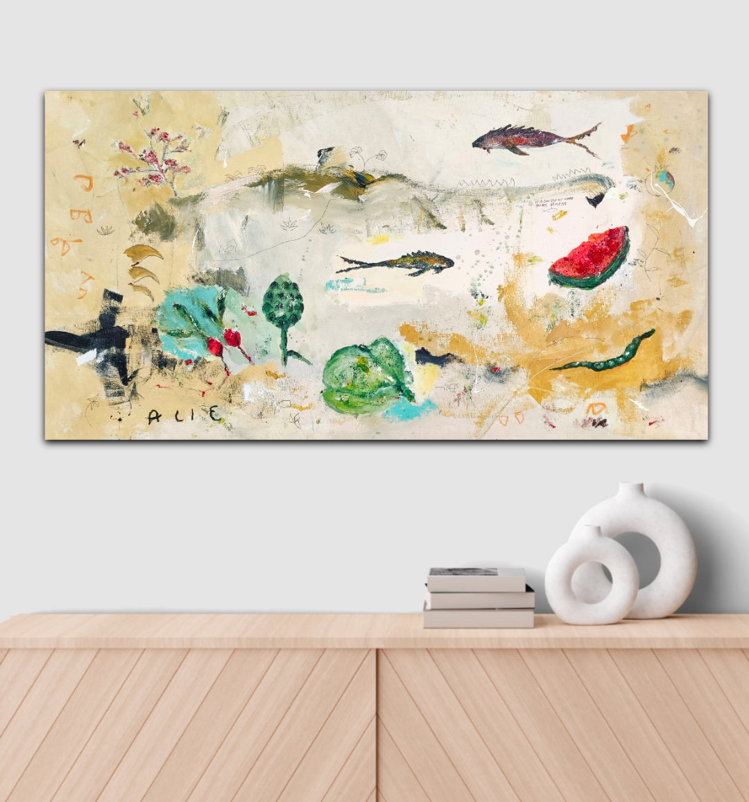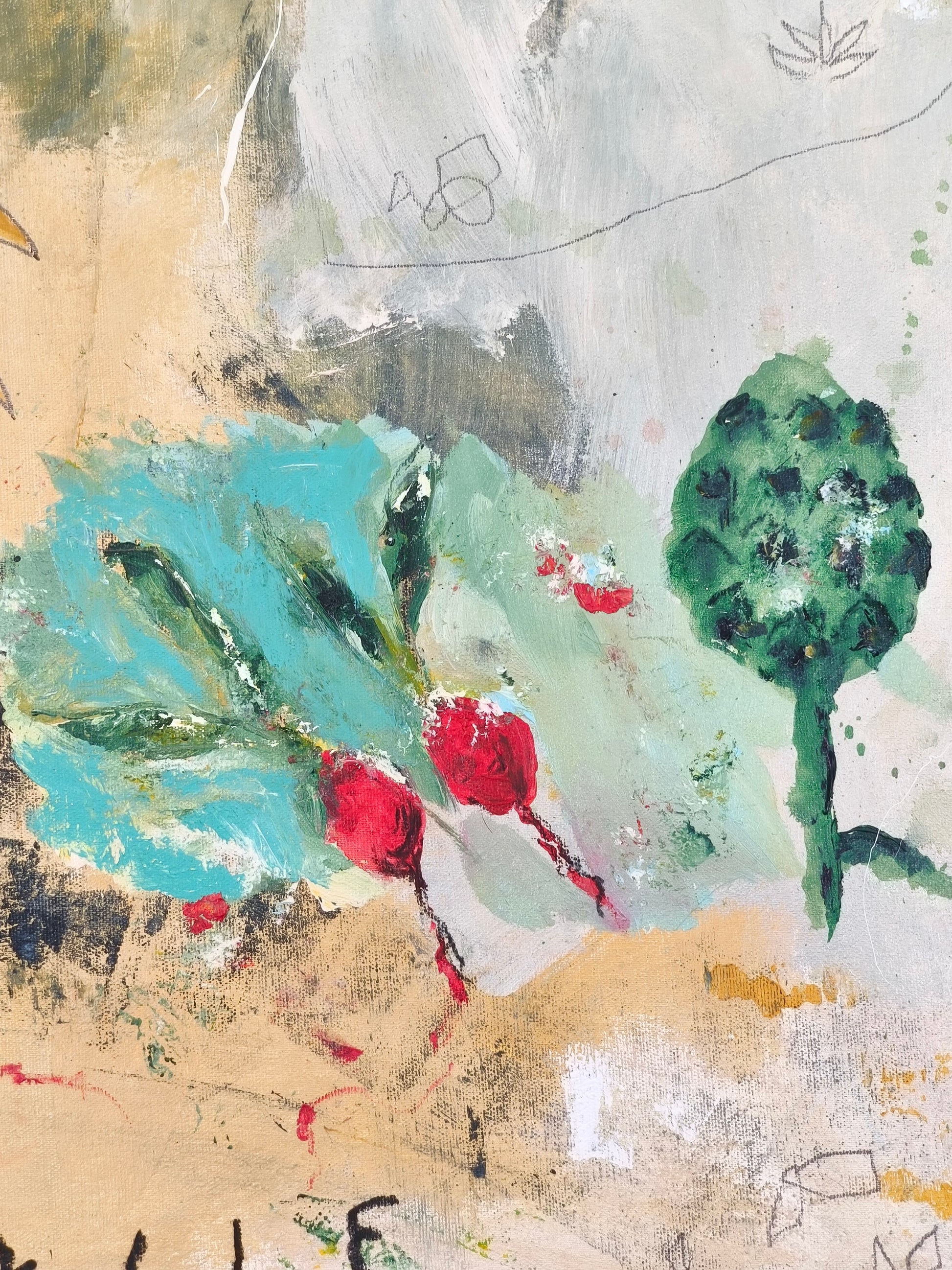 Técnica: acrílico, pigmentos, lápiz, carboncillo, gesso, ceras.