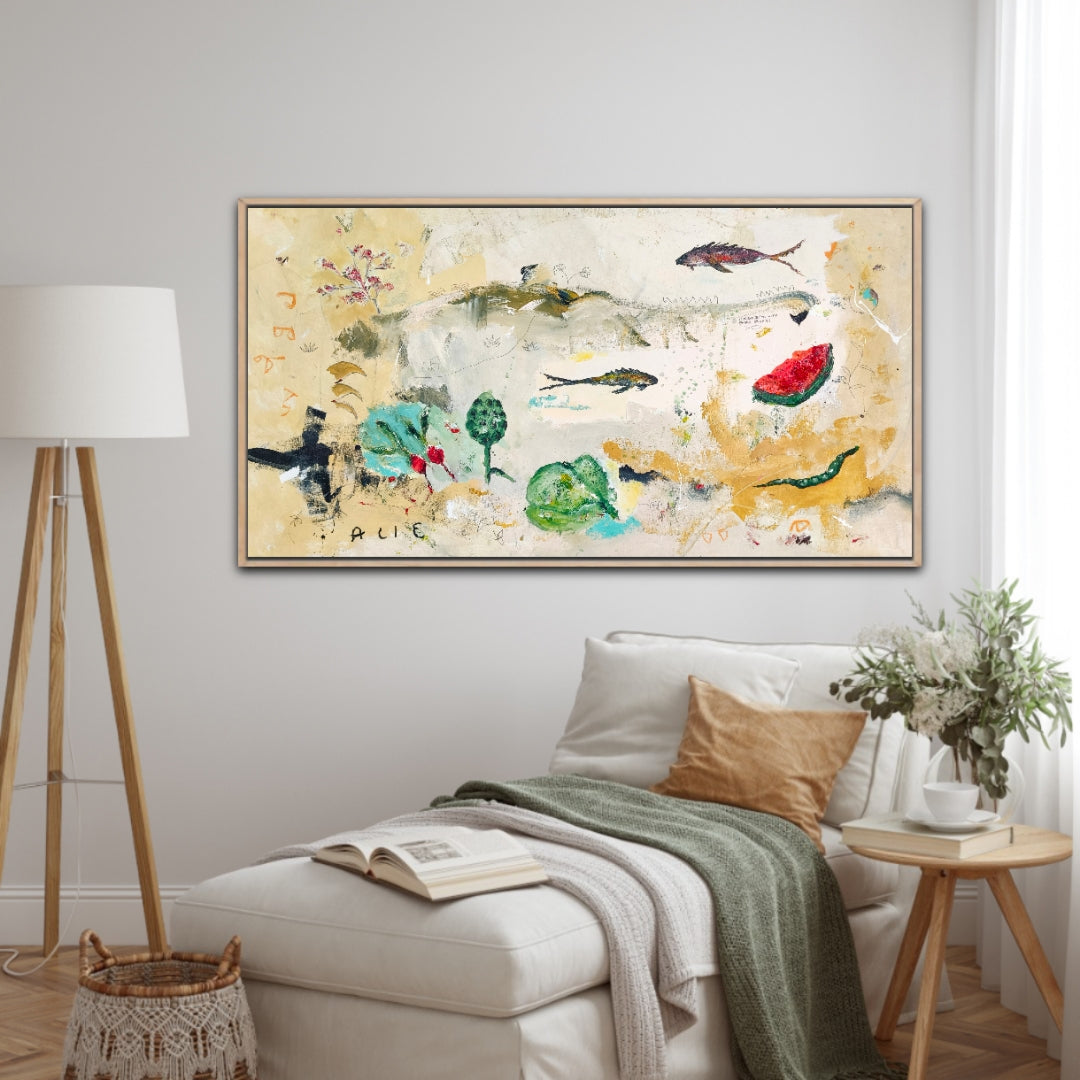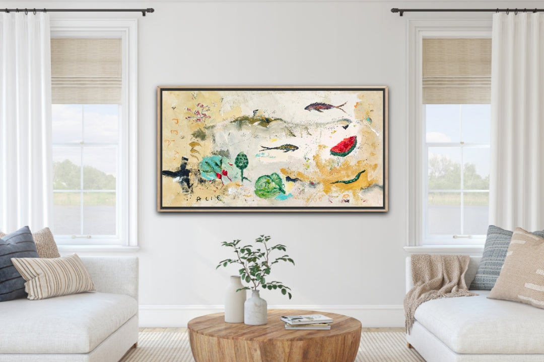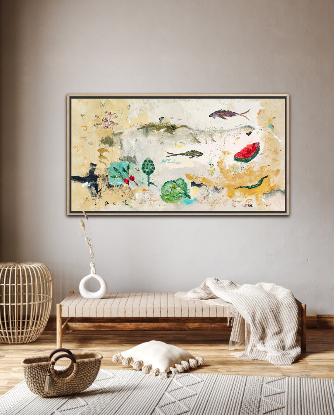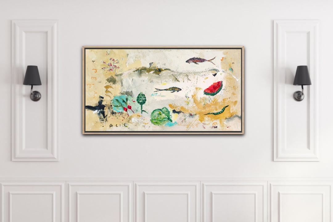 Técnica: acrílico, pigmentos, lápiz, carboncillo, gesso, ceras.