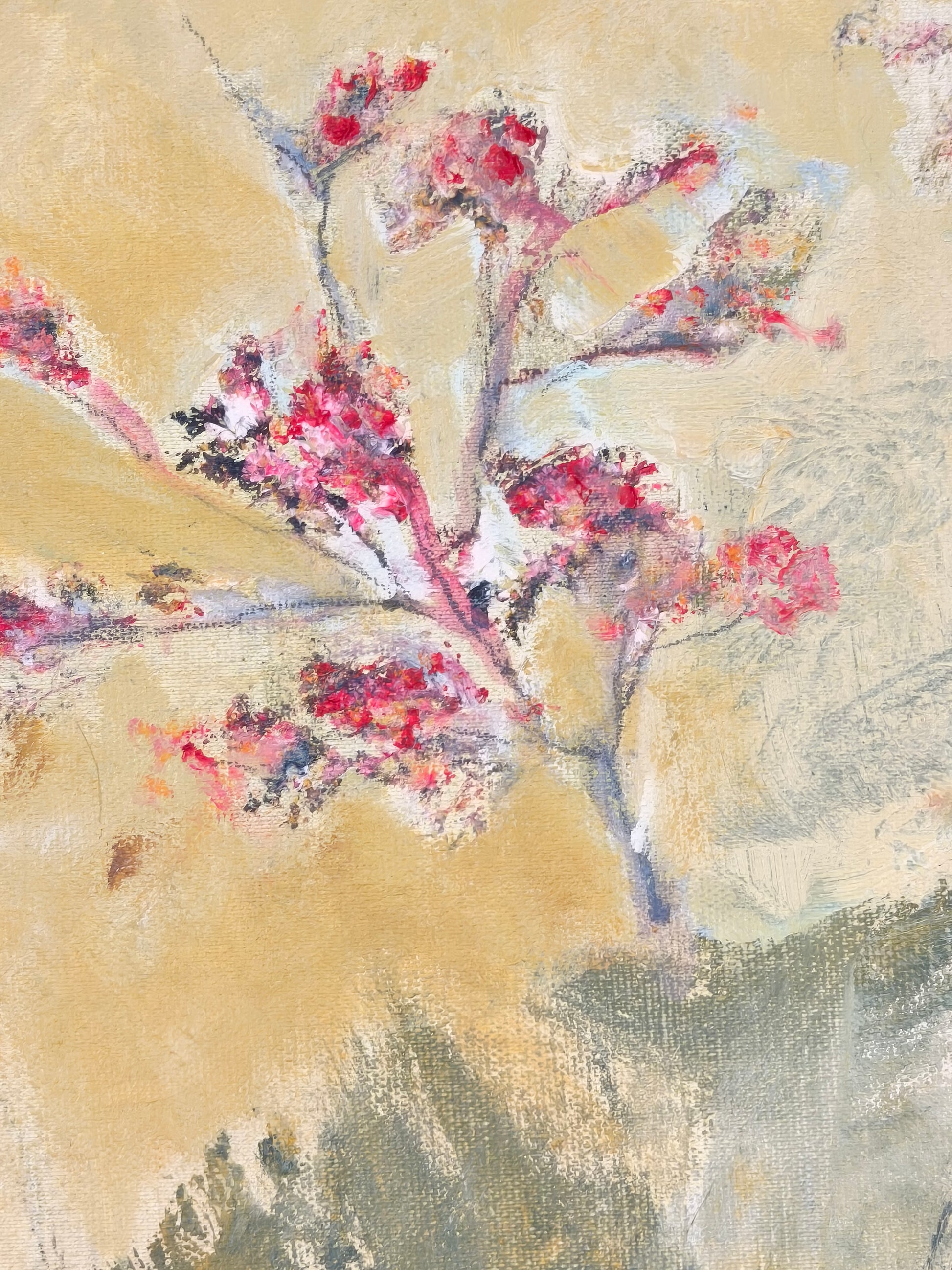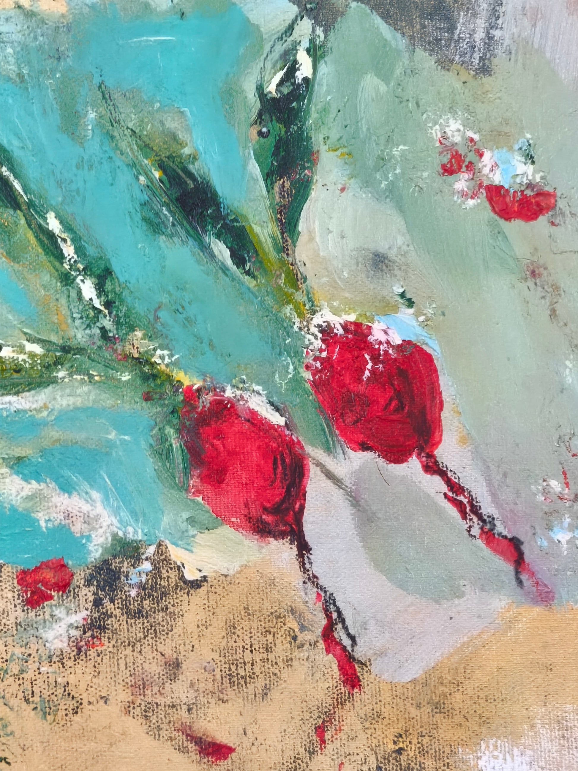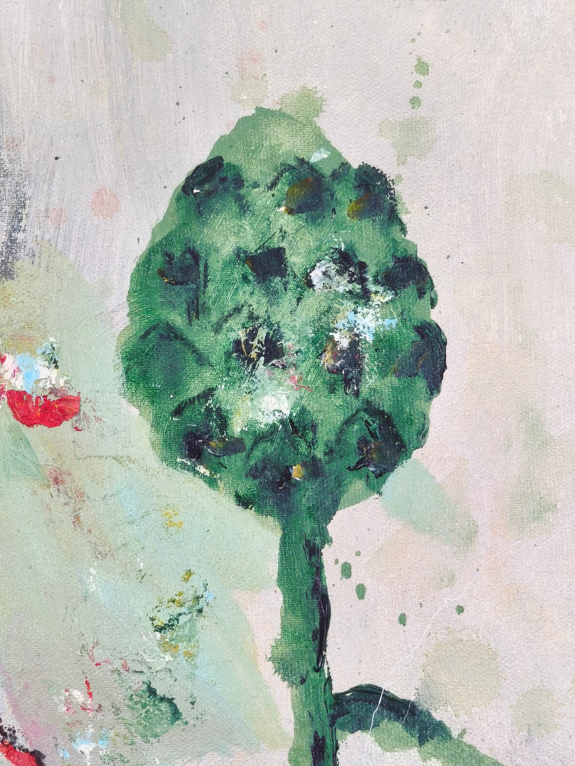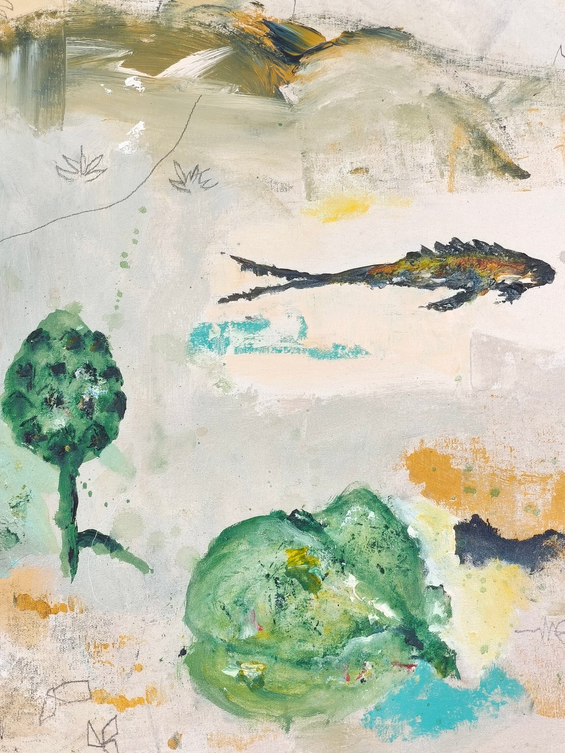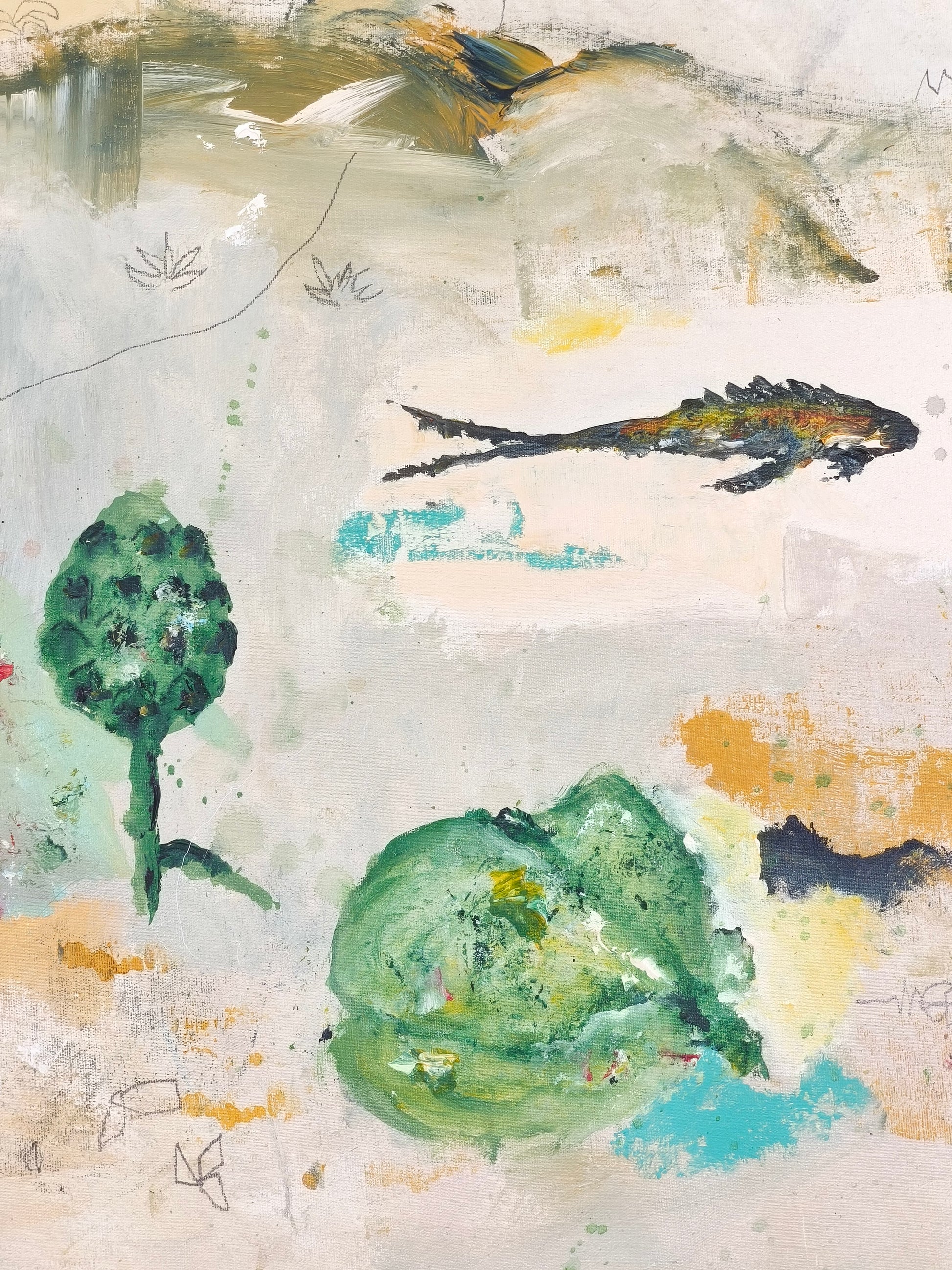 Pintura gestual, intuitiva, que deja que las cosas pasen y se apoya sobre lo que aparece. Aprovechando el accidente y aceptando las consecuencias.