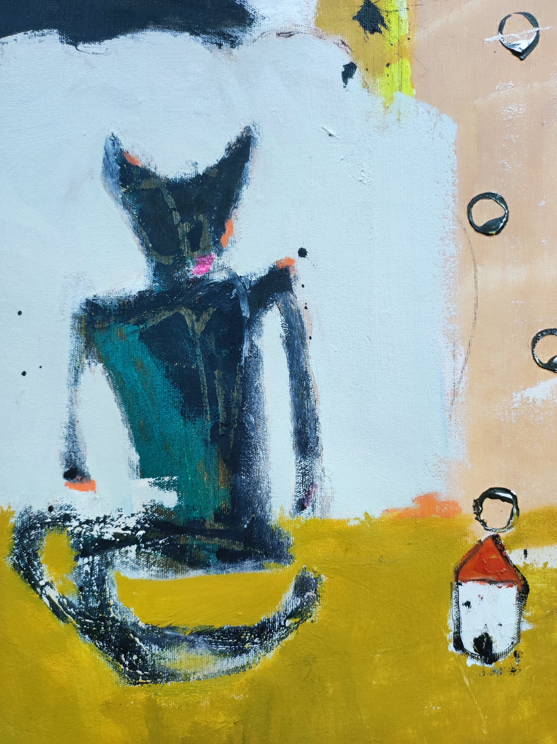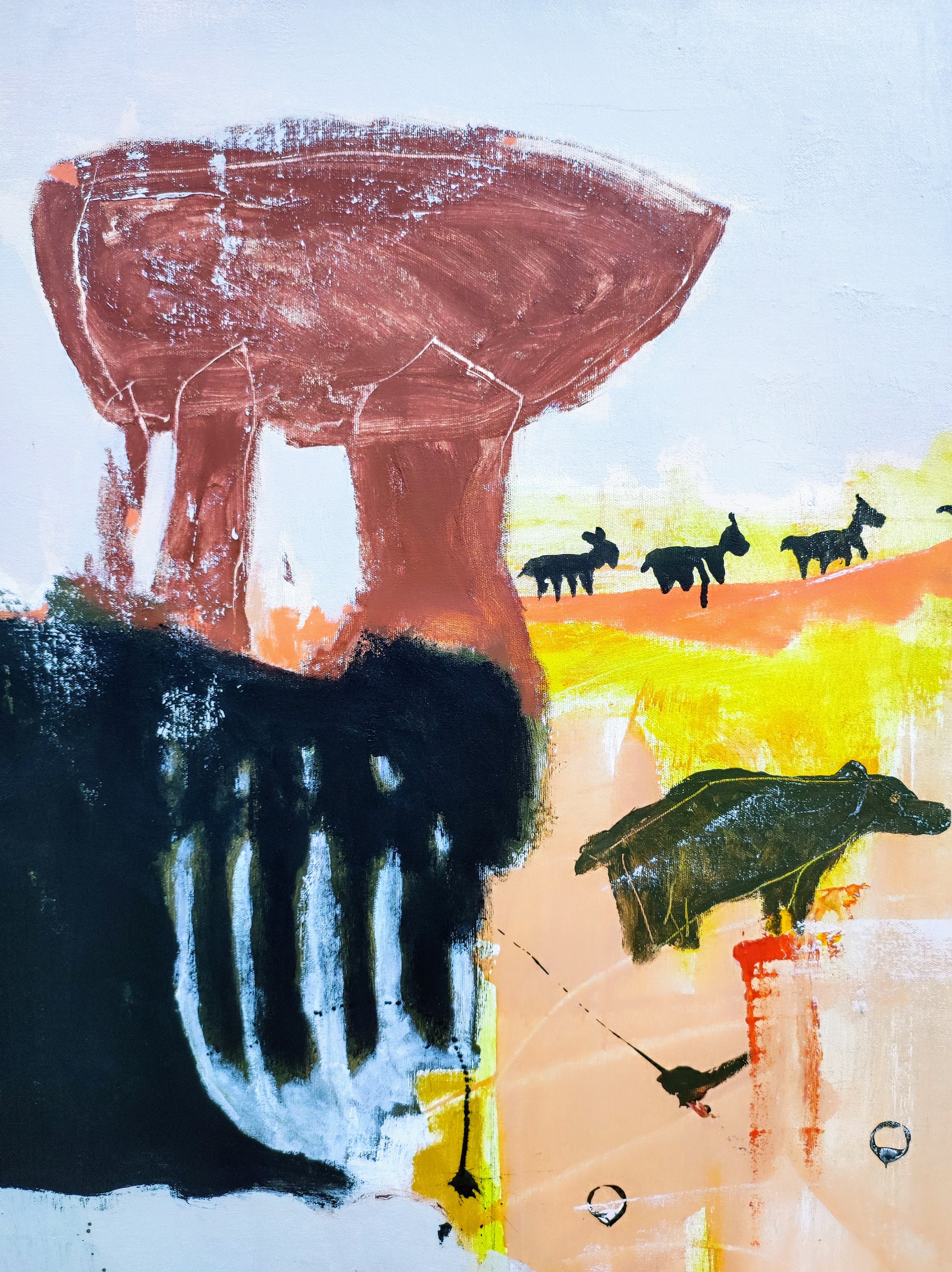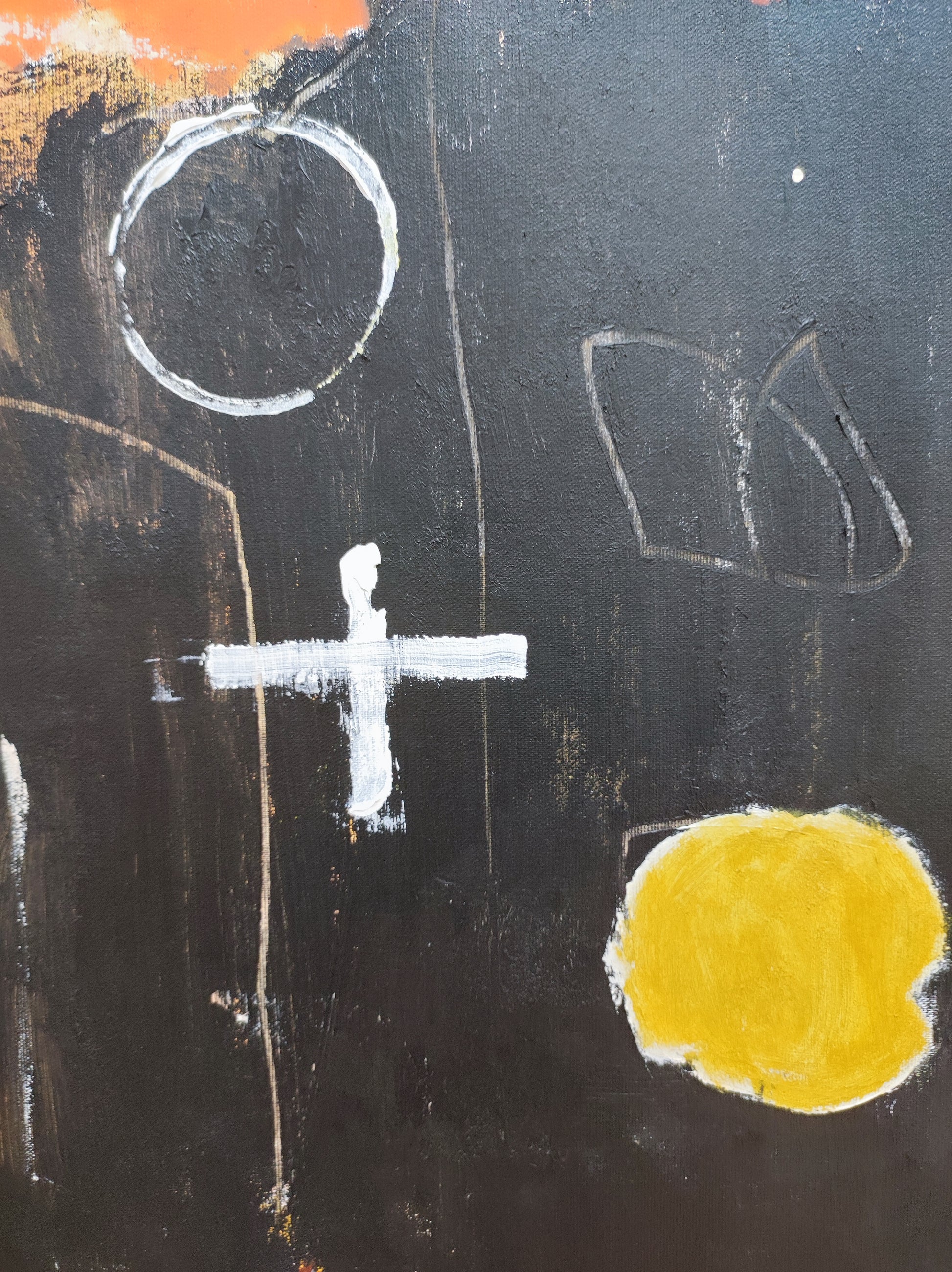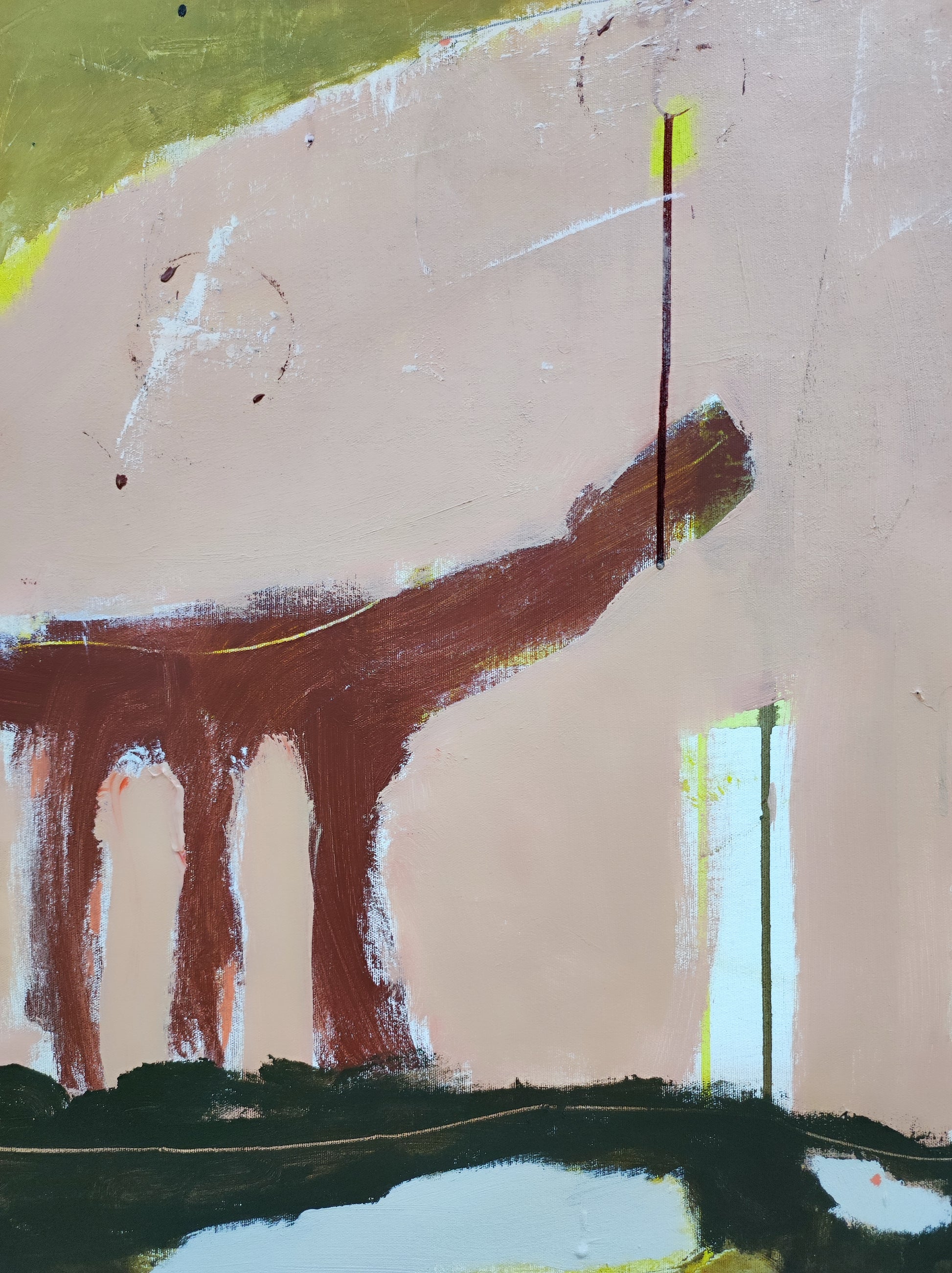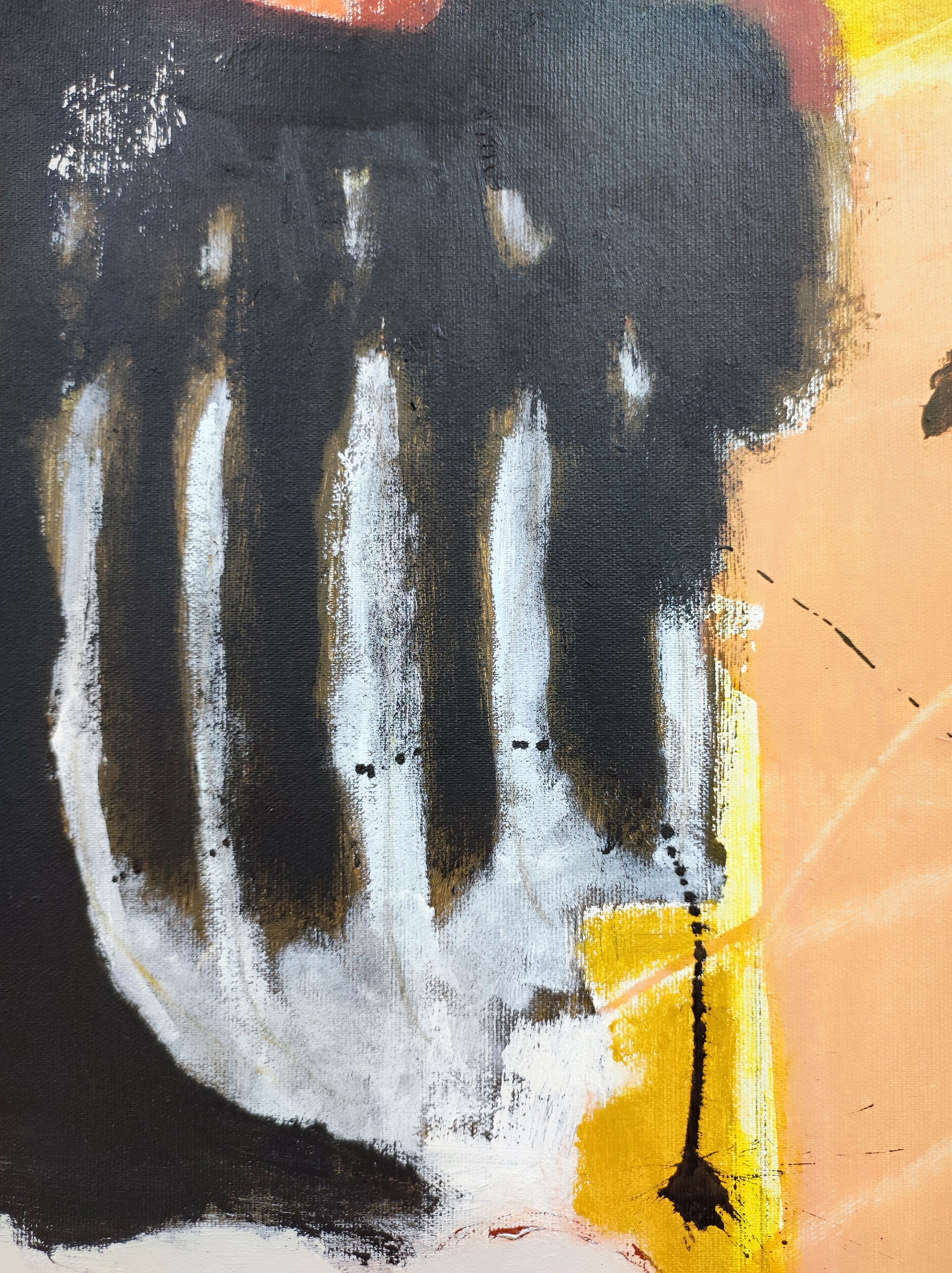 Pintura gestual, intuitiva, que deja que las cosas pasen y se apoya sobre lo que aparece. Aprovechando el accidente y aceptando las consecuencias.