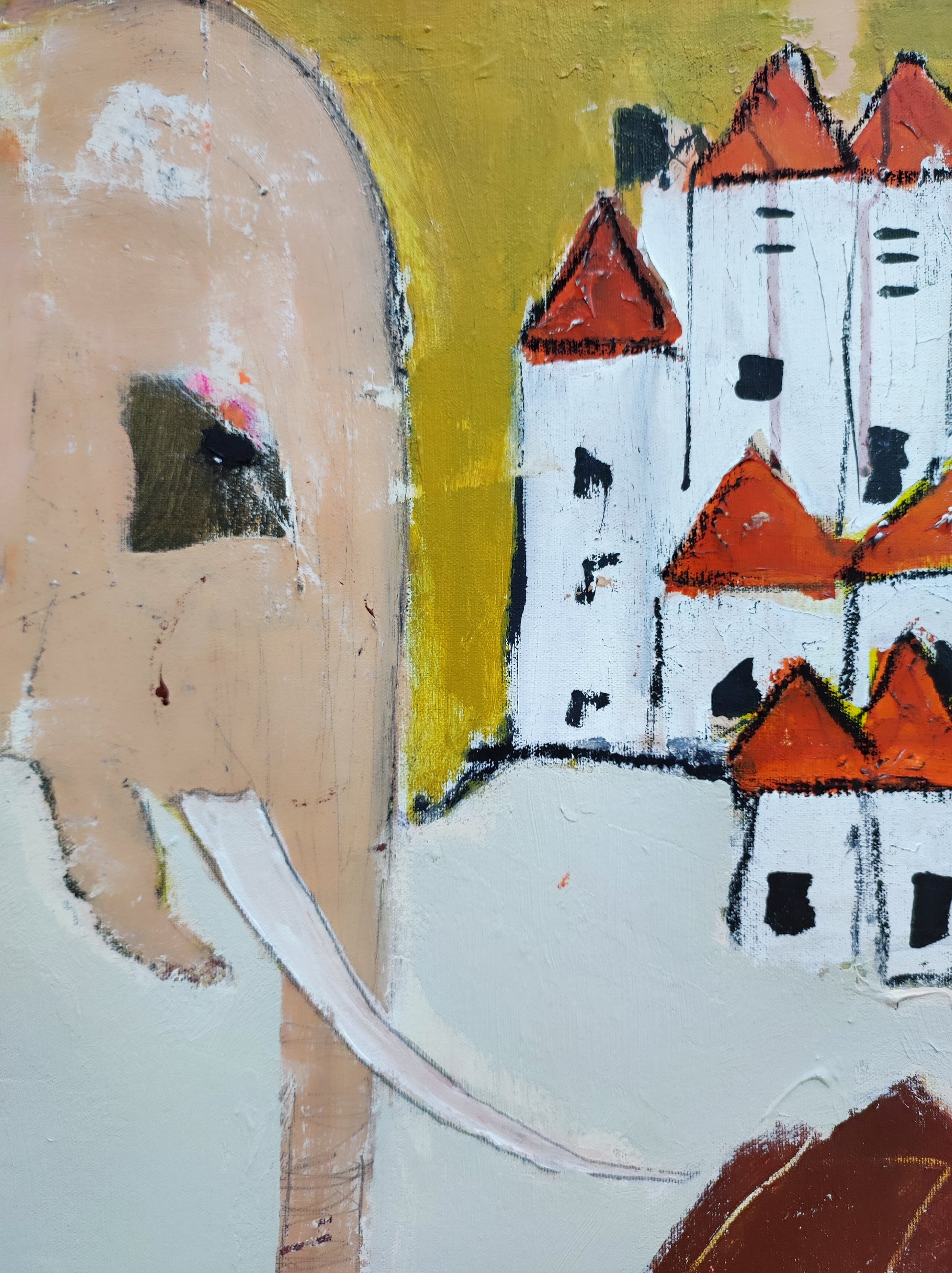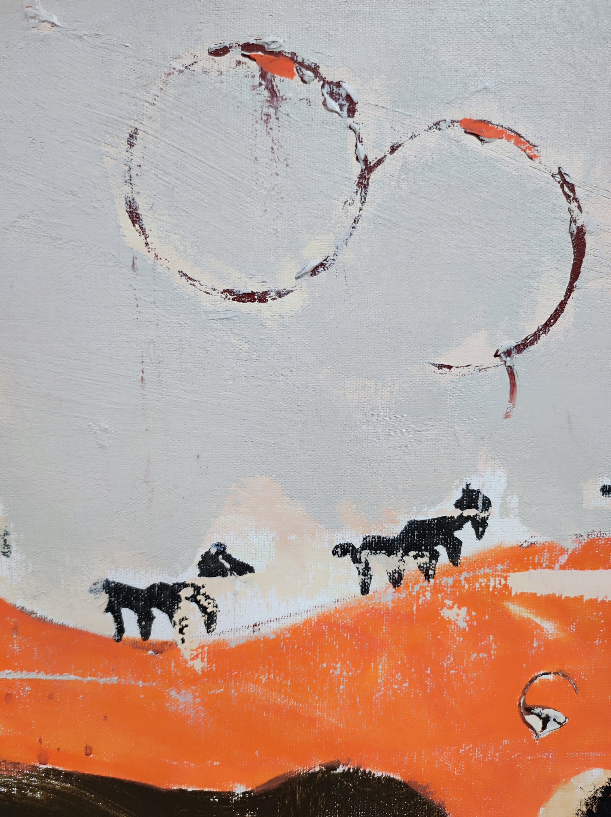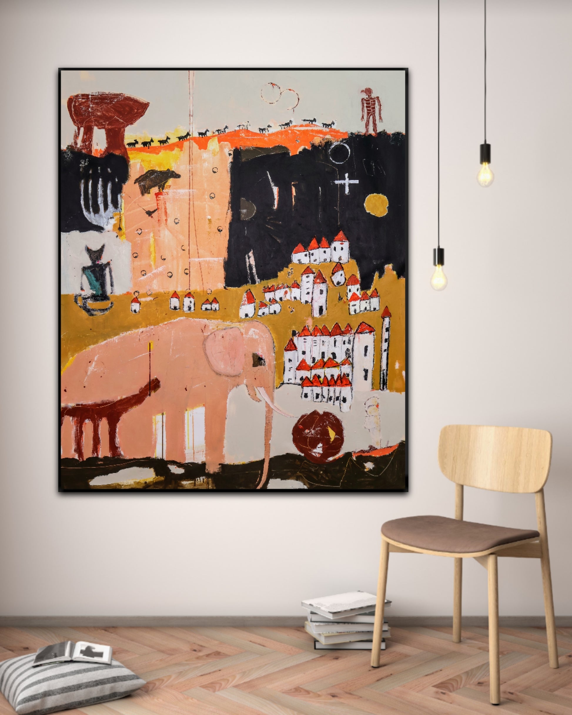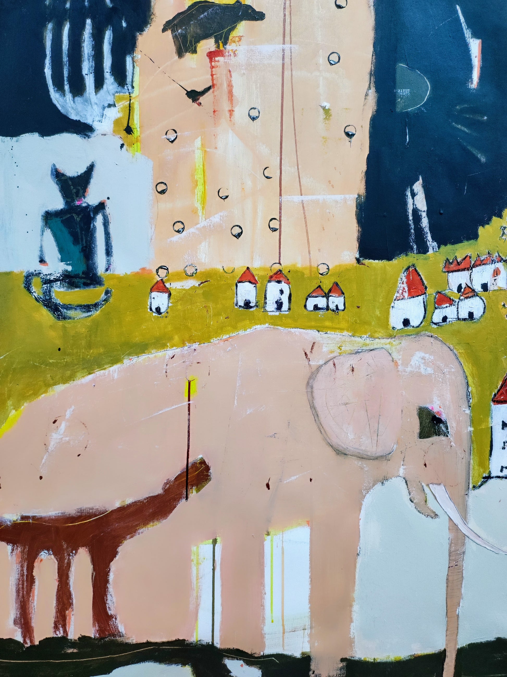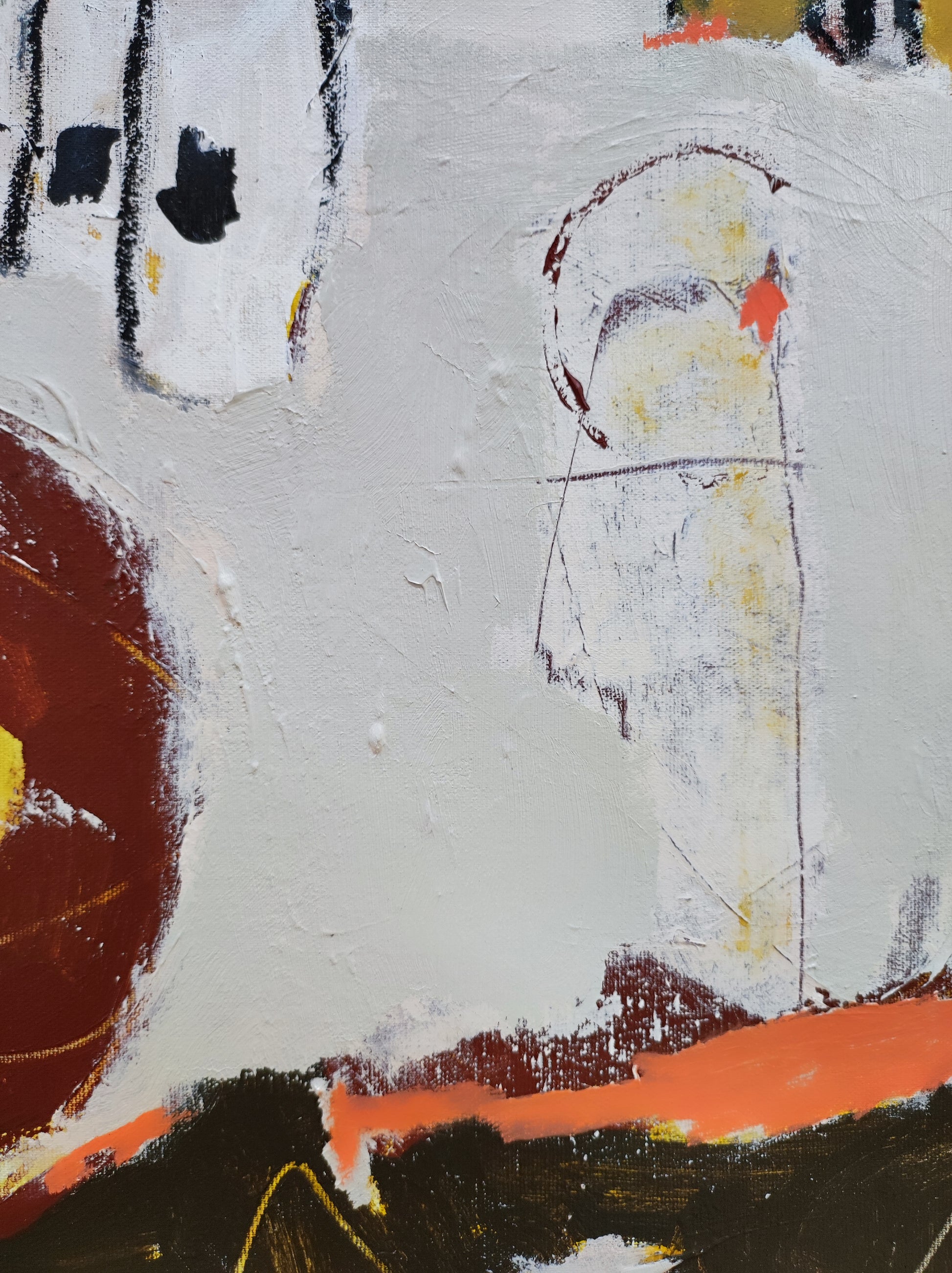 Pintura gestual, intuitiva, que deja que las cosas pasen y se apoya sobre lo que aparece. Aprovechando el accidente y aceptando las consecuencias.