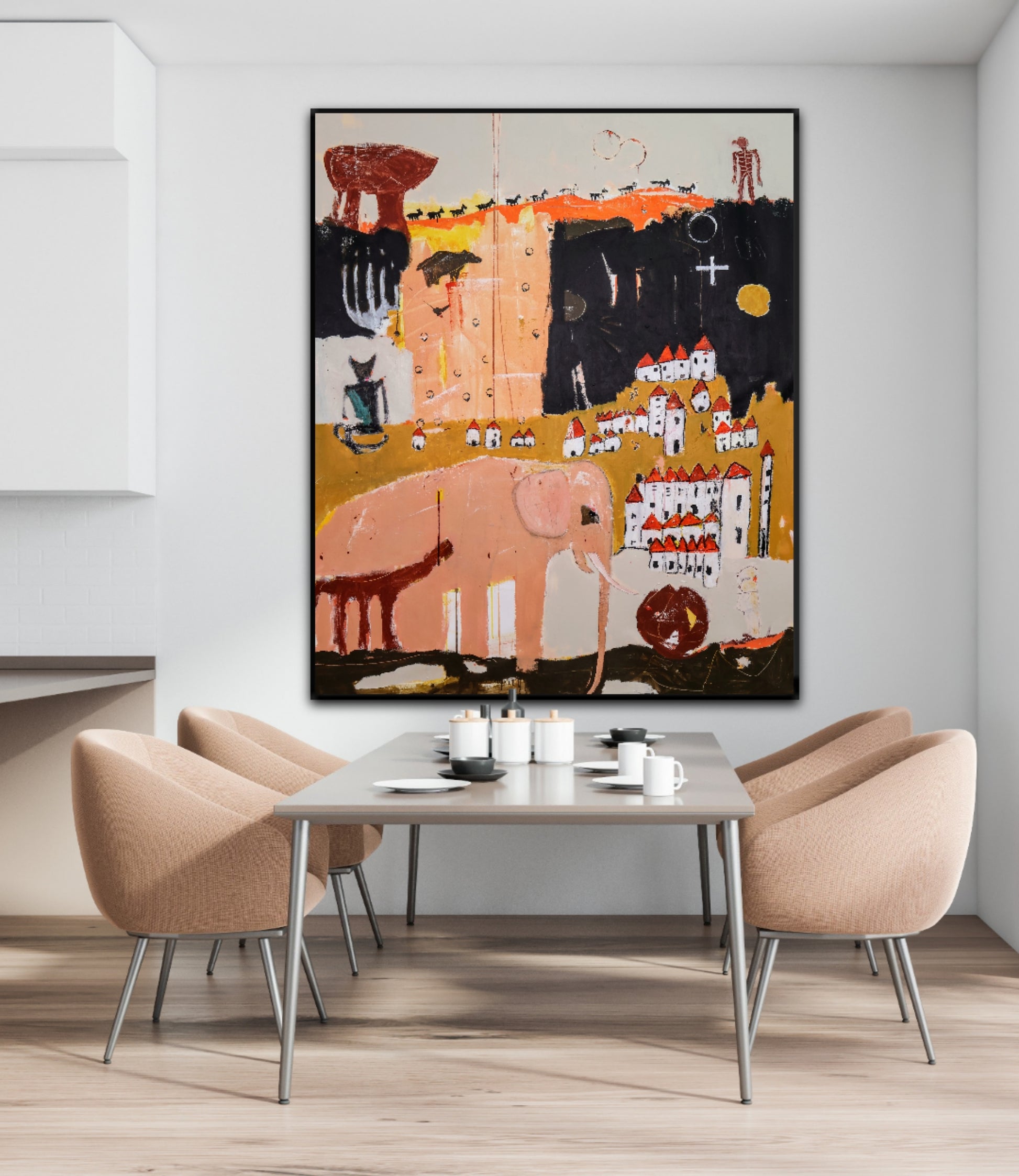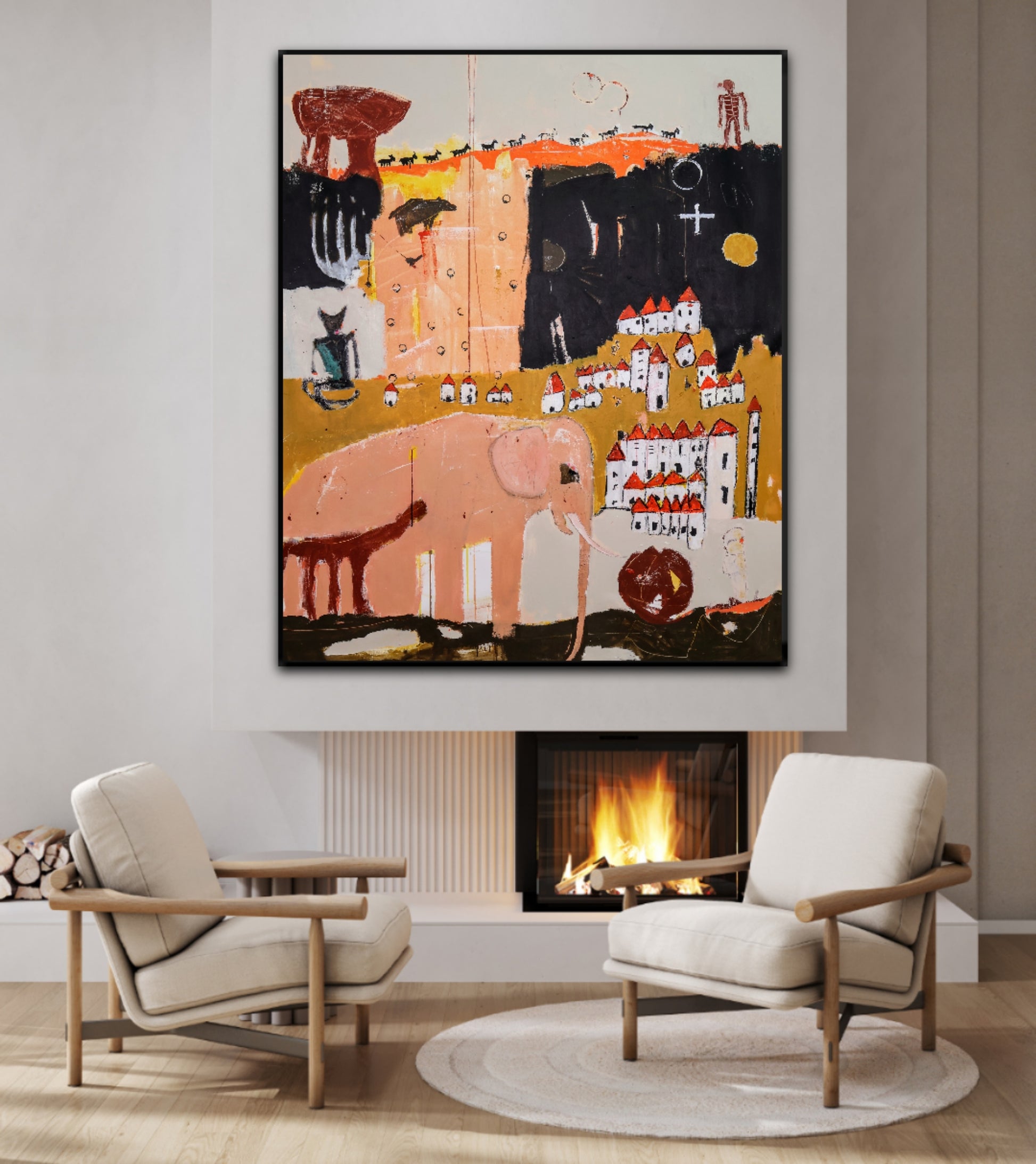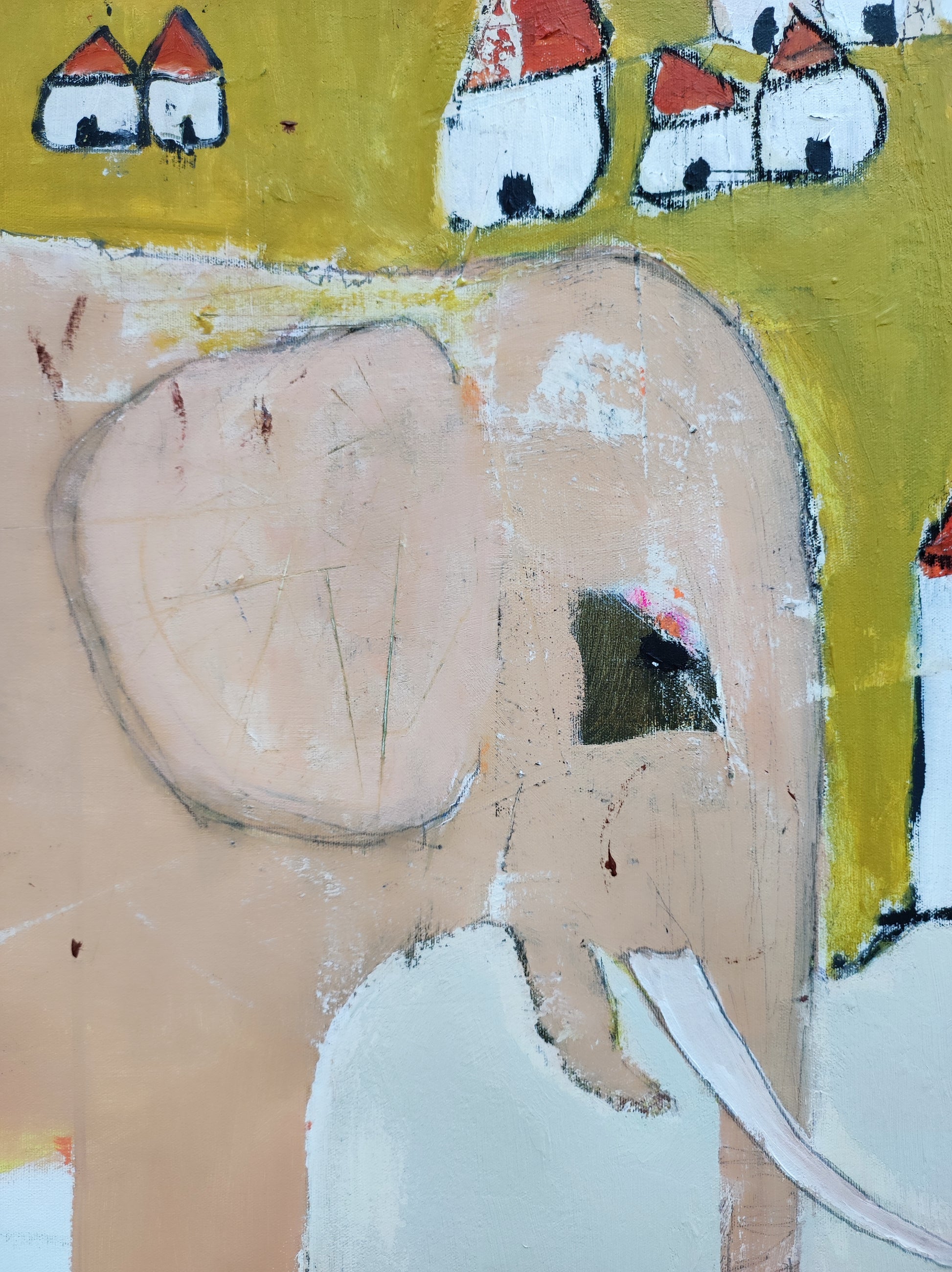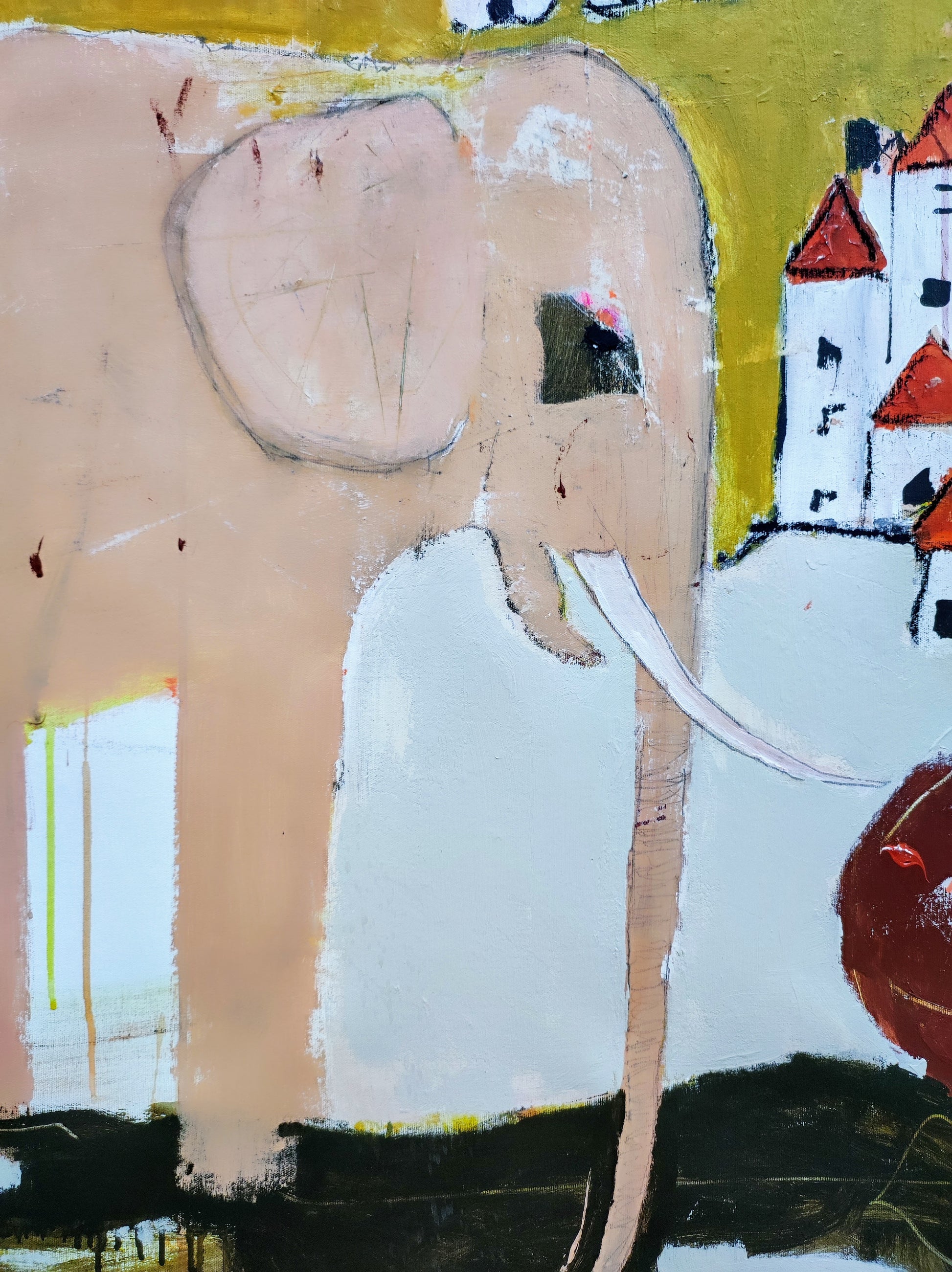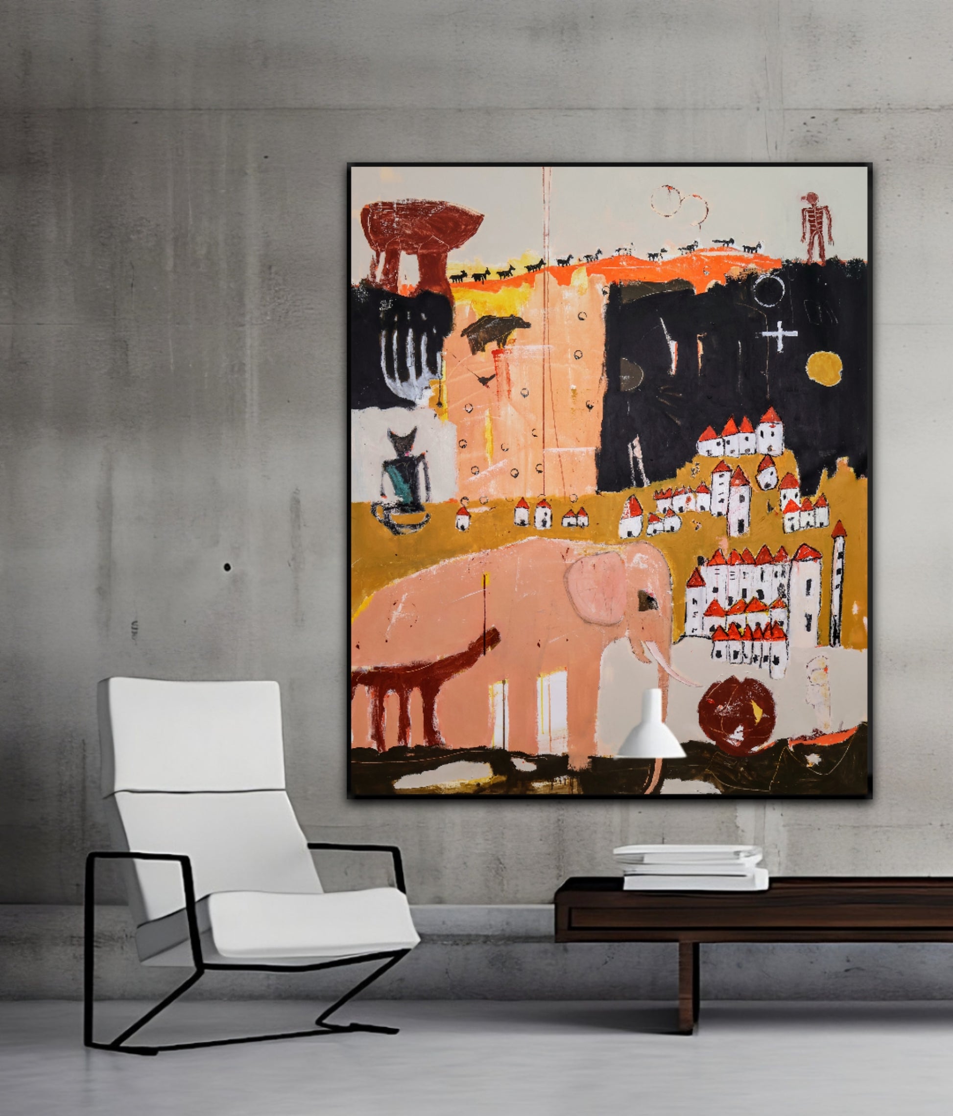 Pintura gestual, intuitiva, que deja que las cosas pasen y se apoya sobre lo que aparece. Aprovechando el accidente y aceptando las consecuencias.