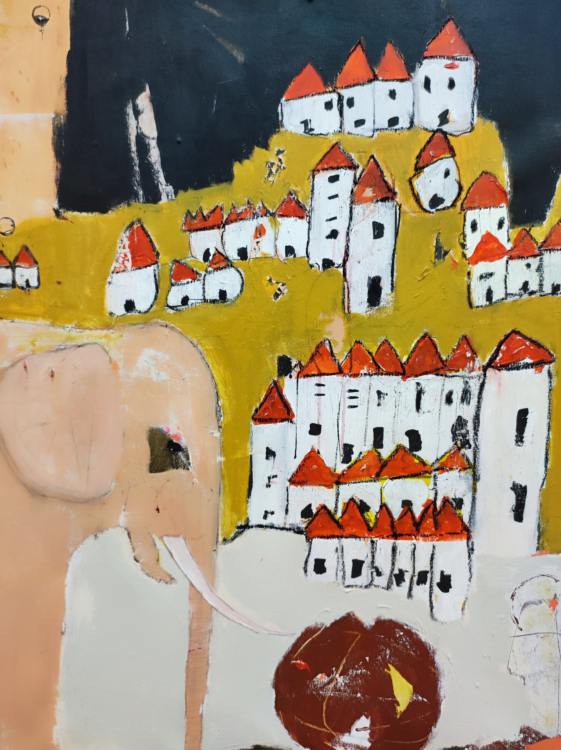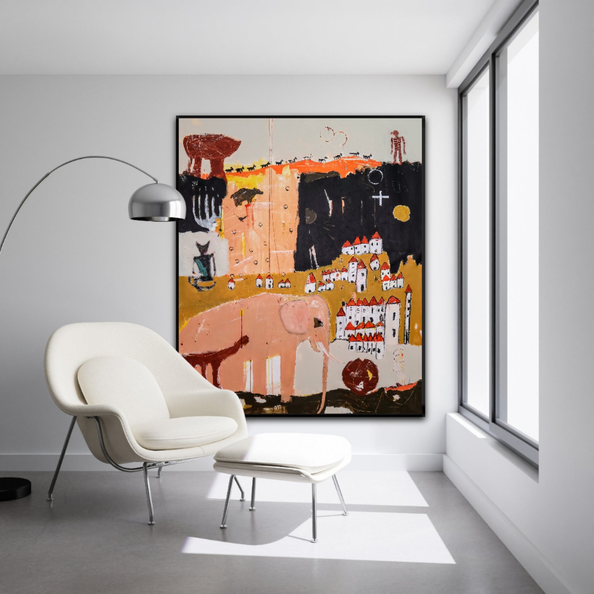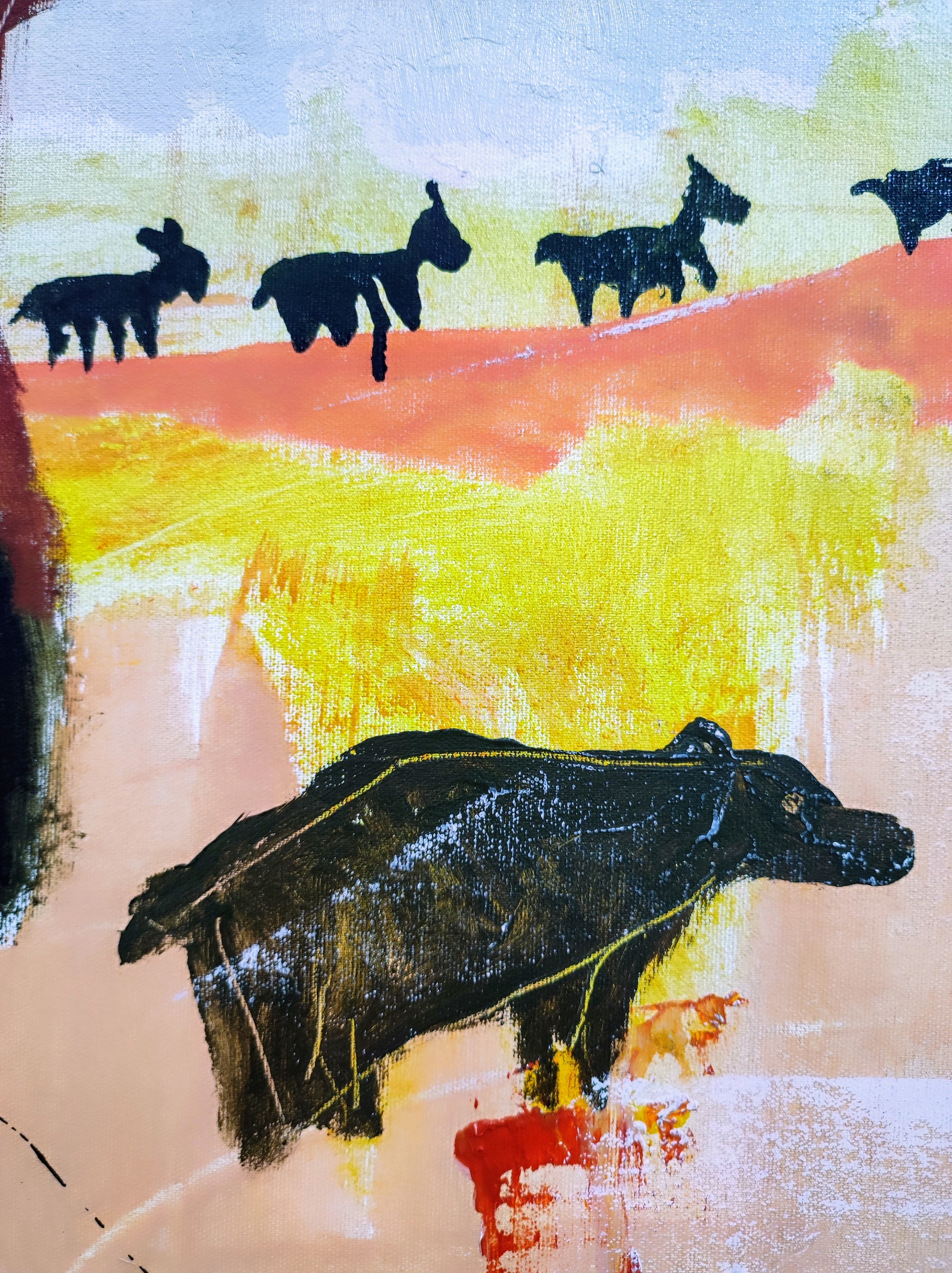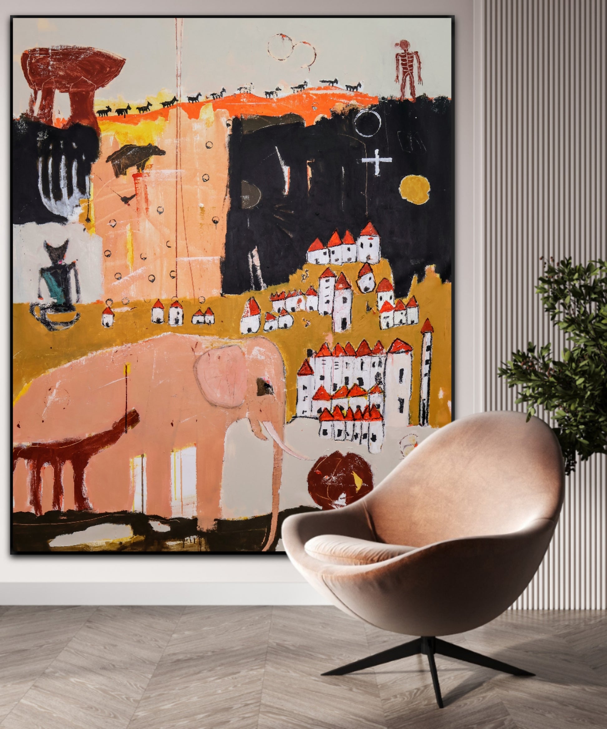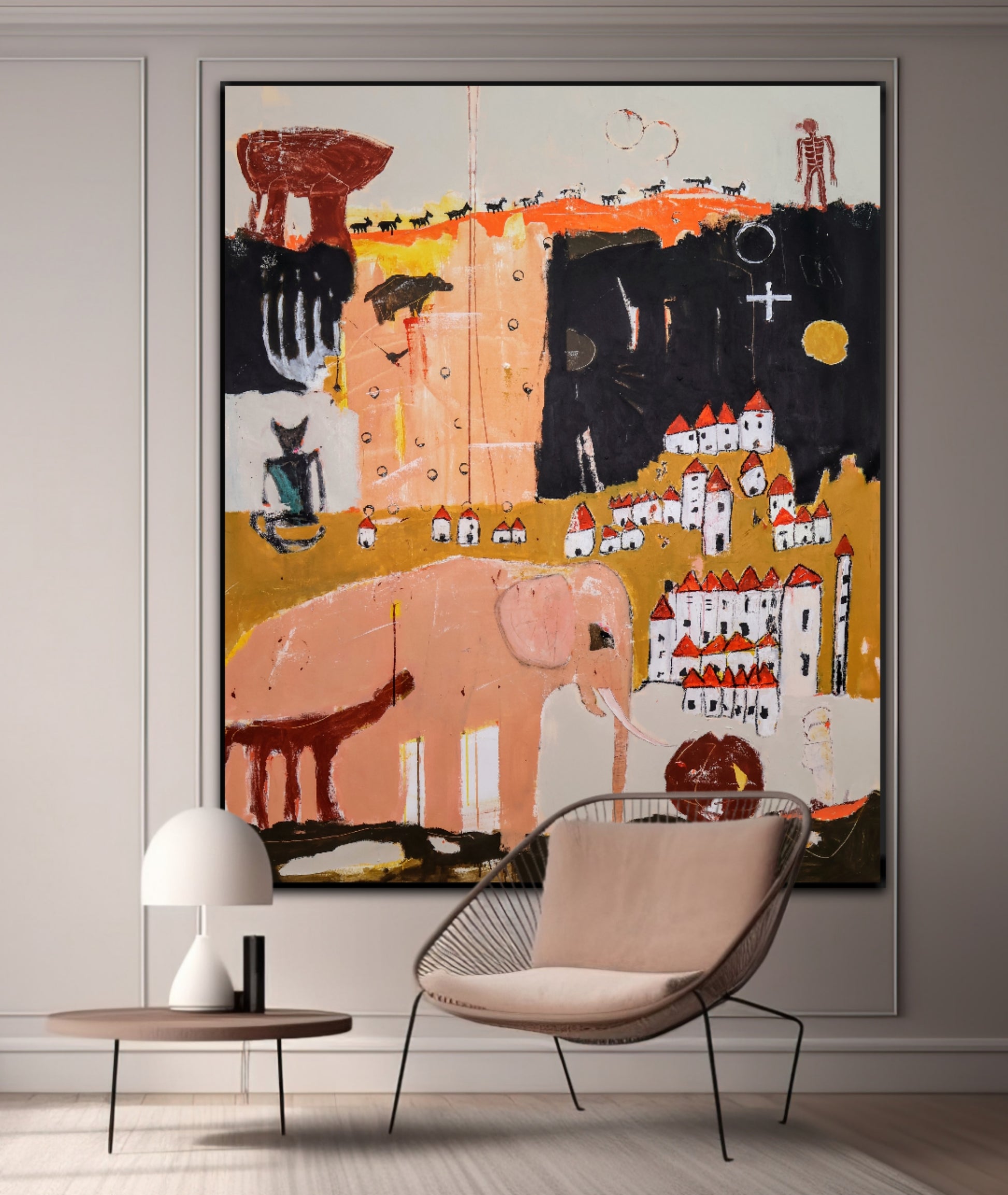 Pintura gestual, intuitiva, que deja que las cosas pasen y se apoya sobre lo que aparece. Aprovechando el accidente y aceptando las consecuencias.