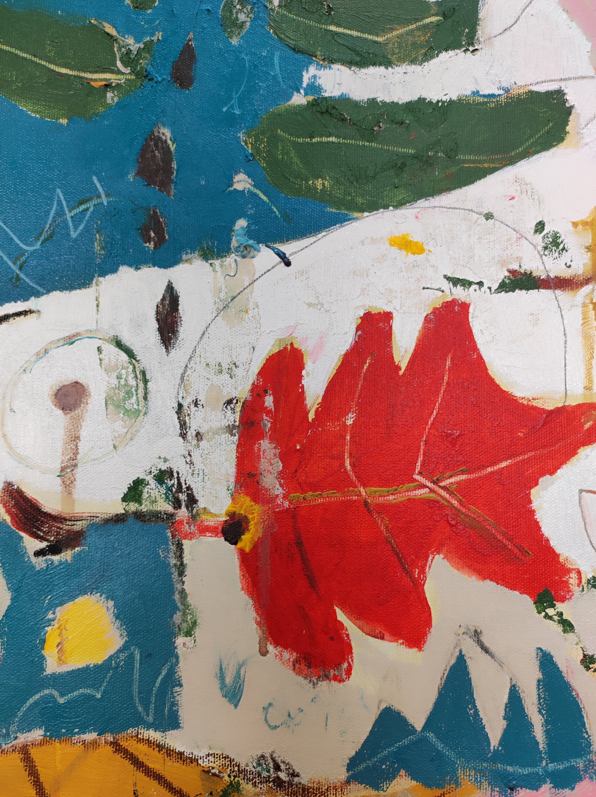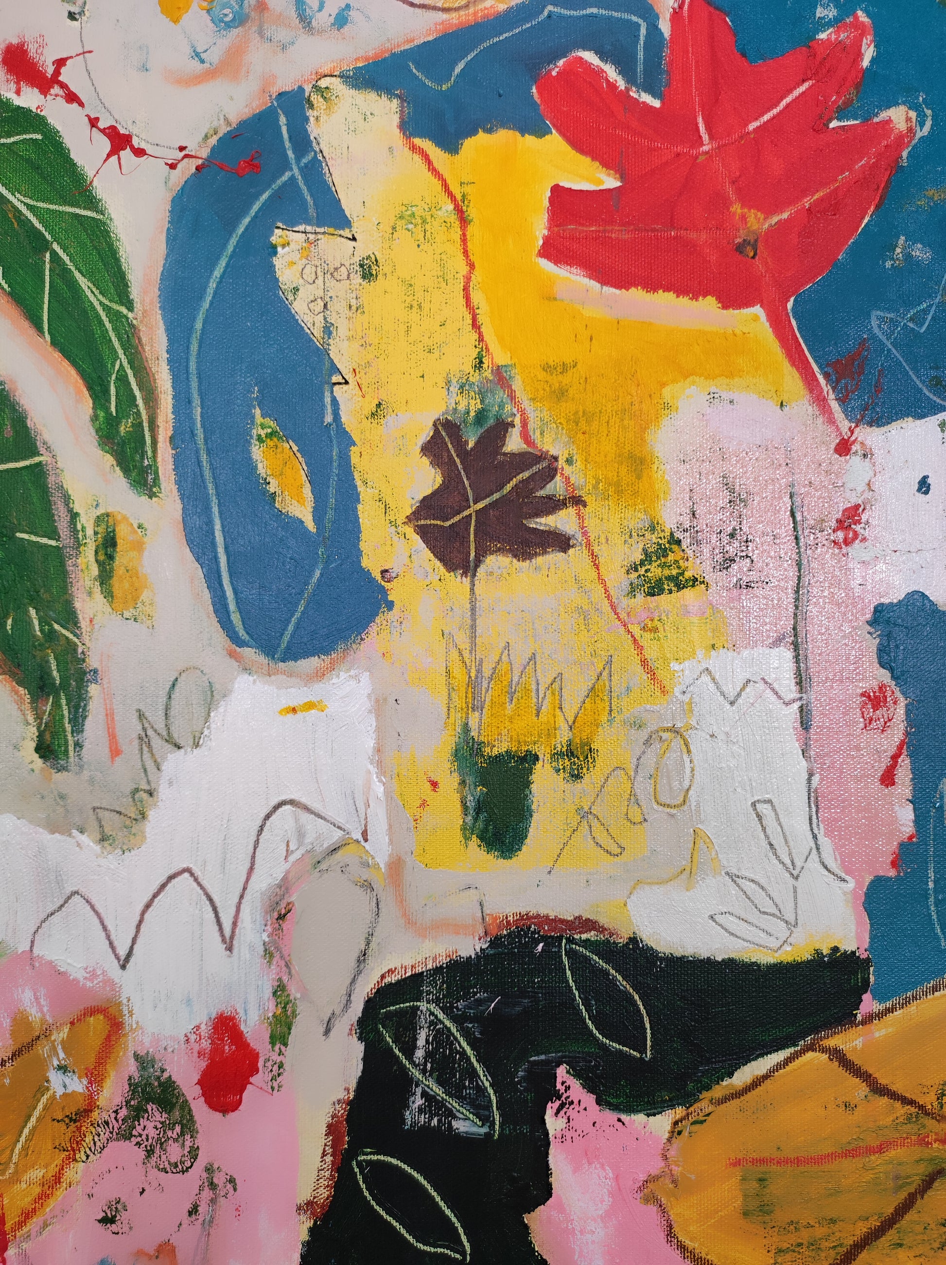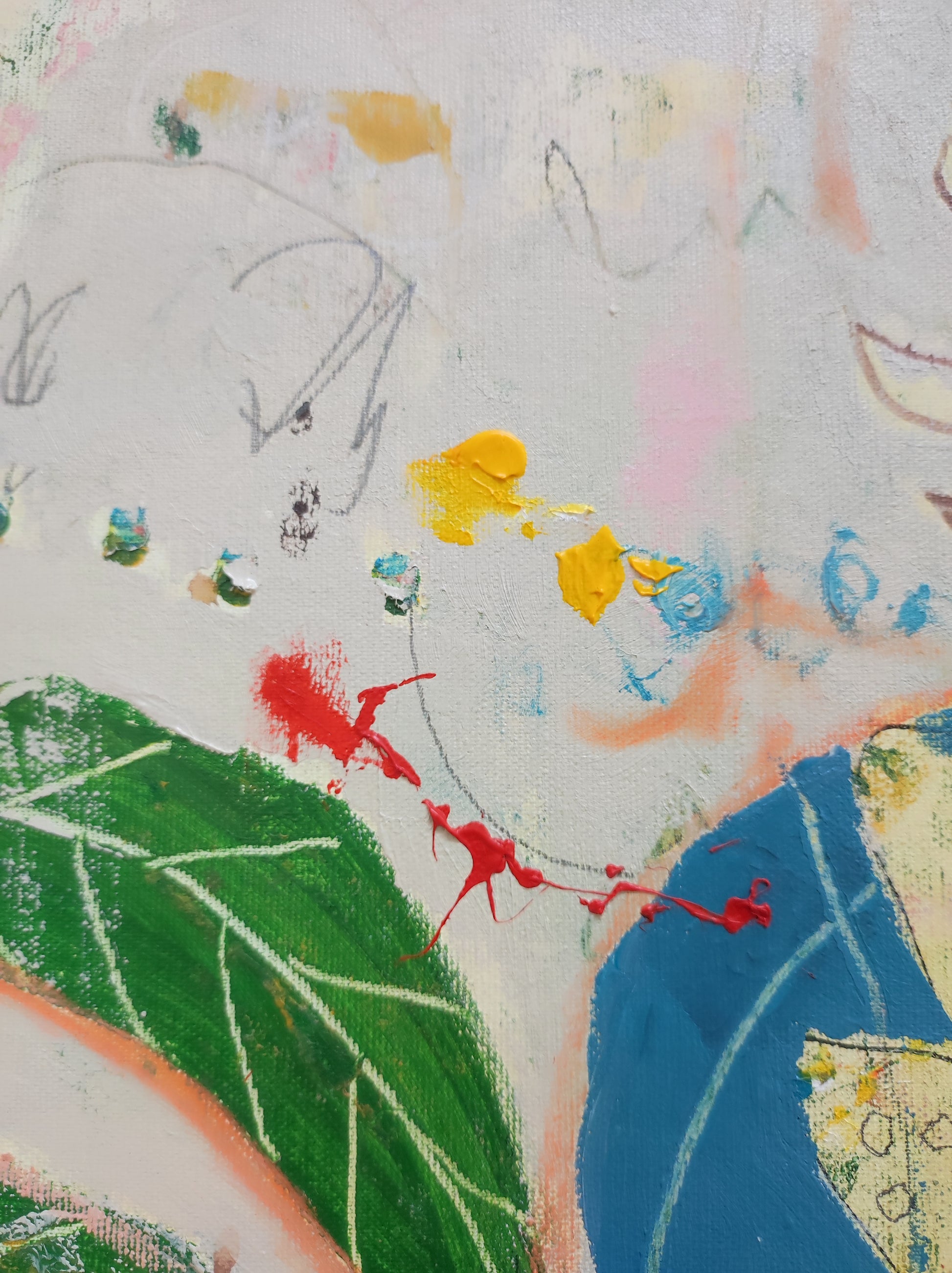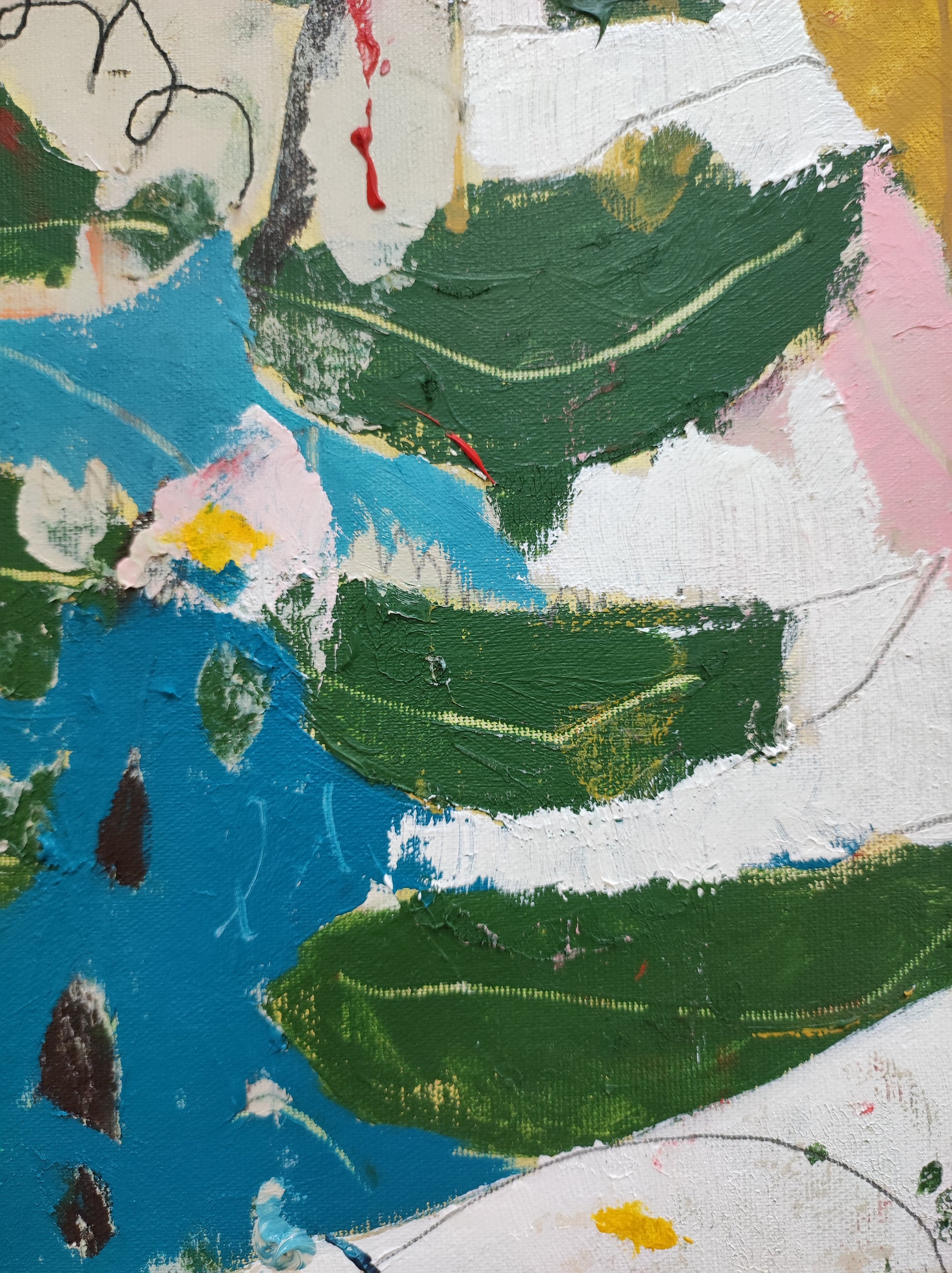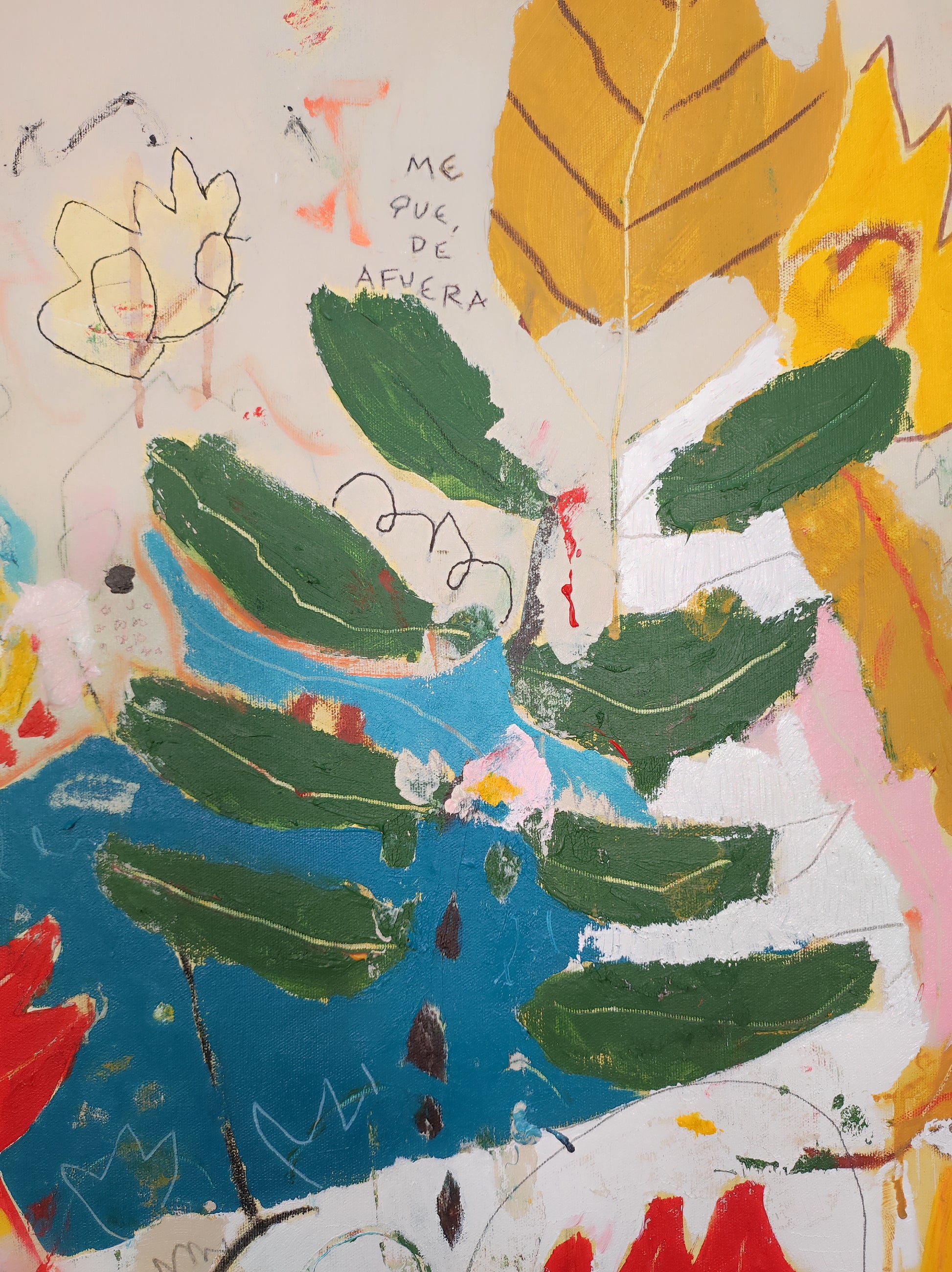 Pintura gestual, intuitiva, que deja que las cosas pasen y se apoya sobre lo que aparece. Aprovechando el accidente y aceptando las consecuencias.