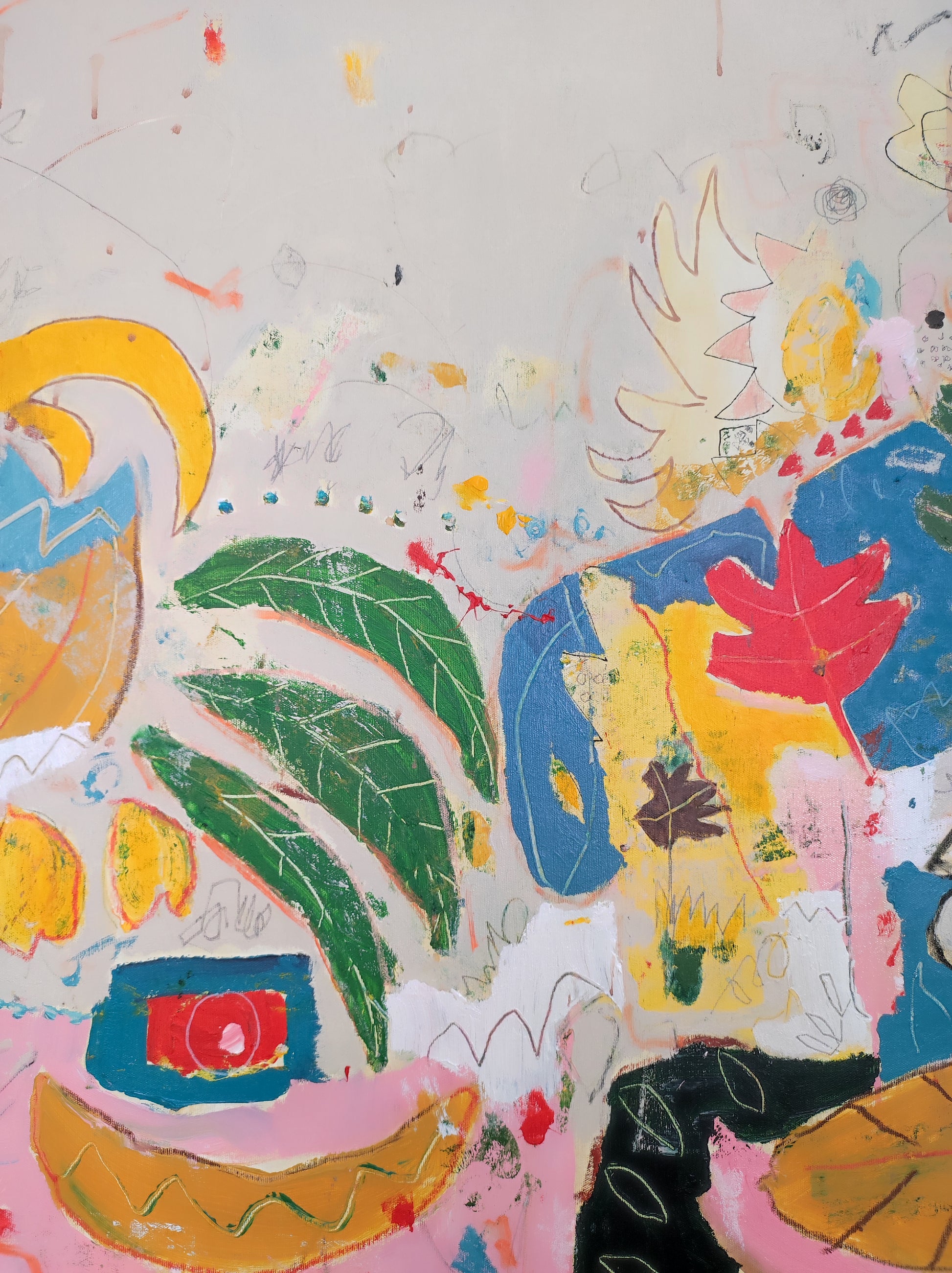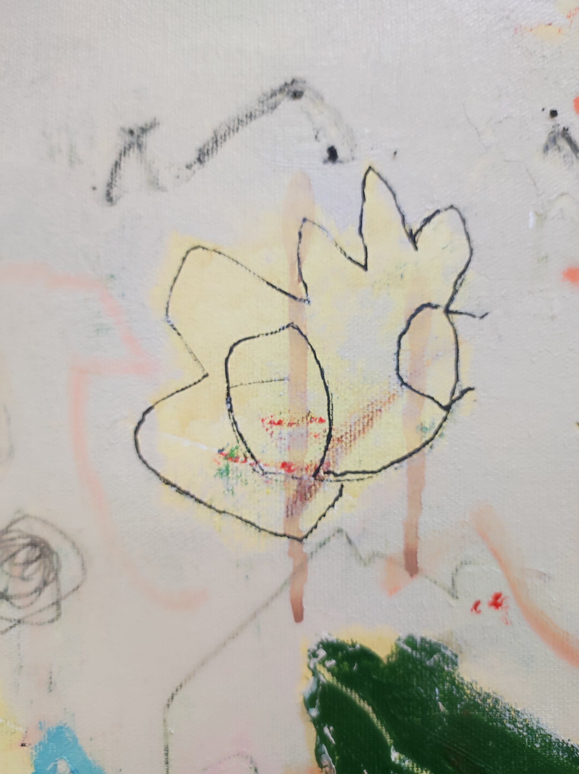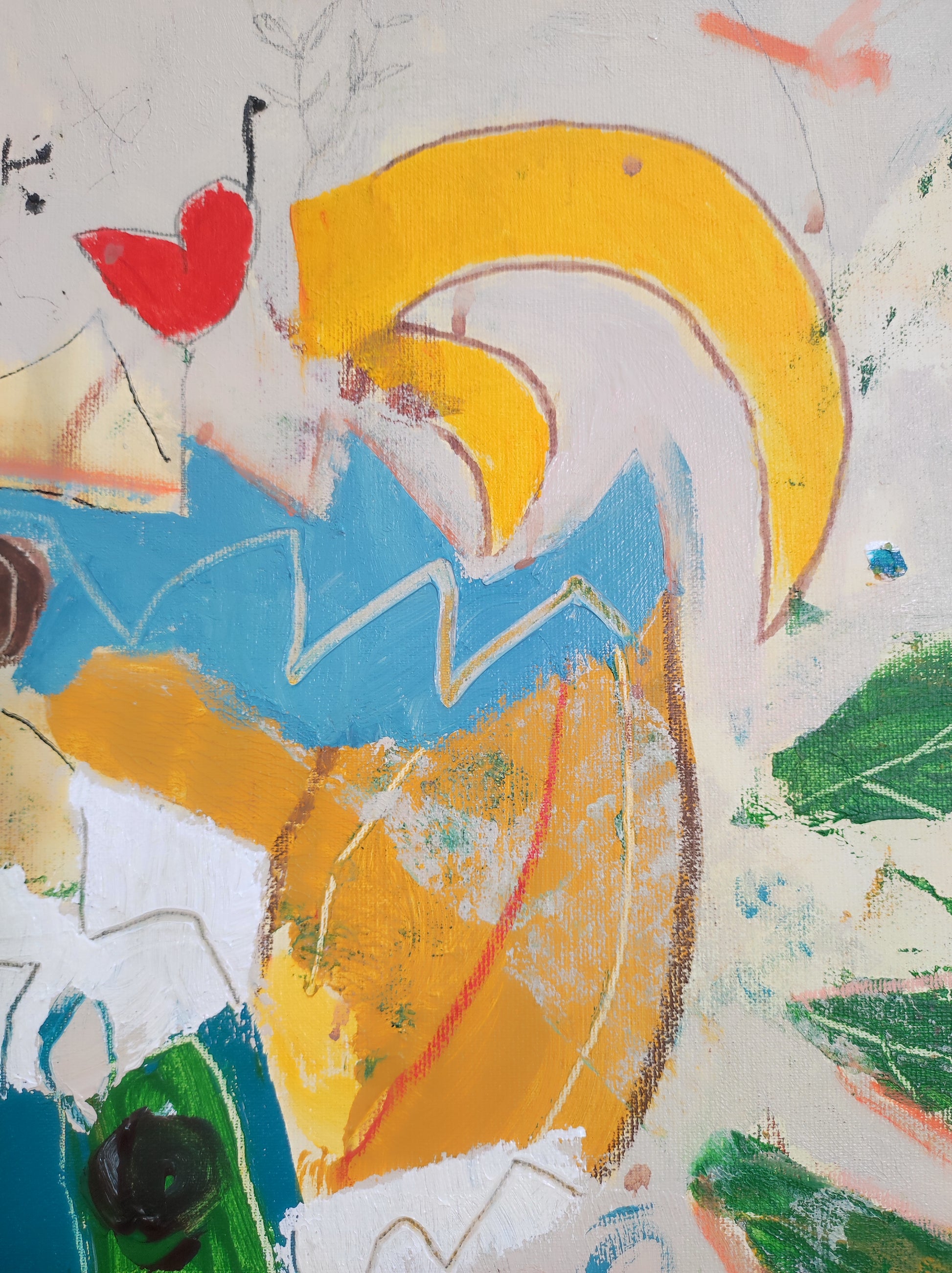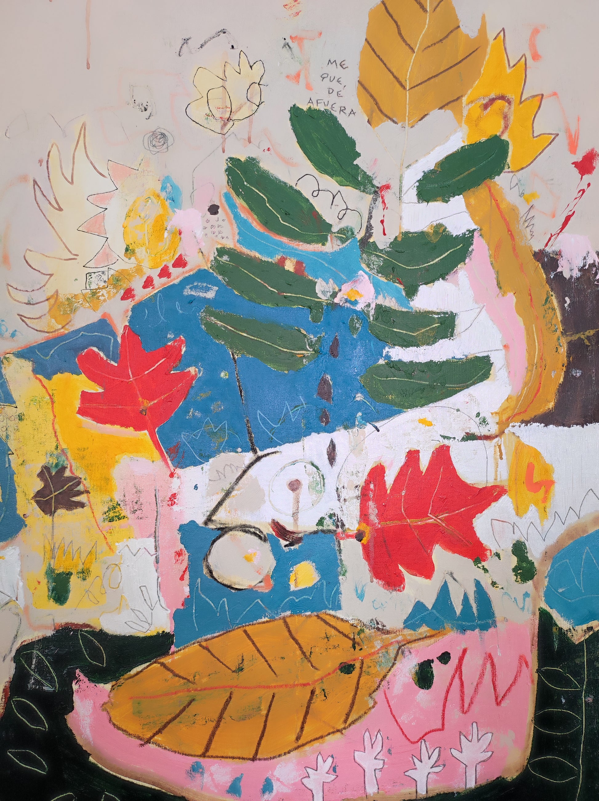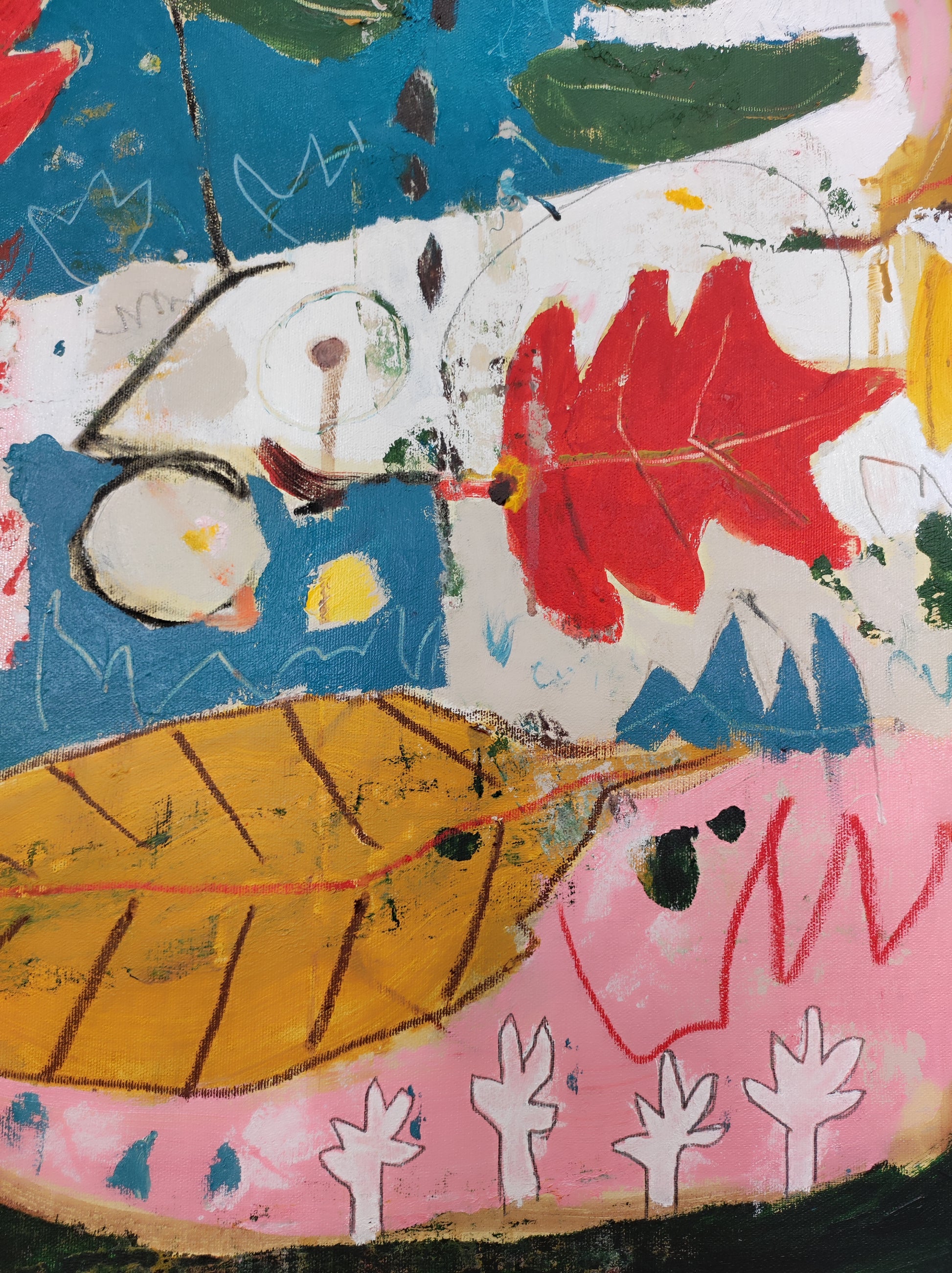 Pintura gestual, intuitiva, que deja que las cosas pasen y se apoya sobre lo que aparece. Aprovechando el accidente y aceptando las consecuencias.