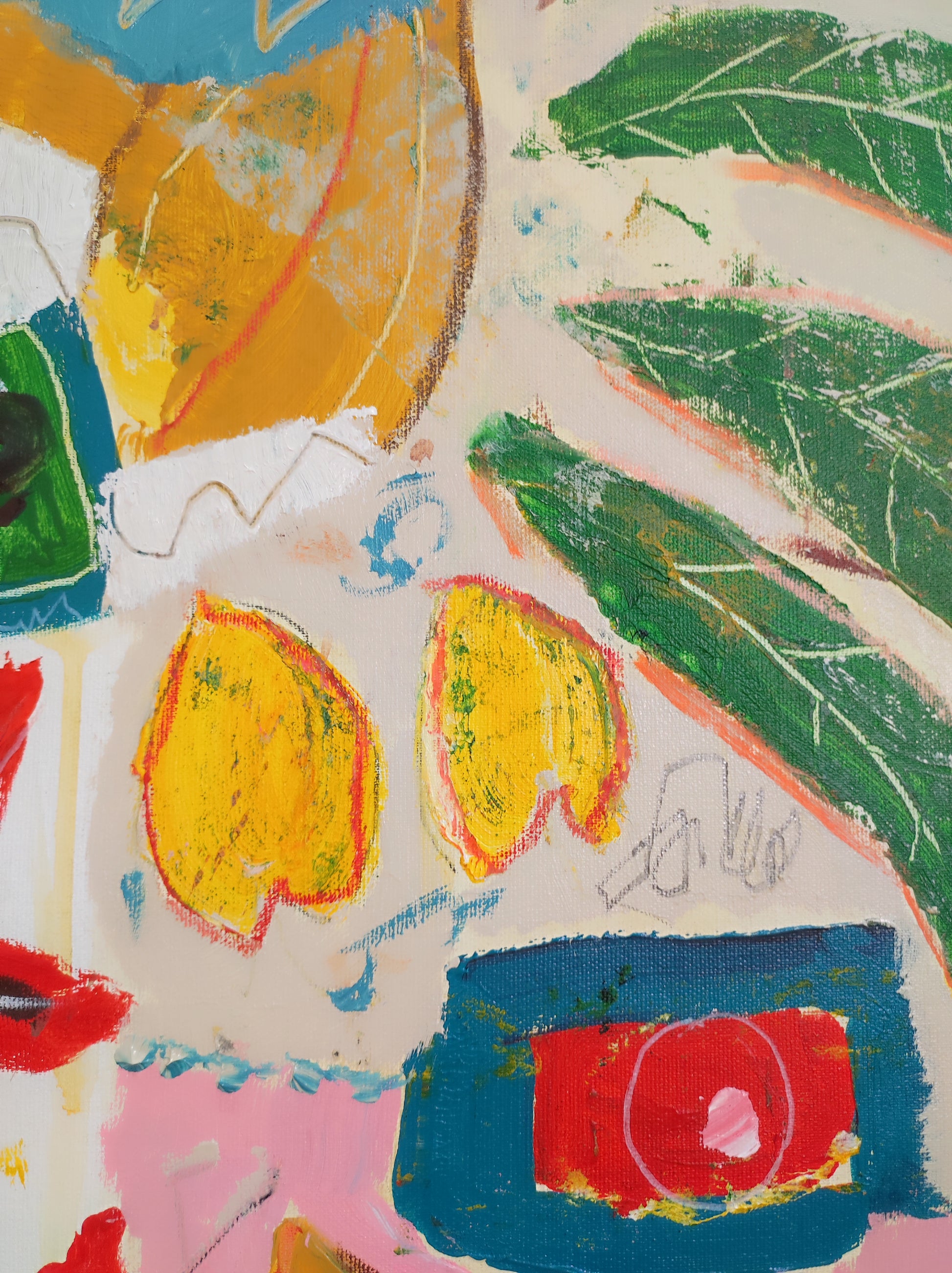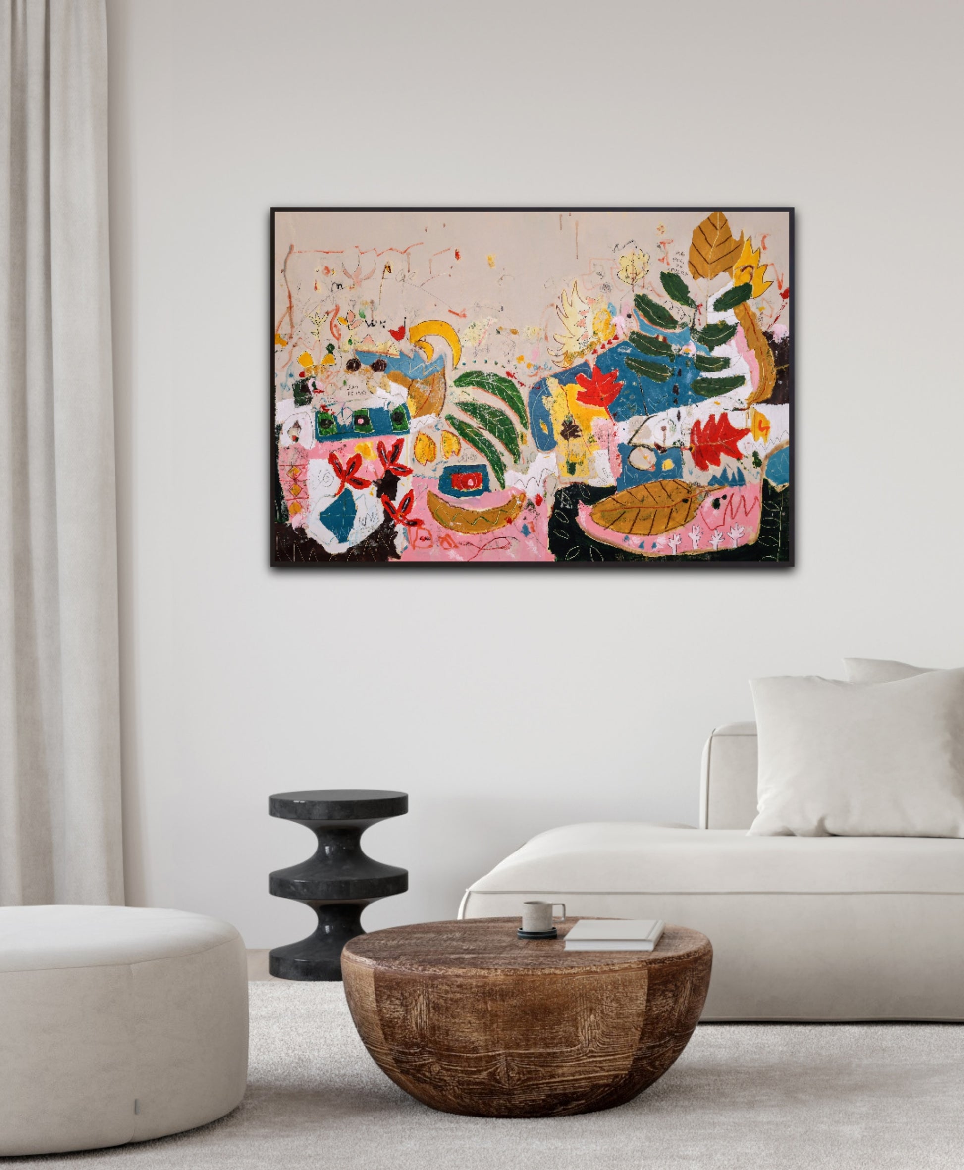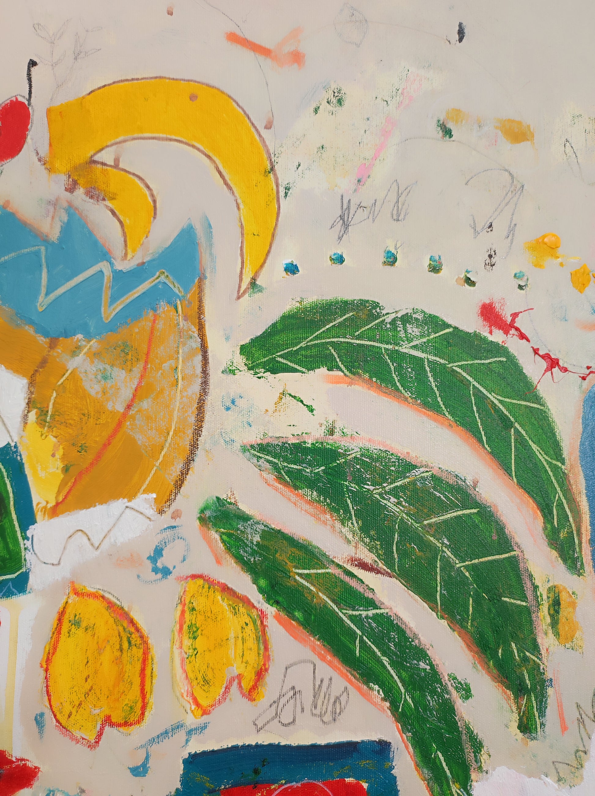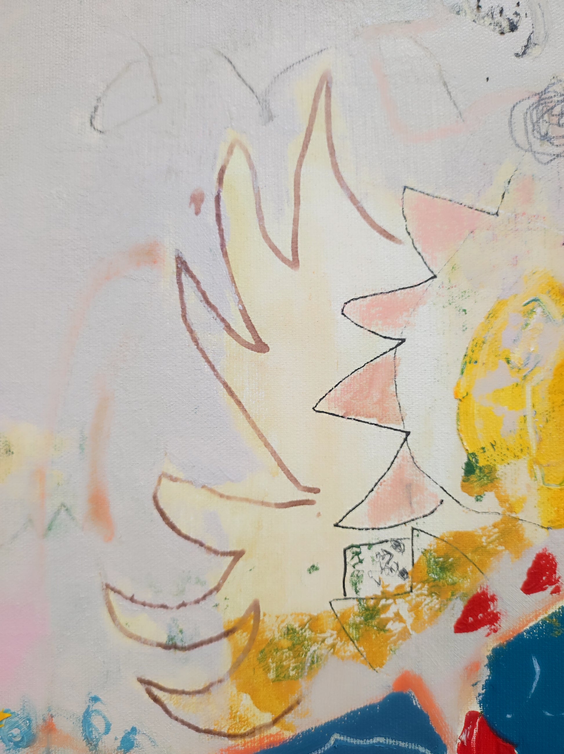 Pintura gestual, intuitiva, que deja que las cosas pasen y se apoya sobre lo que aparece. Aprovechando el accidente y aceptando las consecuencias.
