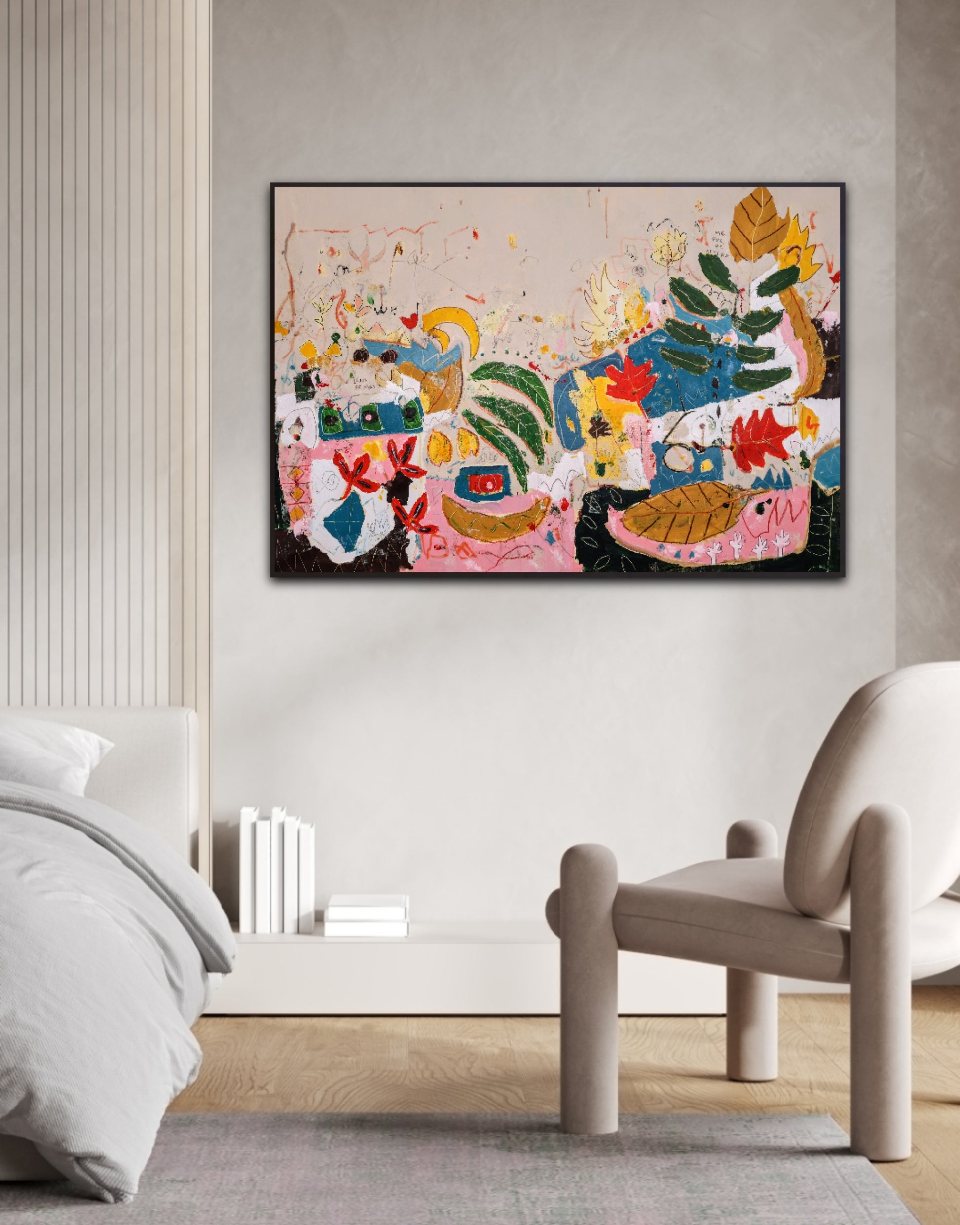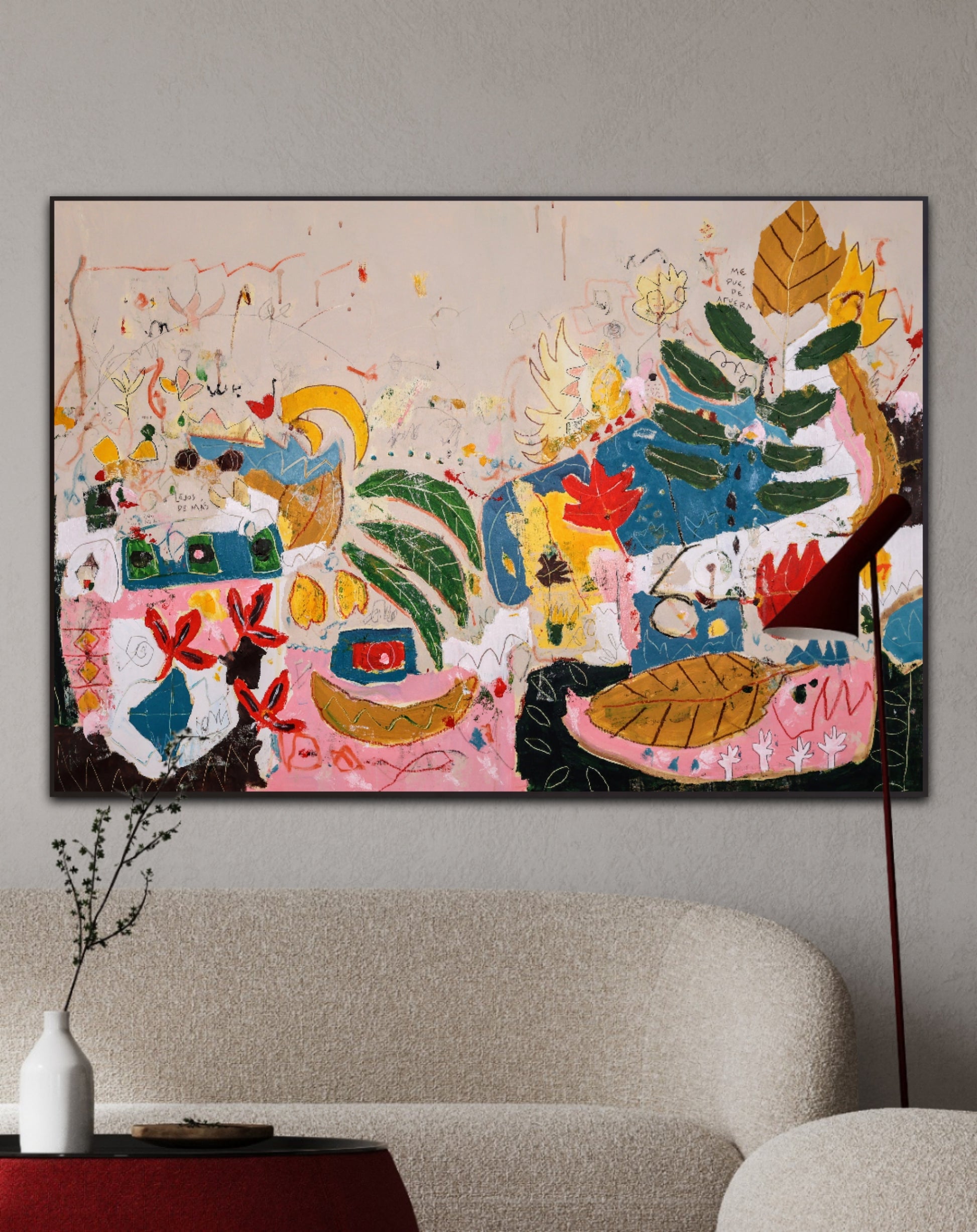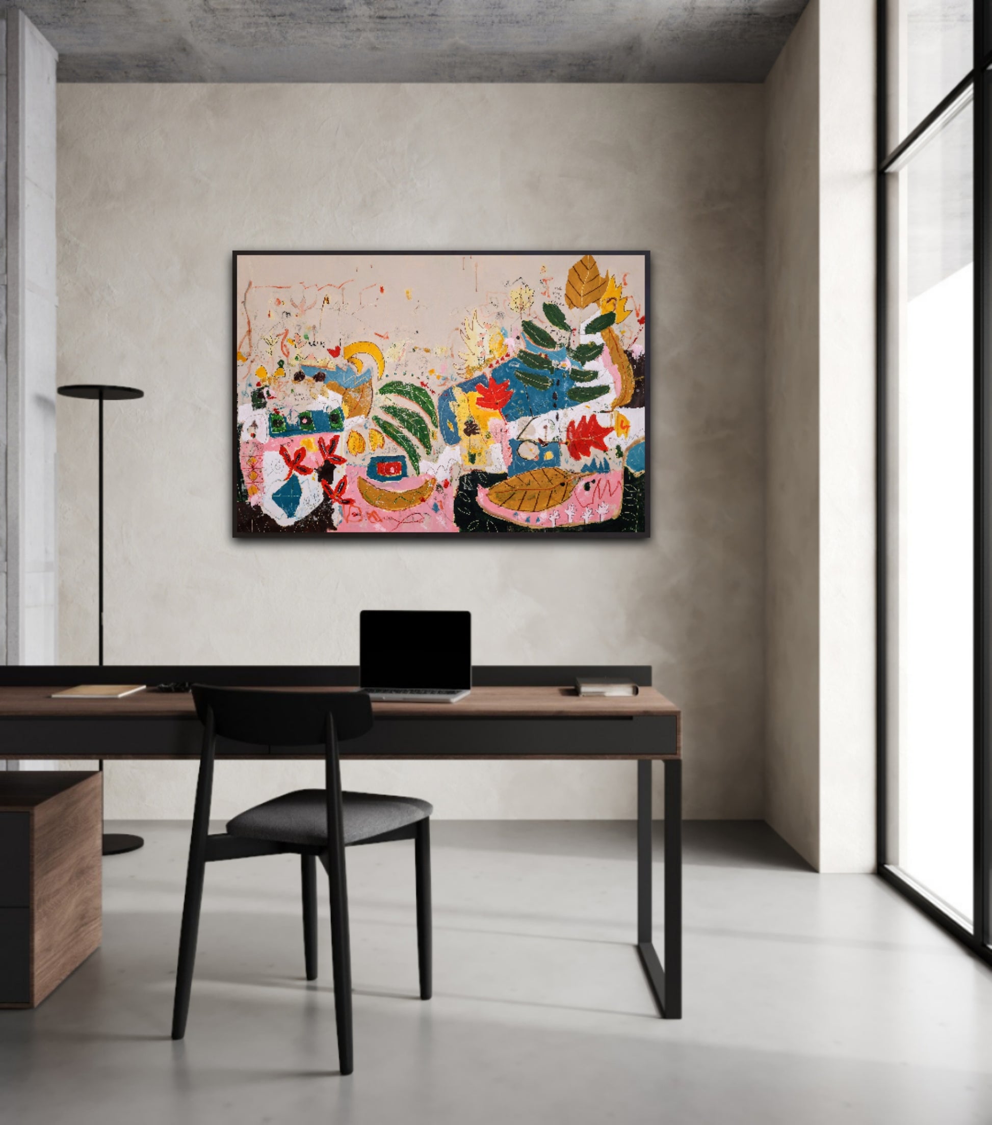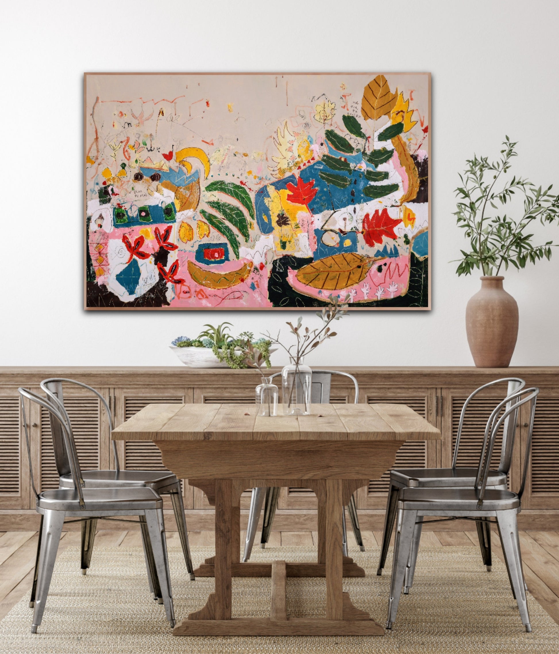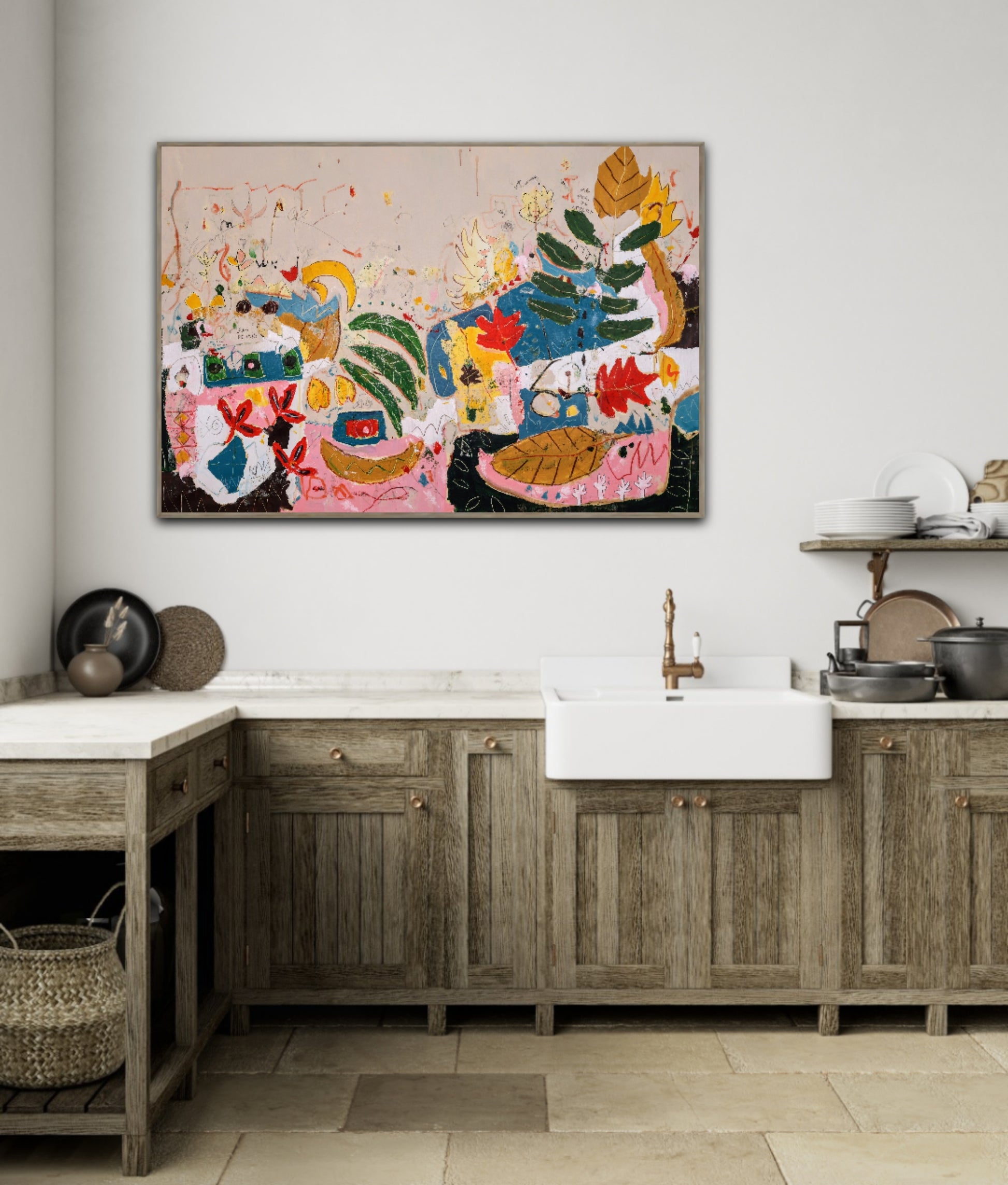 Pintura gestual, intuitiva, que deja que las cosas pasen y se apoya sobre lo que aparece. Aprovechando el accidente y aceptando las consecuencias.