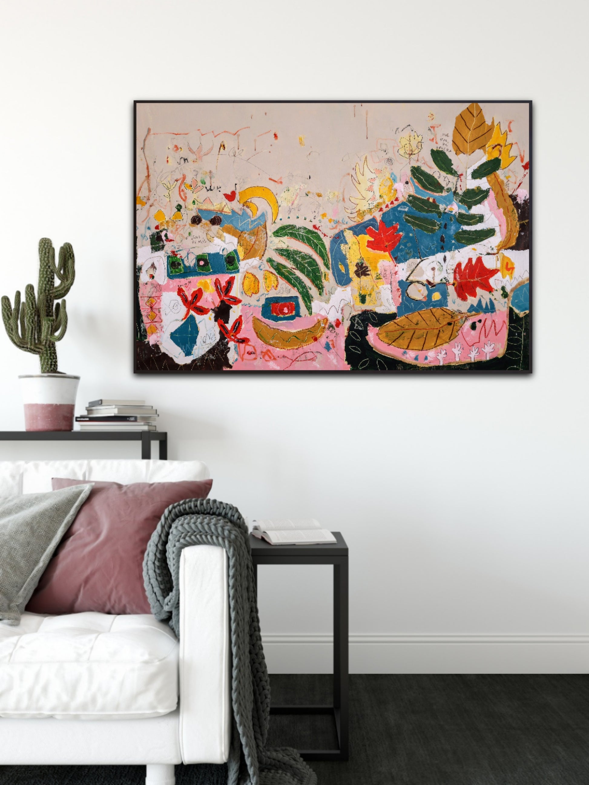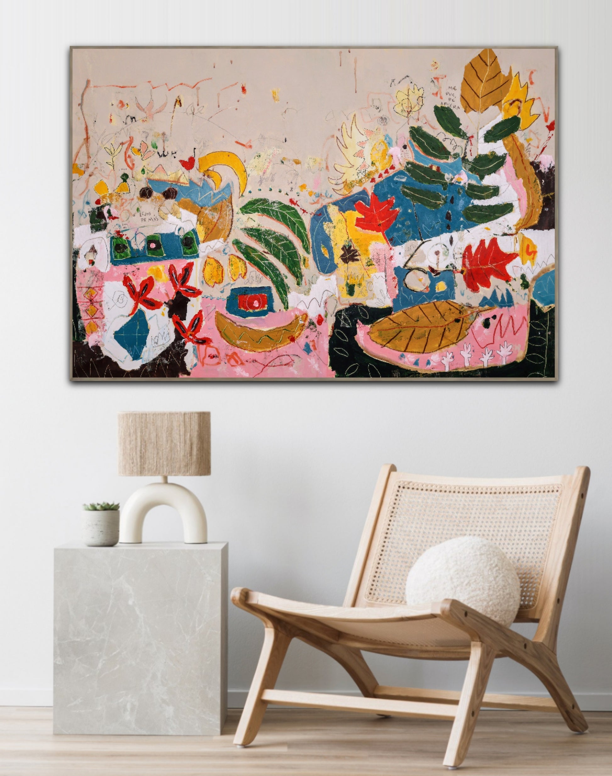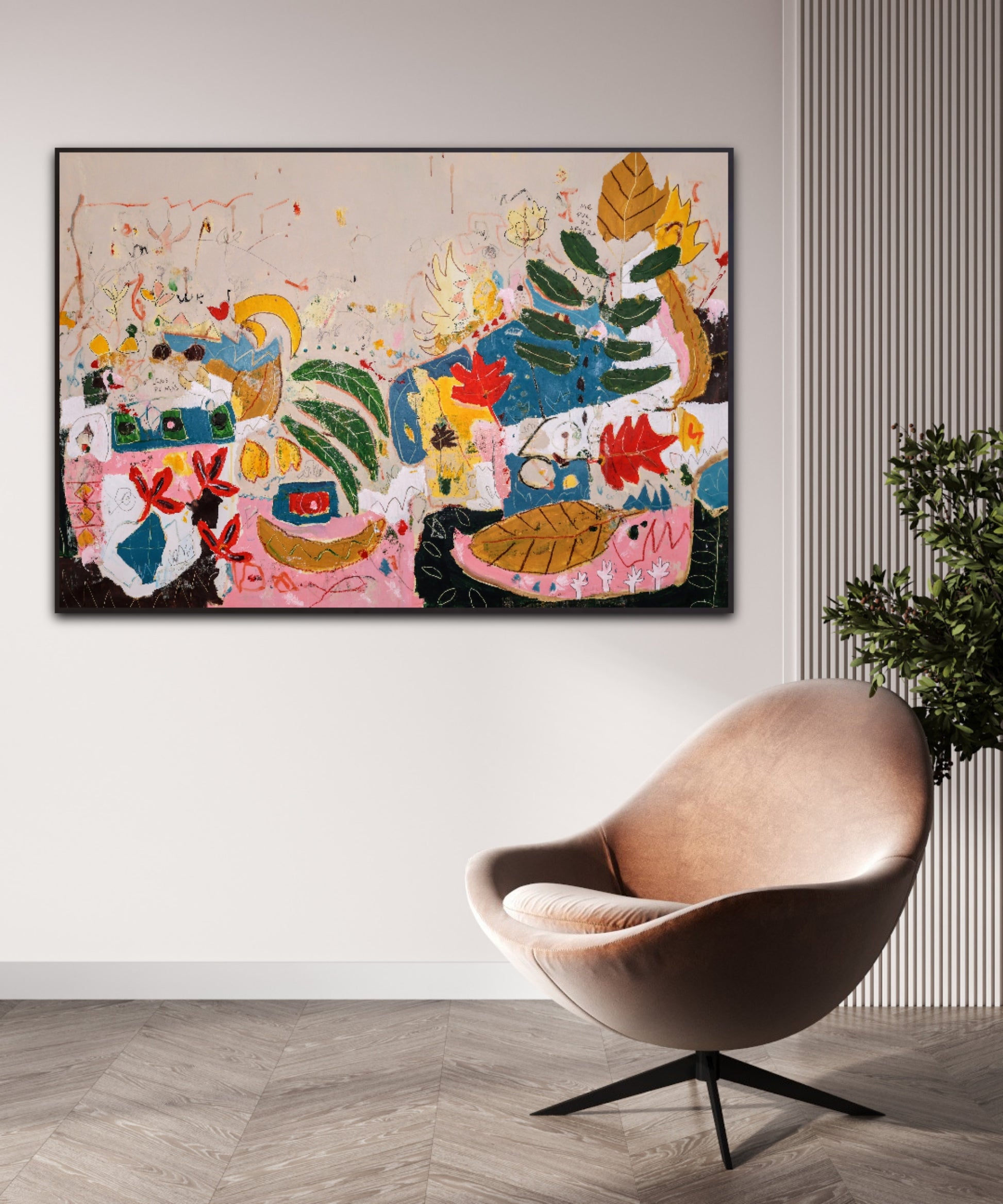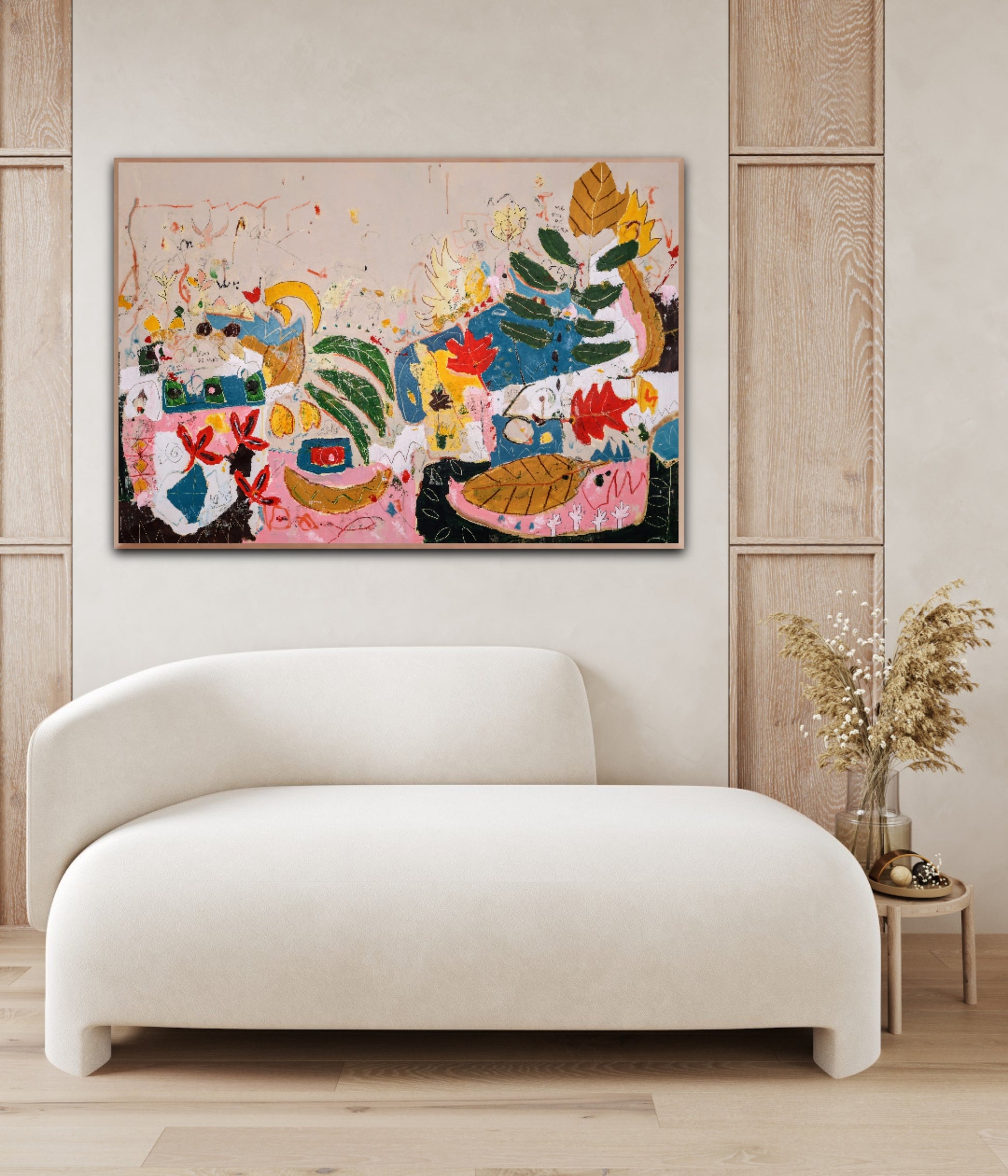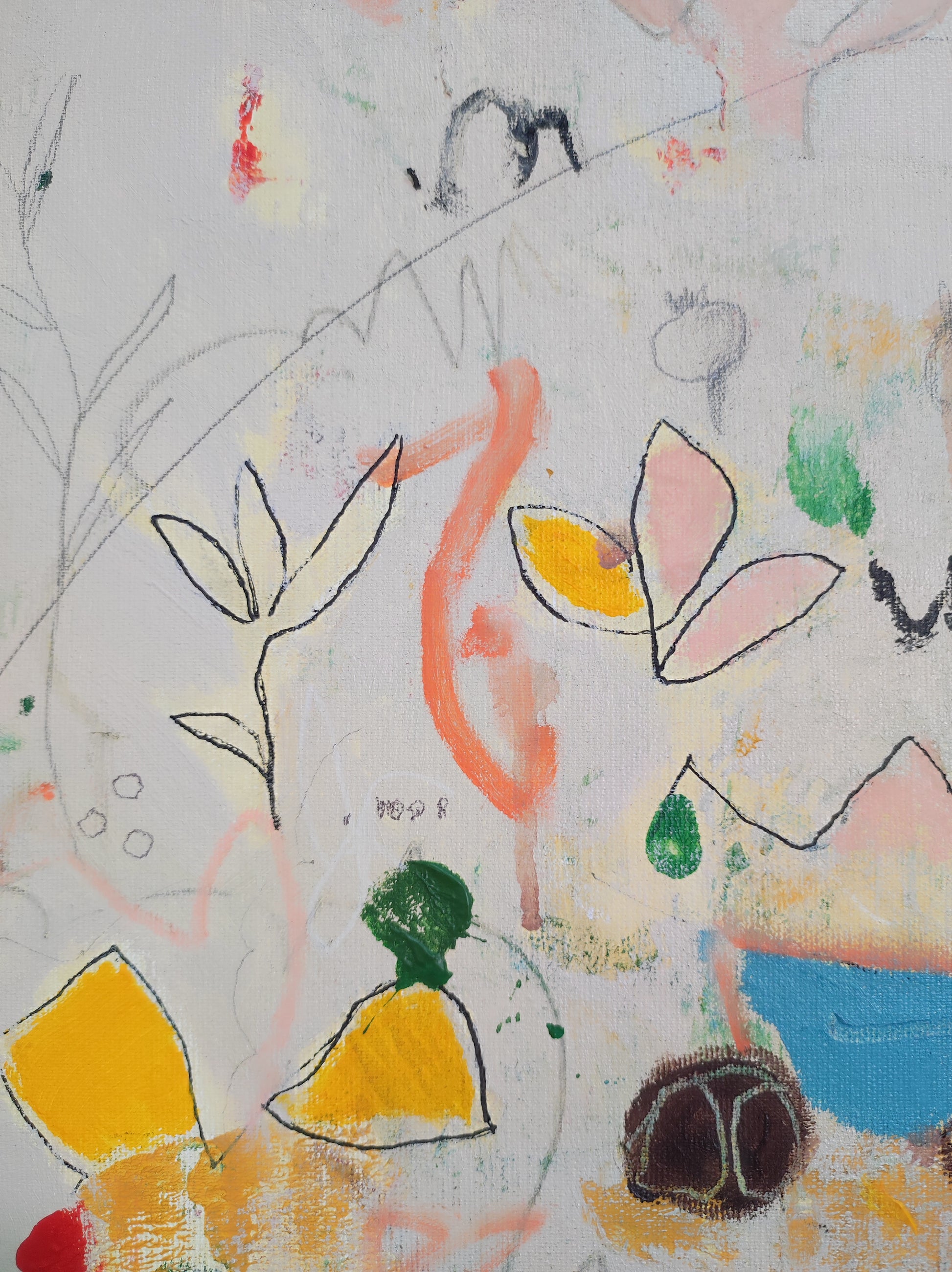 Pintura gestual, intuitiva, que deja que las cosas pasen y se apoya sobre lo que aparece. Aprovechando el accidente y aceptando las consecuencias.