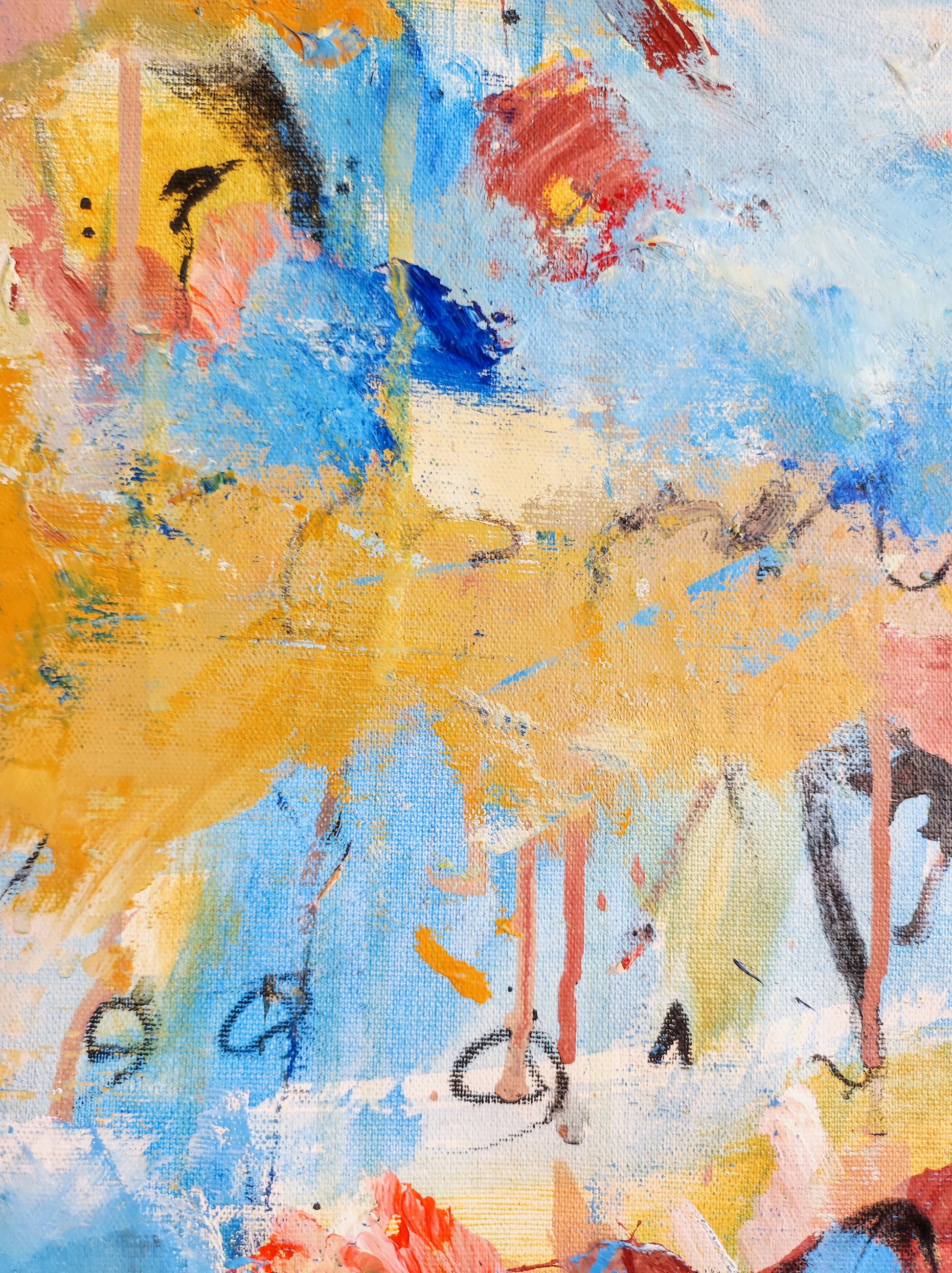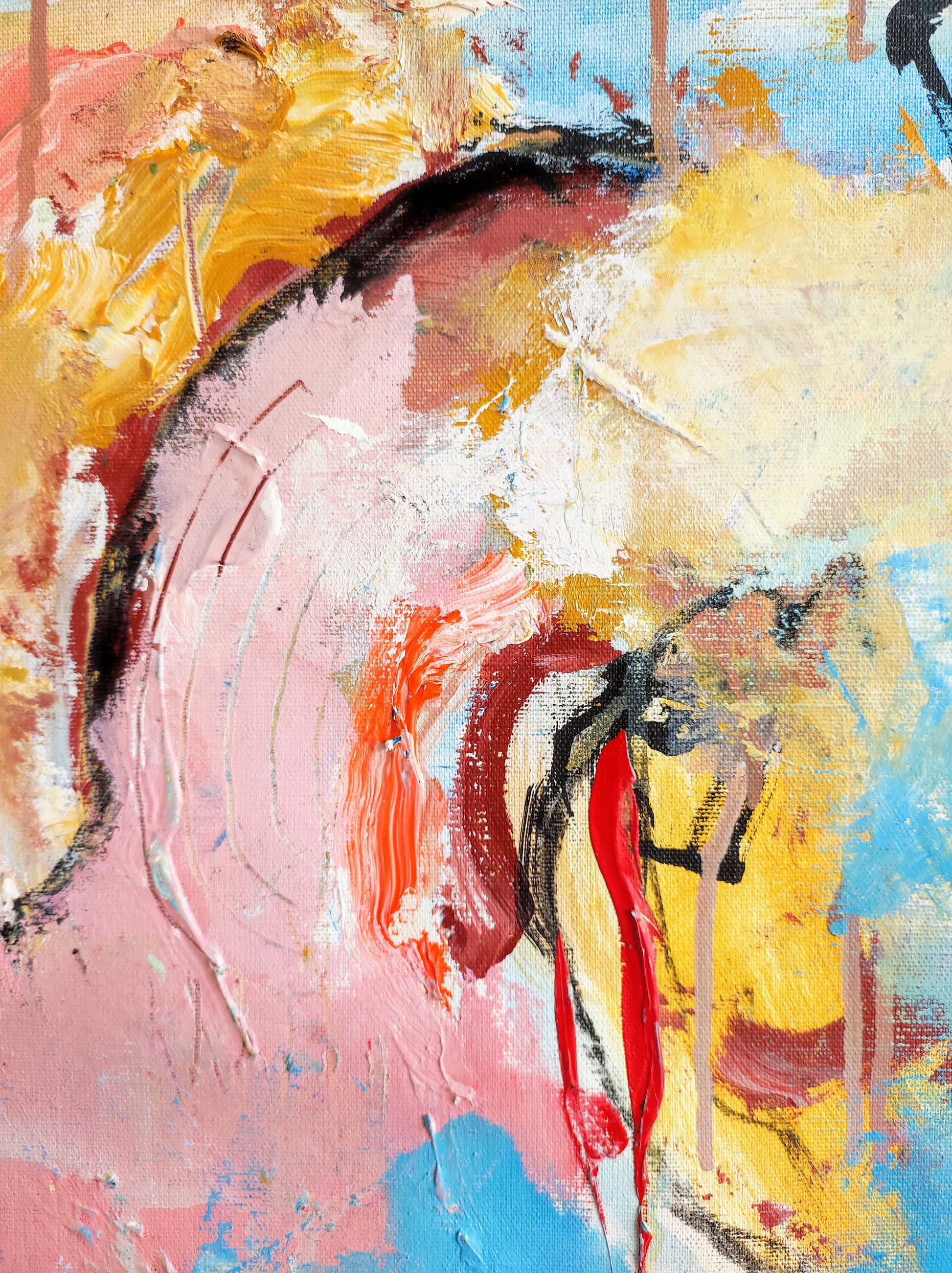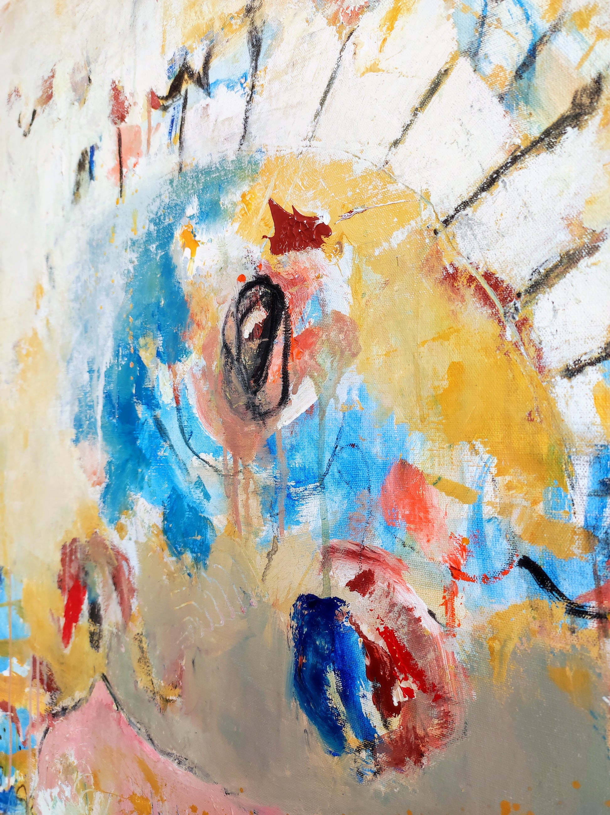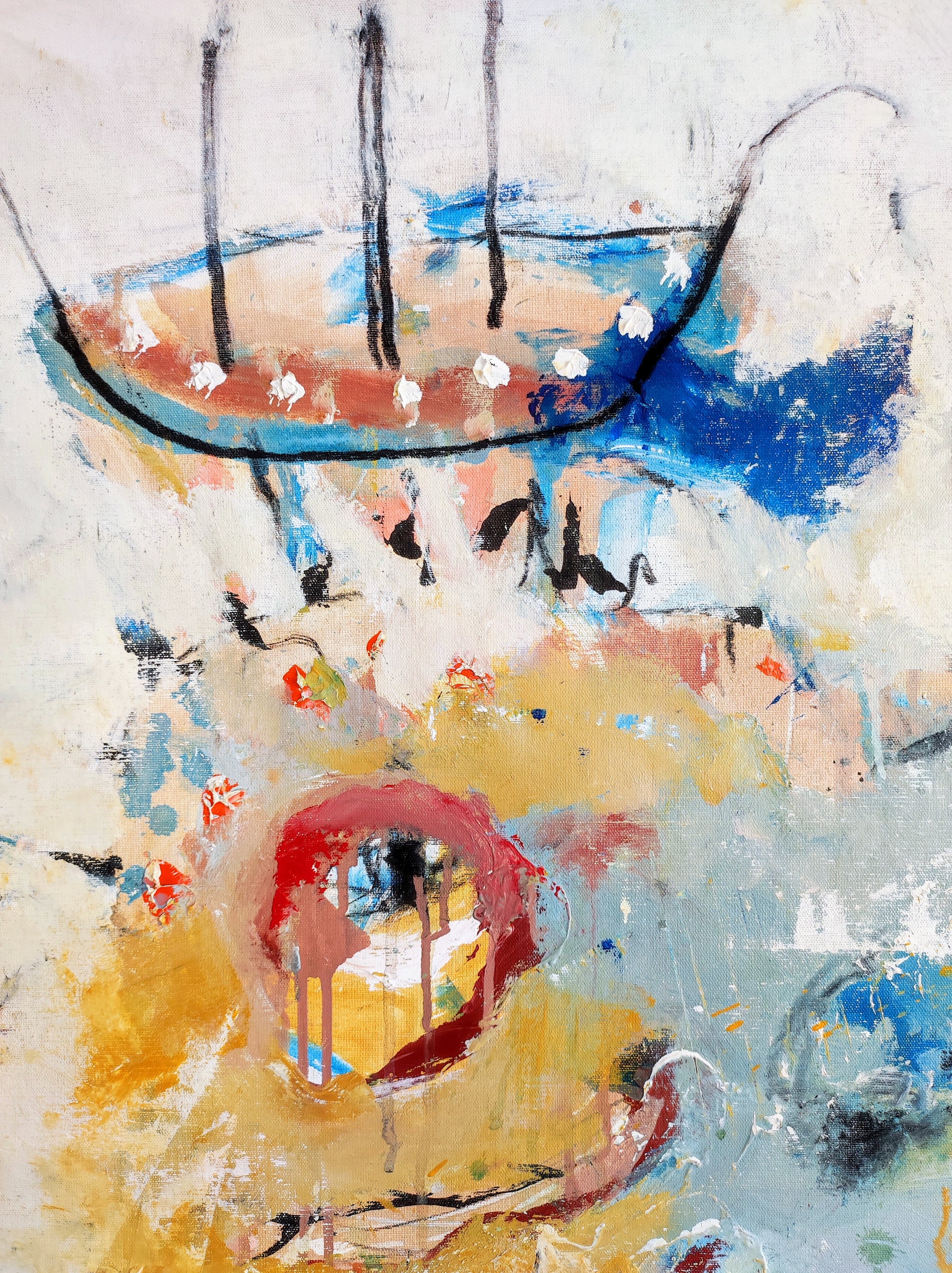 Pintura gestual, intuitiva, que deja que las cosas pasen y se apoya sobre lo que aparece. Aprovechando el accidente y aceptando las consecuencias.
