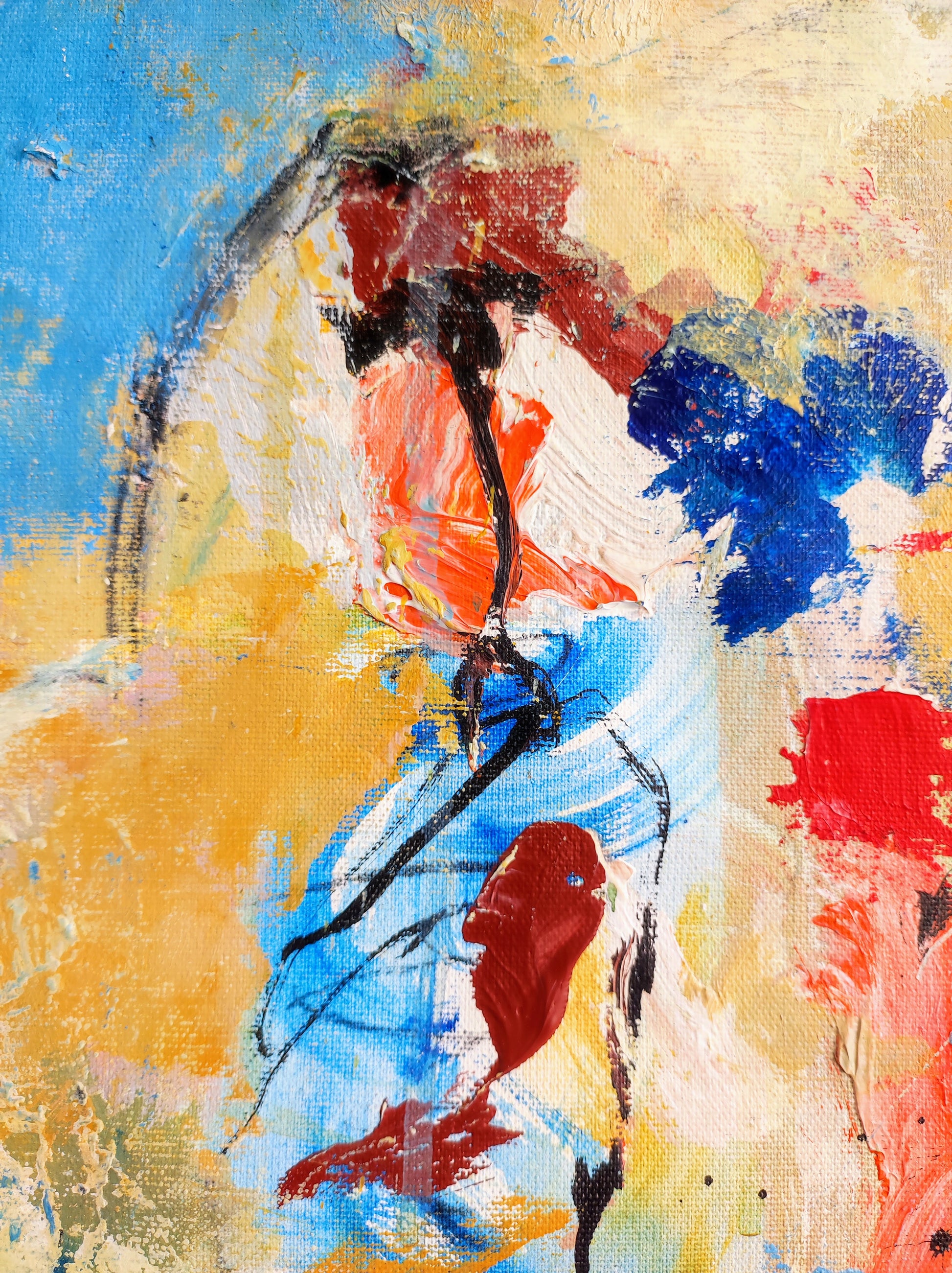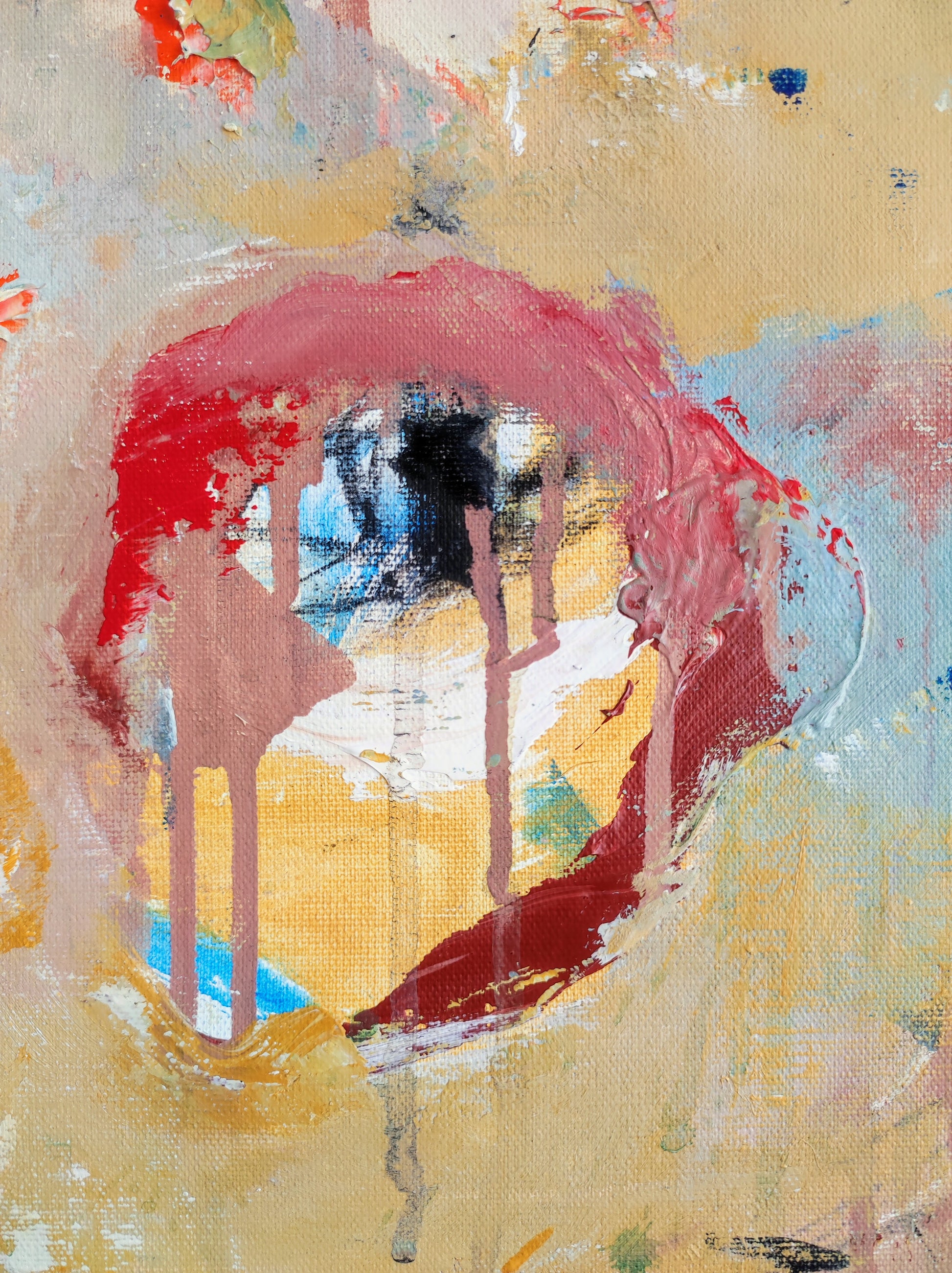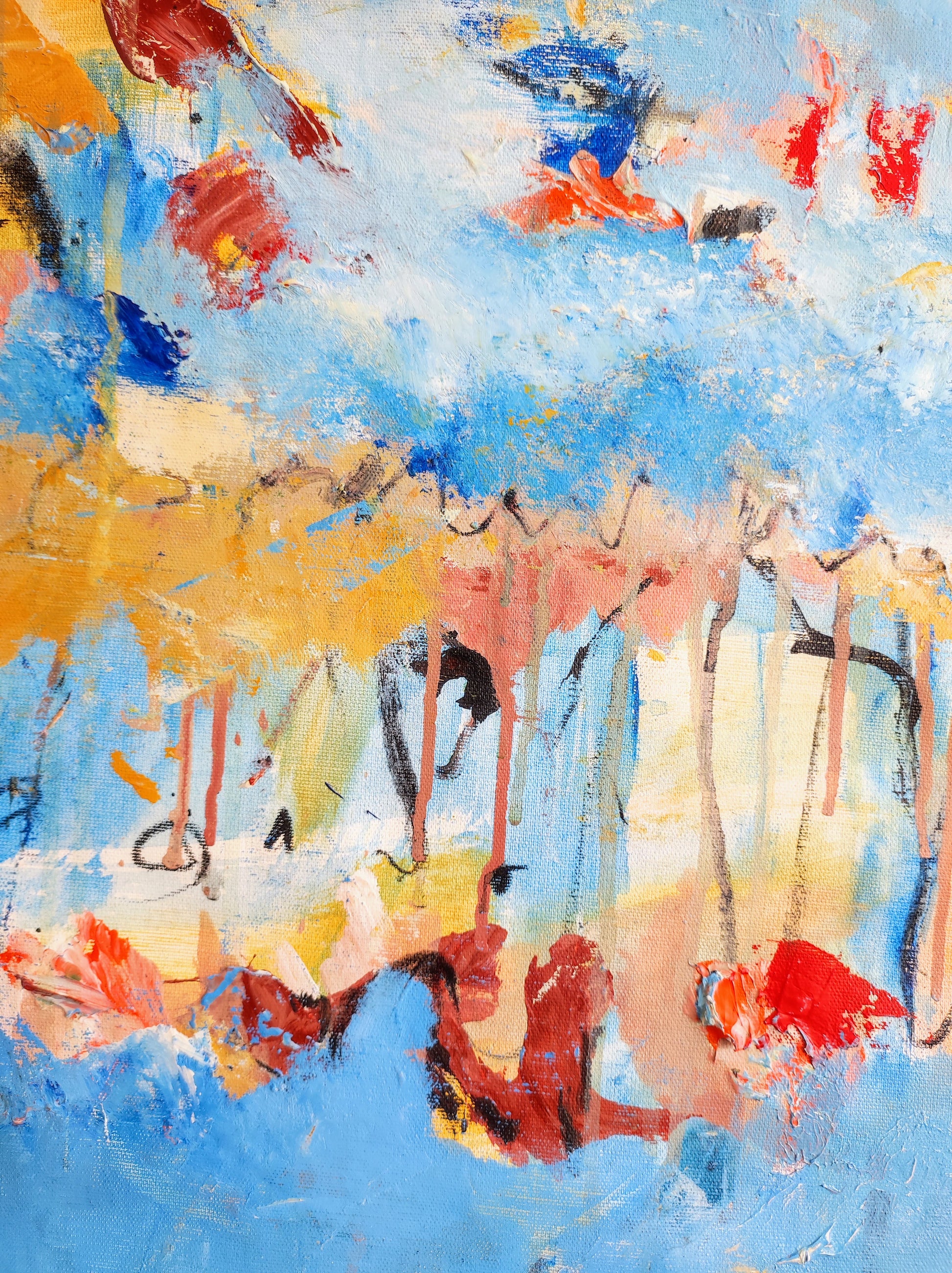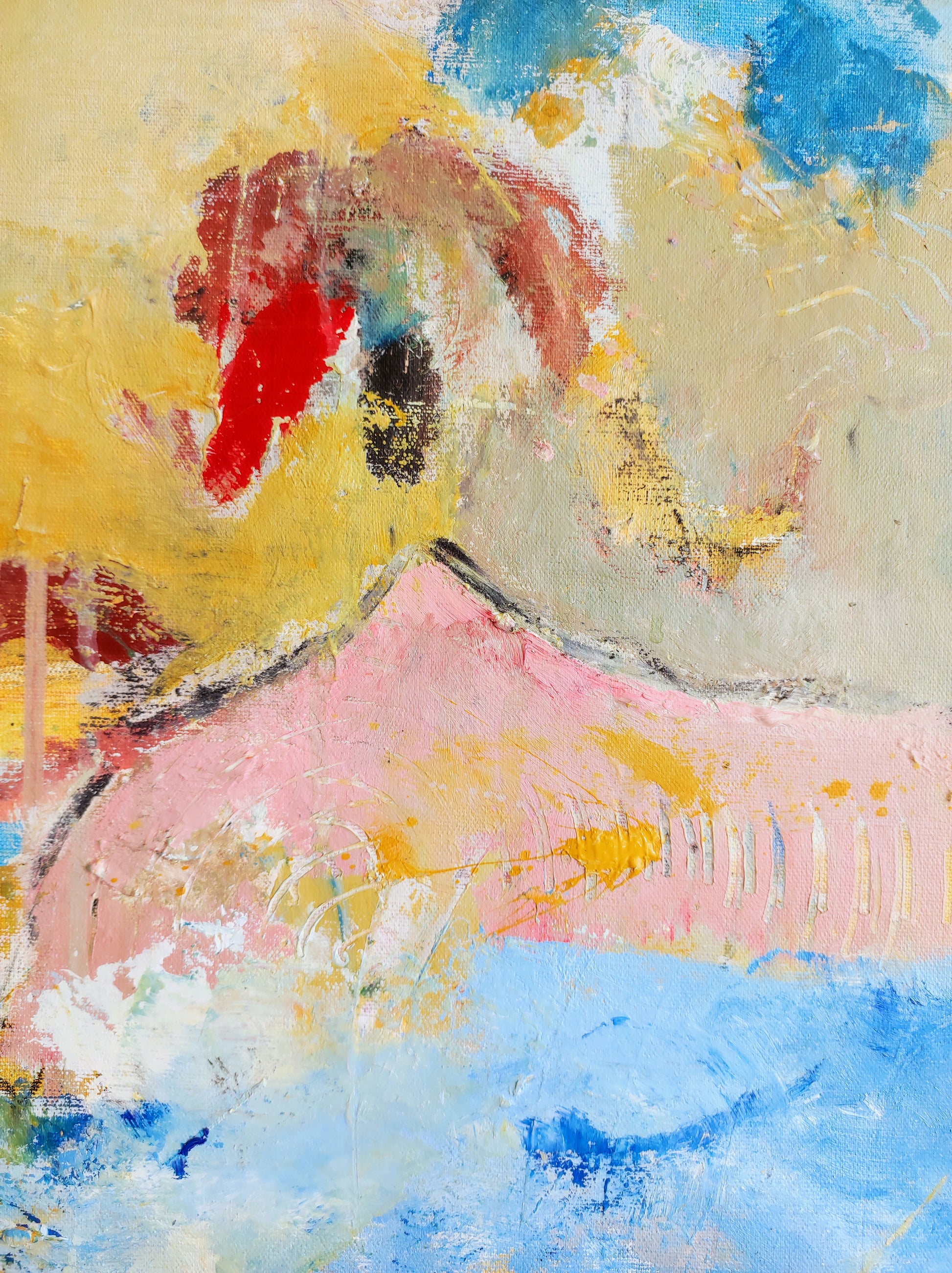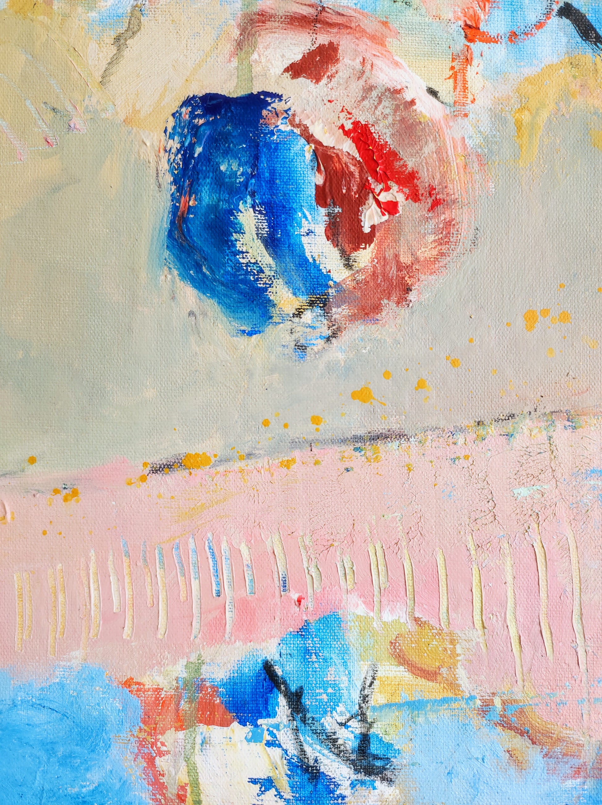 Pintura gestual, intuitiva, que deja que las cosas pasen y se apoya sobre lo que aparece. Aprovechando el accidente y aceptando las consecuencias.