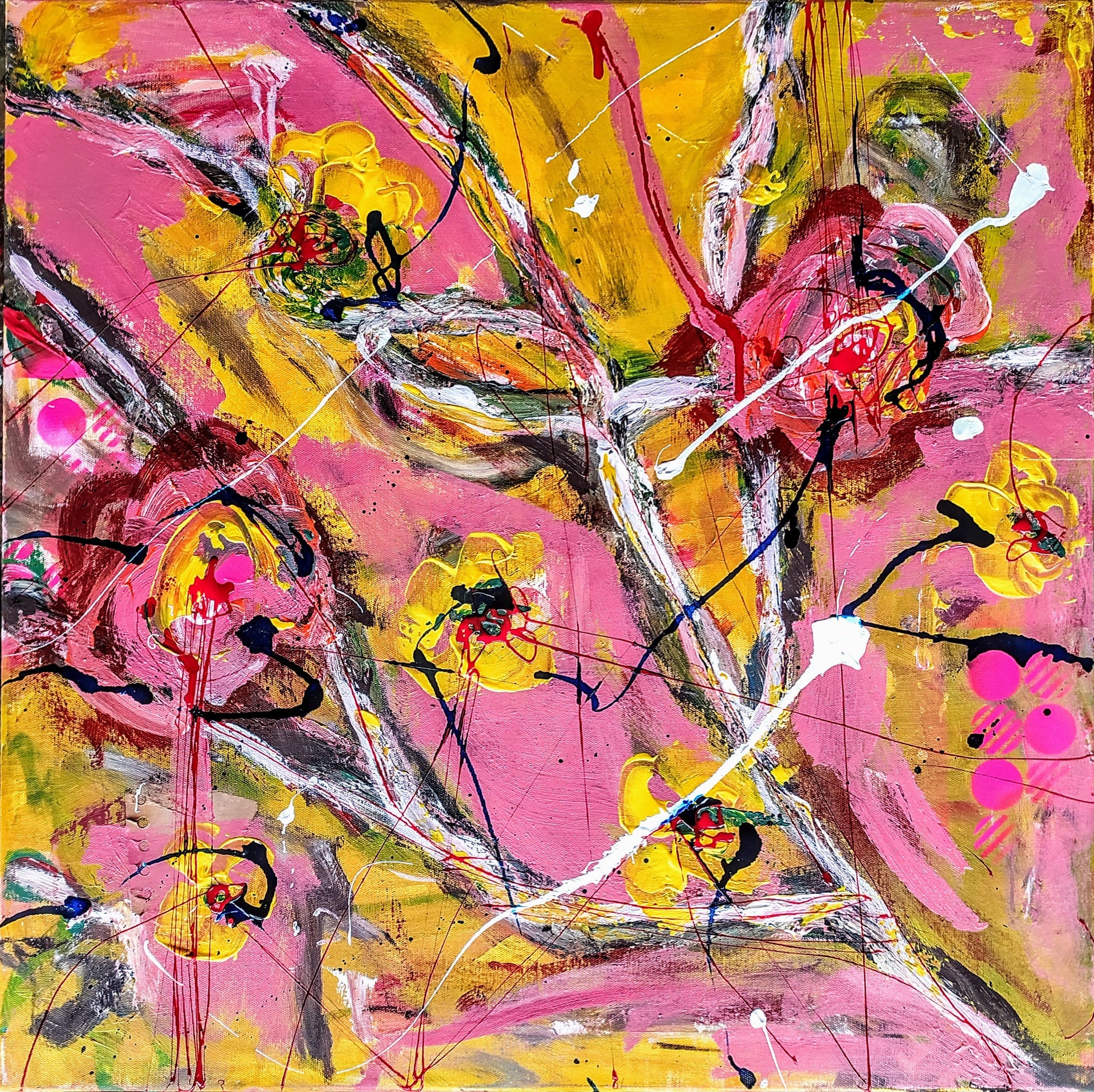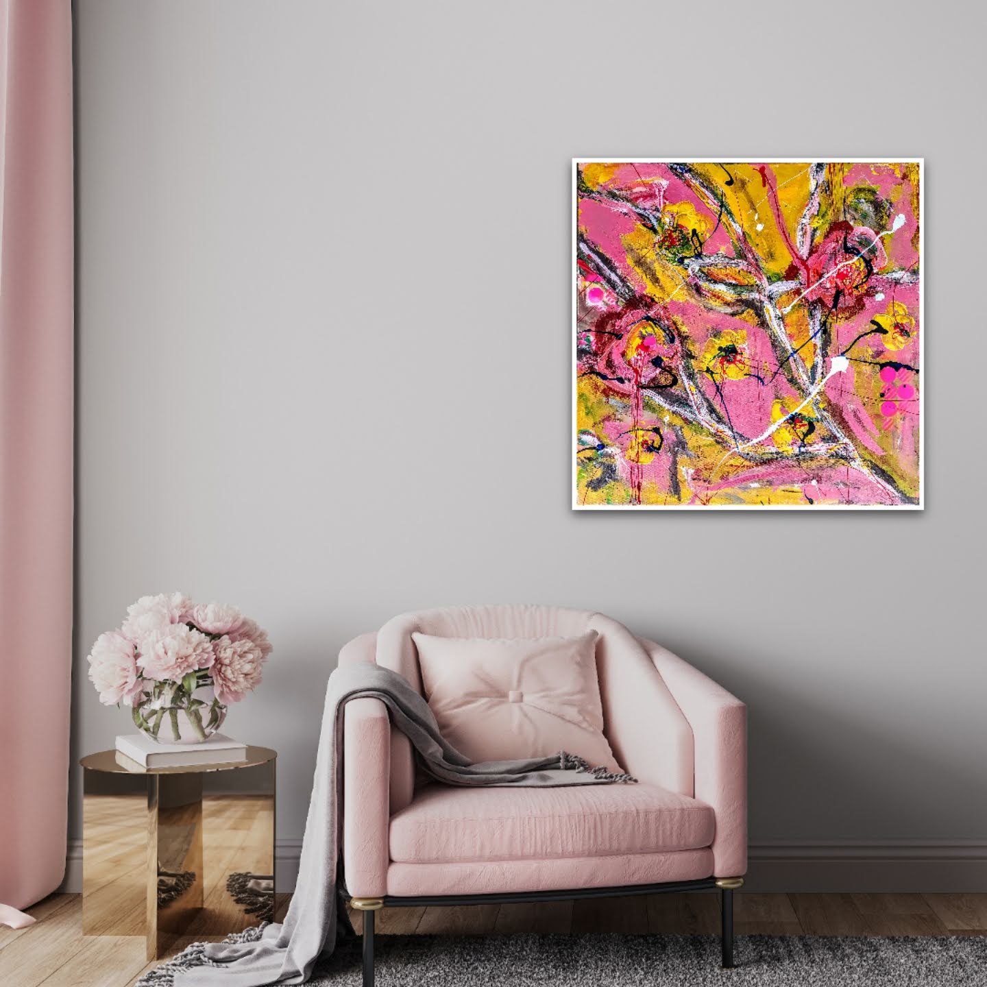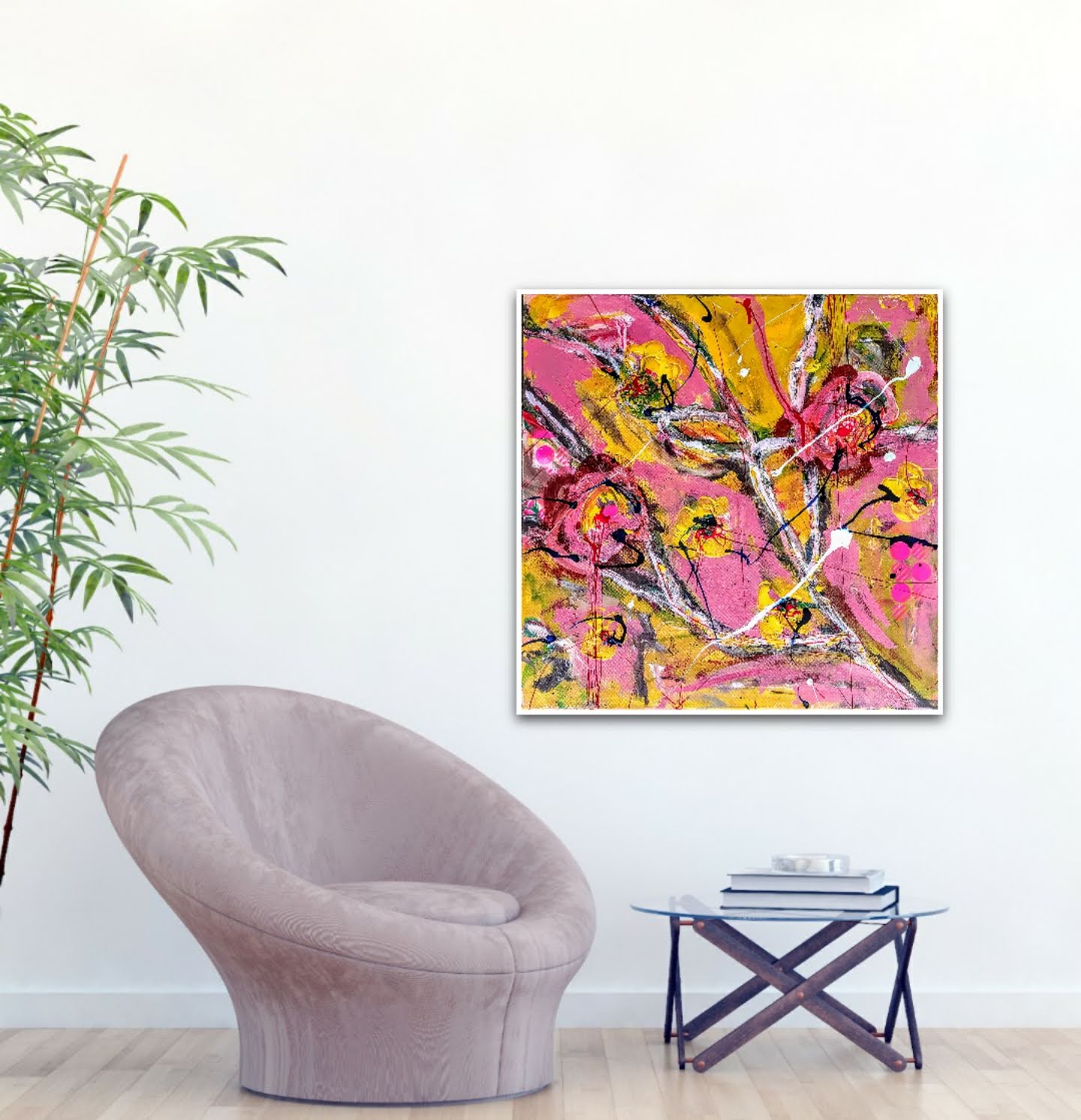 Fondo trabajado con tonos rosas, sobre los cuales se desarrolla un paisaje de ramas y flores donde predominan los tonos amarillos, rojos y blancos. Se crean texturas muy marcadas, usando pinturas con diferentes densidades.