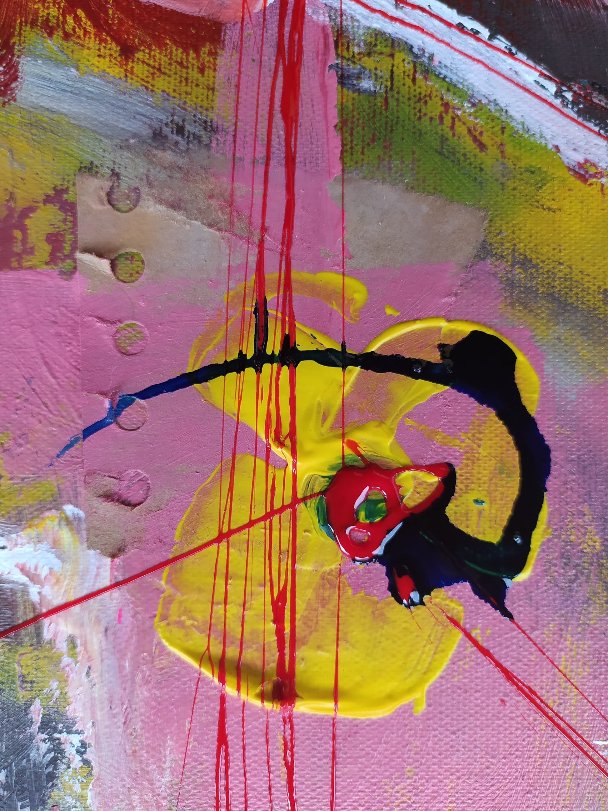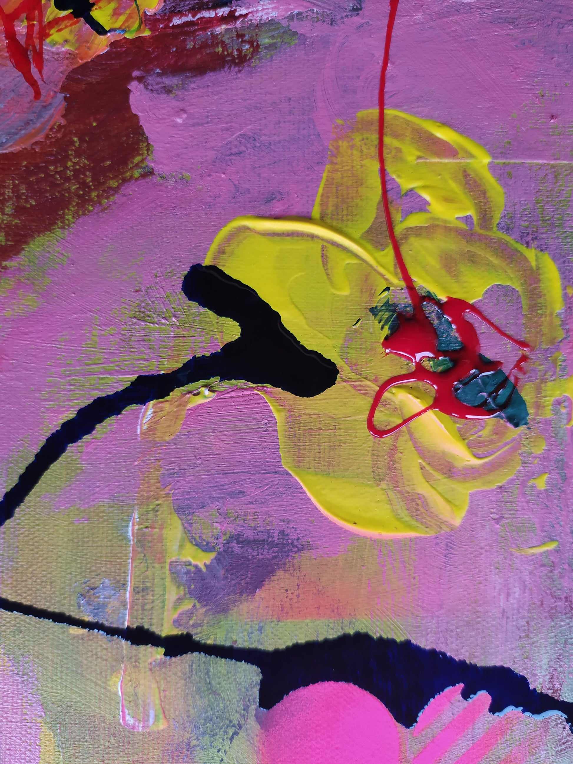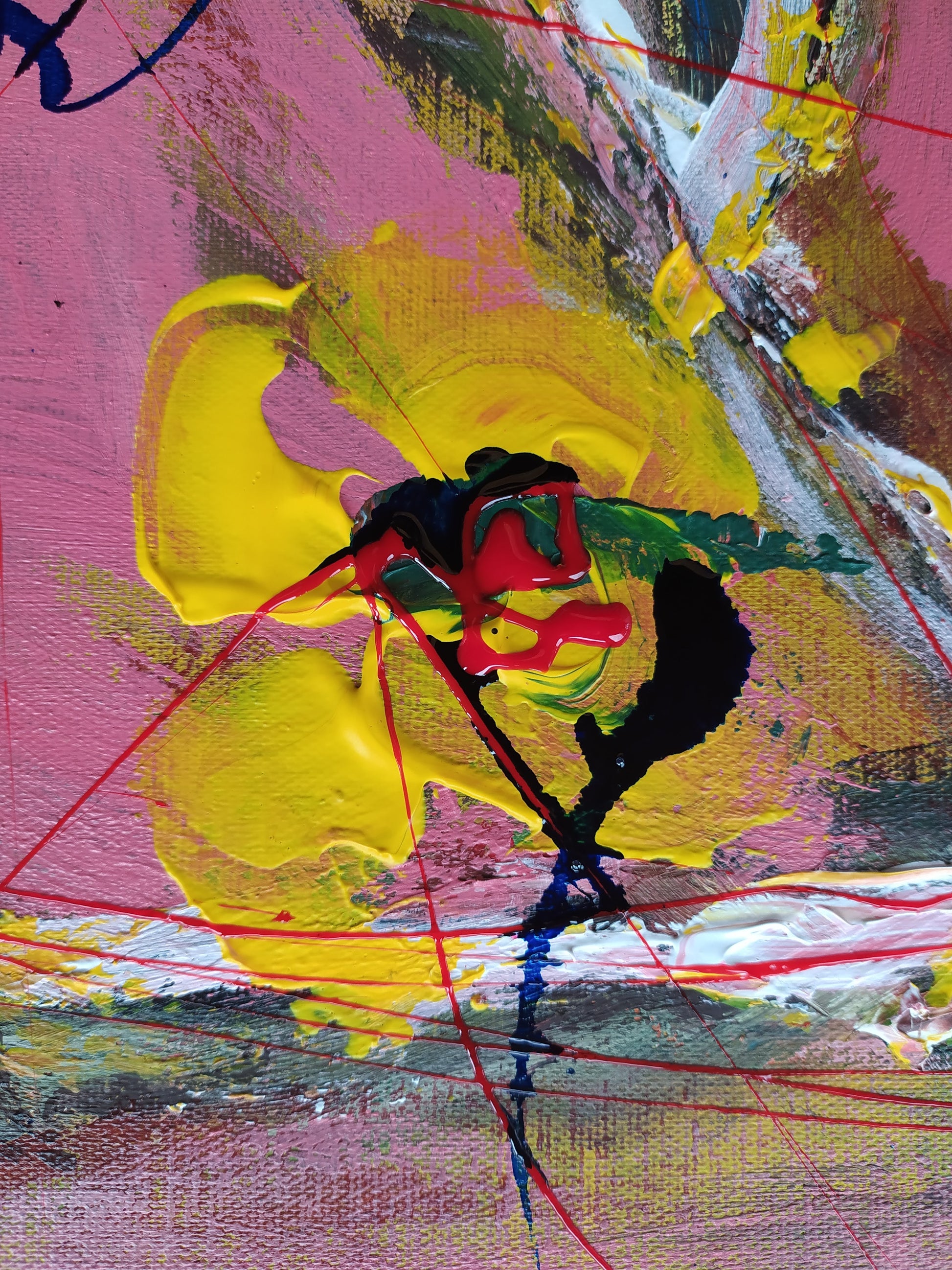 Fondo trabajado con tonos rosas, sobre los cuales se desarrolla un paisaje de ramas y flores donde predominan los tonos amarillos, rojos y blancos. Se crean texturas muy marcadas, usando pinturas con diferentes densidades.
