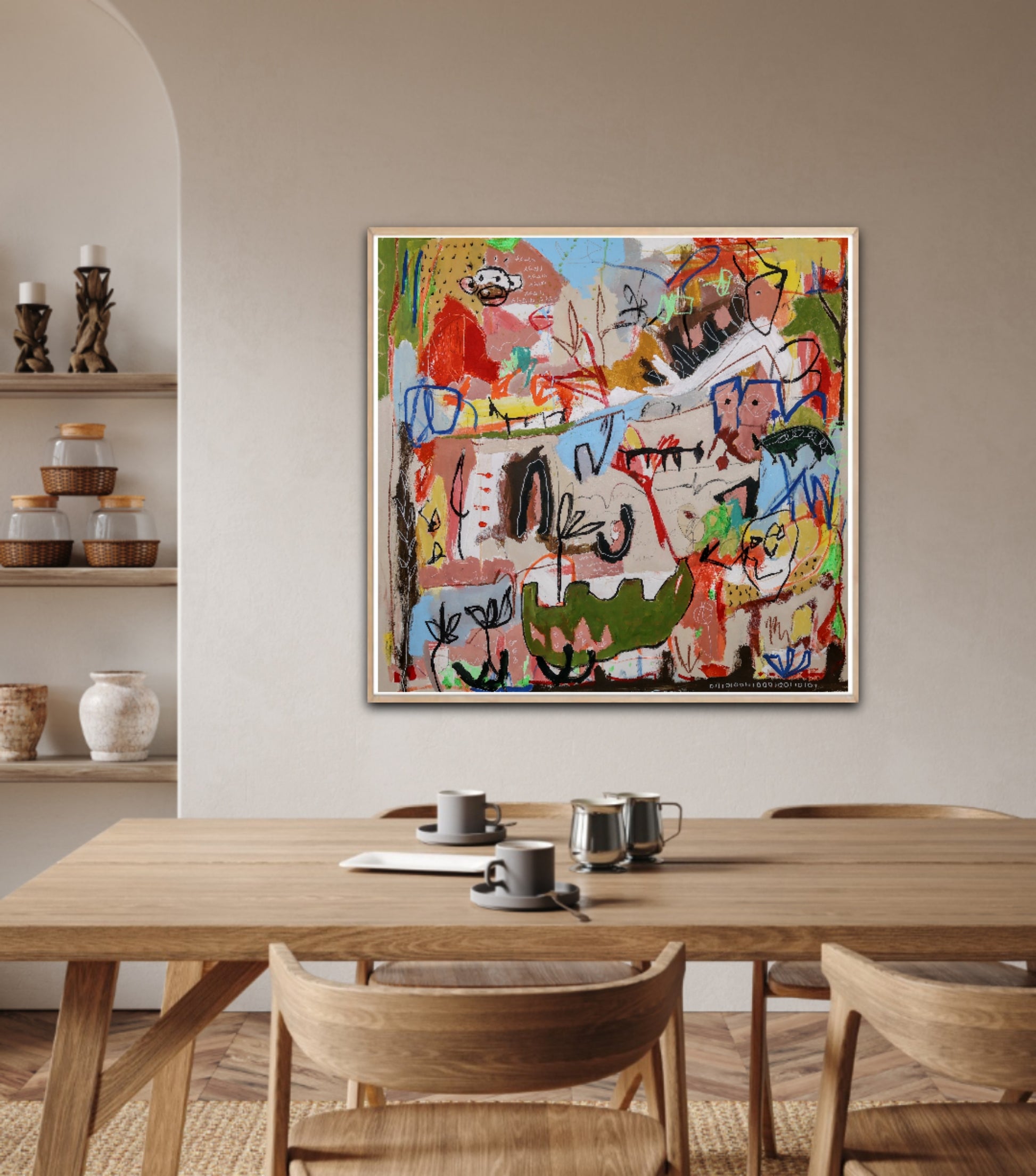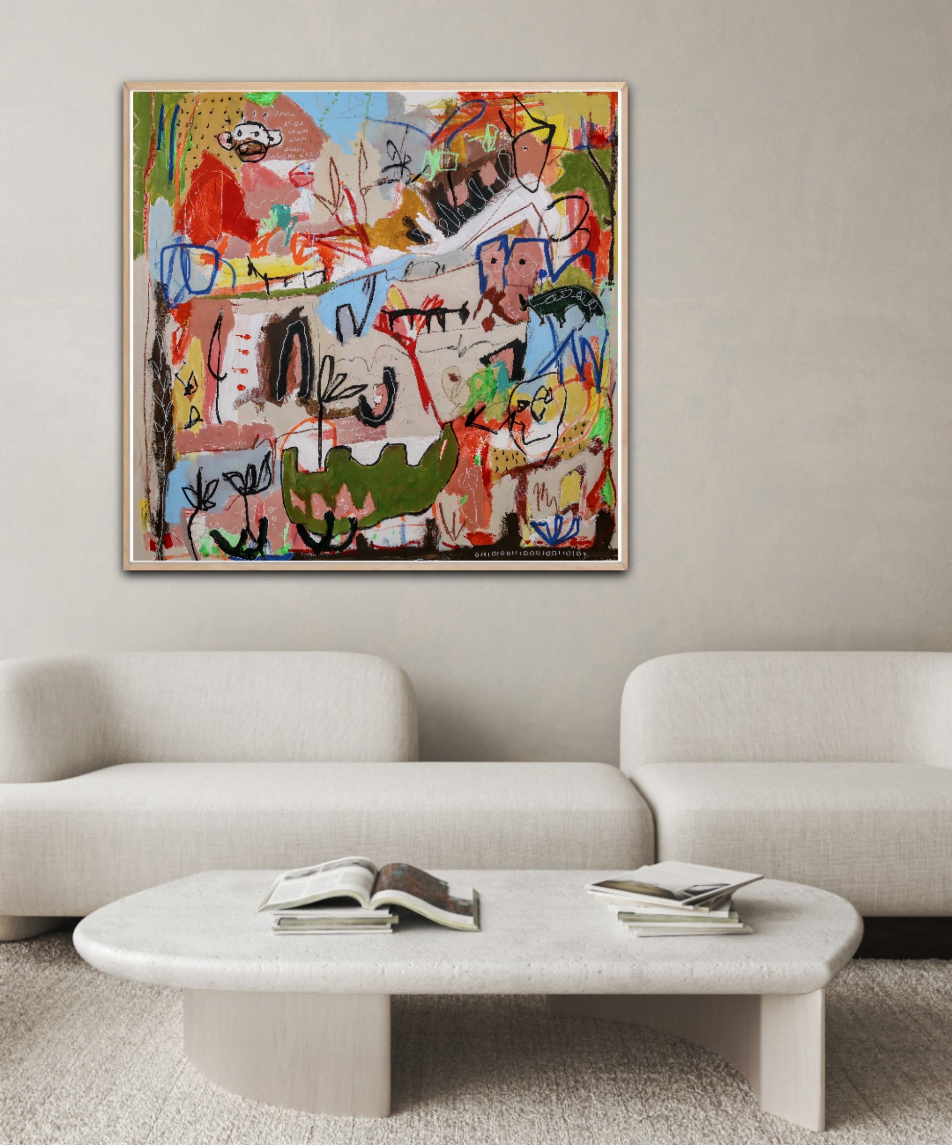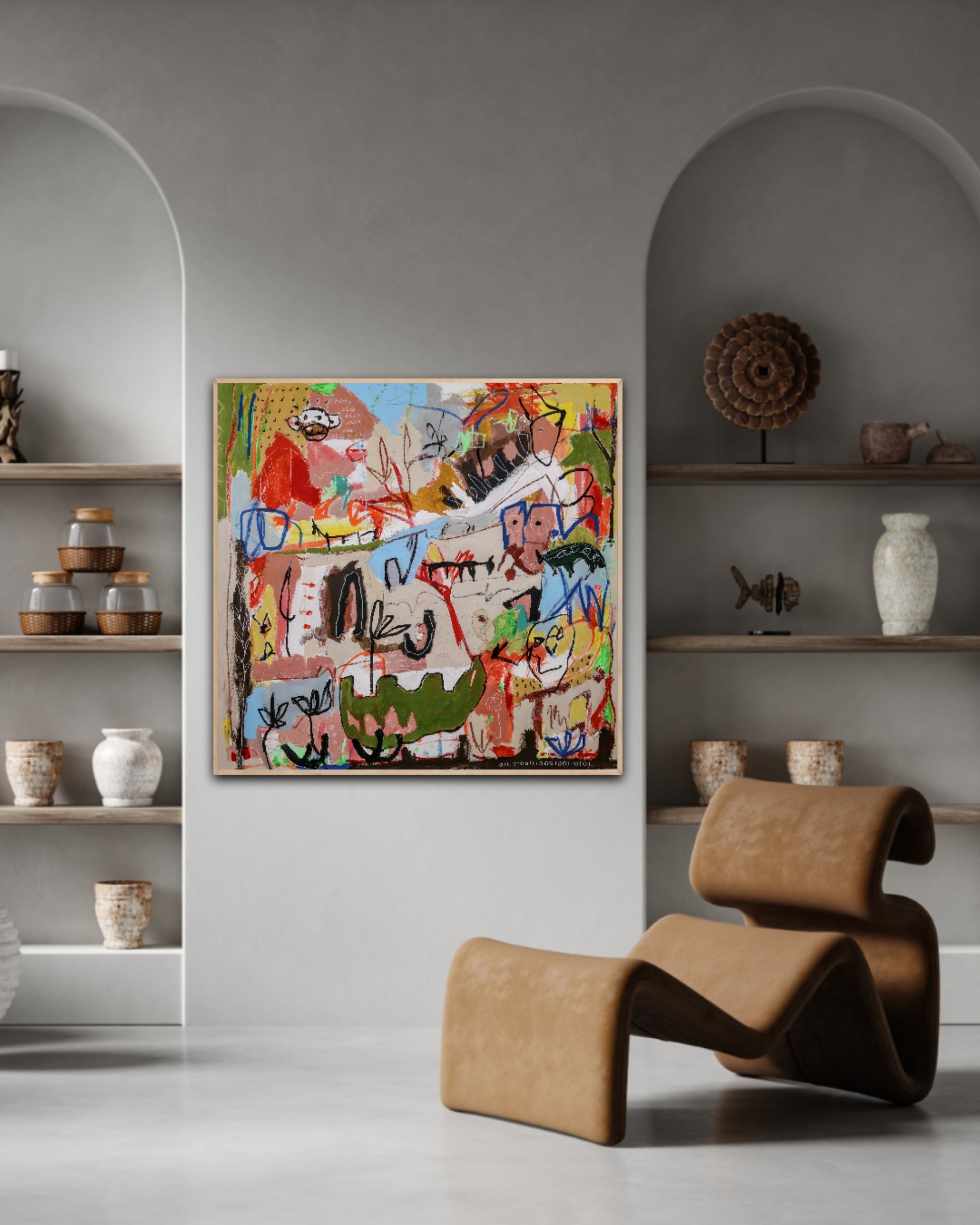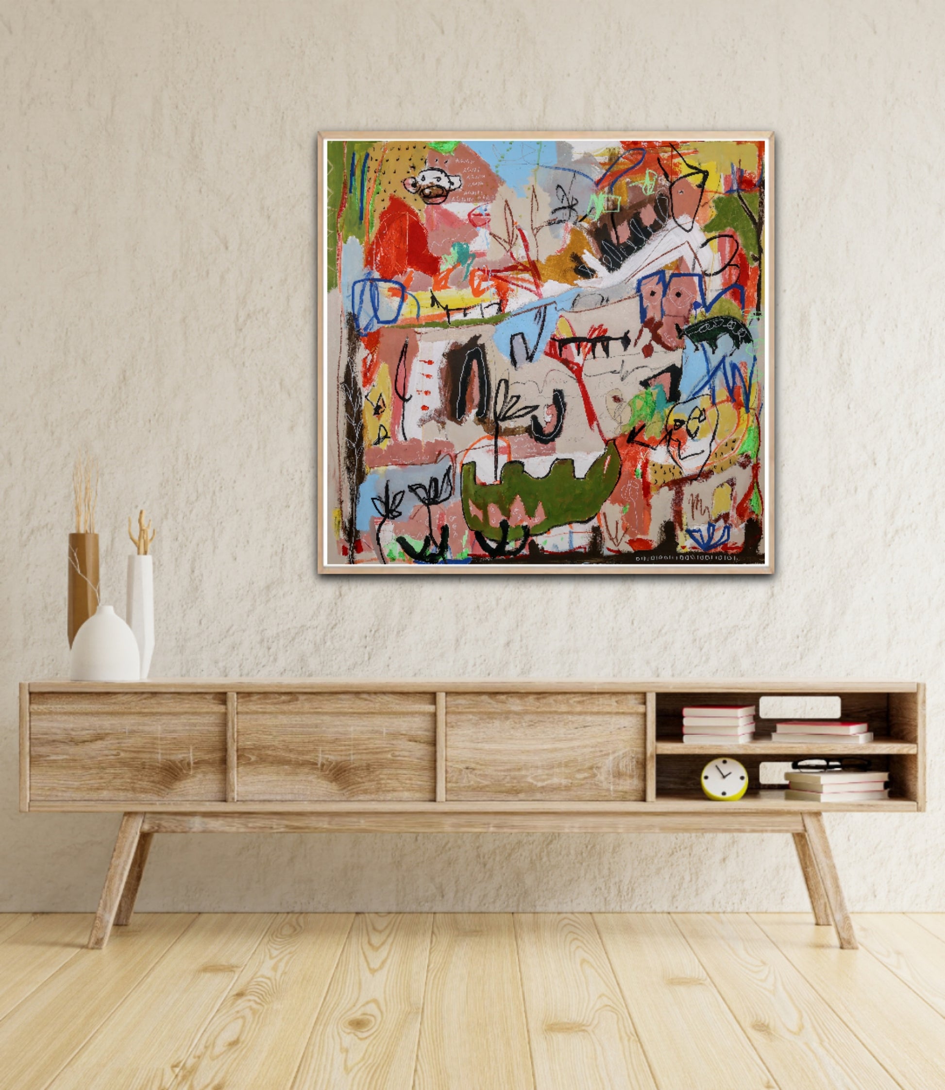 Técnica: acrílico, pigmentos, tempera, carboncillo, lápiz y pastel.