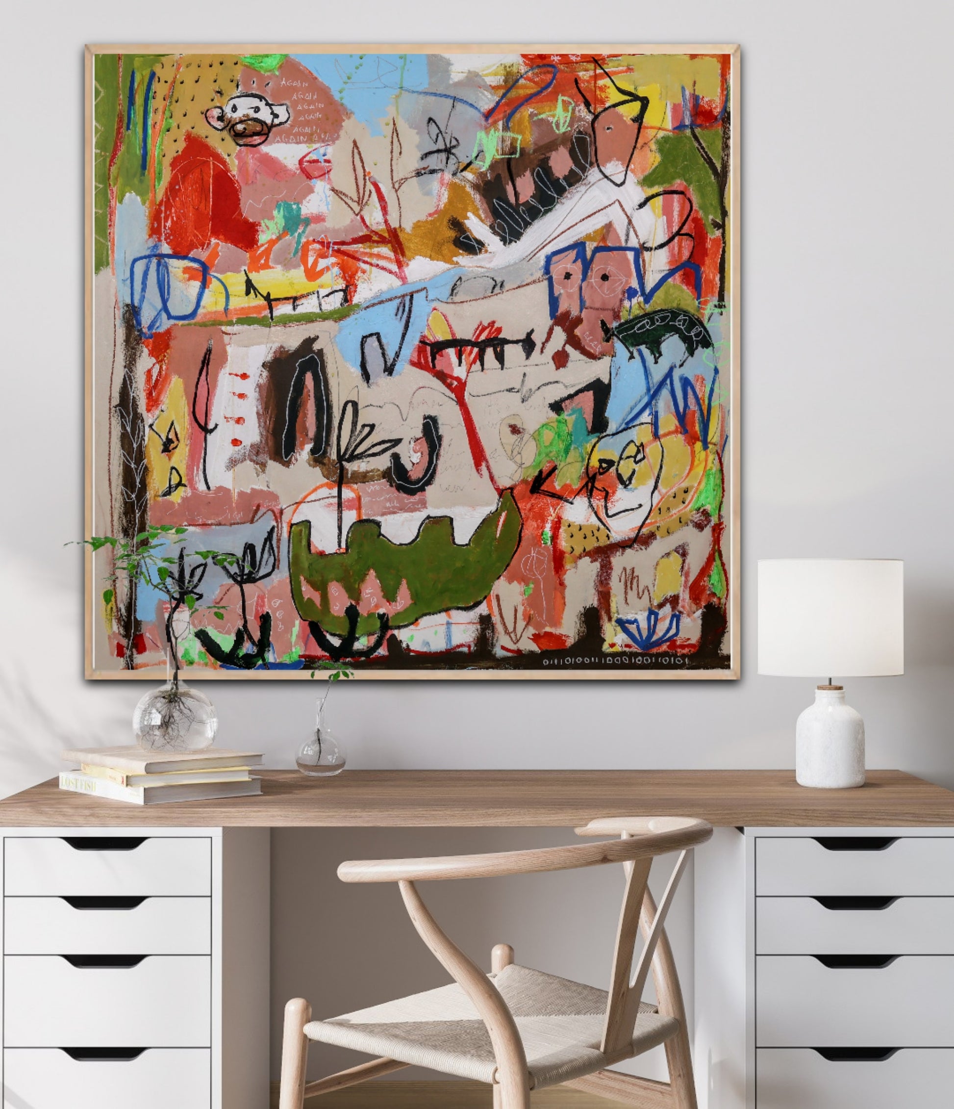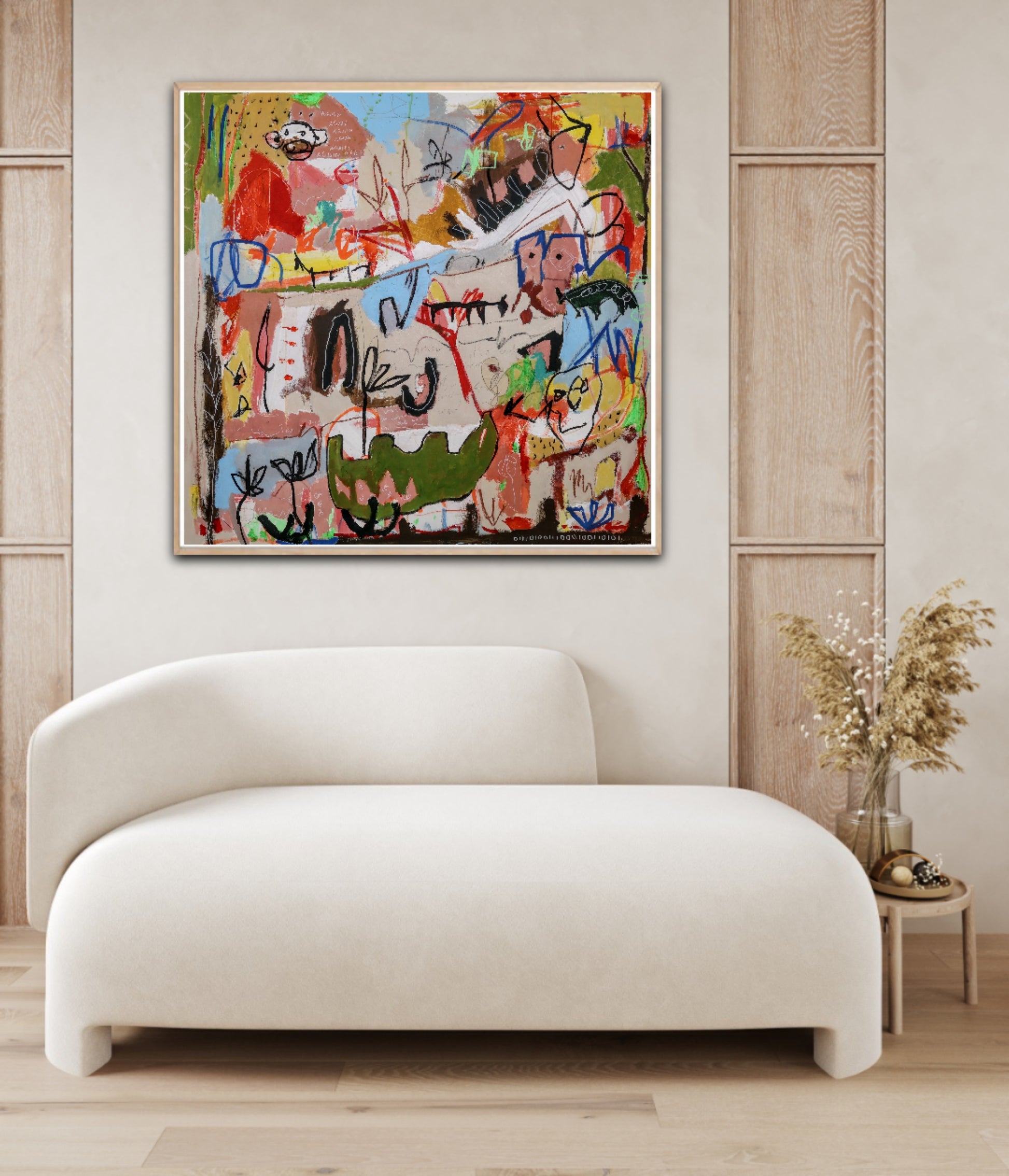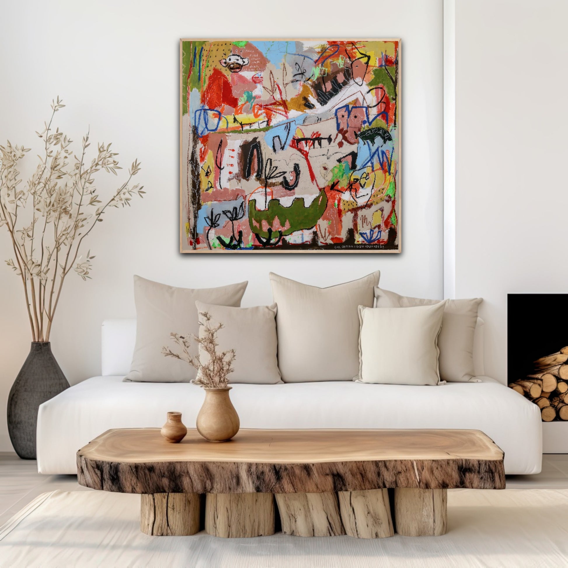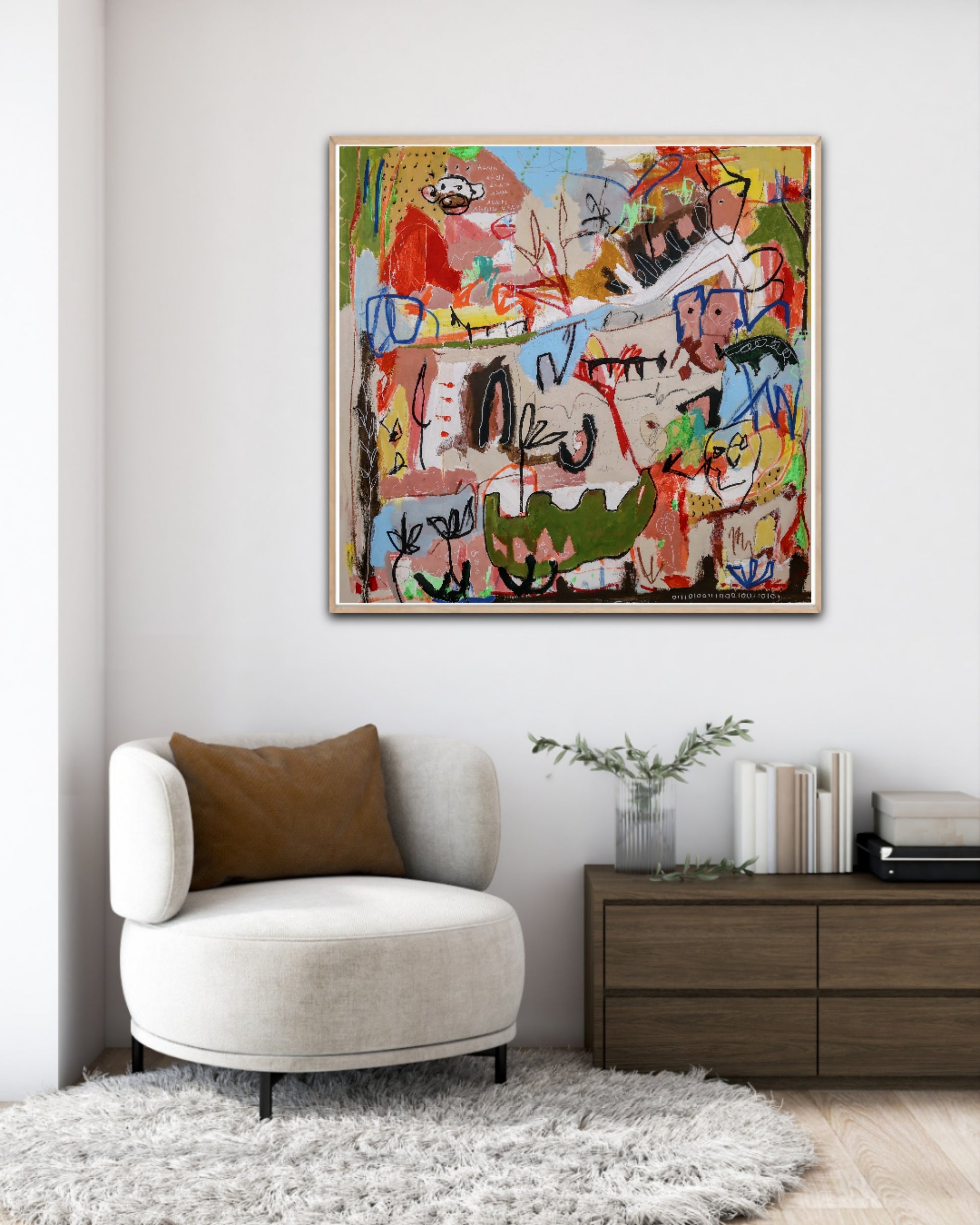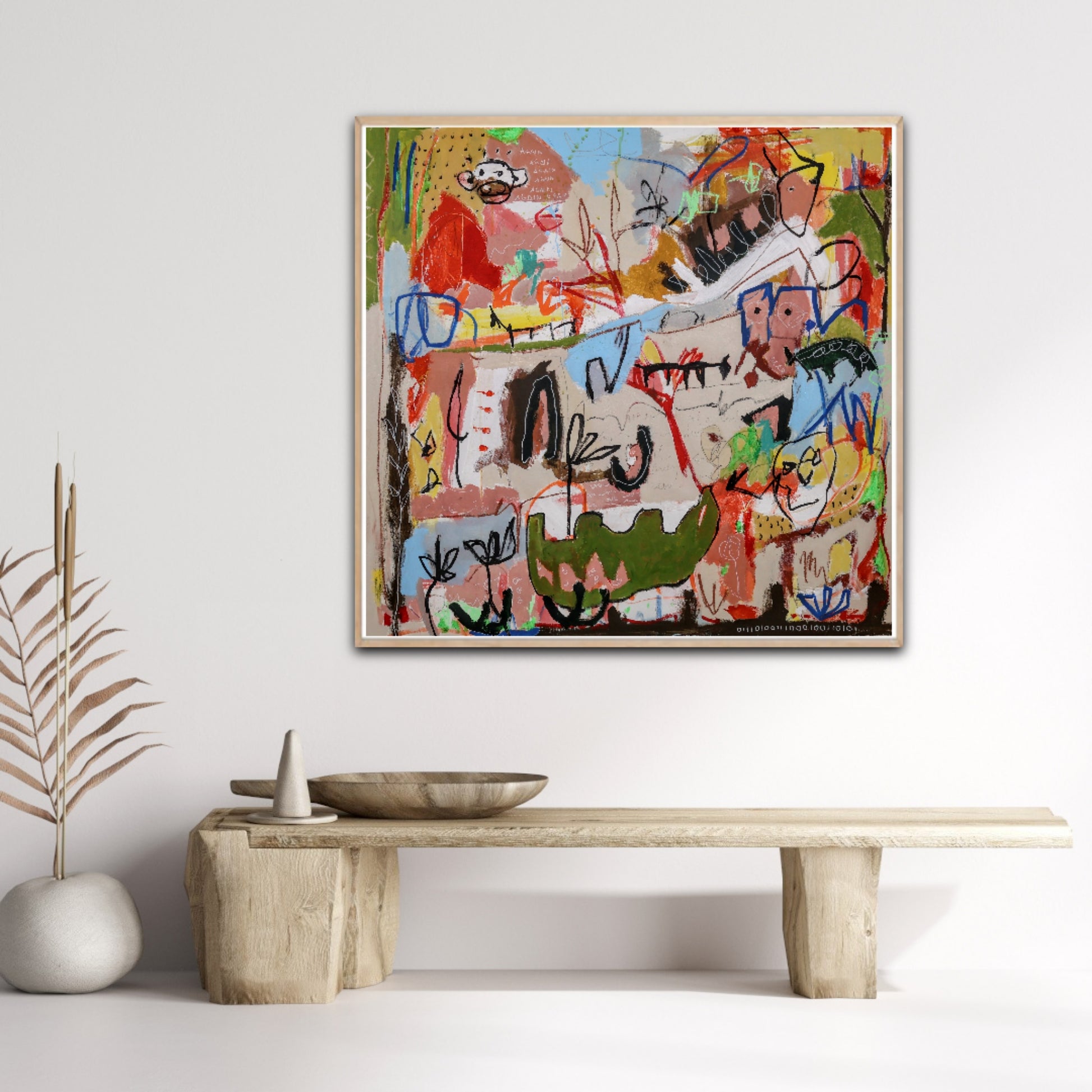 Técnica: acrílico, pigmentos, tempera, carboncillo, lápiz y pastel.