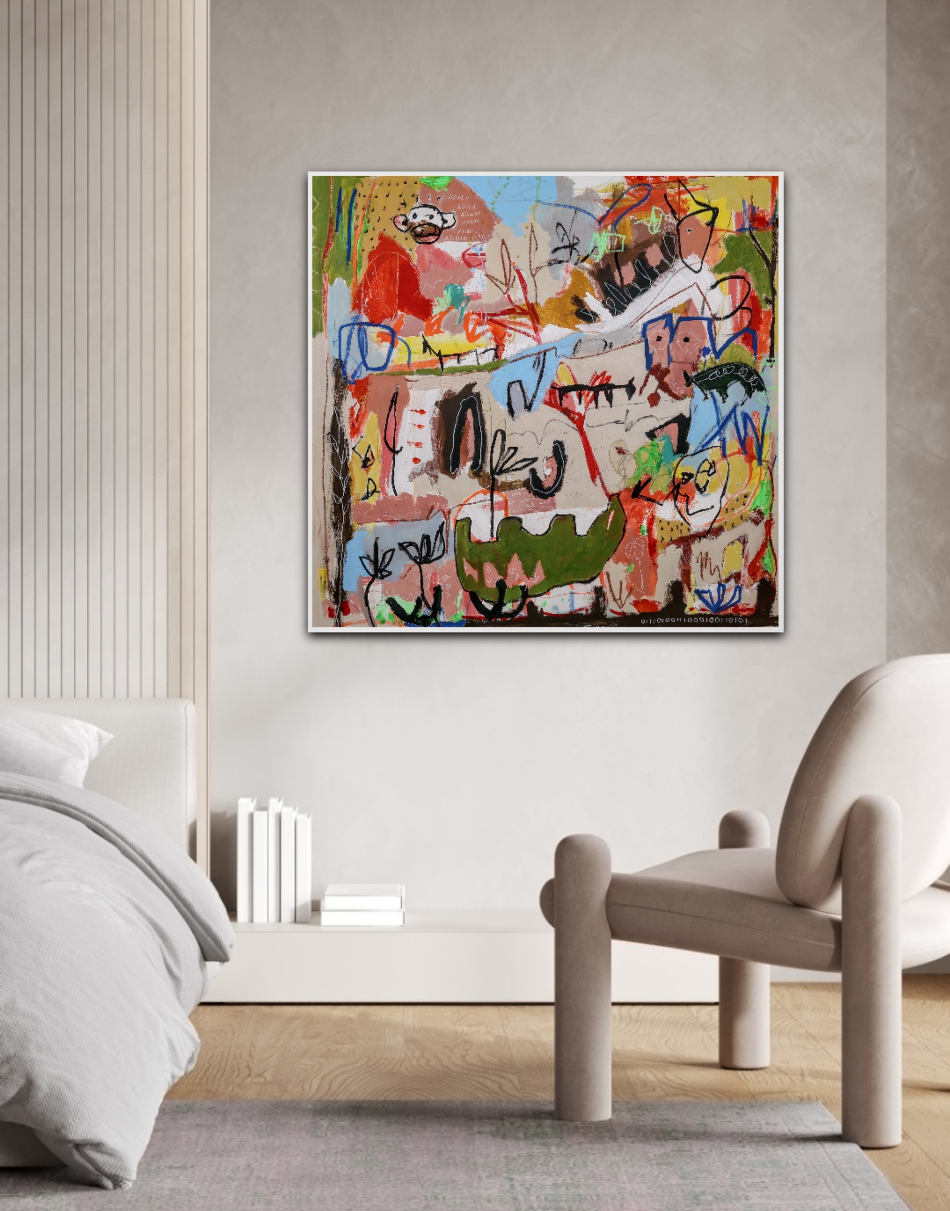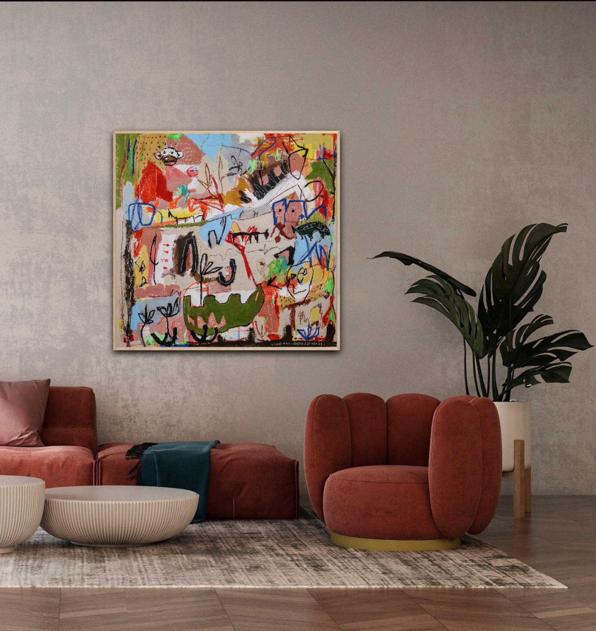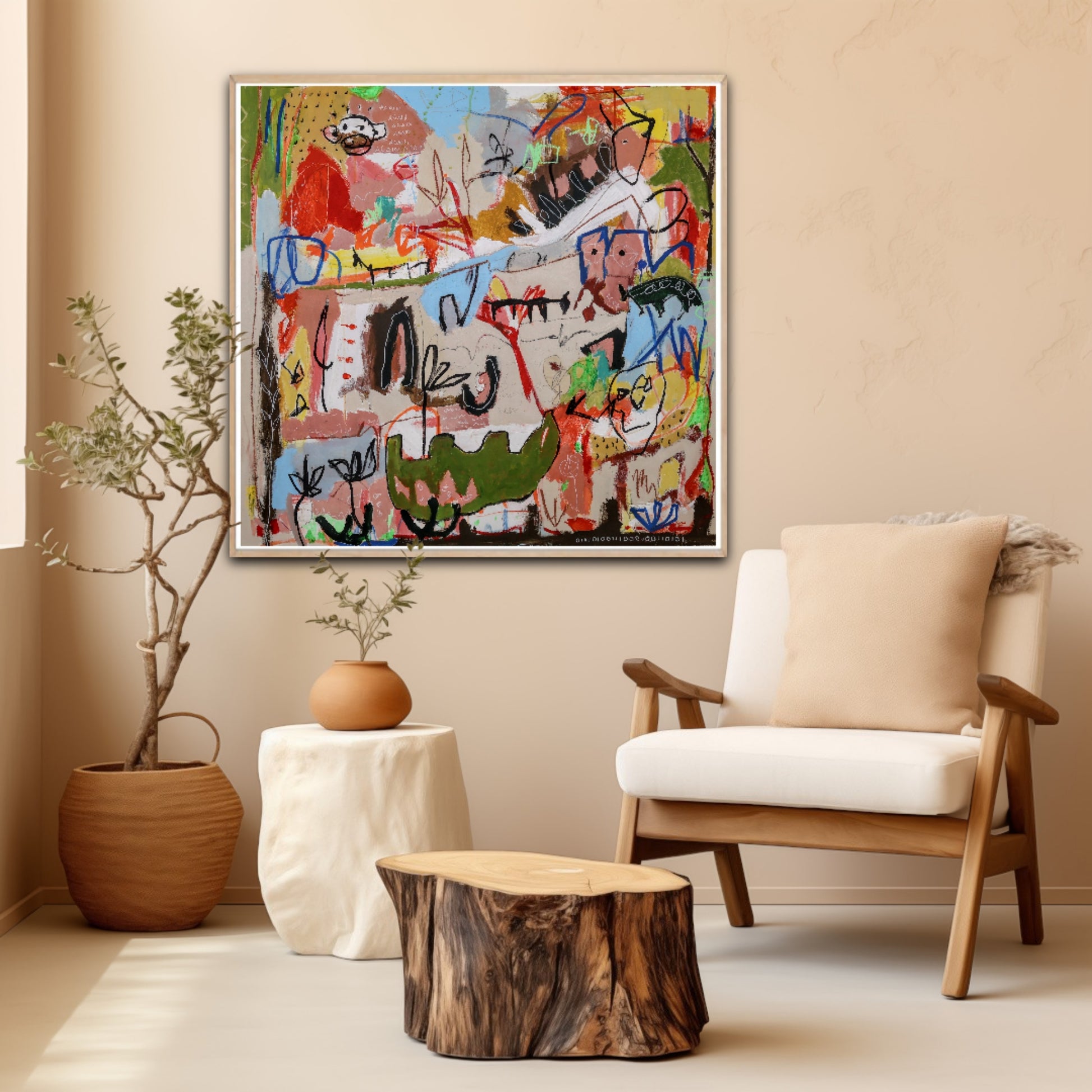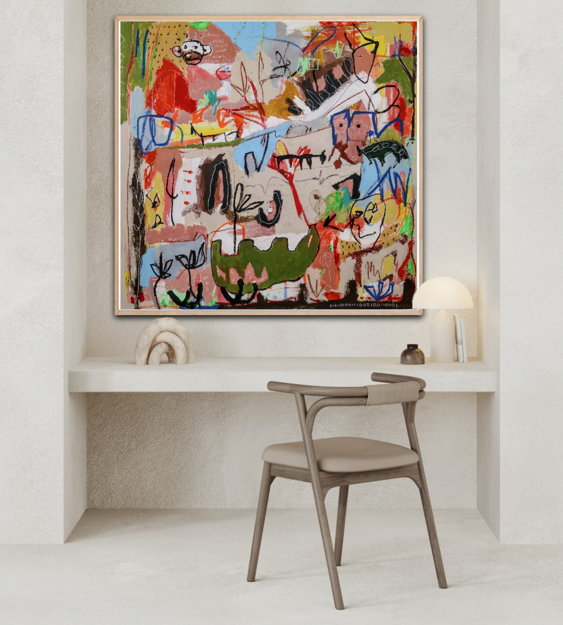 Técnica: acrílico, pigmentos, tempera, carboncillo, lápiz y pastel.