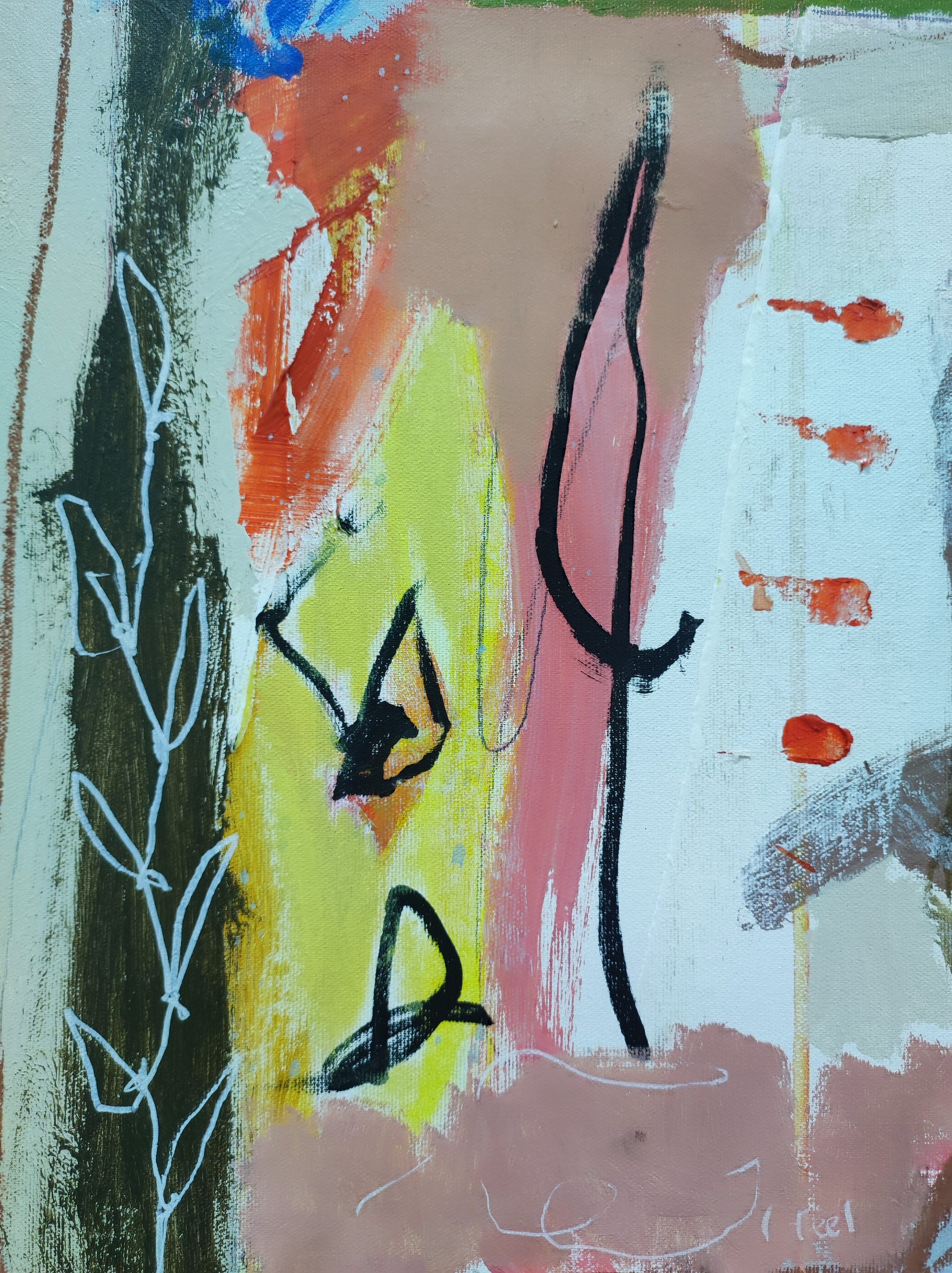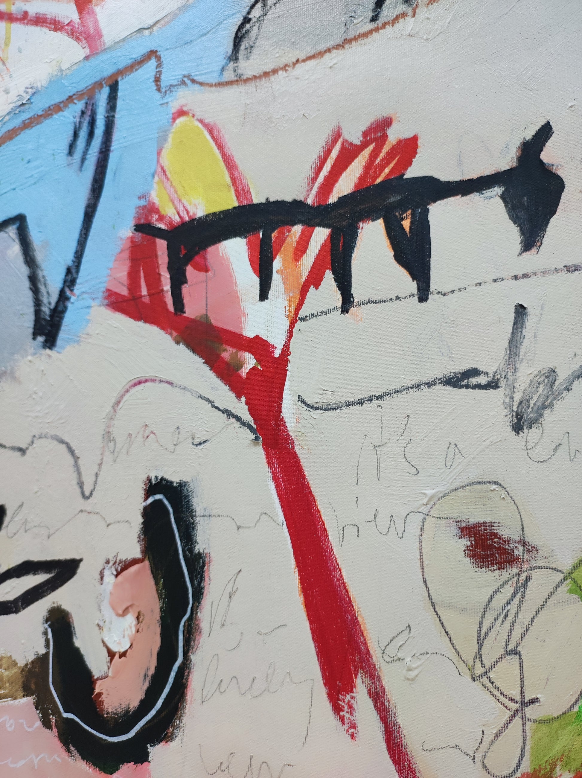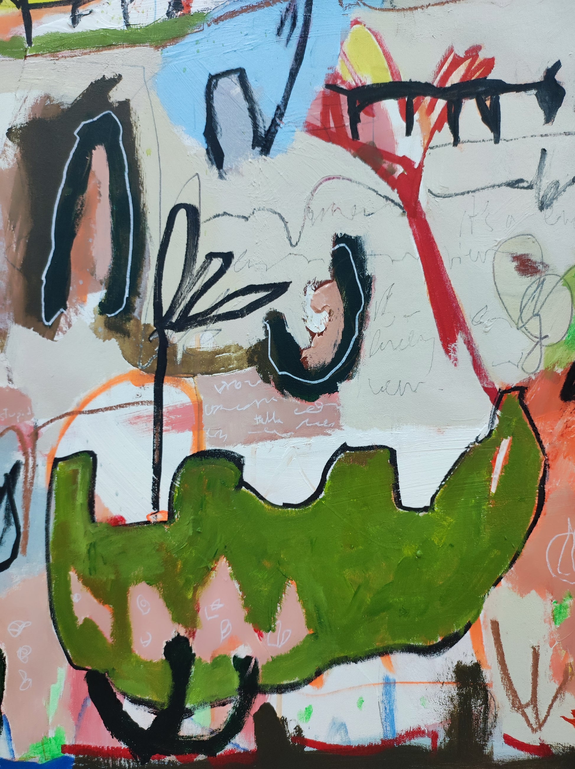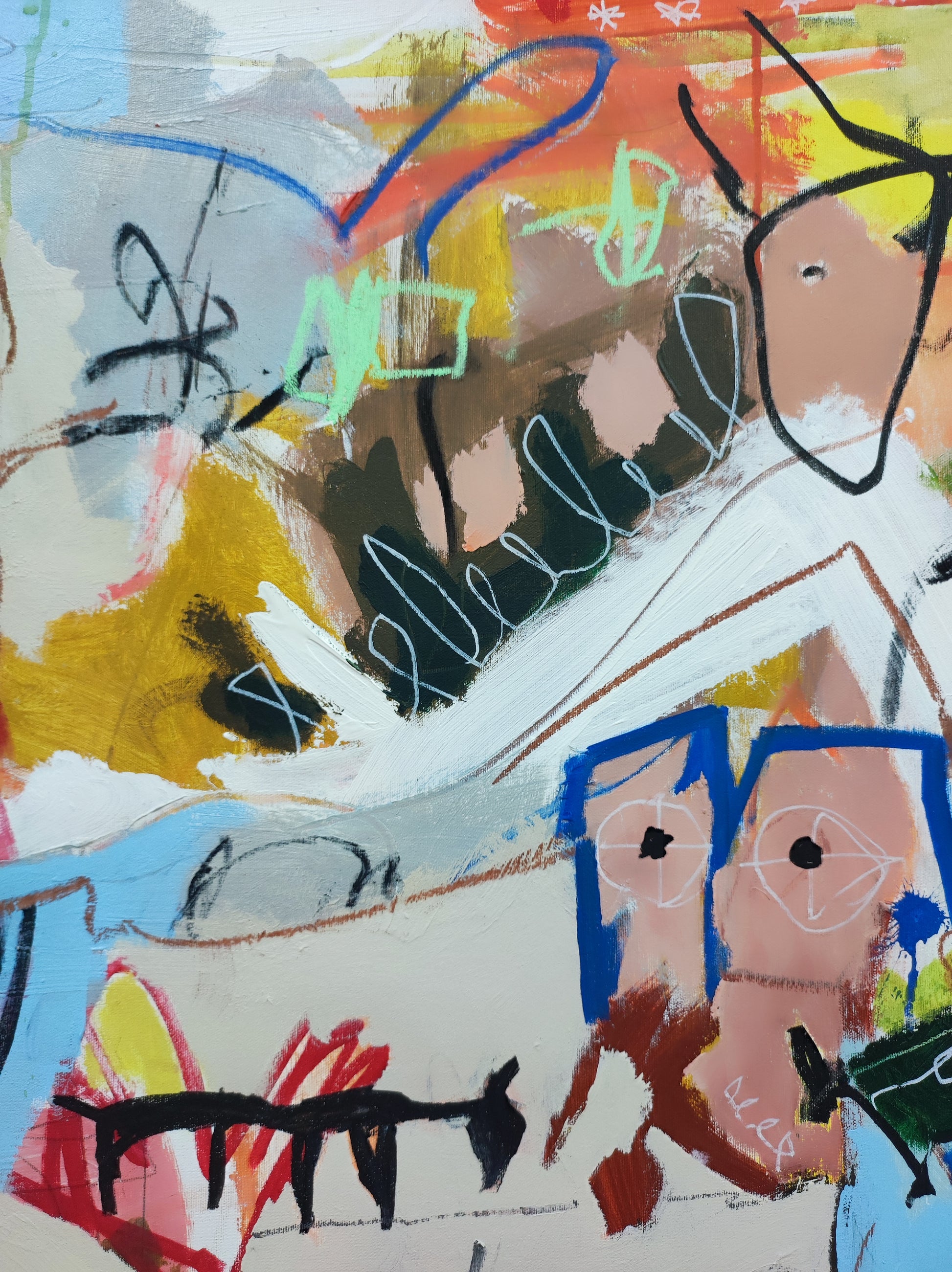 Pintura gestual, intuitiva, que deja que las cosas pasen y se apoya sobre lo que aparece. Aprovechando el accidente y aceptando las consecuencias.