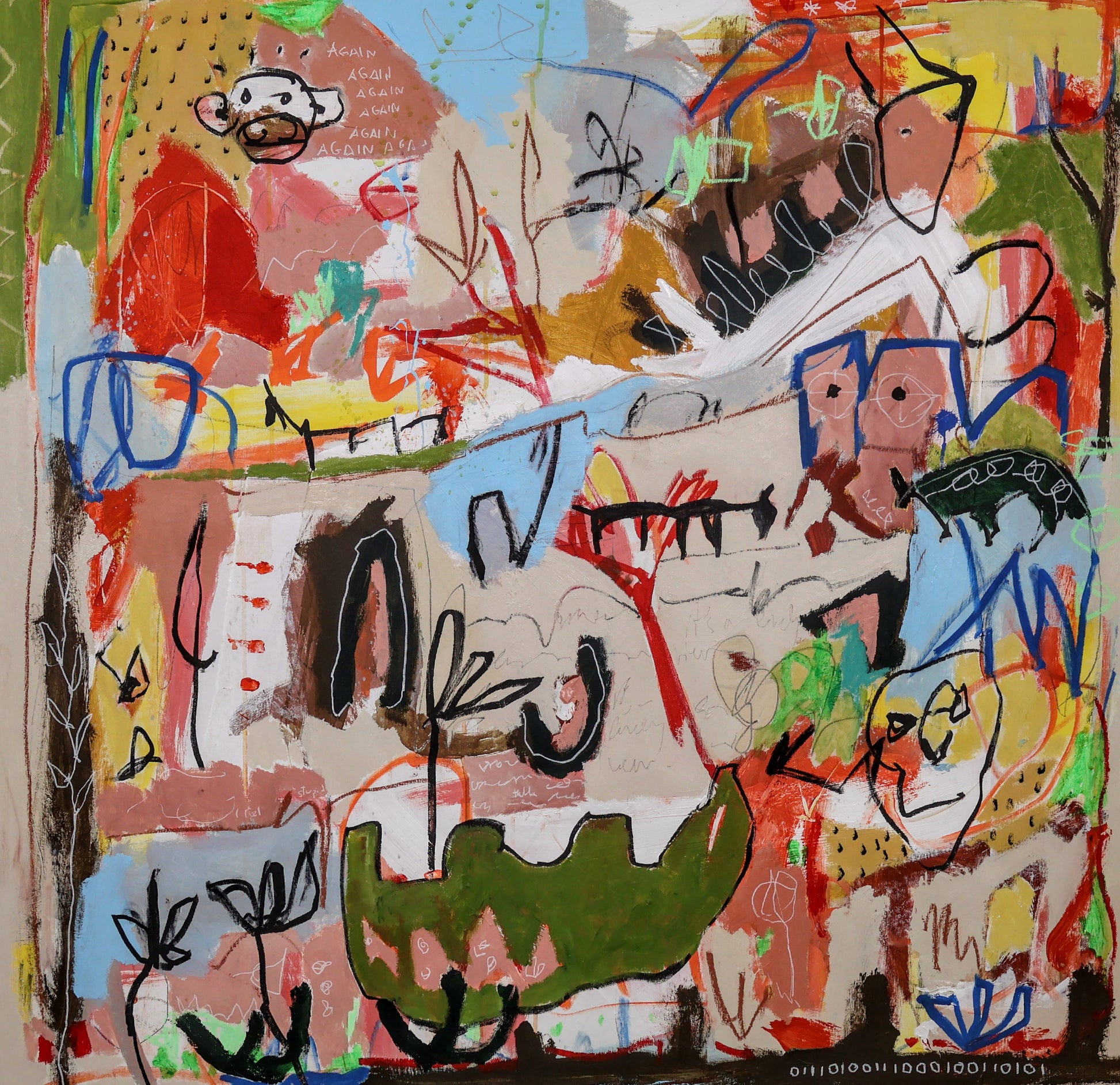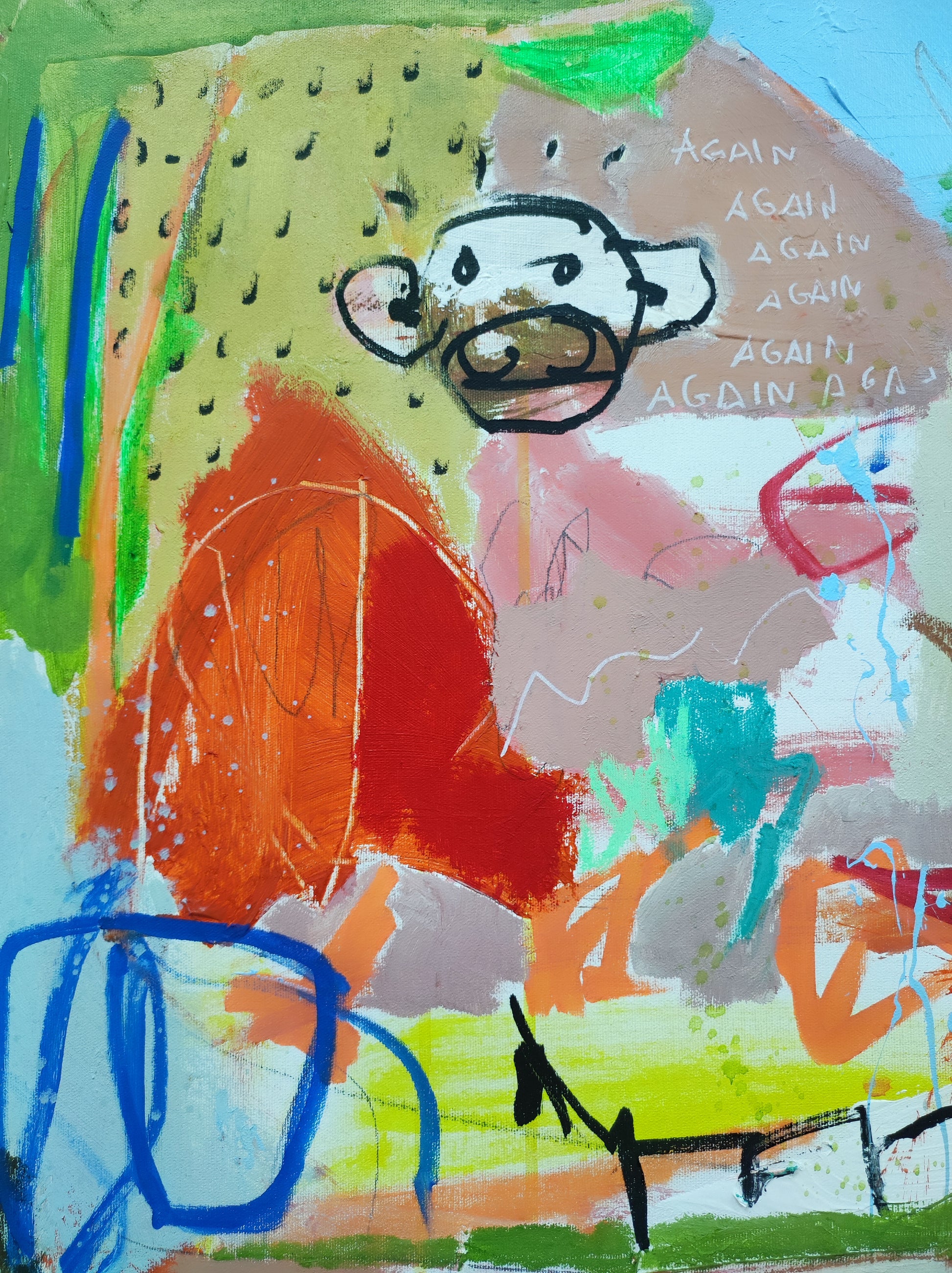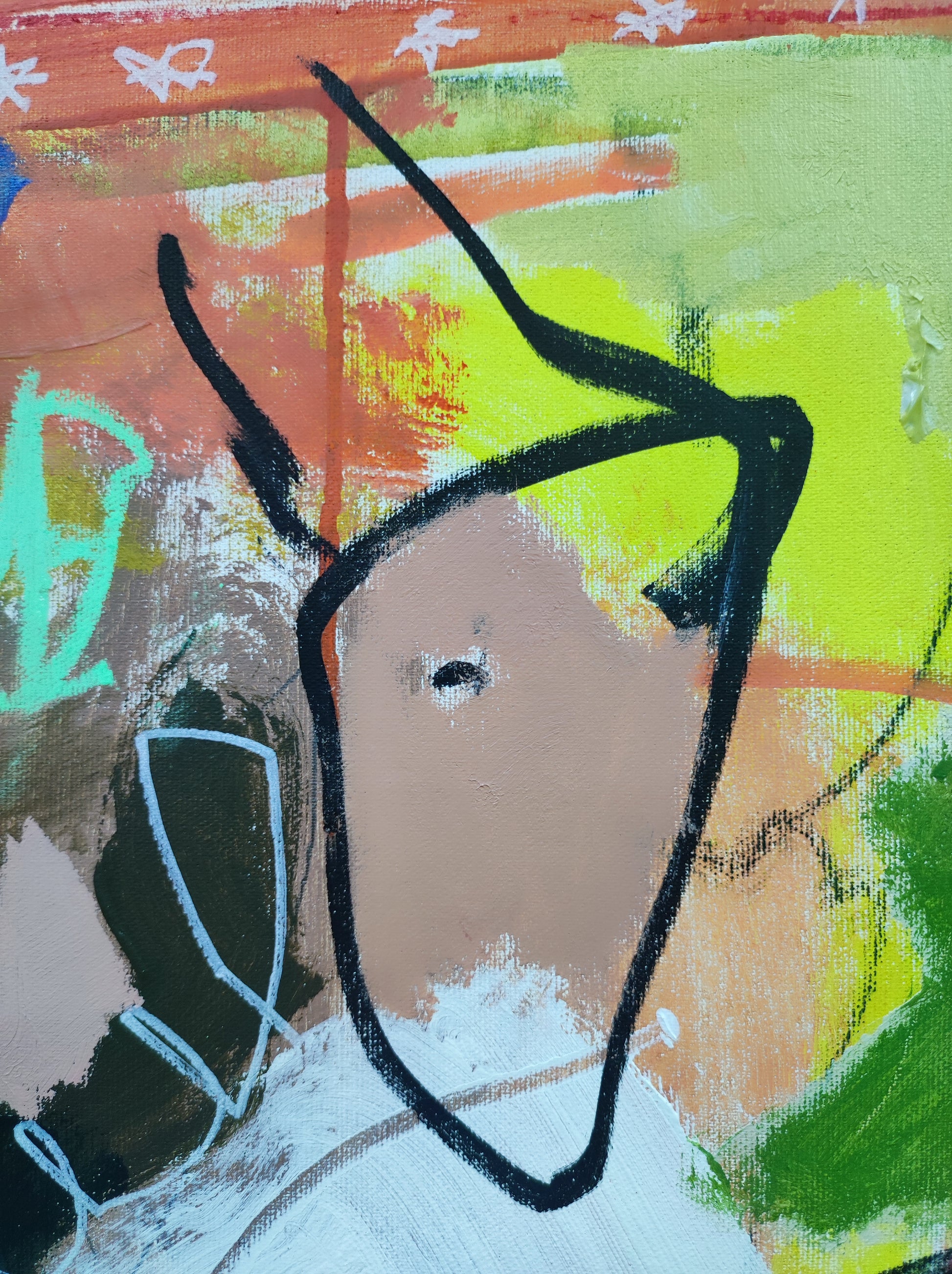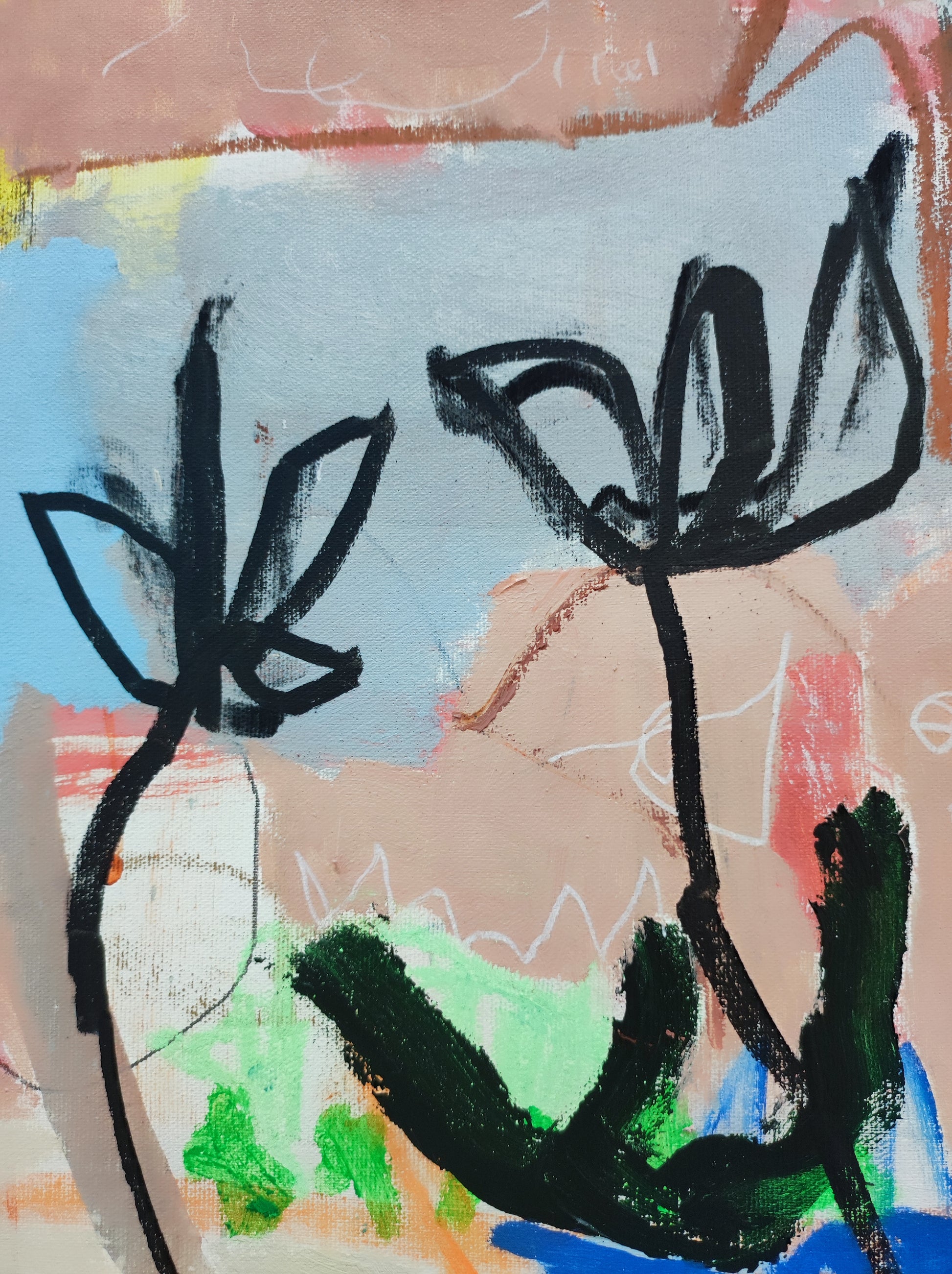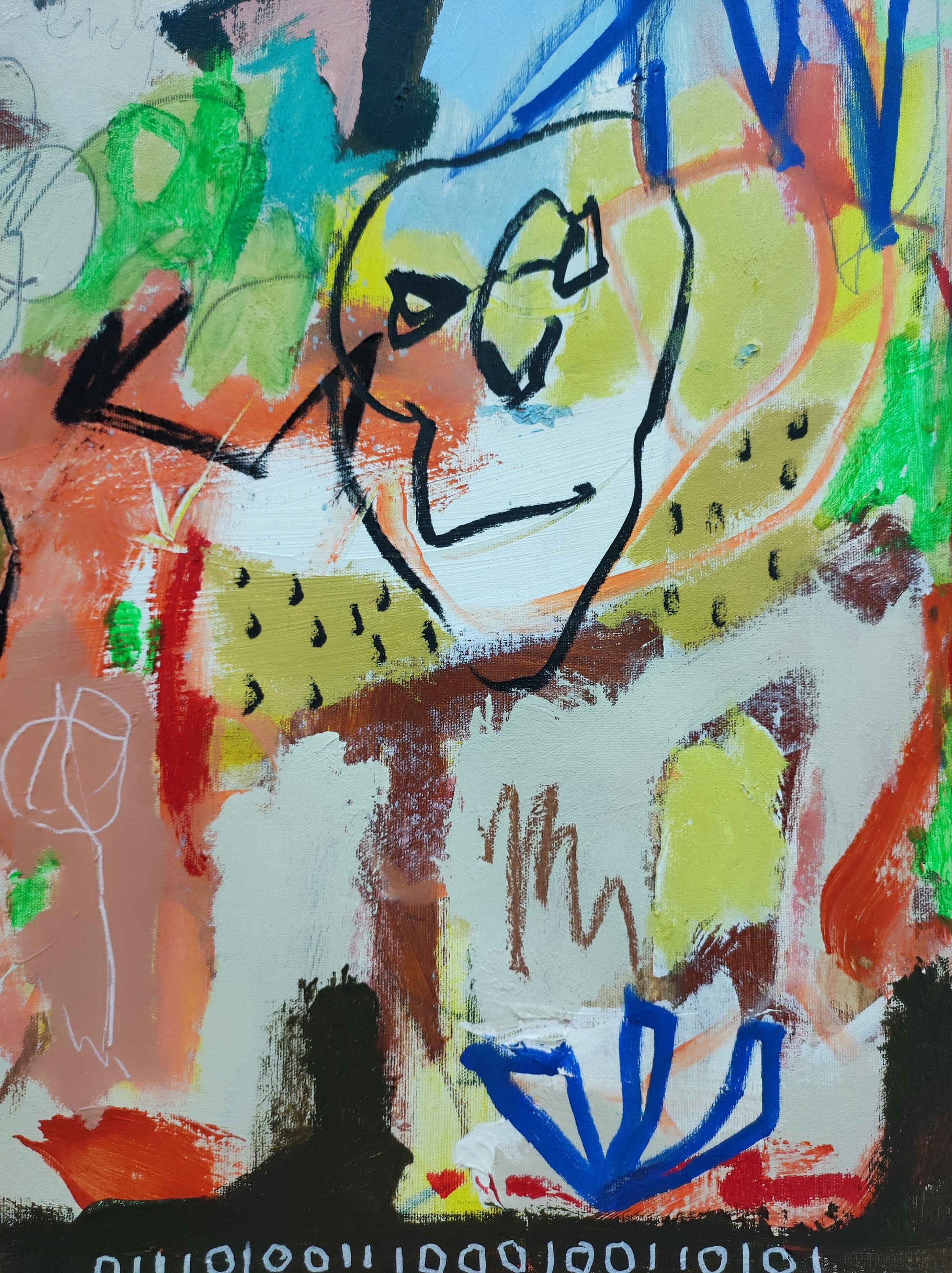Pintura gestual, intuitiva, que deja que las cosas pasen y se apoya sobre lo que aparece. Aprovechando el accidente y aceptando las consecuencias.