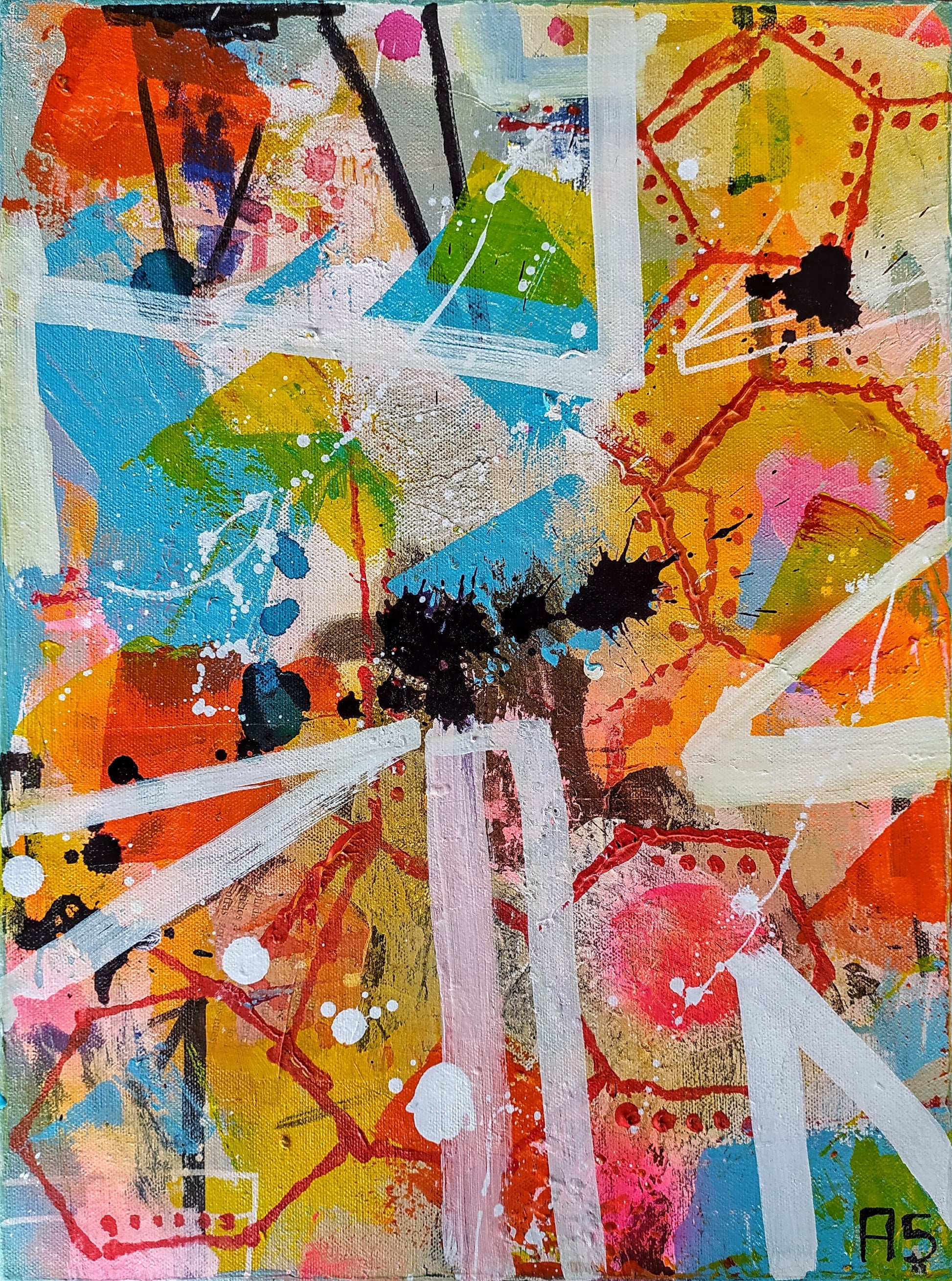 Acrílicos, tintas al alcohol, pintura en spray, rotuladores acrílicos, carboncillo y ceras. Pinceladas rápidas, manchas, marcas, dripping...
