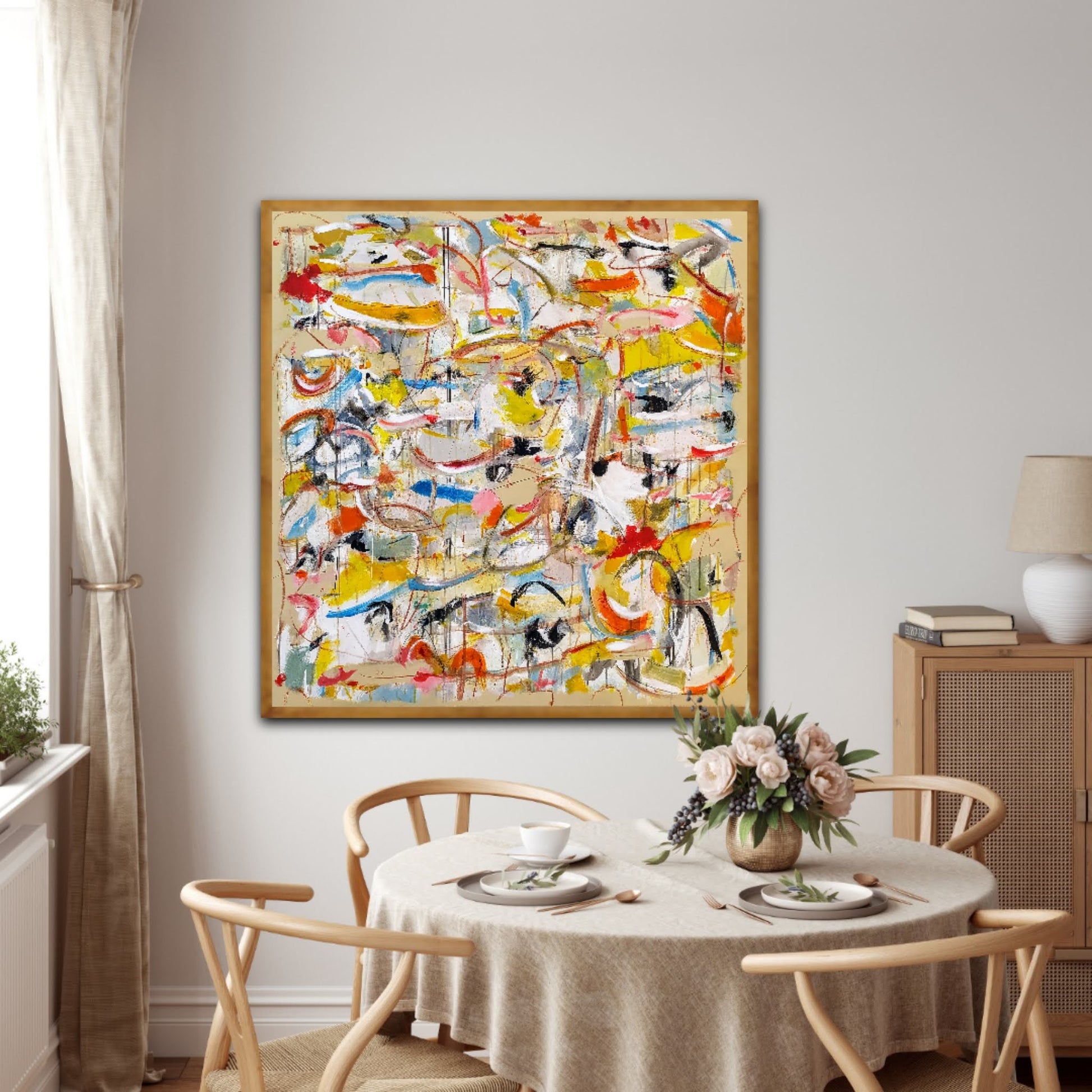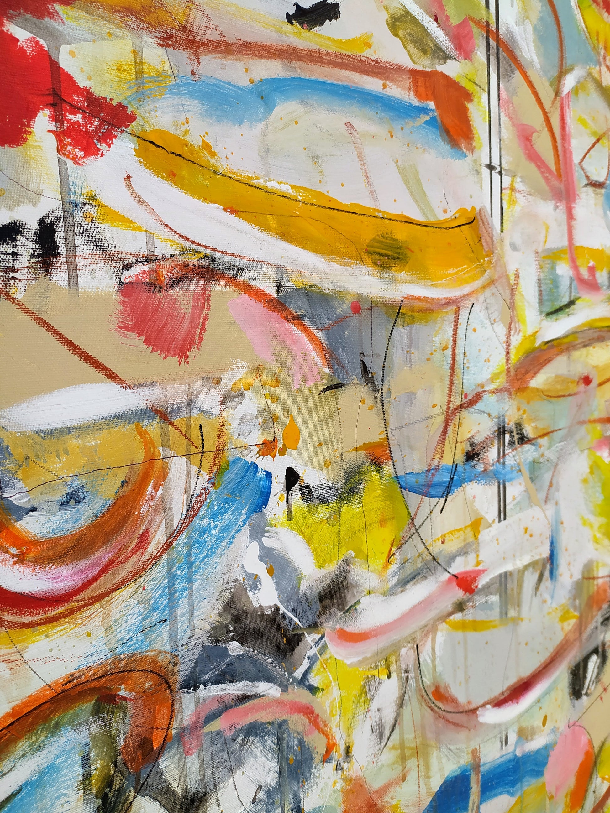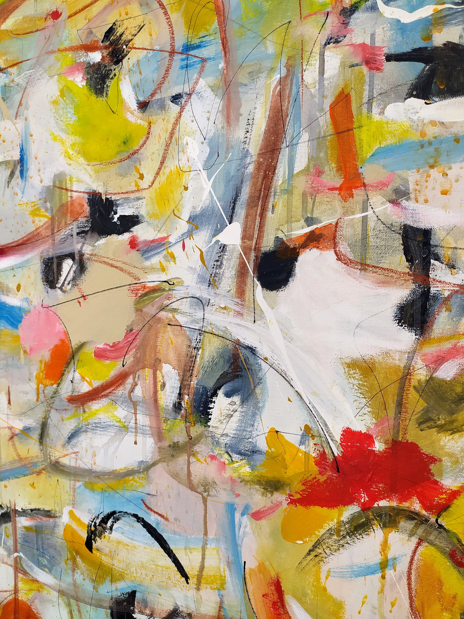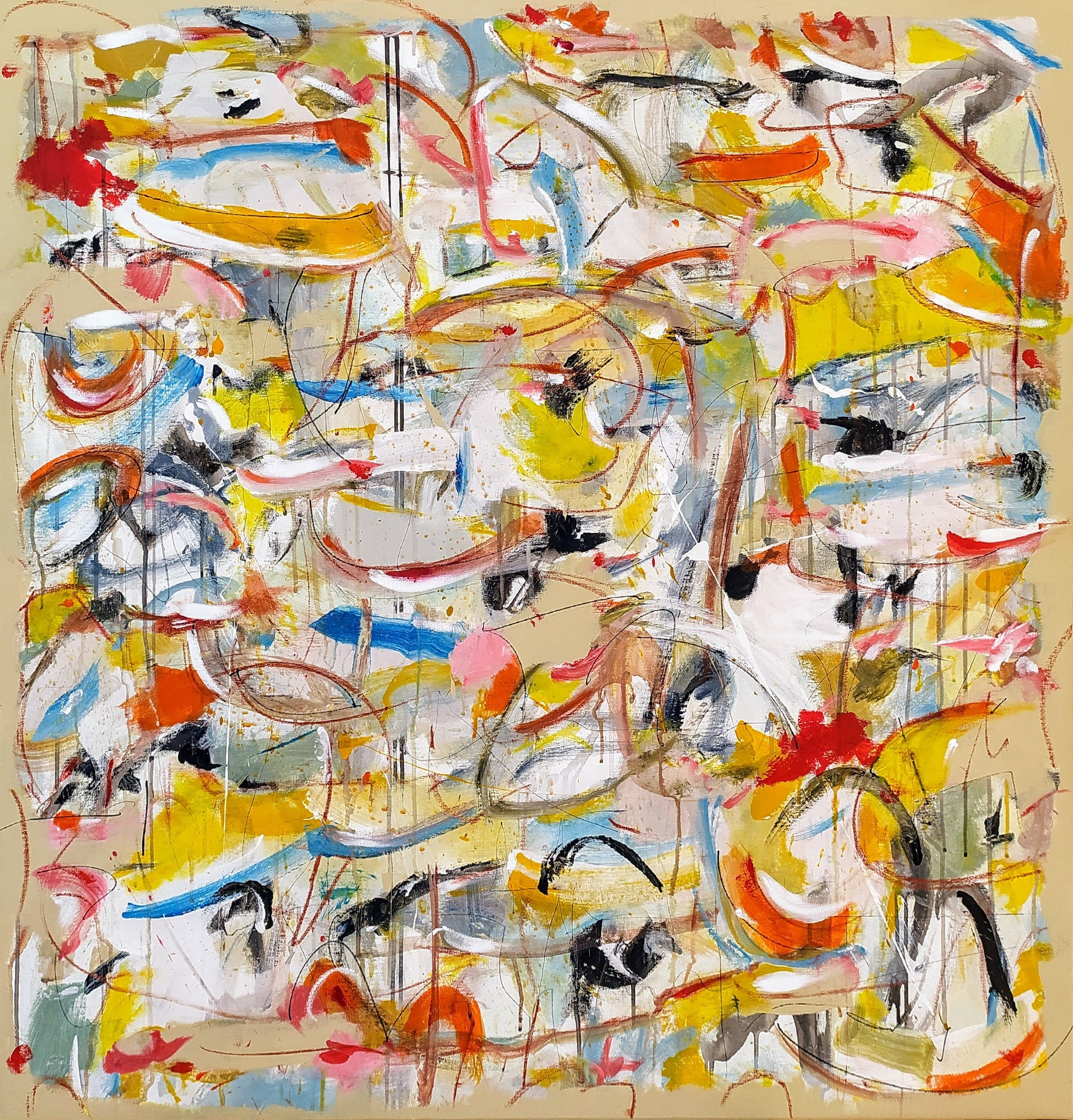 Multiples capas construidas con manchas, trazos, dripping y marcas crean una obra que refleja un estado de ánimo de calma, de tarde veraniega, sin prisas, de lectura y pintura.