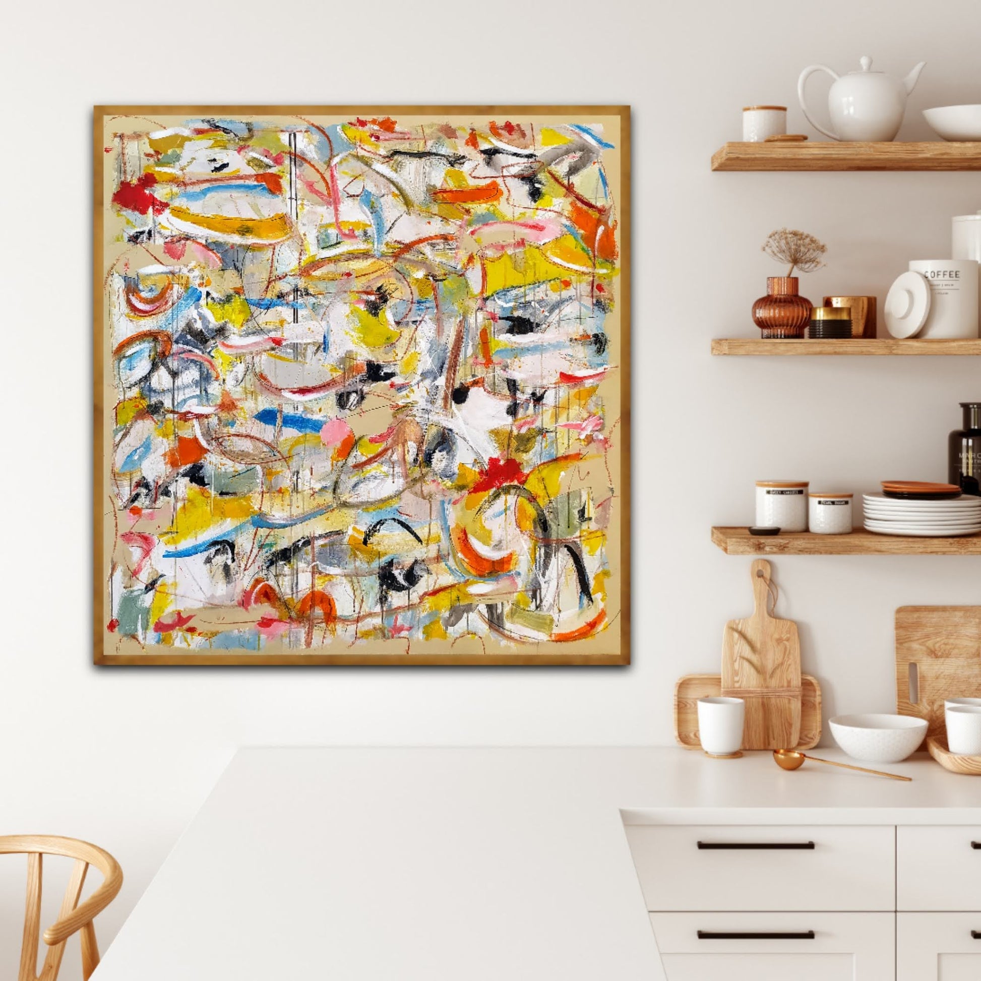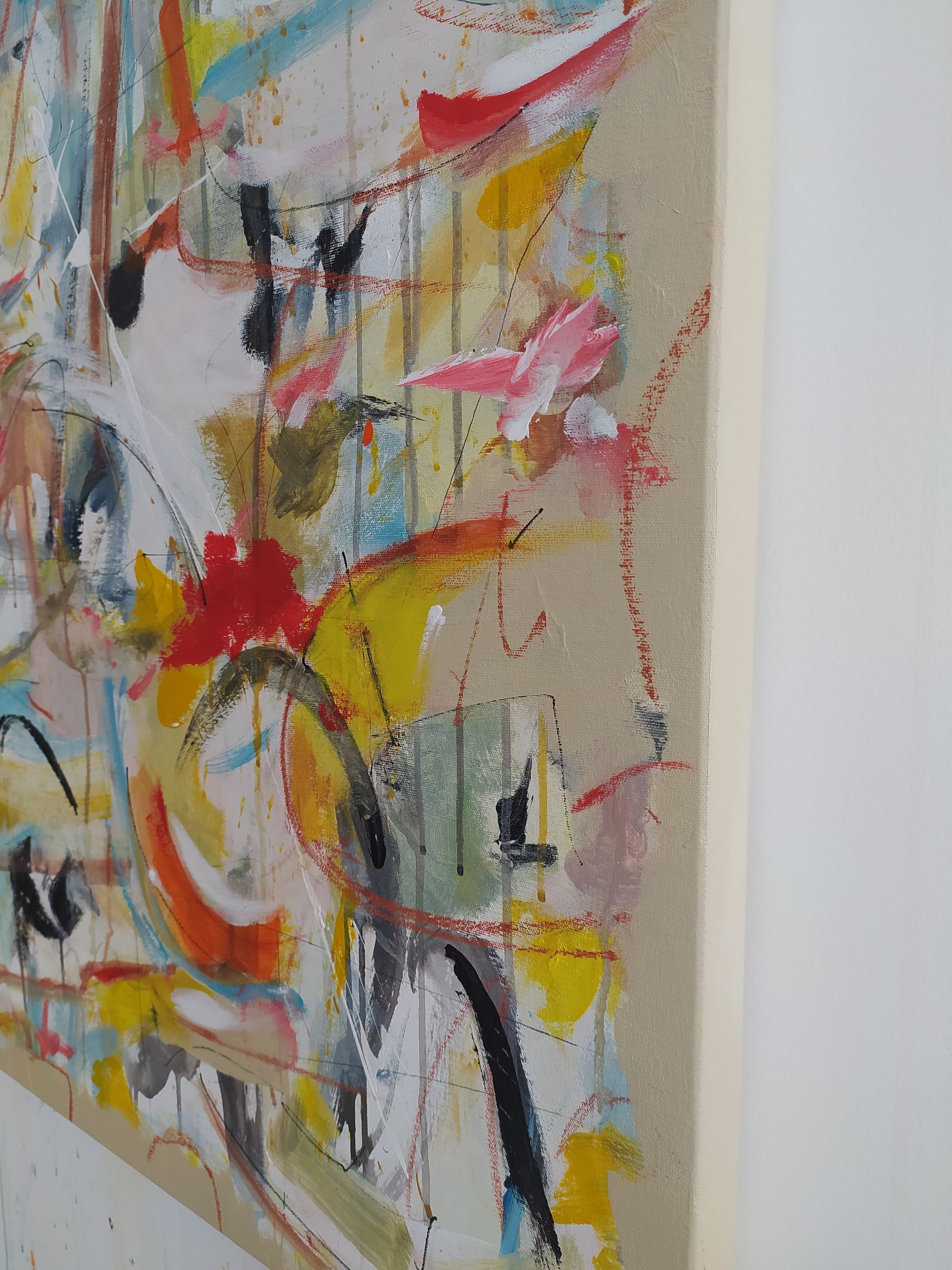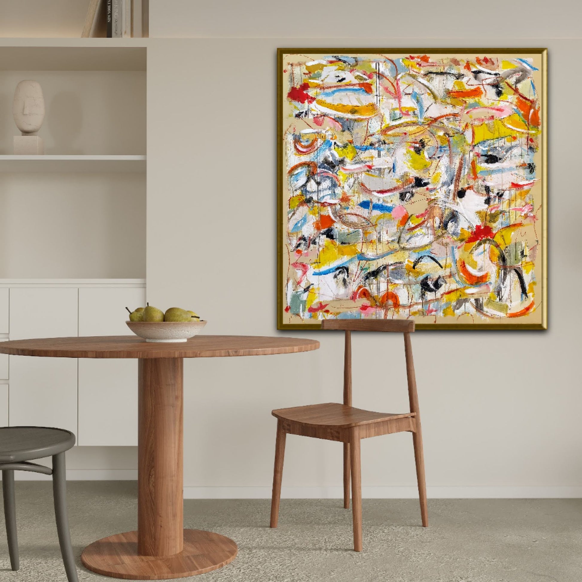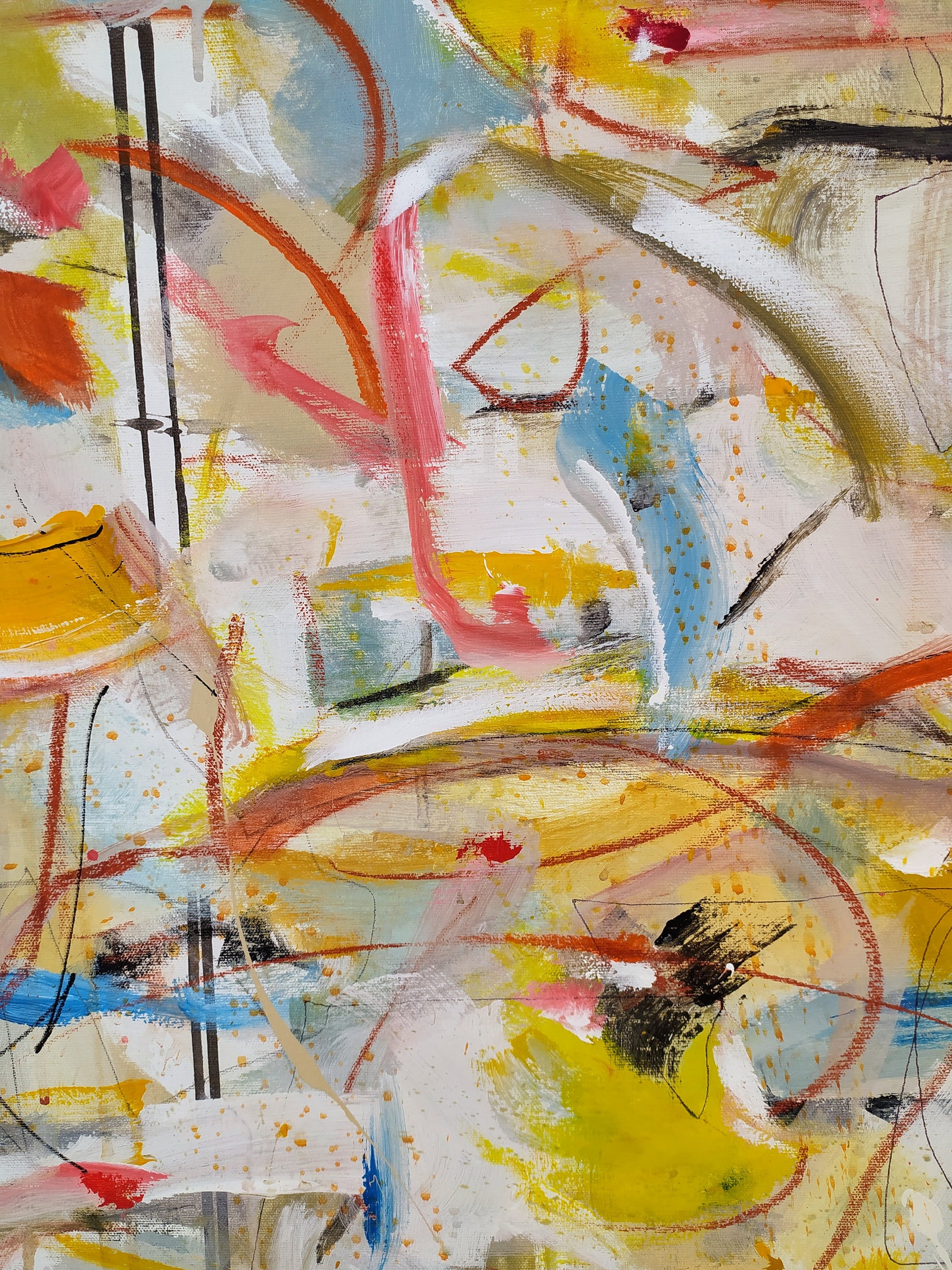 Multiples capas construidas con manchas, trazos, dripping y marcas crean una obra que refleja un estado de ánimo de calma, de tarde veraniega, sin prisas, de lectura y pintura.