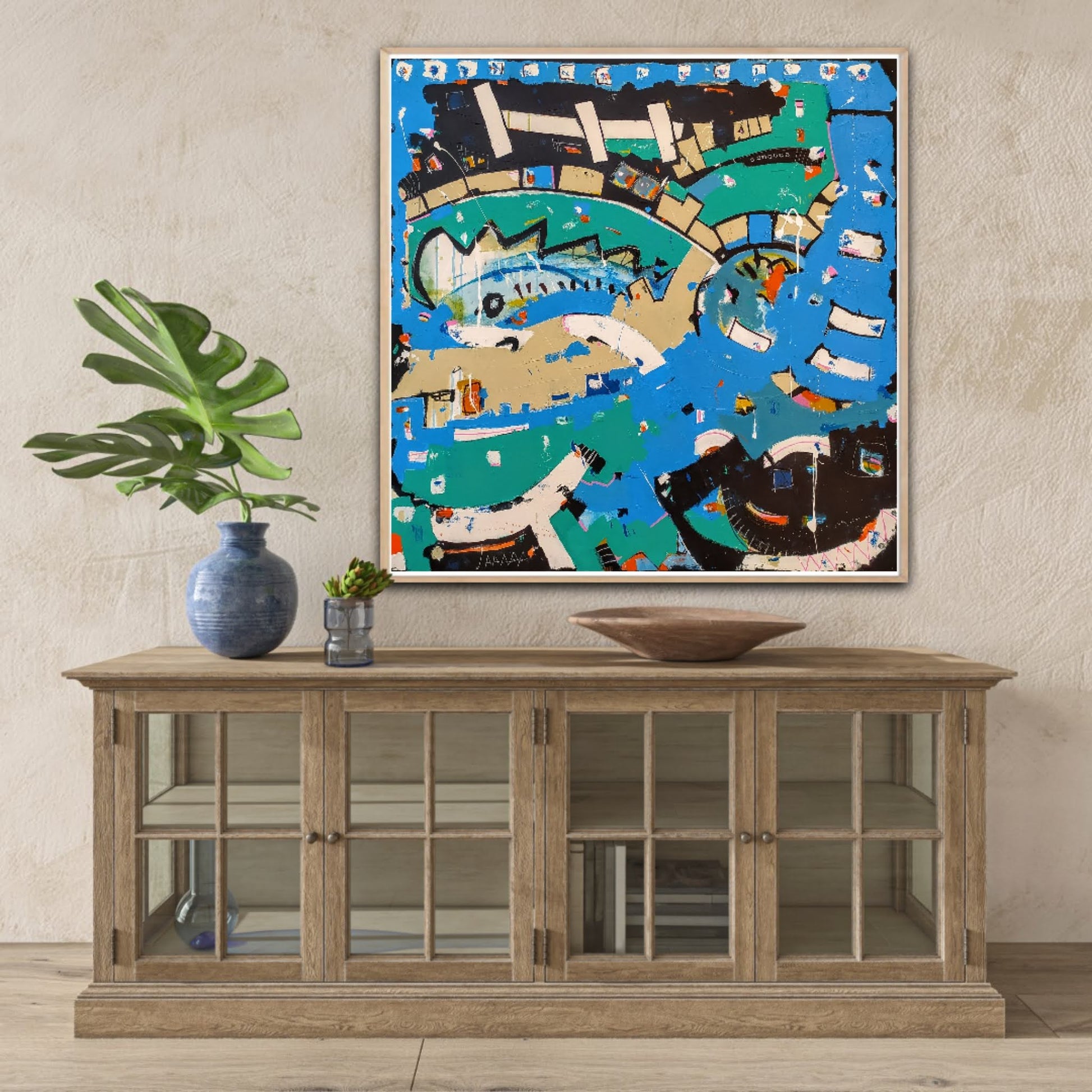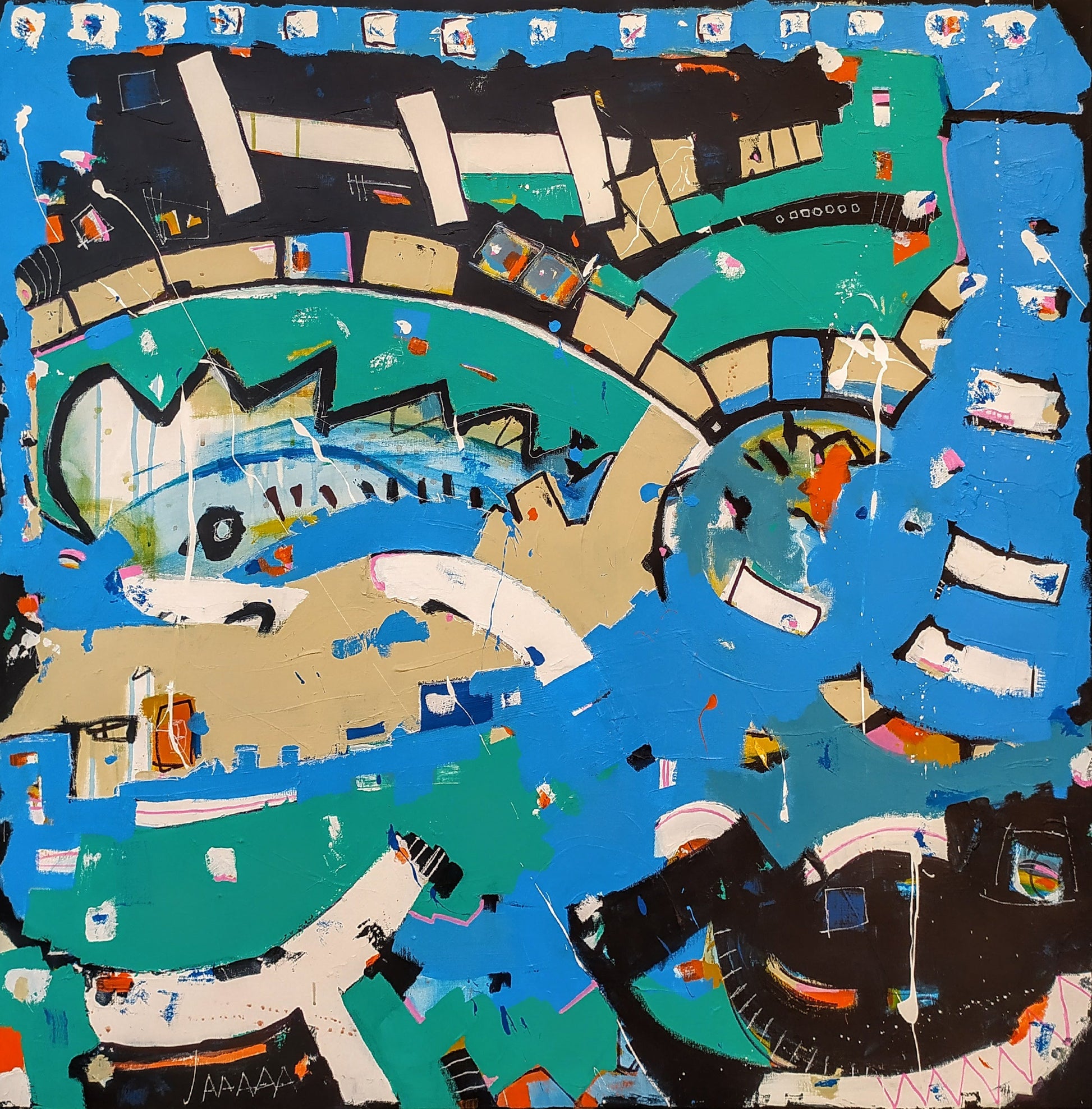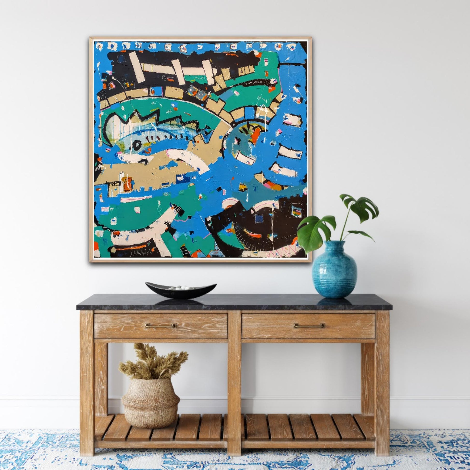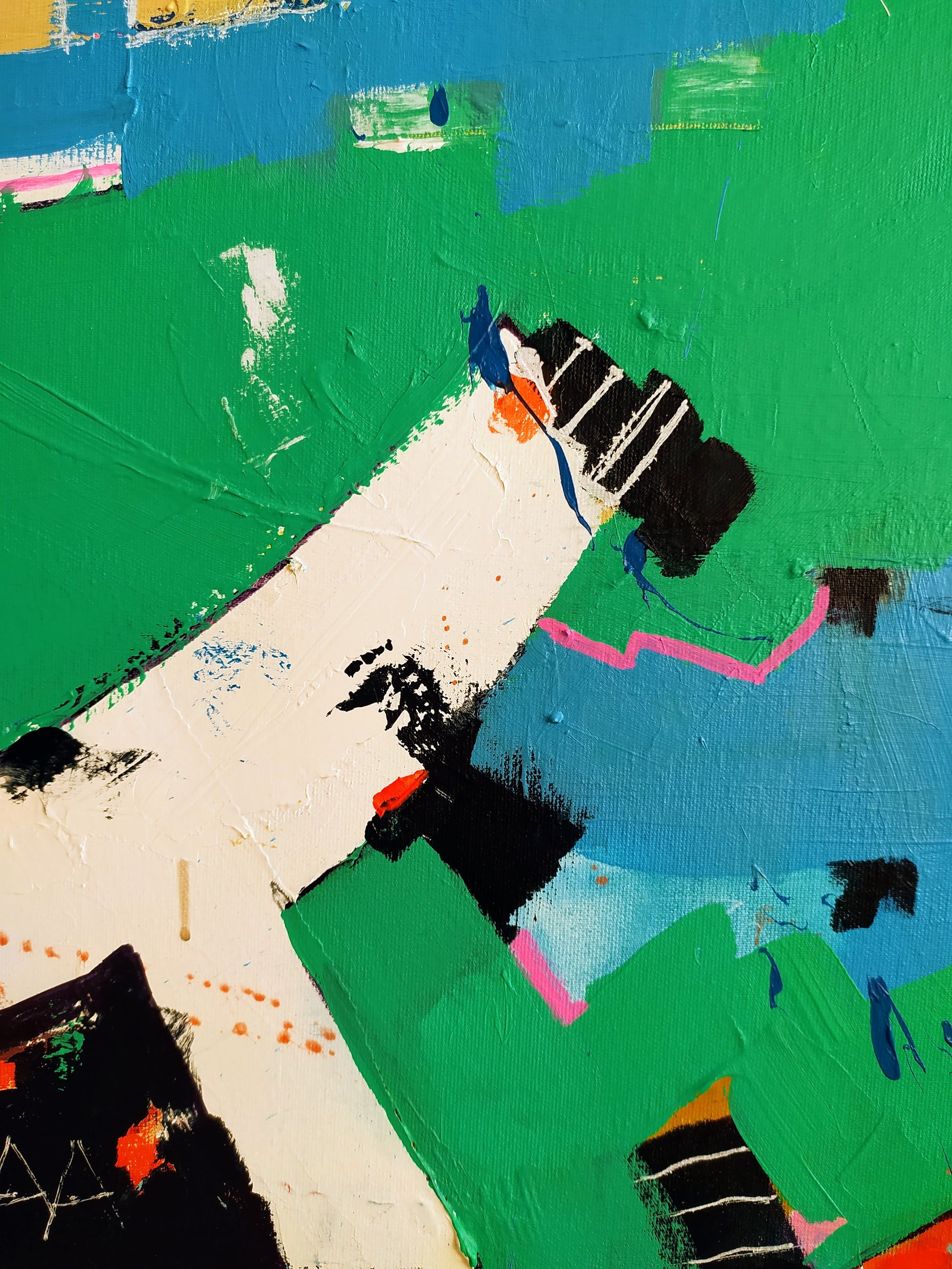 Obra trabajada con múltiples capas que finalmente se simplifican mucho con manchas azul cyan, verde agua, azul prusia y titanio crudo, aun así detalles, trazos, texturas y otros colores emergen desde capas anteriores, incluido la cabeza de algún tipo de ser que puede evocar la figura de un dragón.