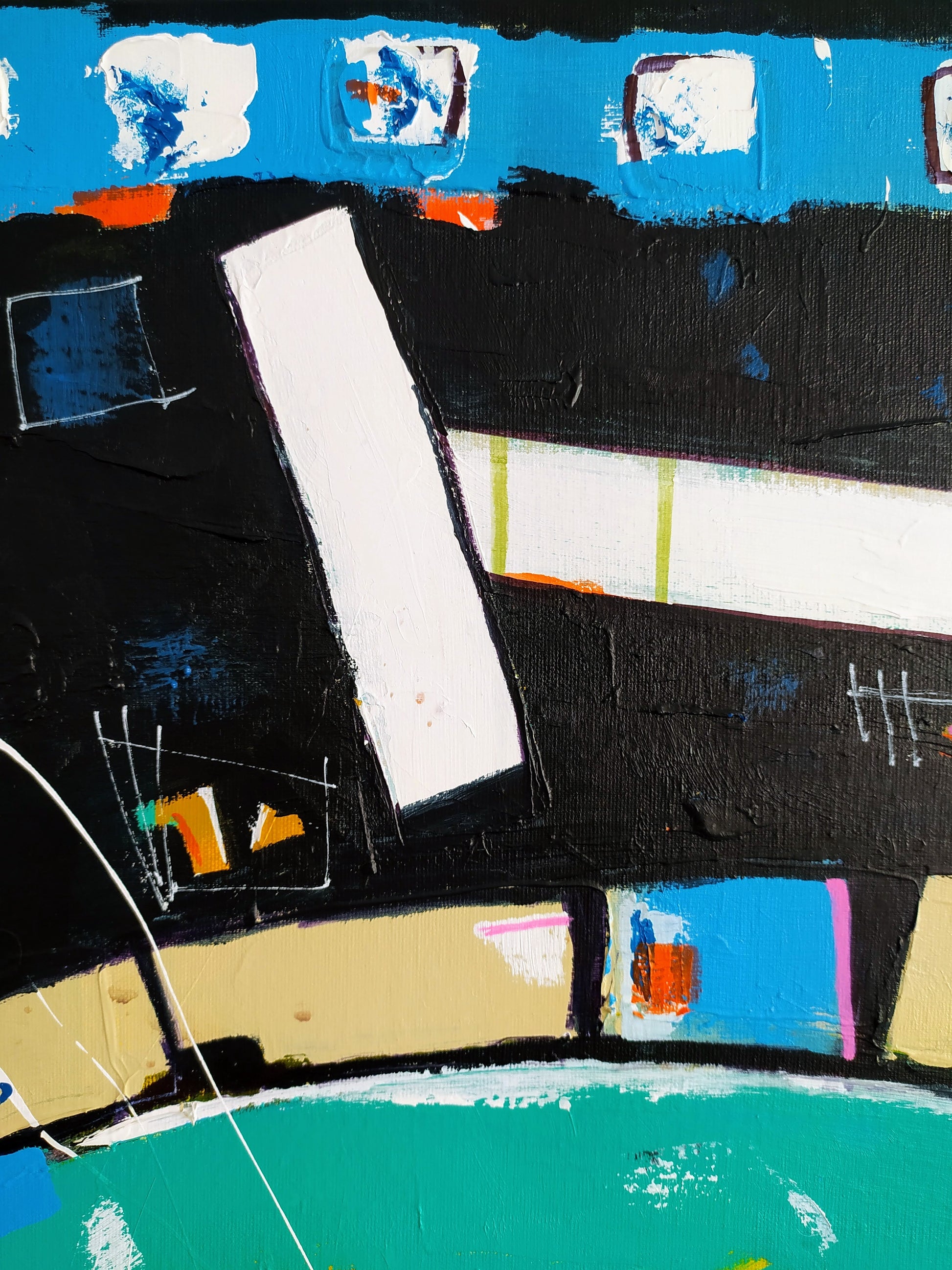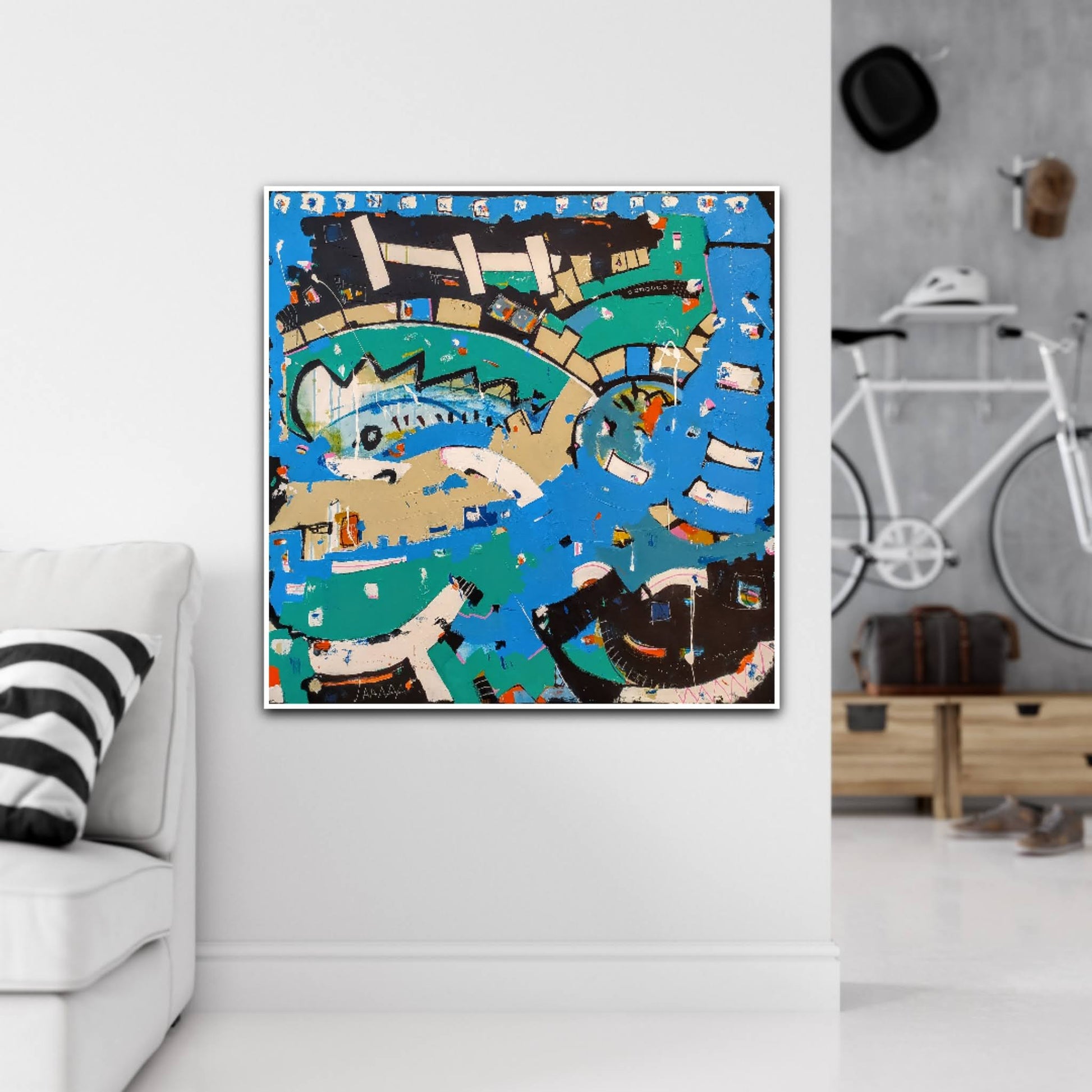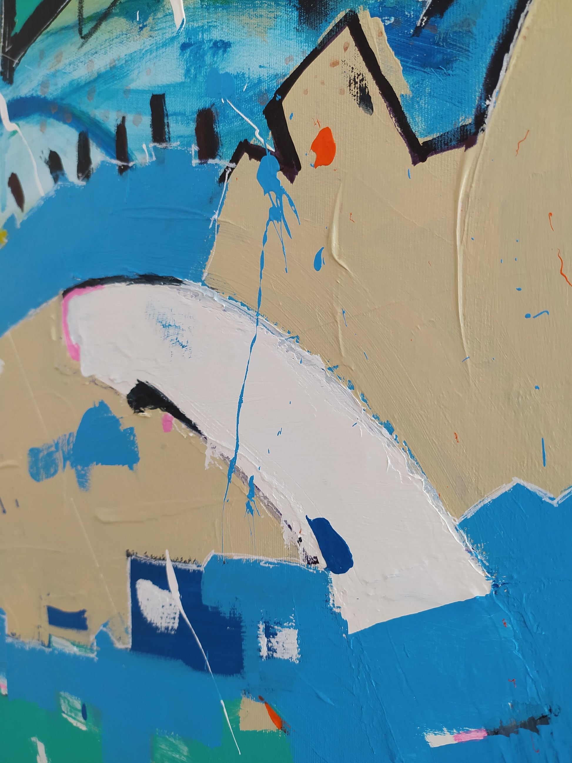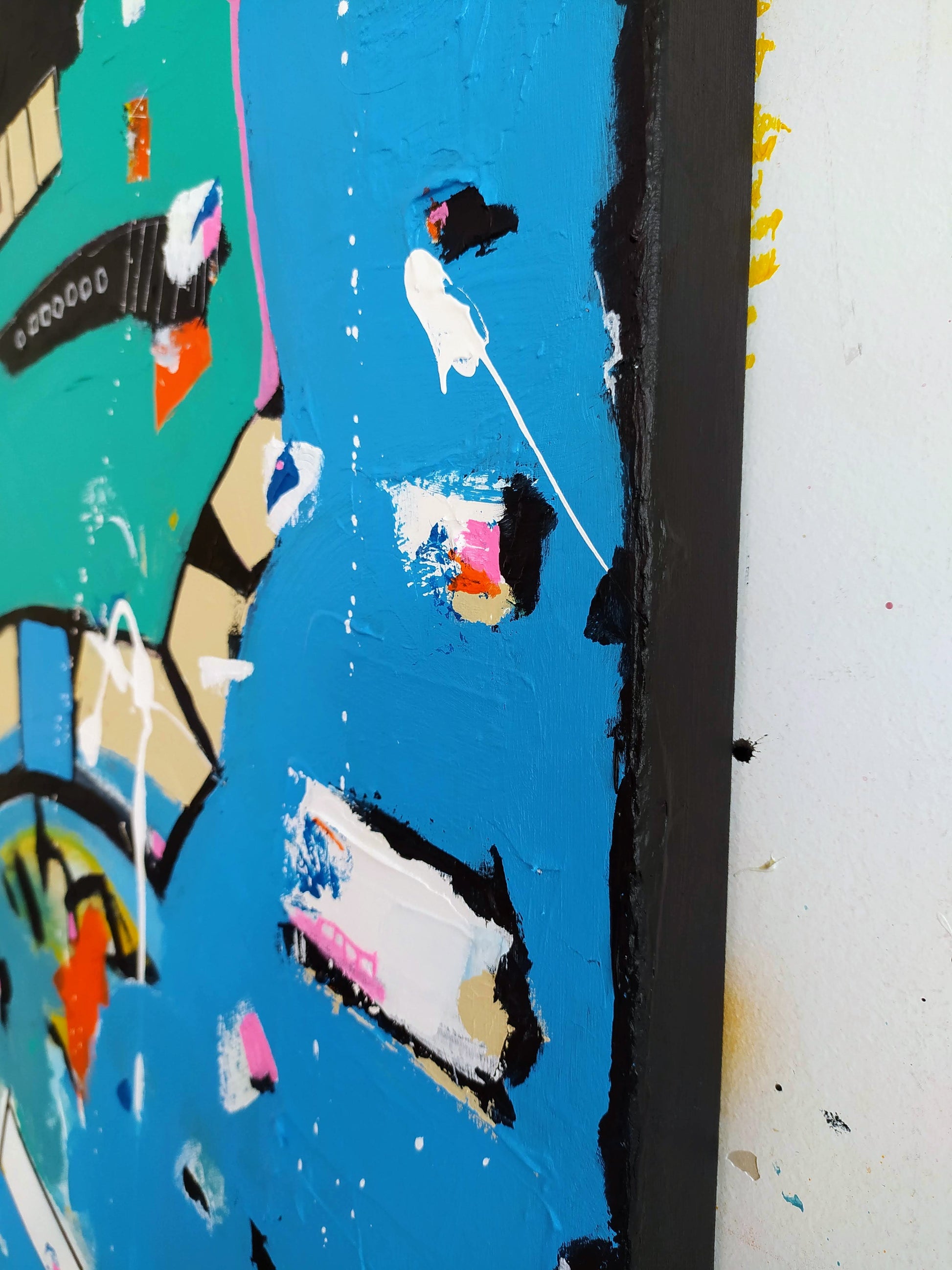 Obra trabajada con múltiples capas que finalmente se simplifican mucho con manchas azul cyan, verde agua, azul prusia y titanio crudo, aun así detalles, trazos, texturas y otros colores emergen desde capas anteriores, incluido la cabeza de algún tipo de ser que puede evocar la figura de un dragón.