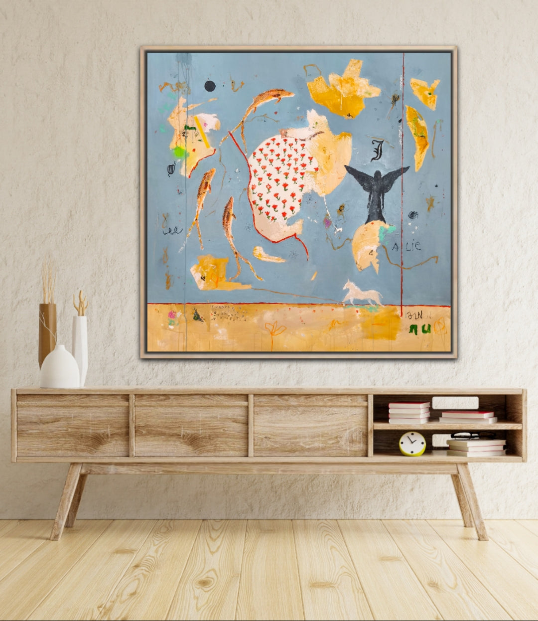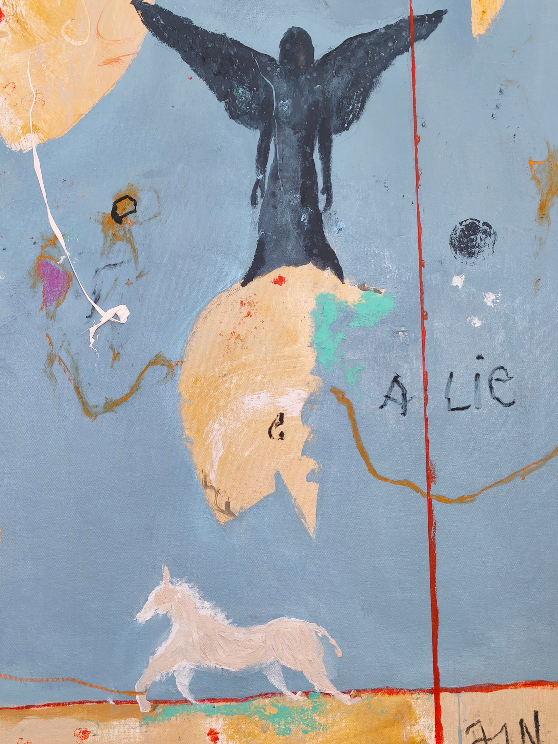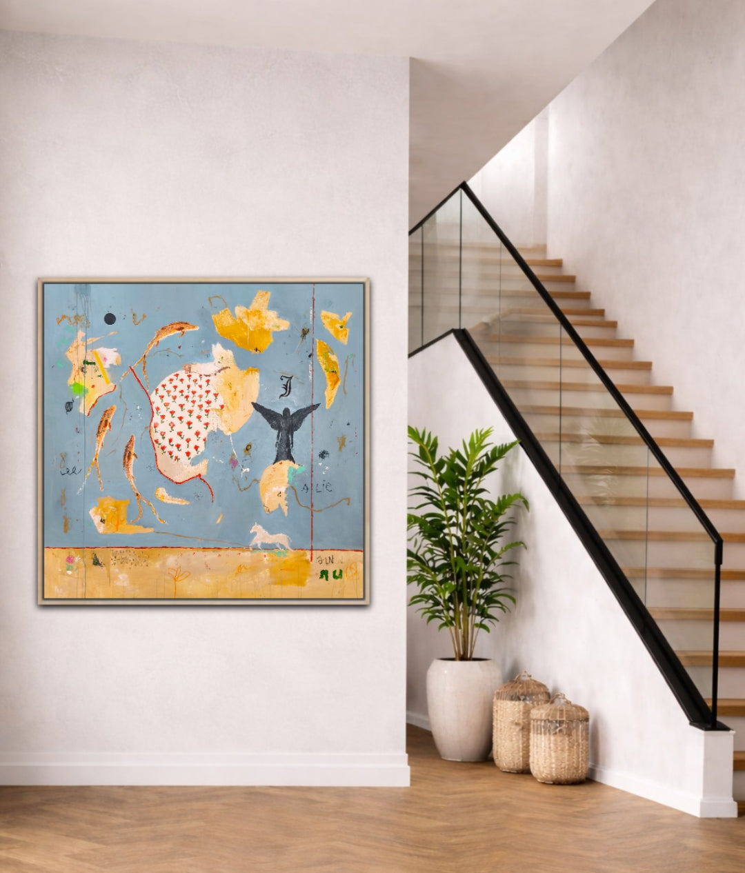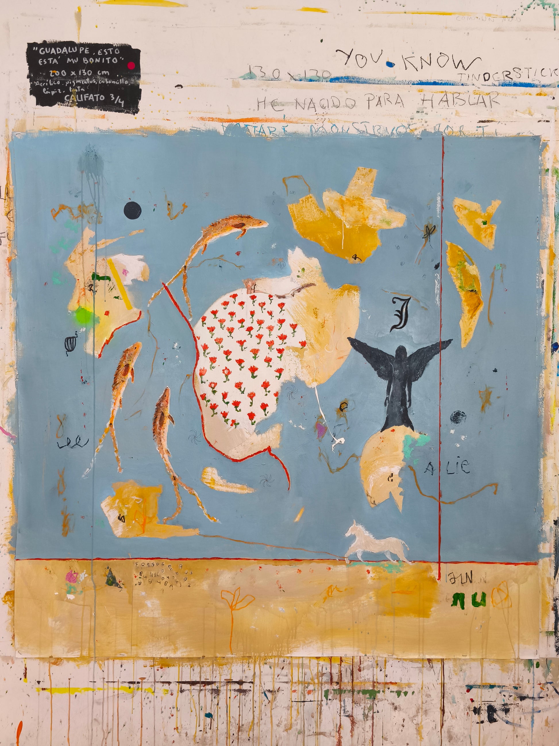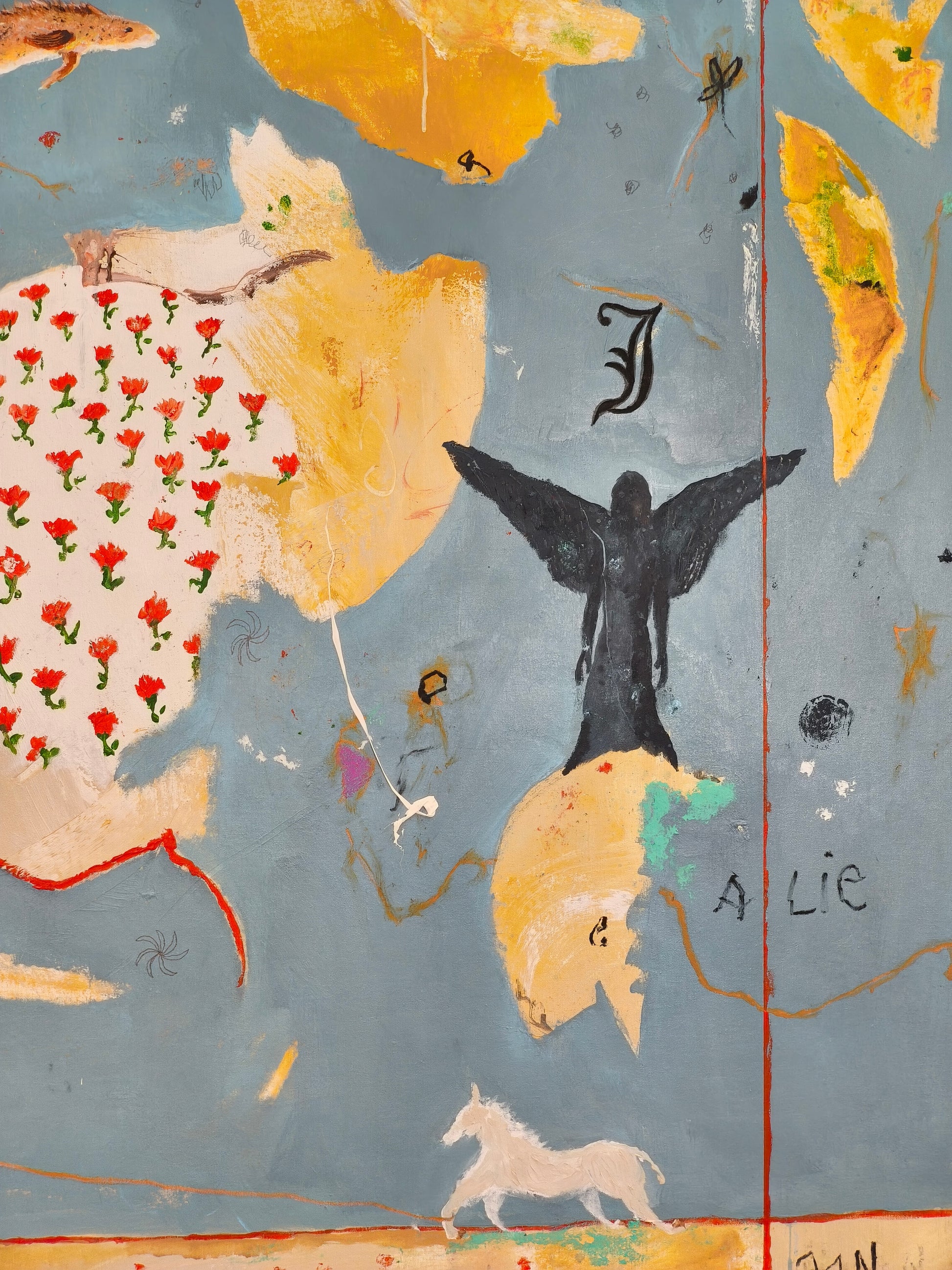 Técnica: acrílico, lápiz, carboncillo, gesso, ceras.