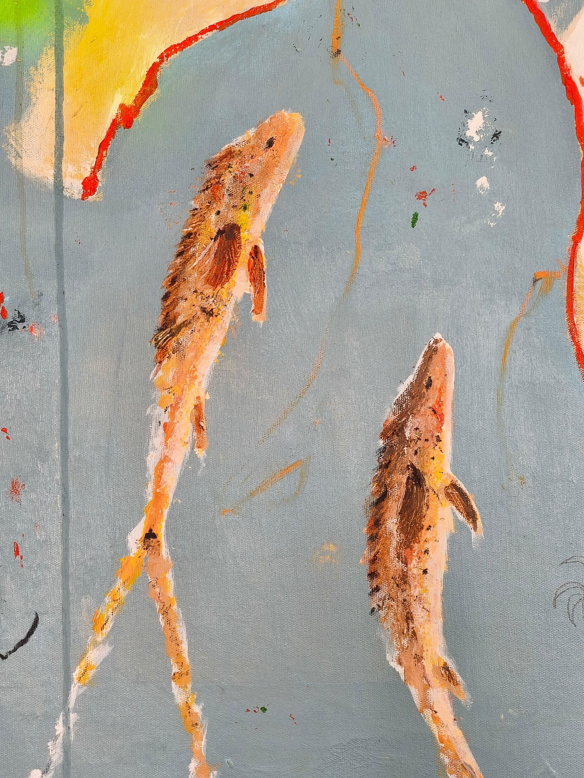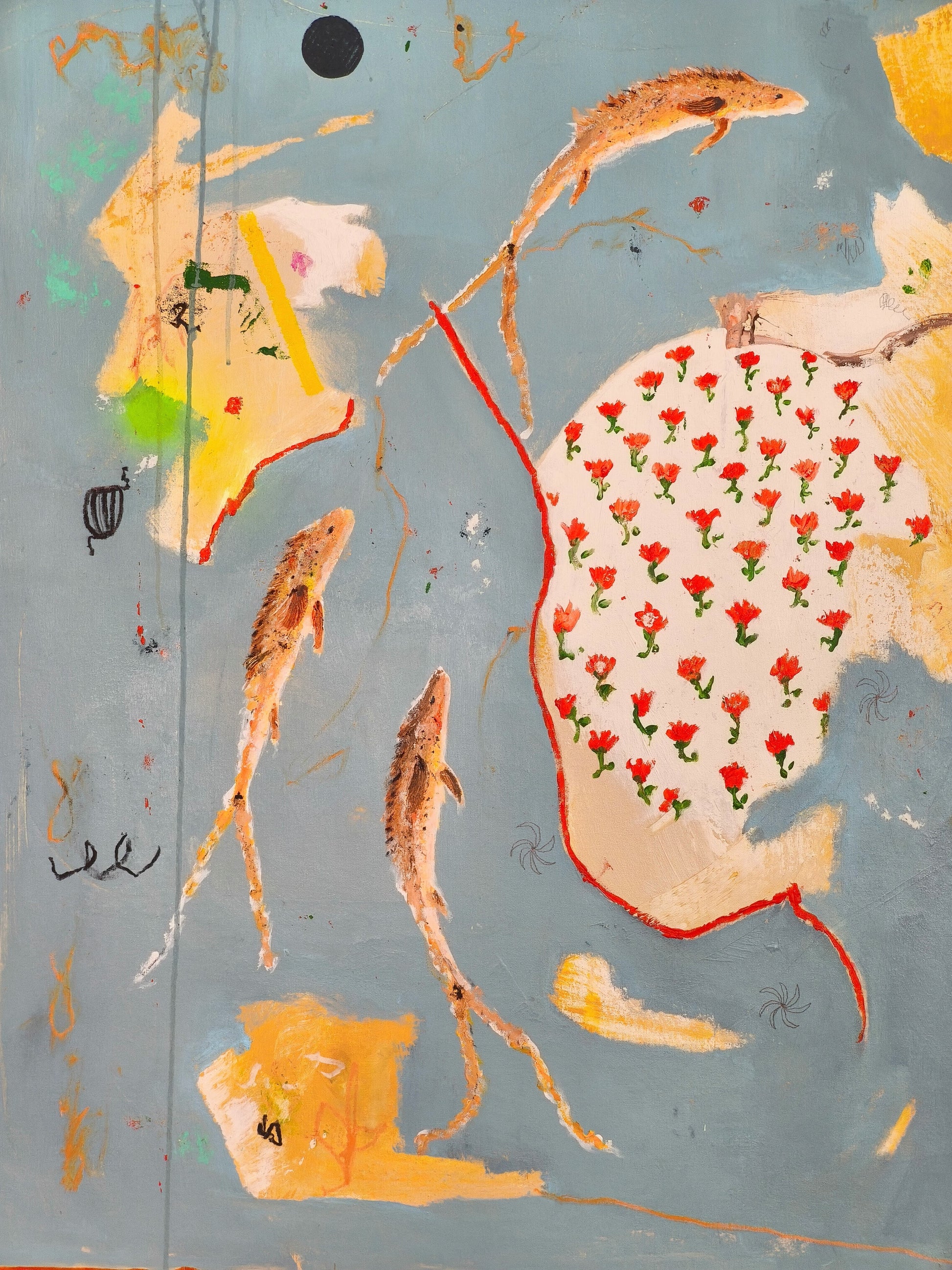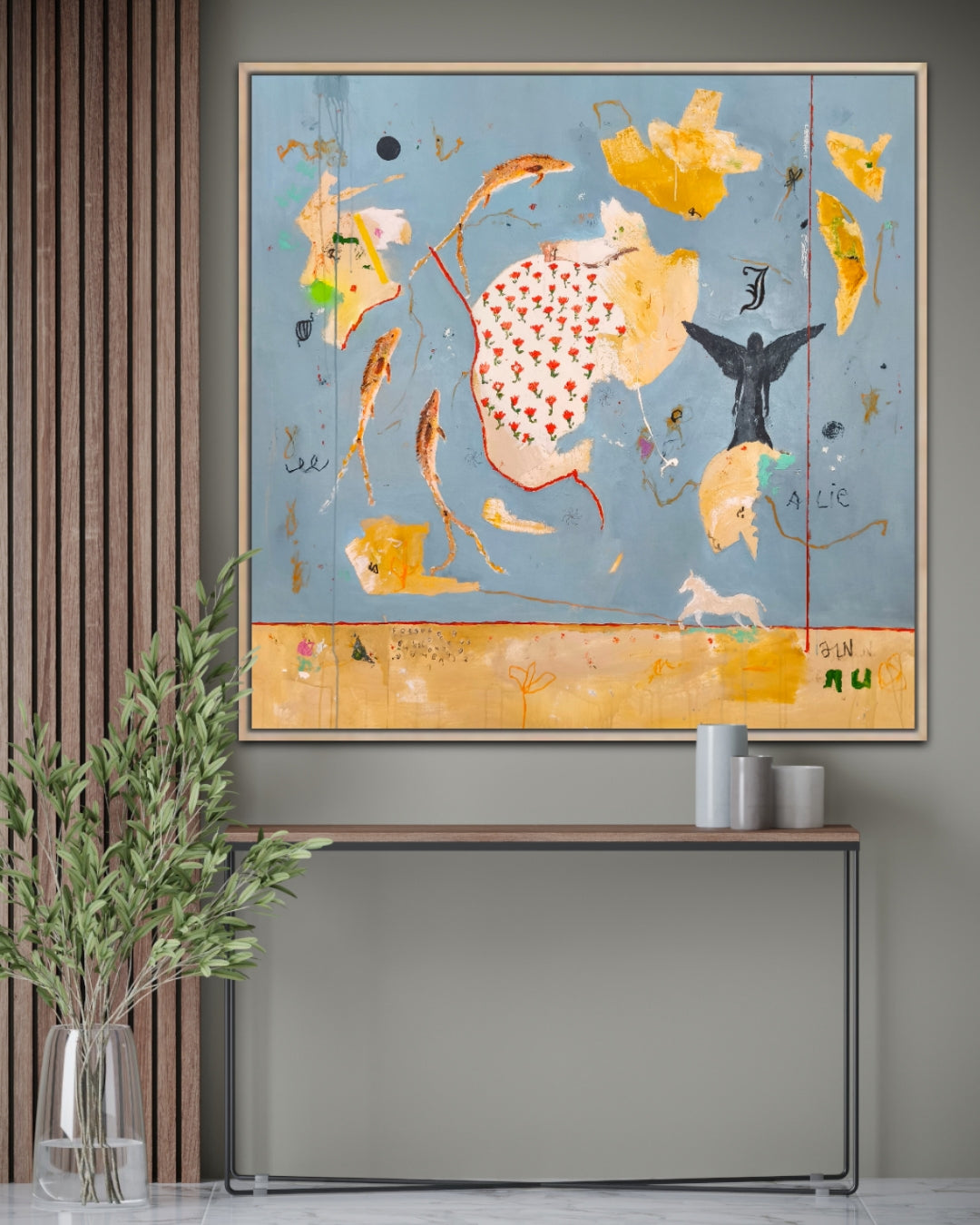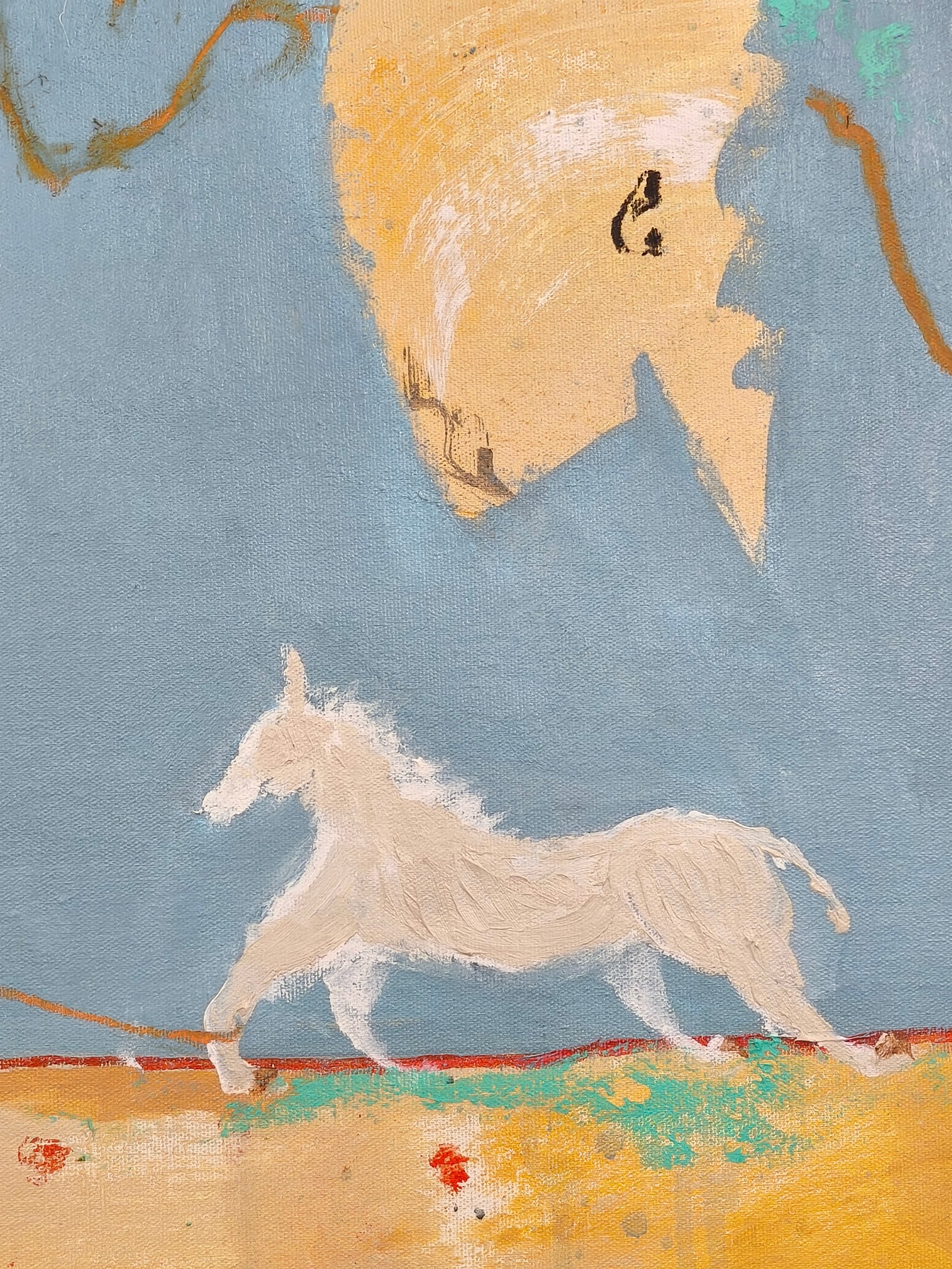 Pintura gestual, intuitiva, que deja que las cosas pasen y se apoya sobre lo que aparece. Aprovechando el accidente y aceptando las consecuencias.