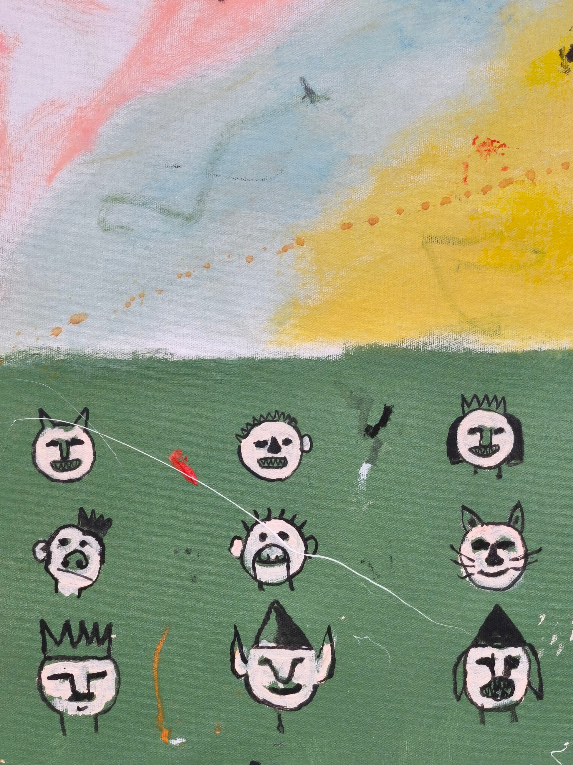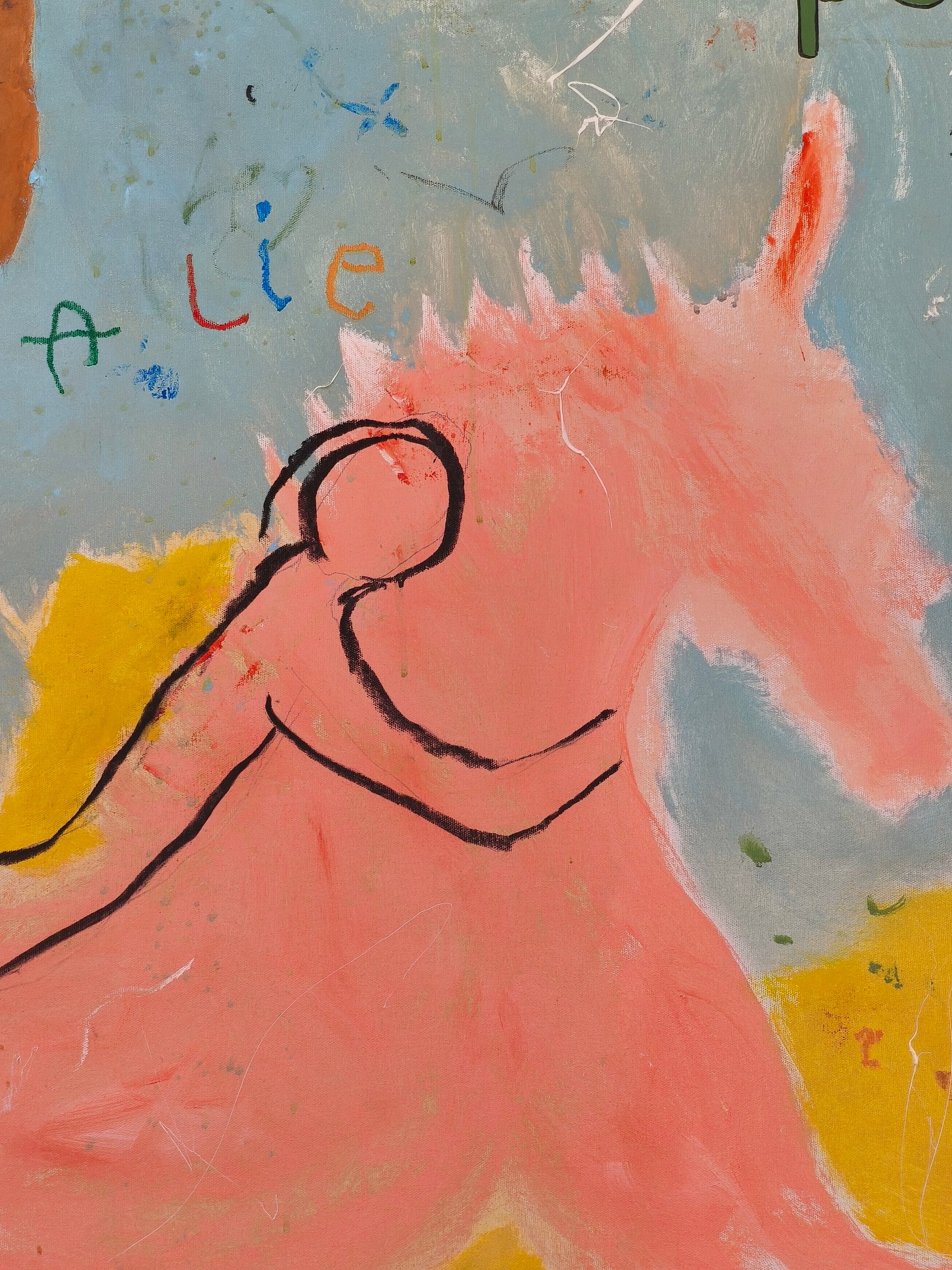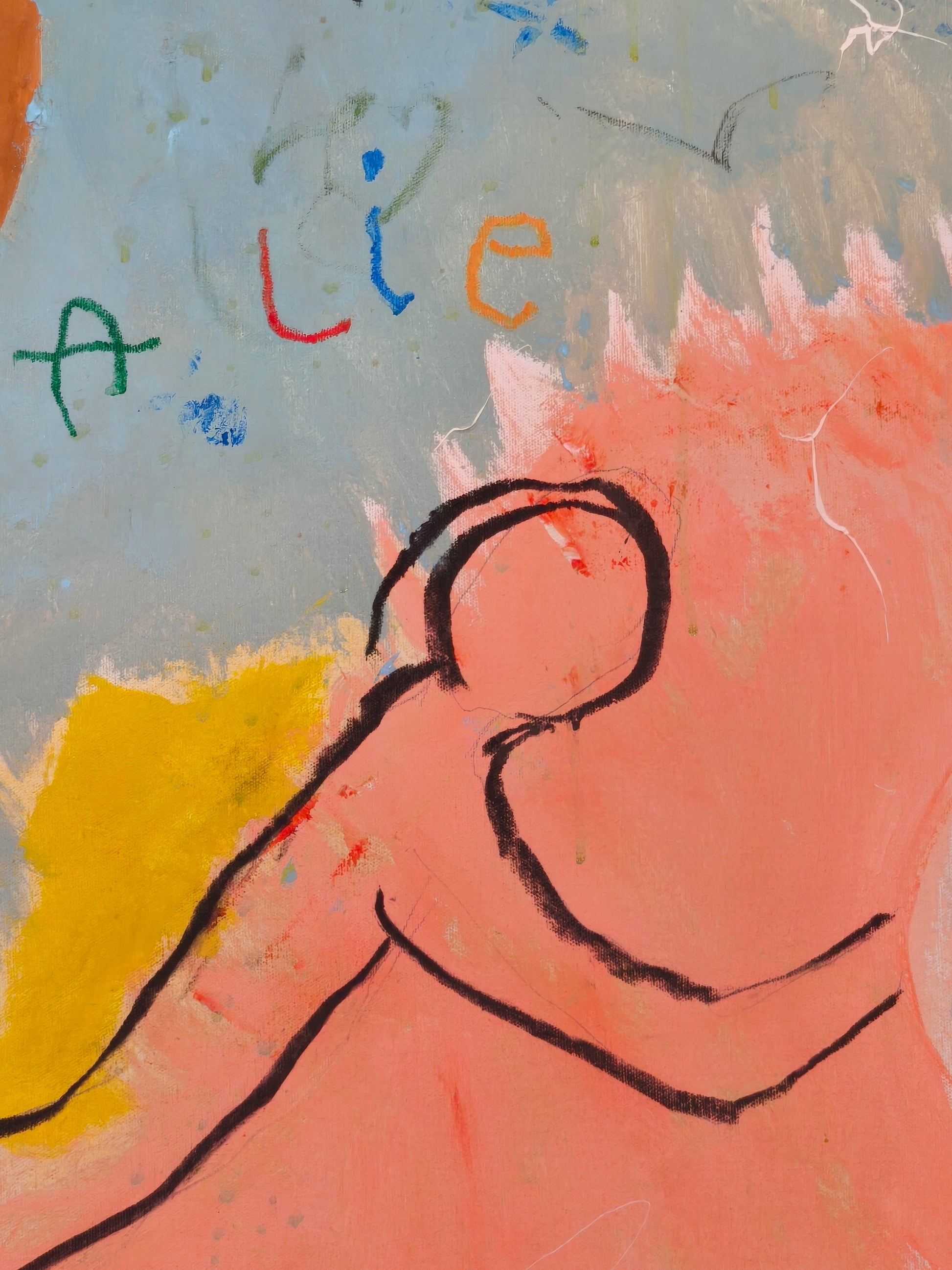 Pintura gestual, intuitiva, que deja que las cosas pasen y se apoya sobre lo que aparece. Aprovechando el accidente y aceptando las consecuencias.