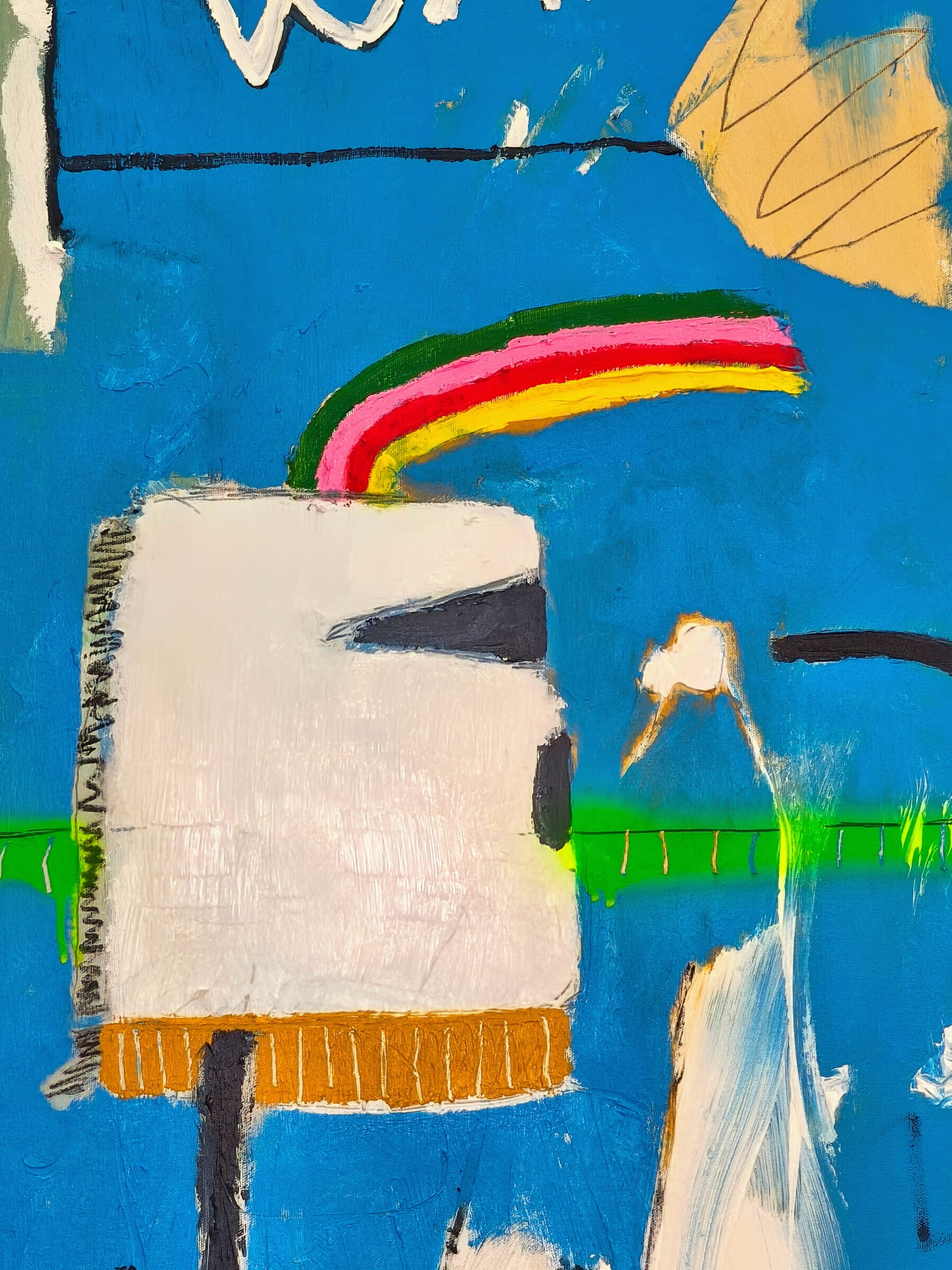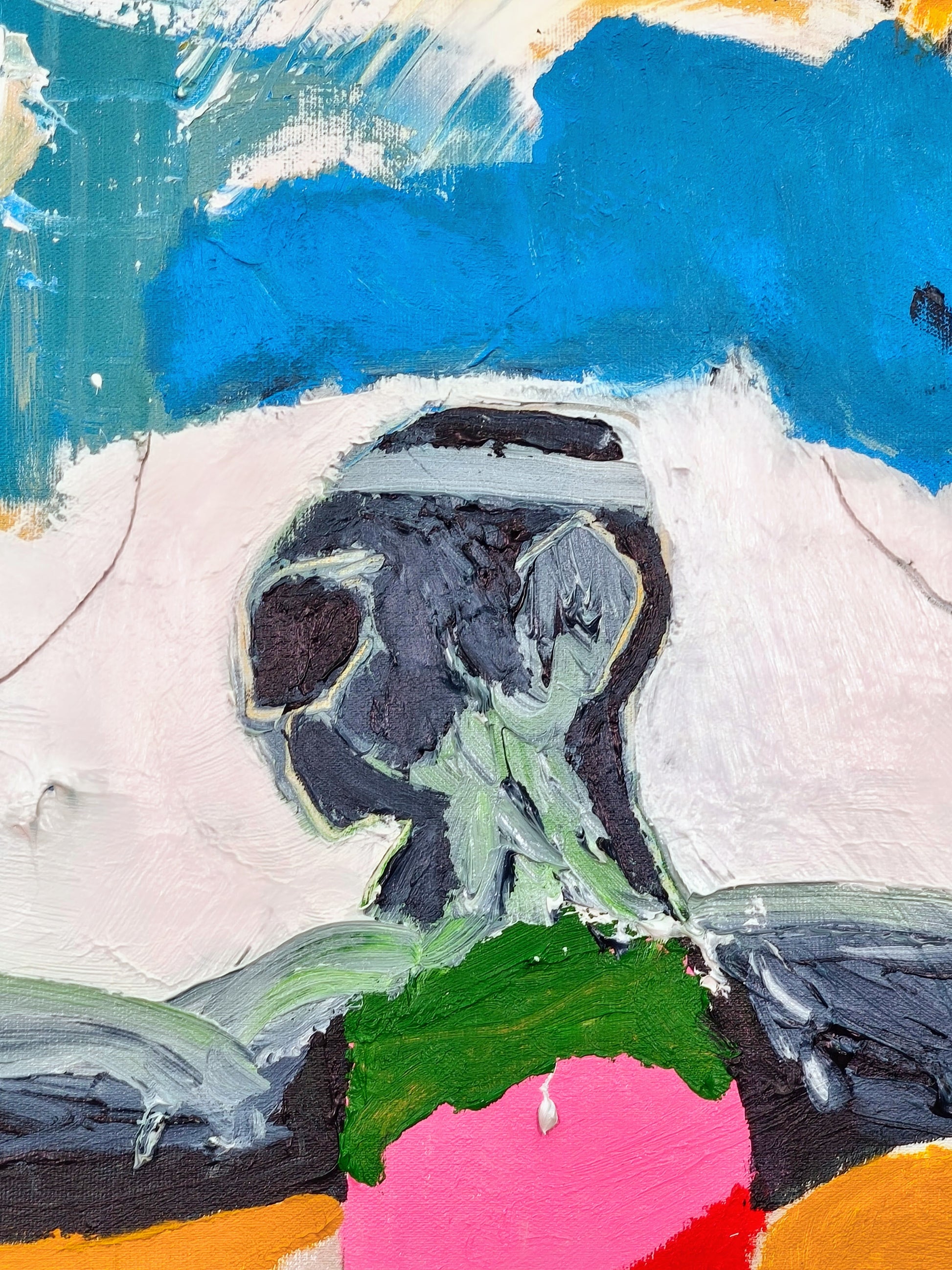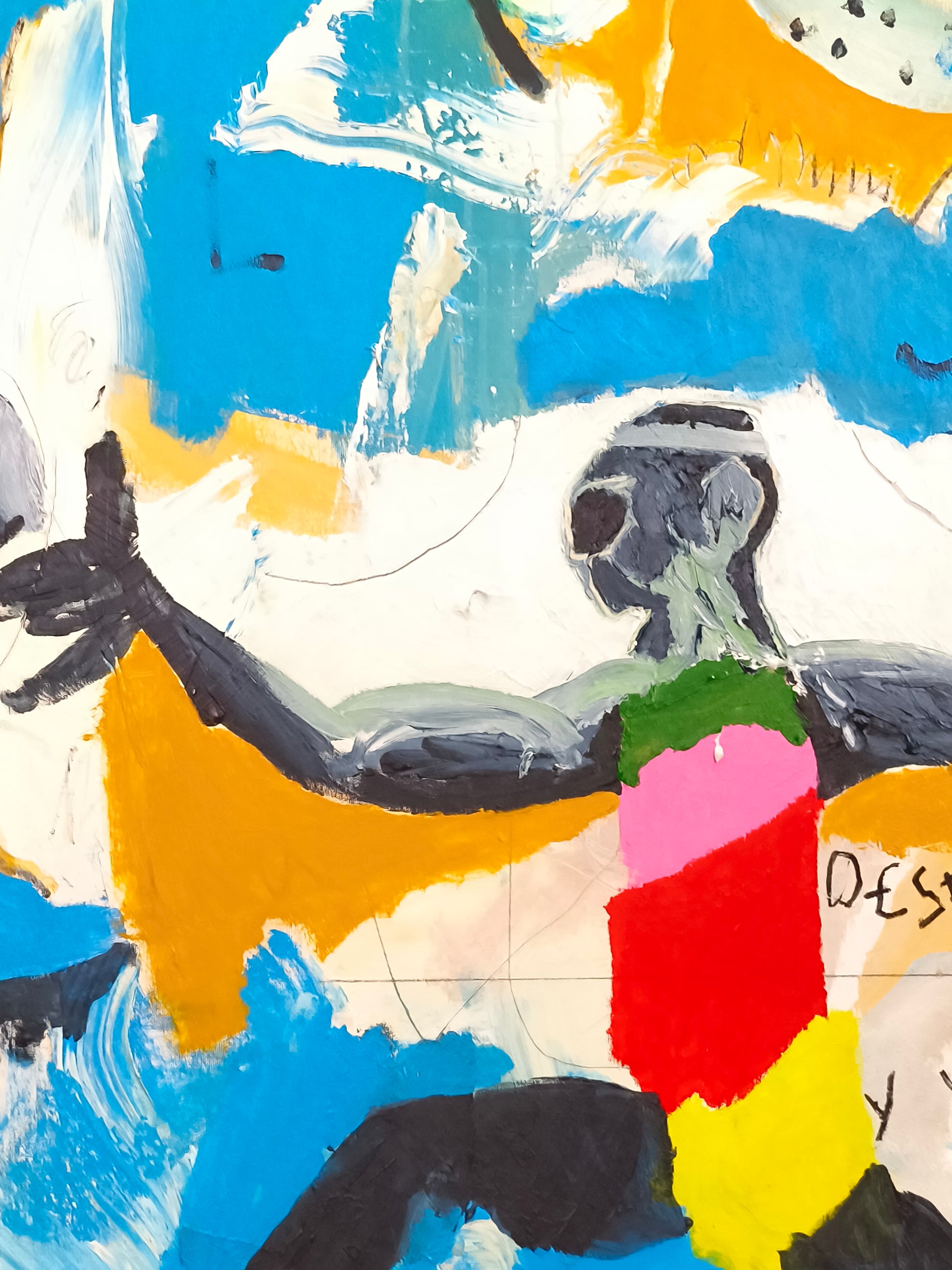 Pintura gestual, intuitiva, que deja que las cosas pasen y se apoya sobre lo que aparece. Aprovechando el accidente y aceptando las consecuencias.