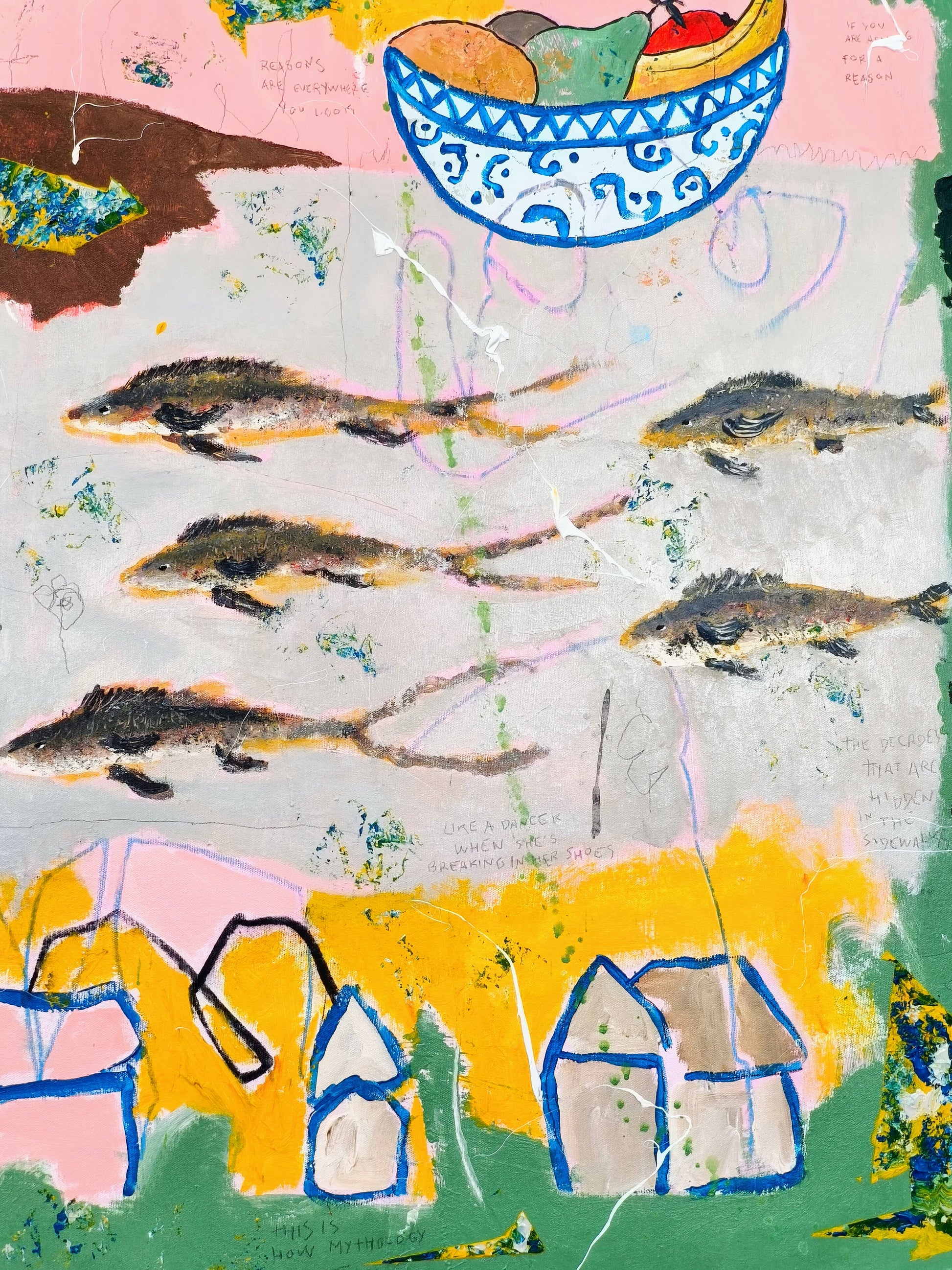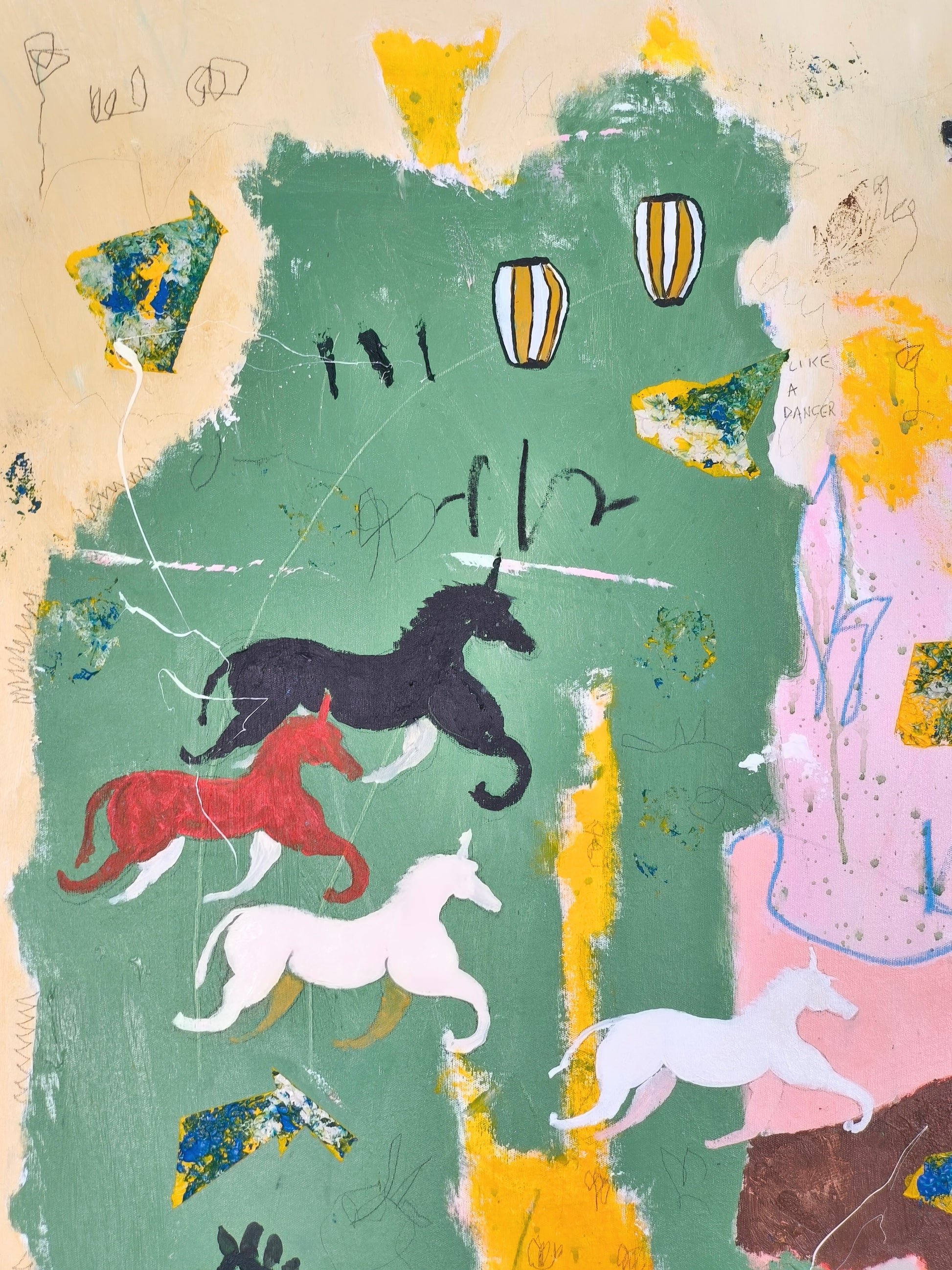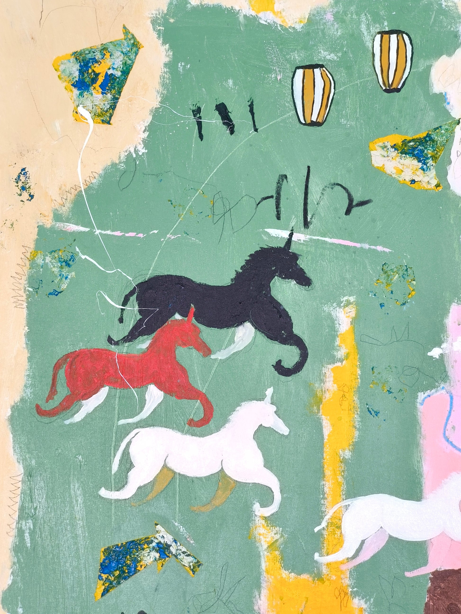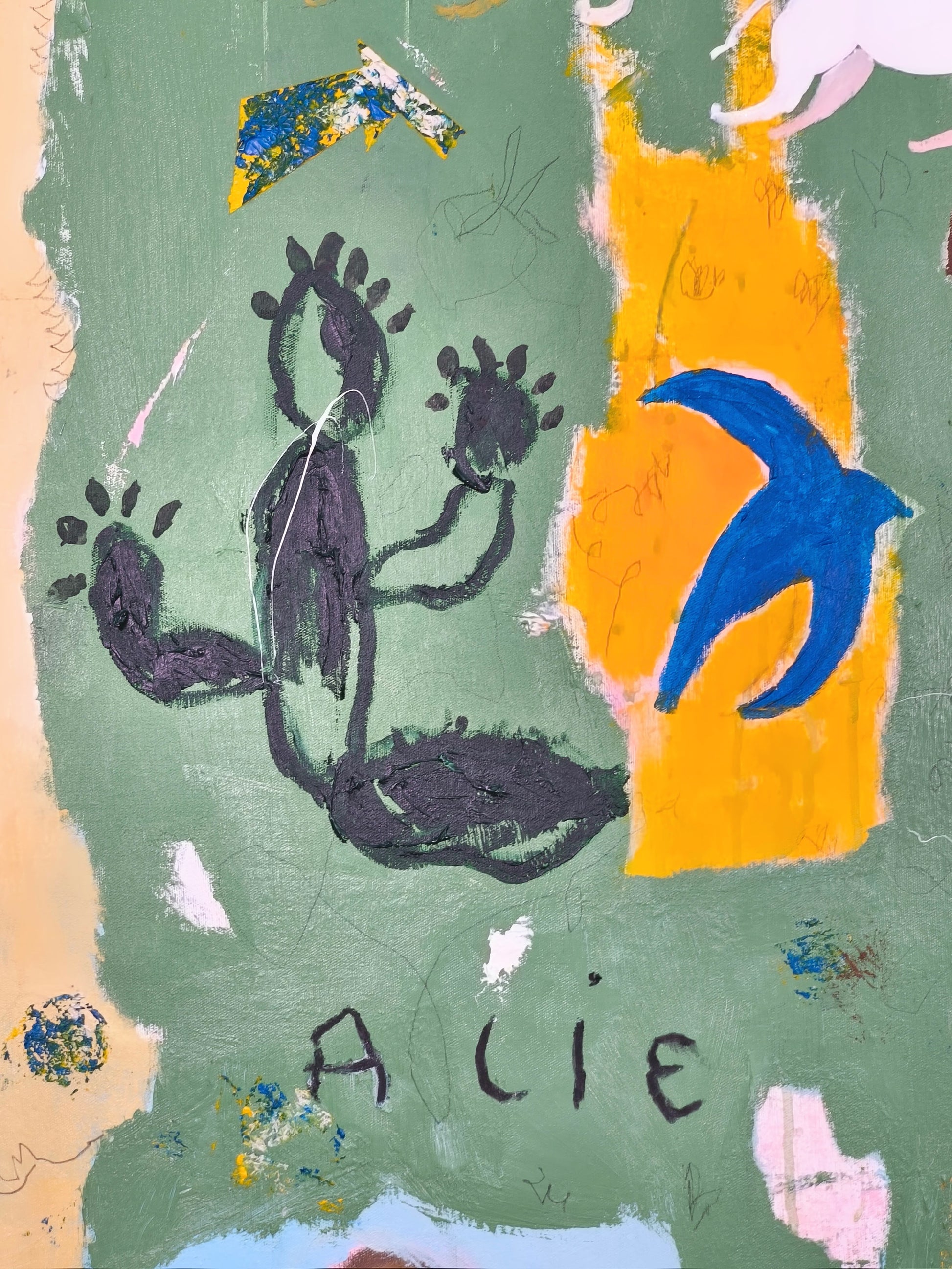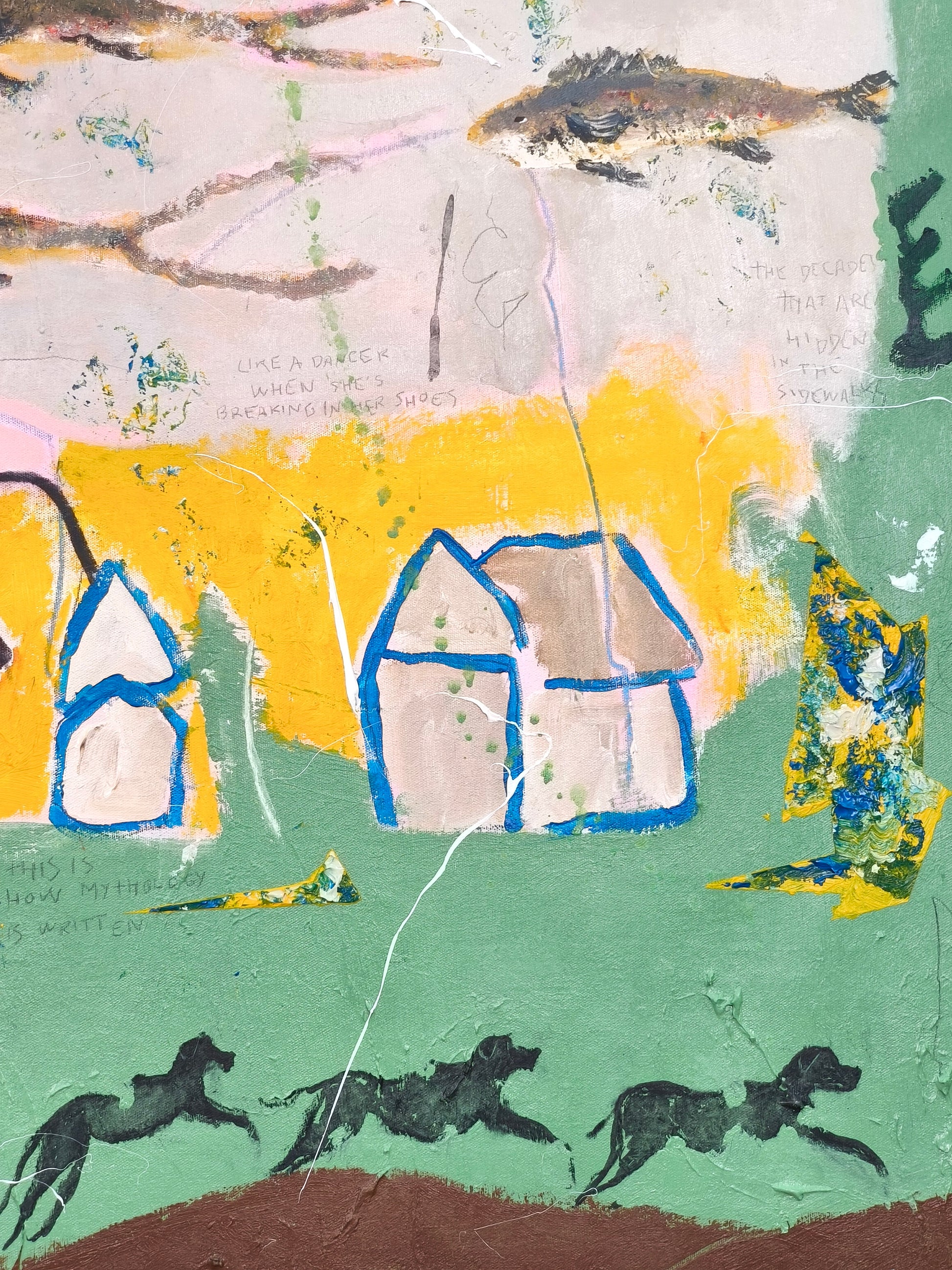 Technique: acrylic, pencil, charcoal, gesso, crayons.