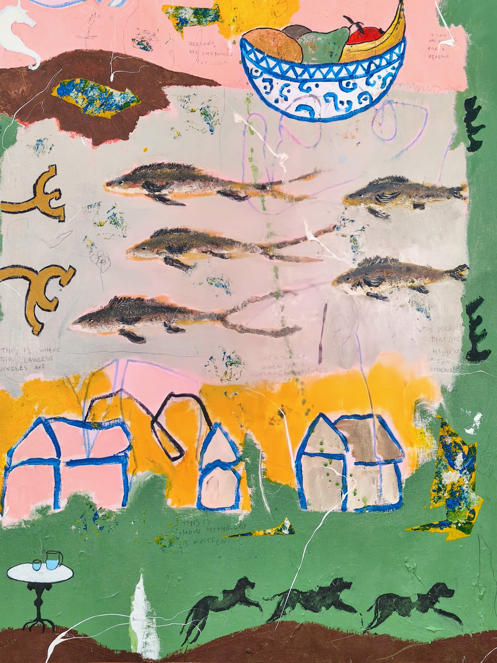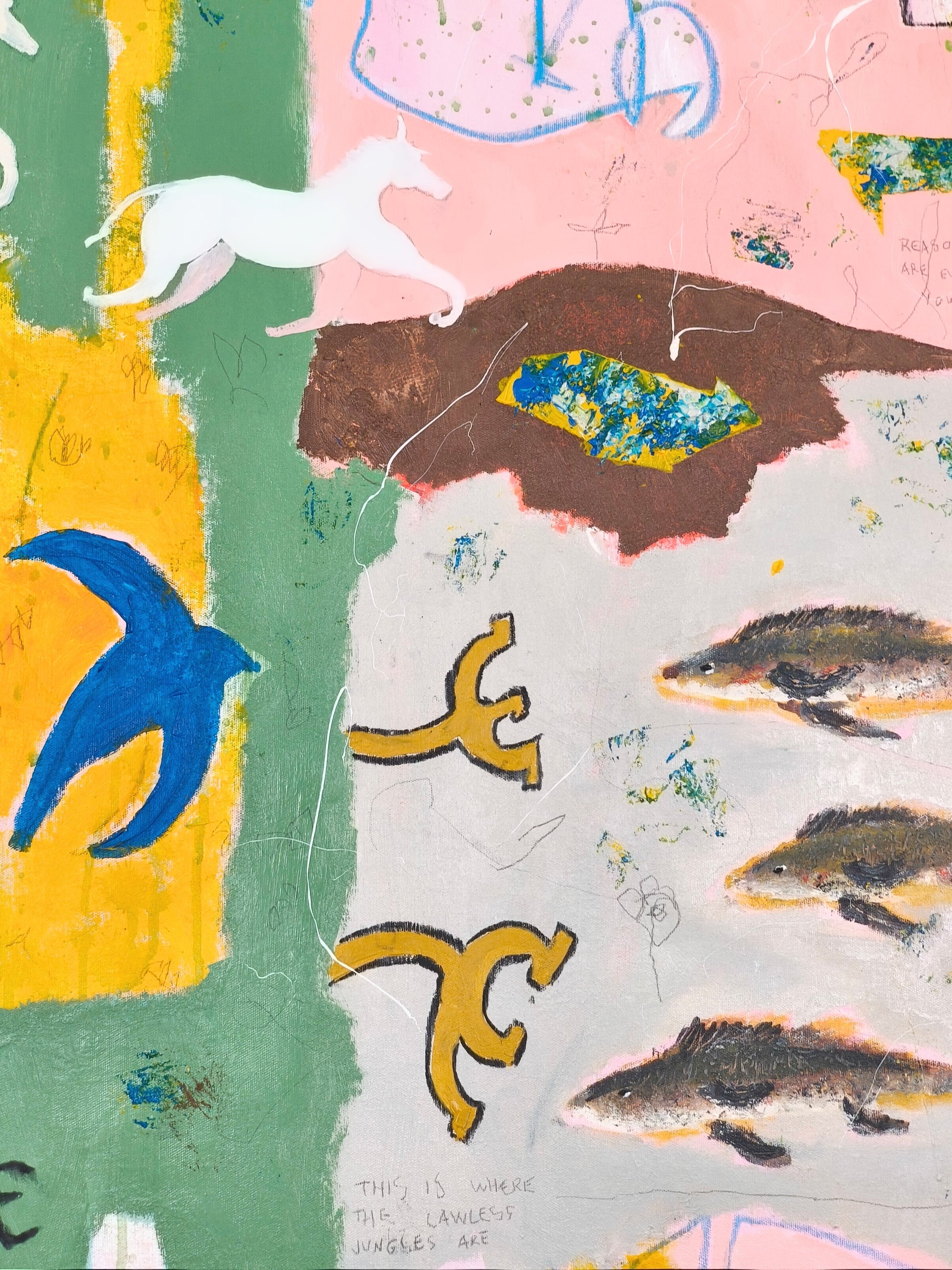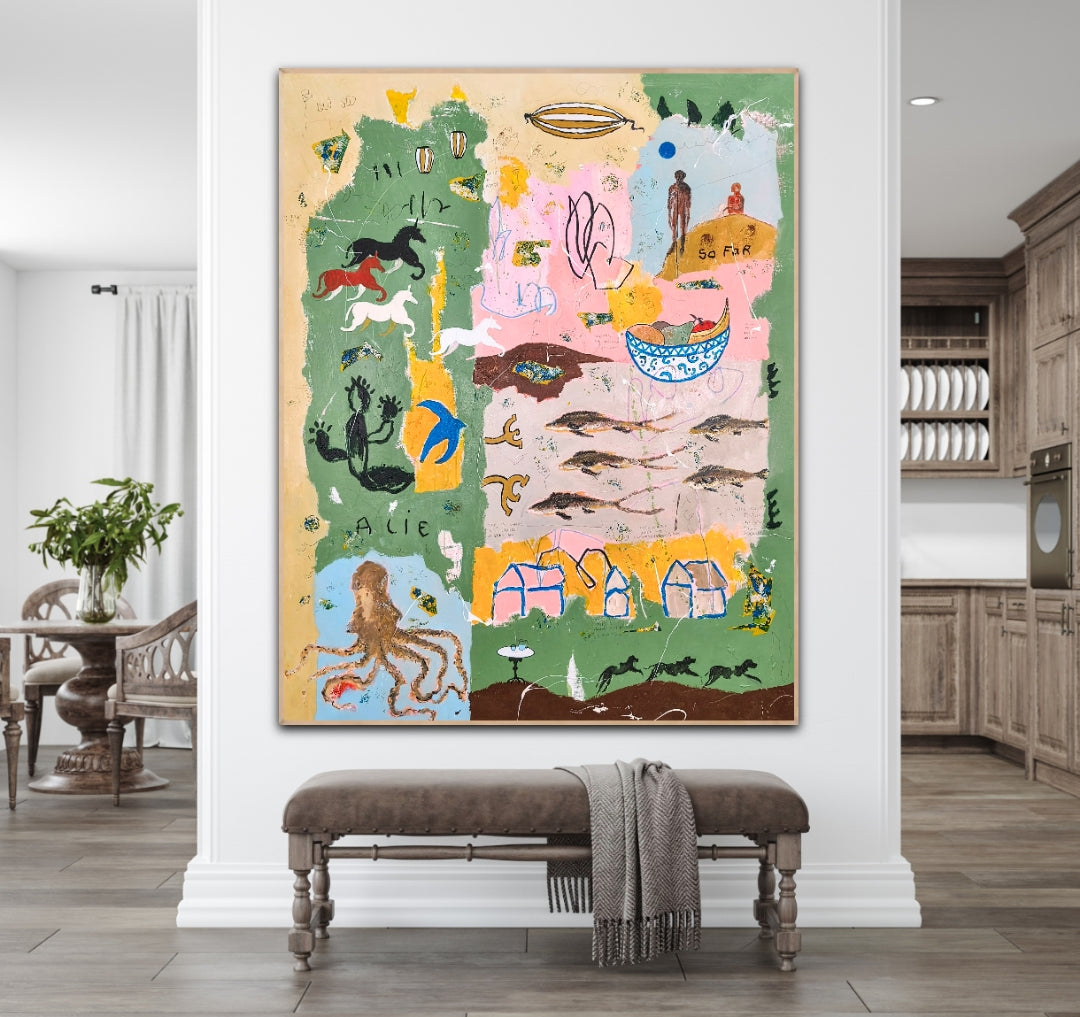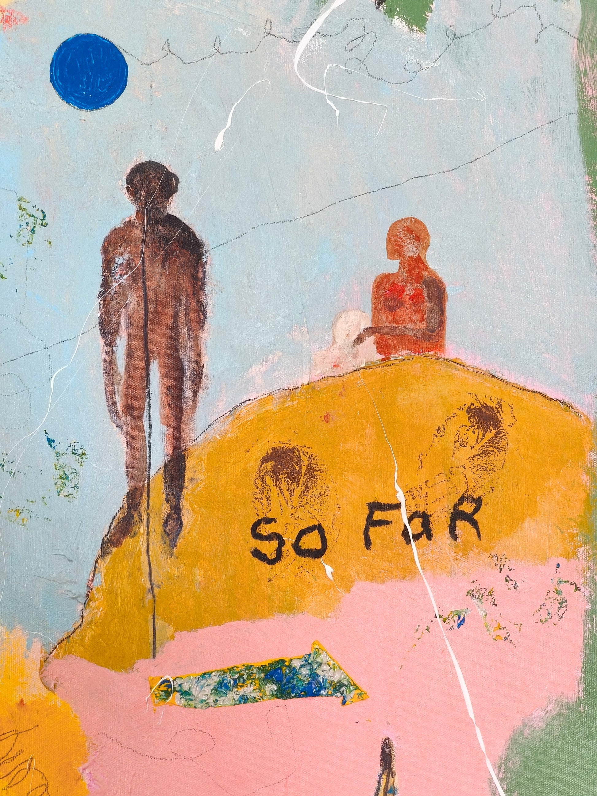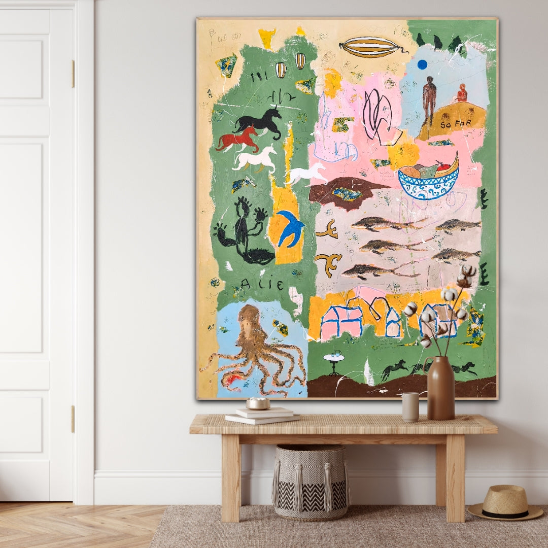 Technique: acrylic, pencil, charcoal, gesso, crayons.