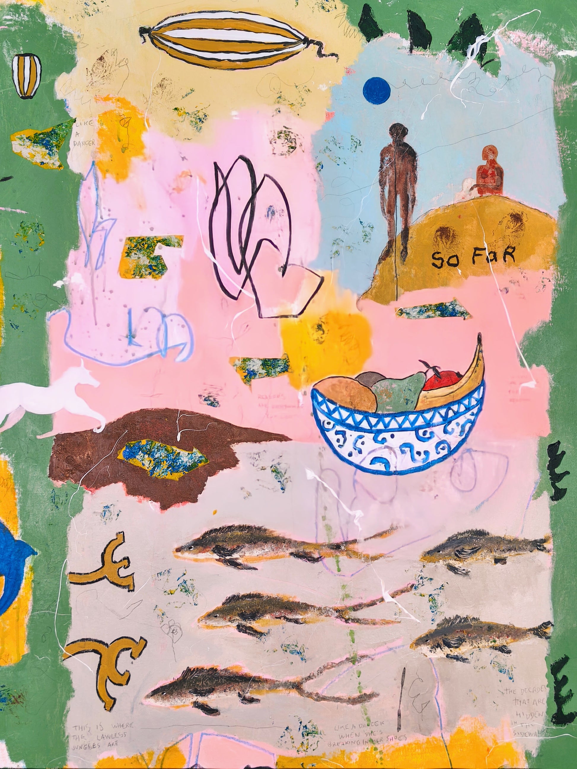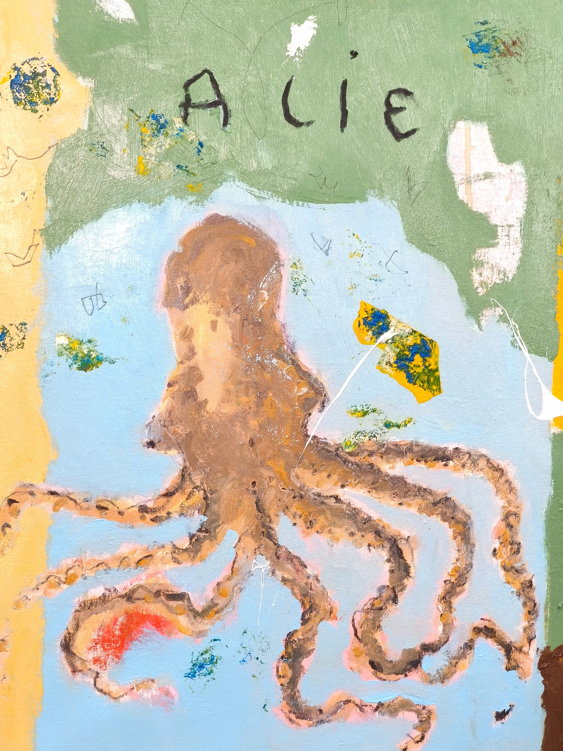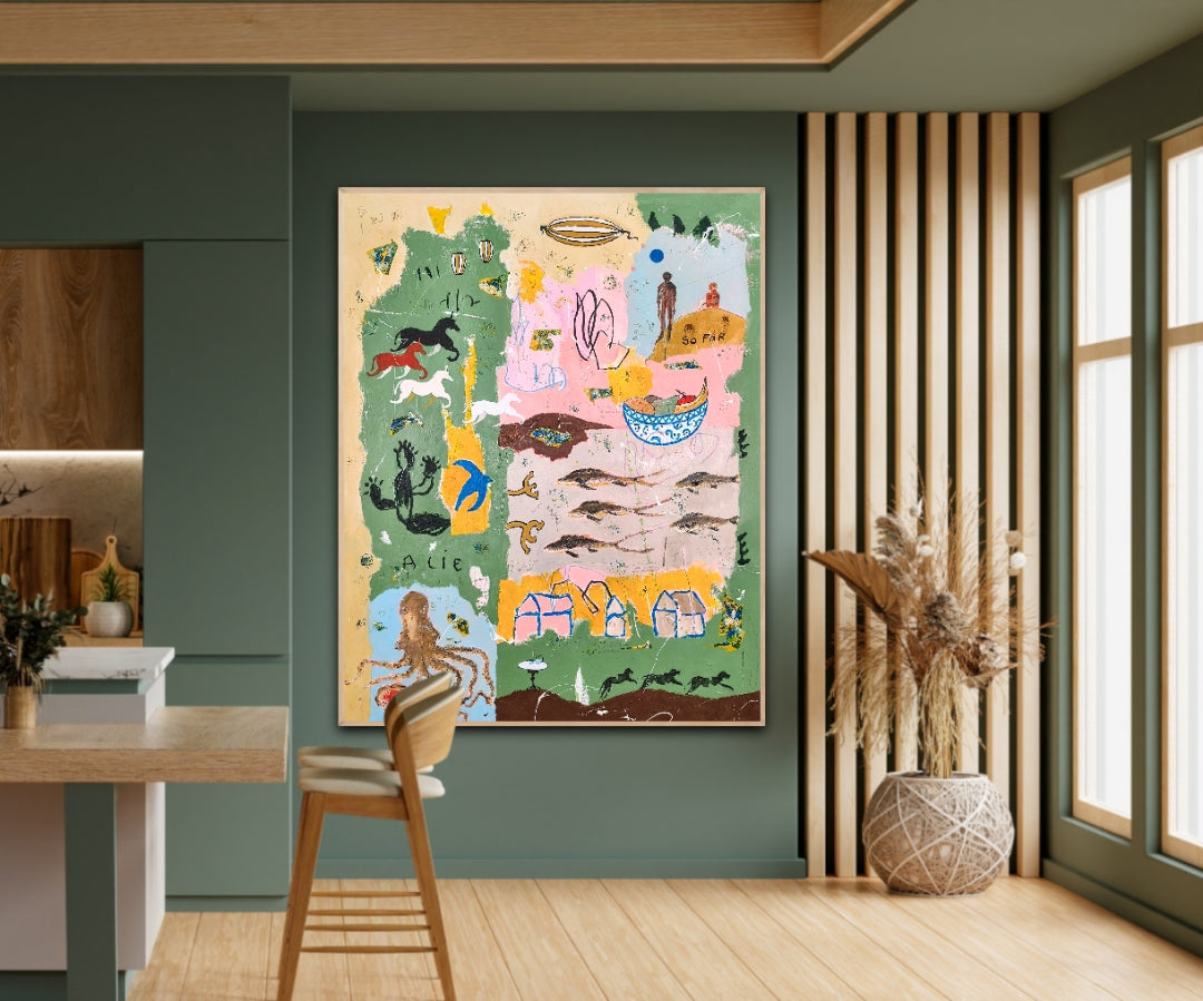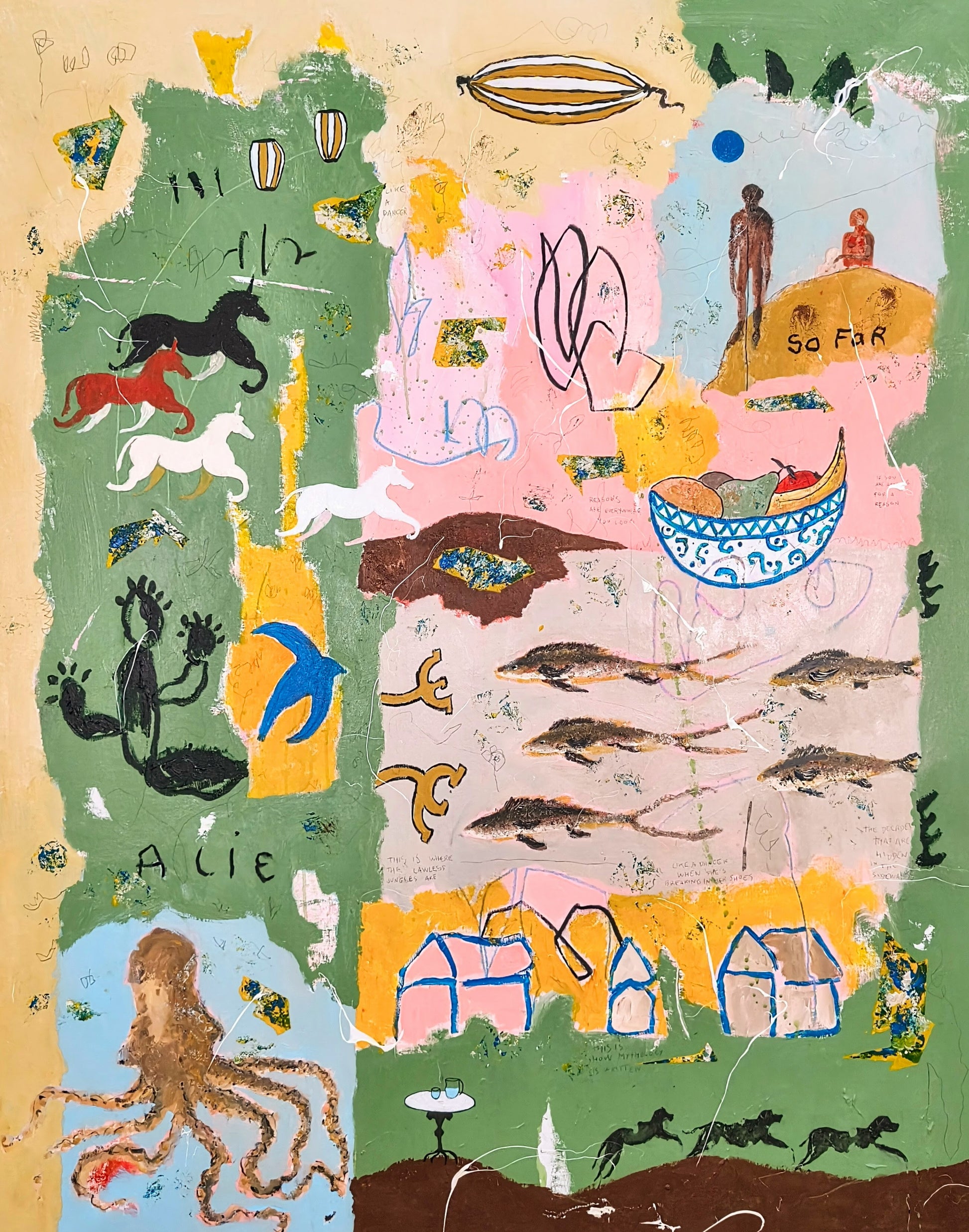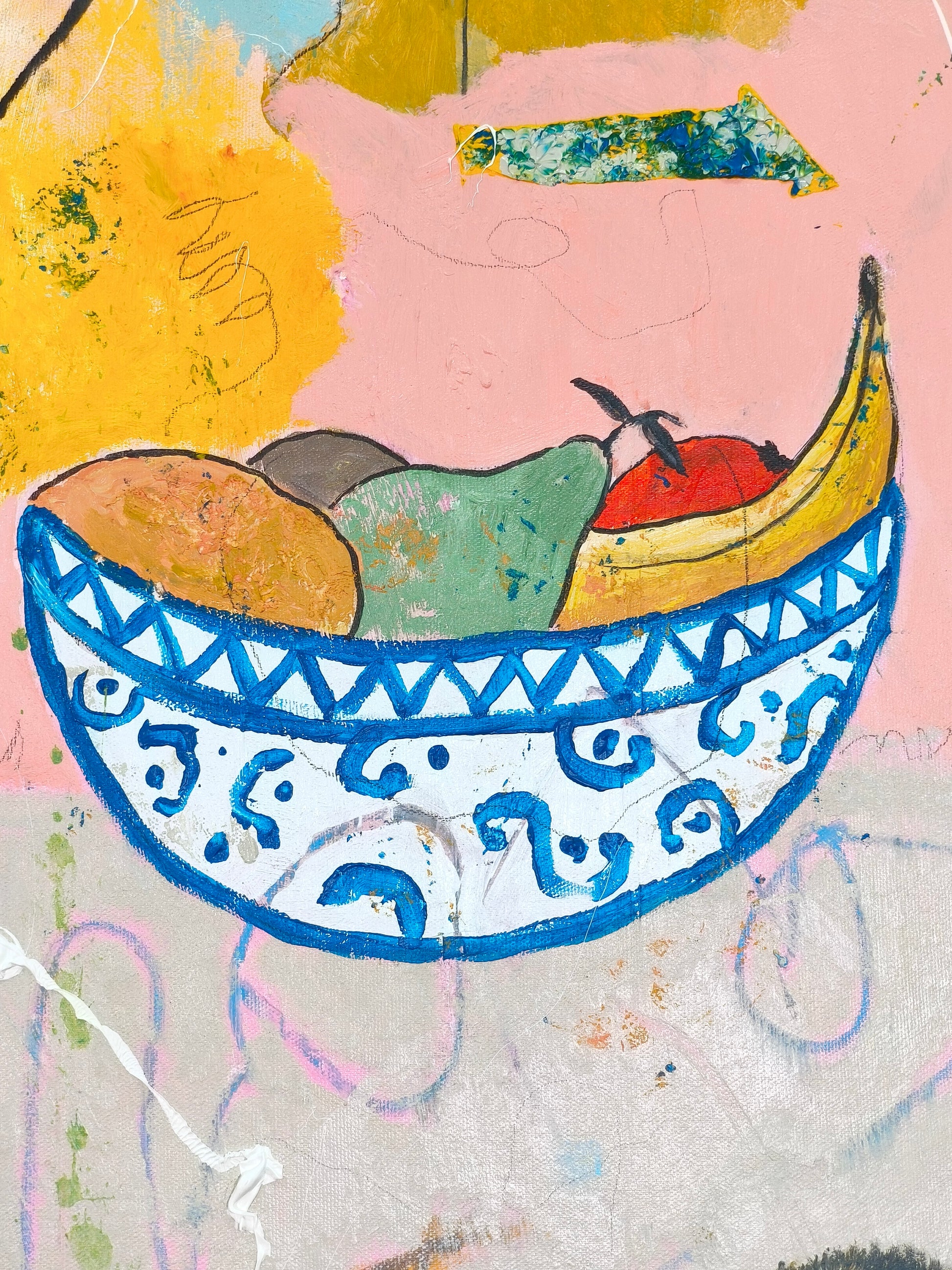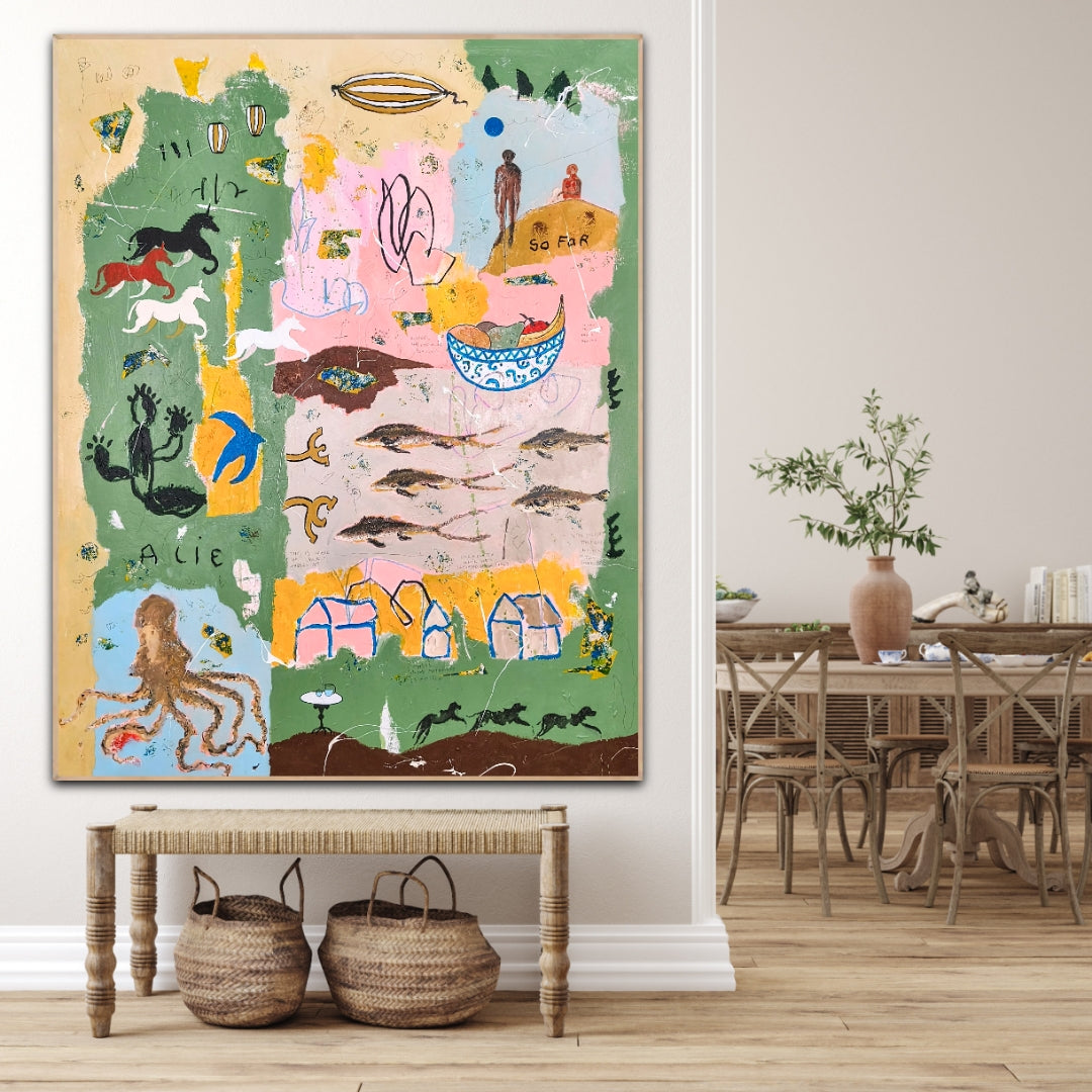 Technique: acrylic, pencil, charcoal, gesso, crayons.