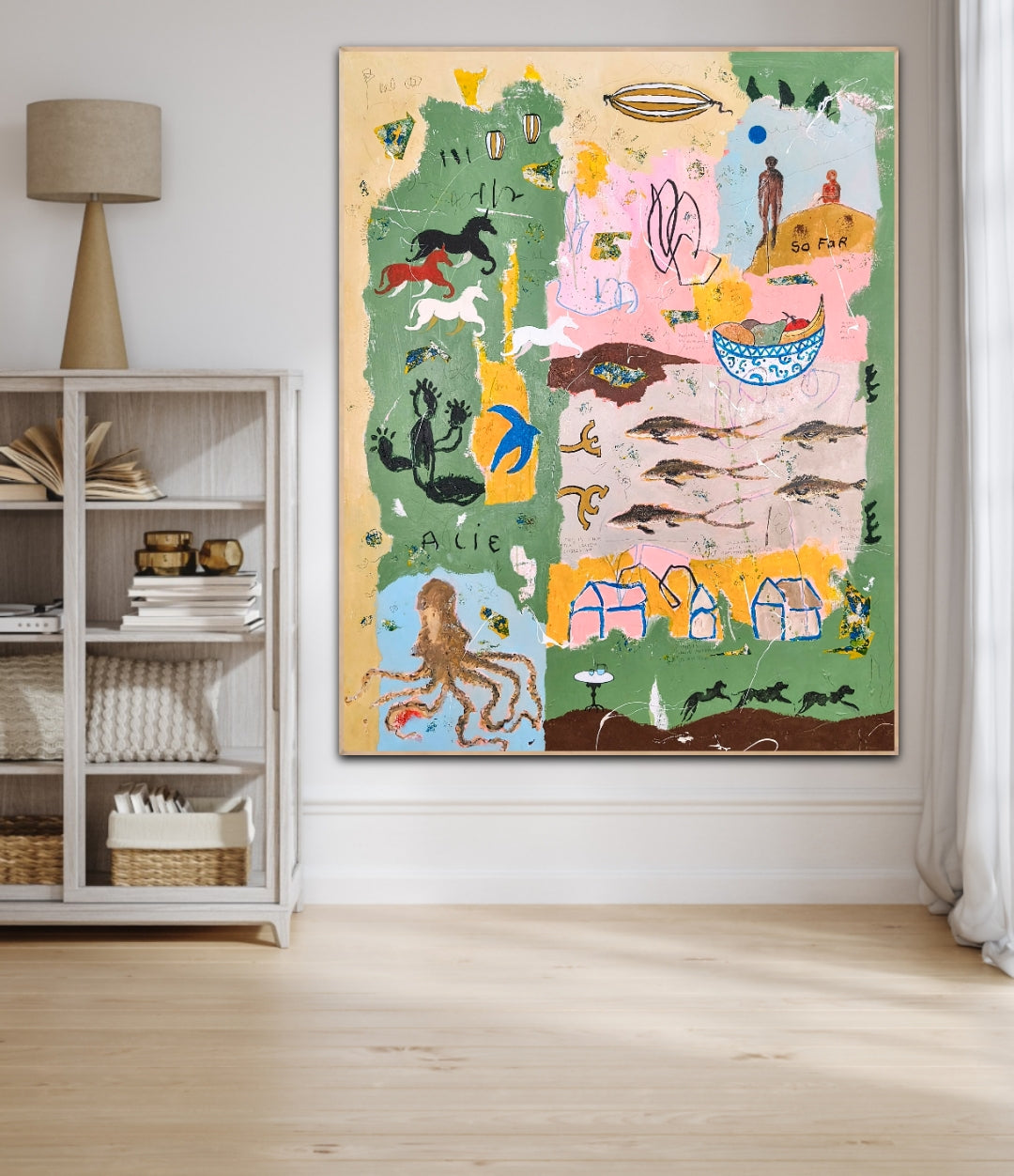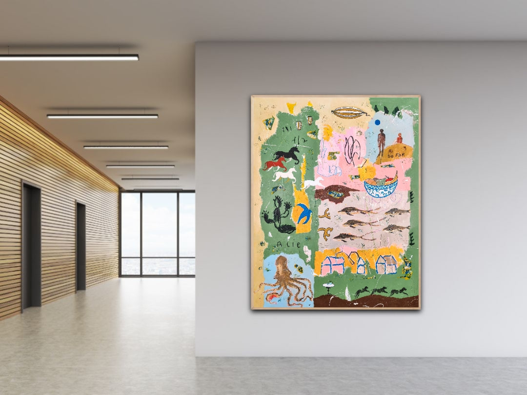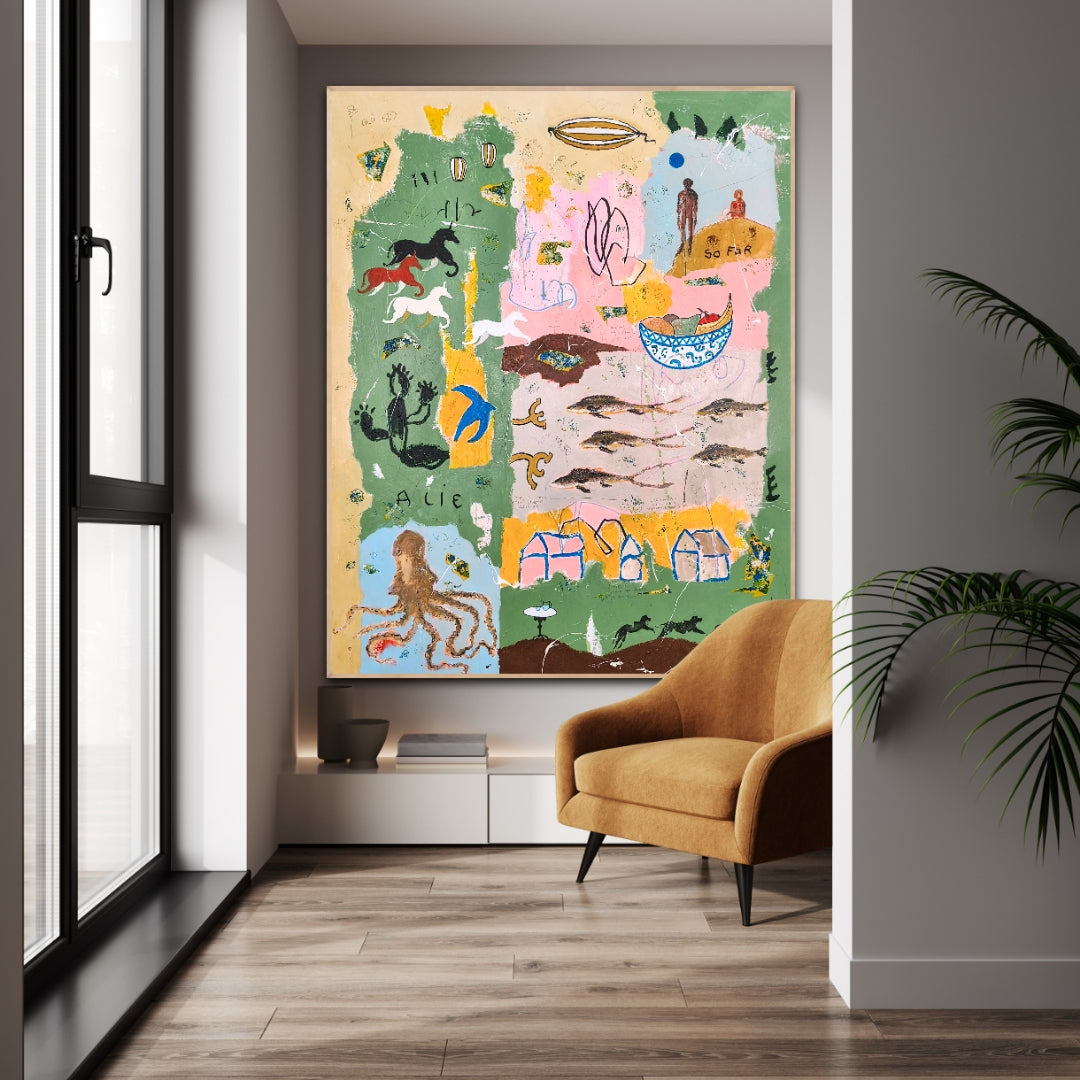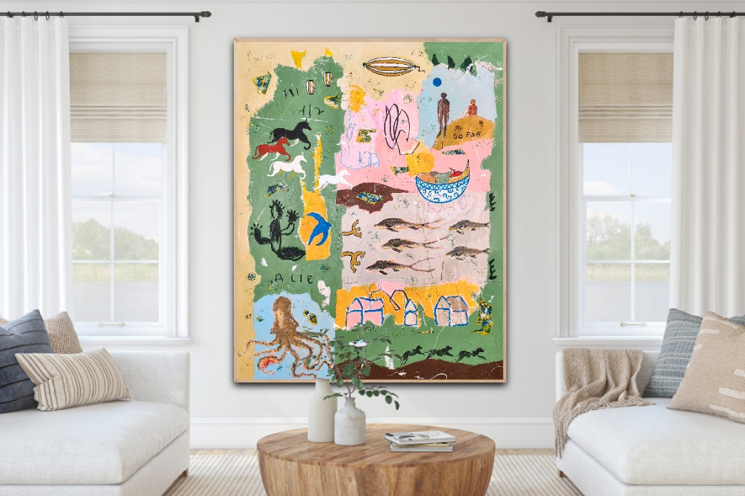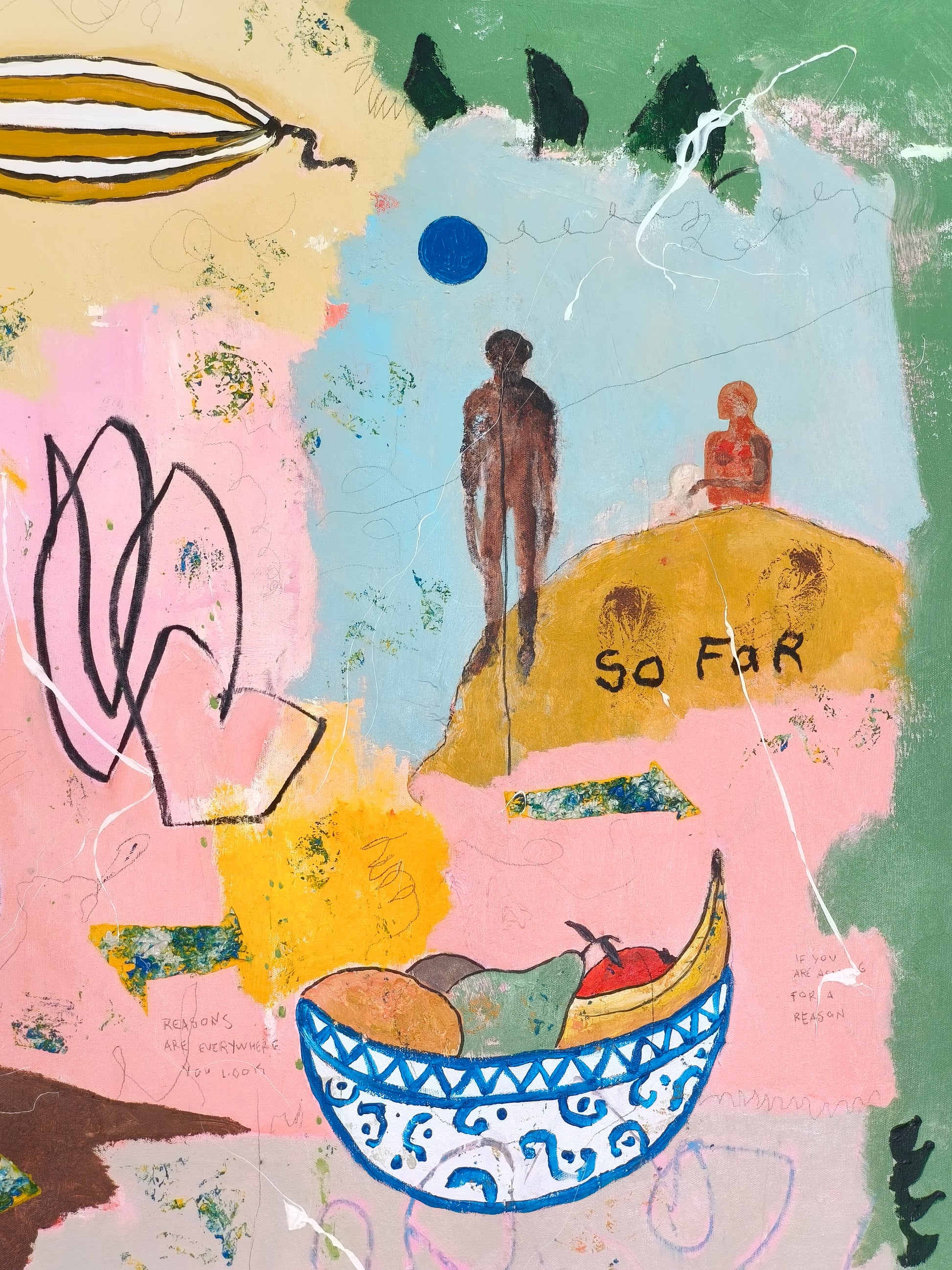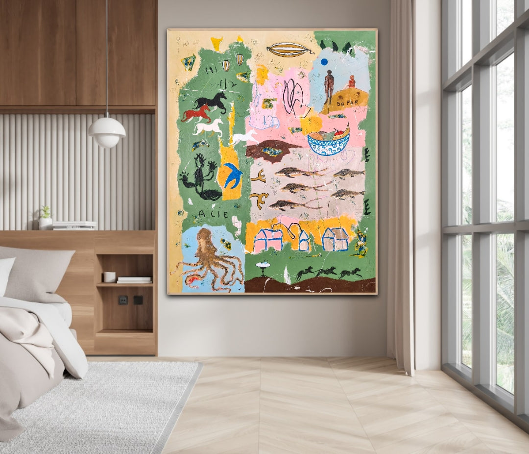 Technique: acrylic, pencil, charcoal, gesso, crayons.