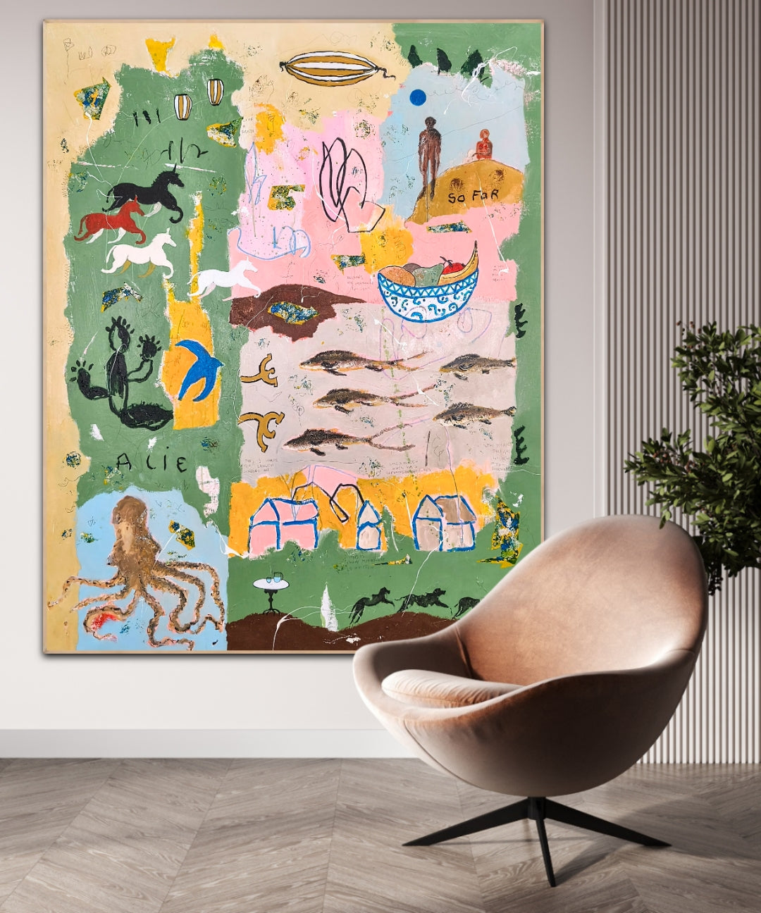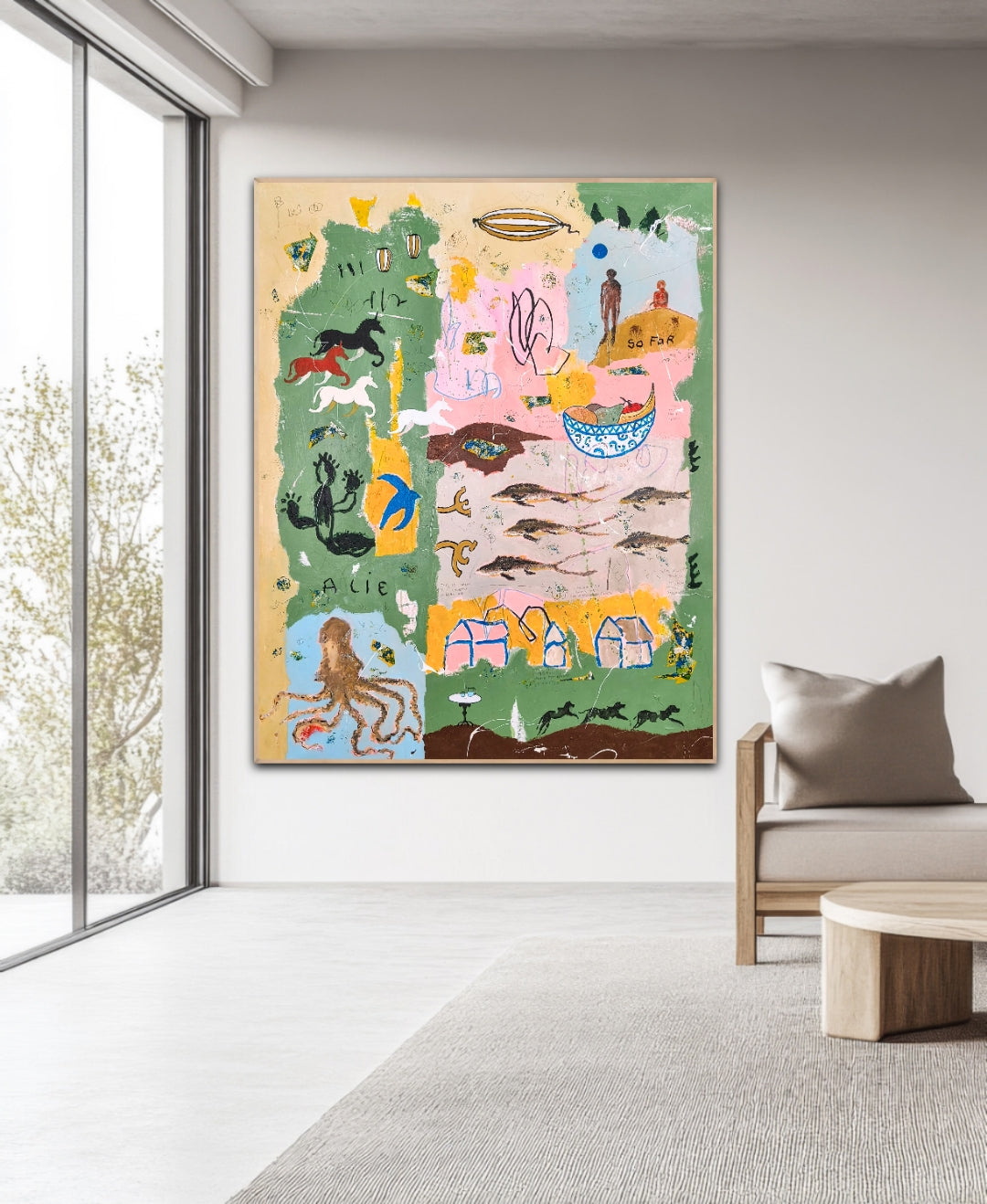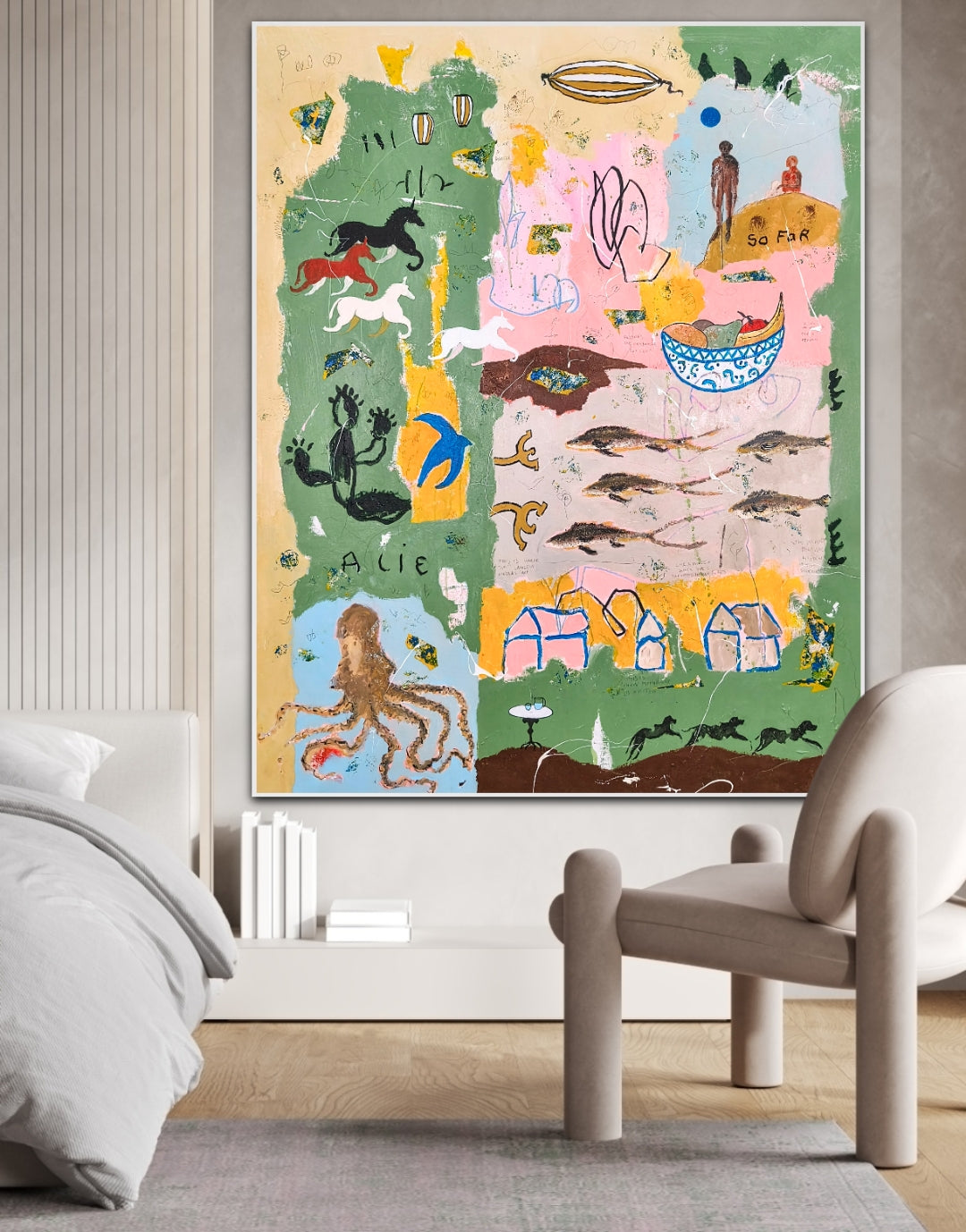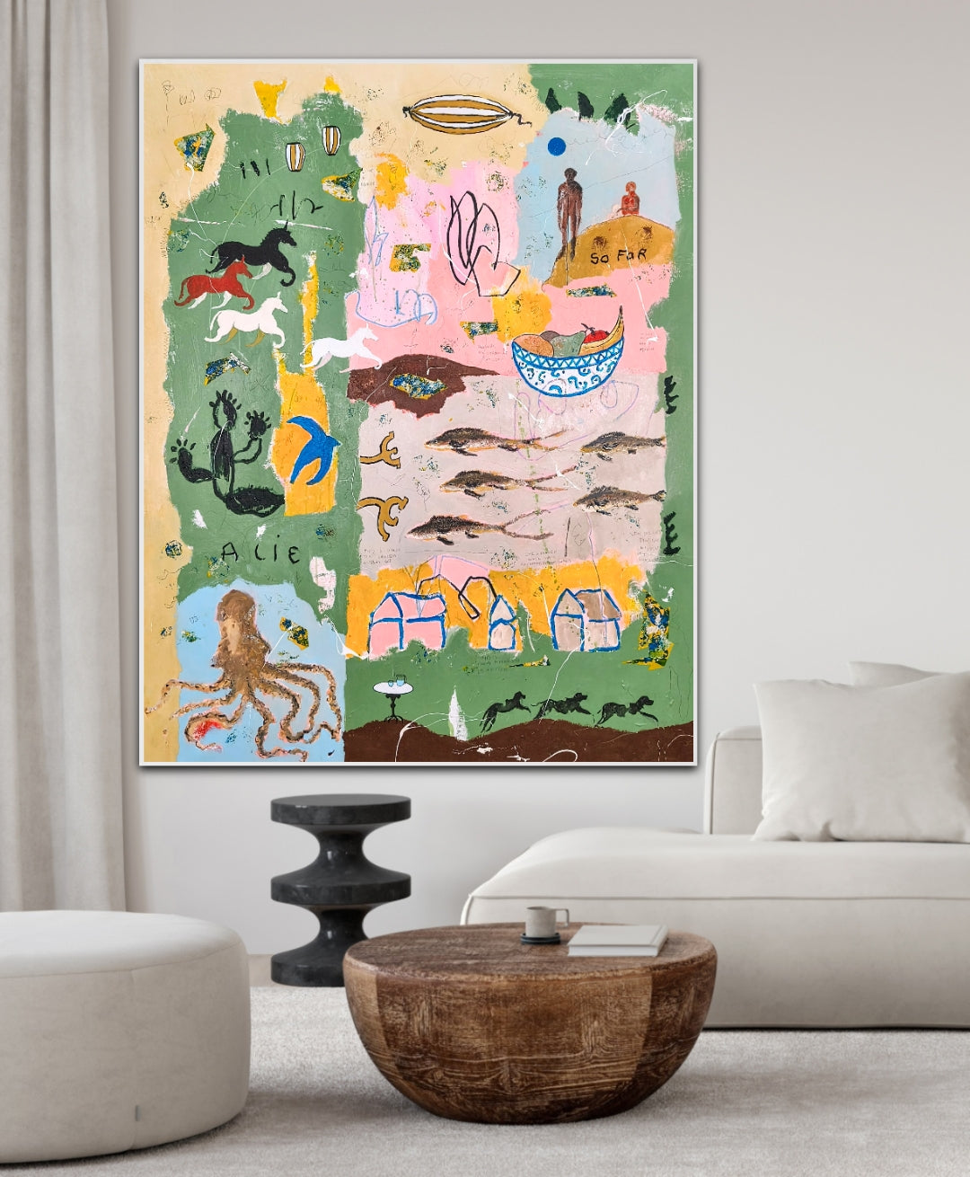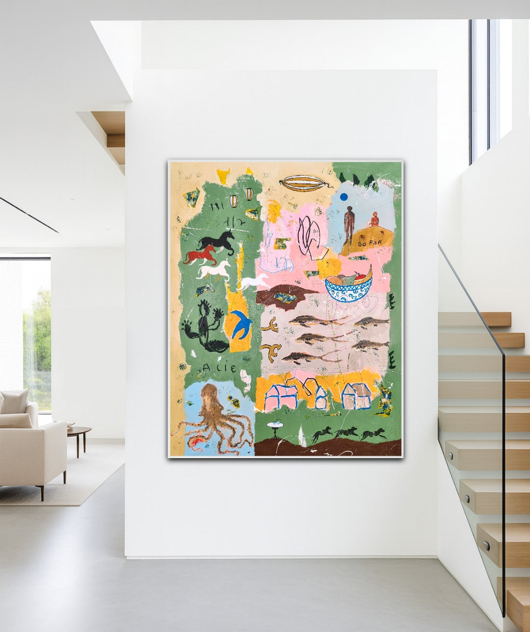 Technique: acrylic, pencil, charcoal, gesso, crayons.