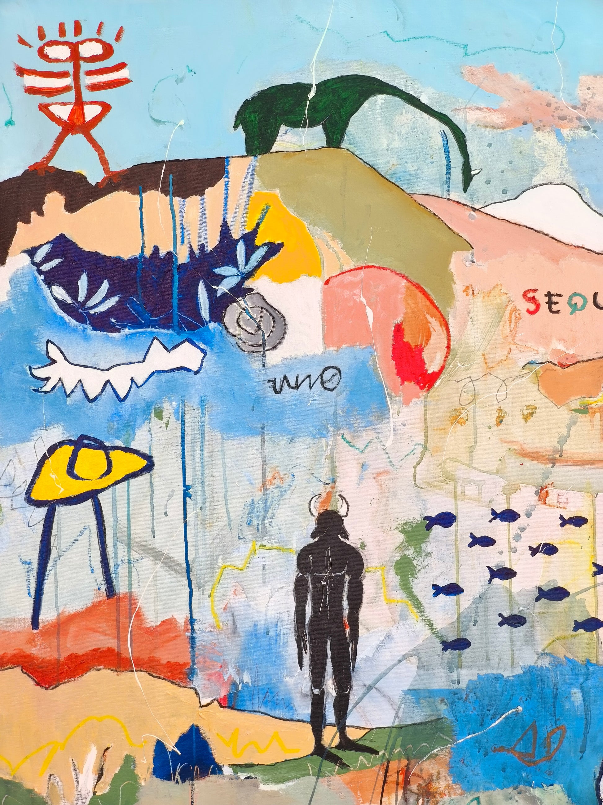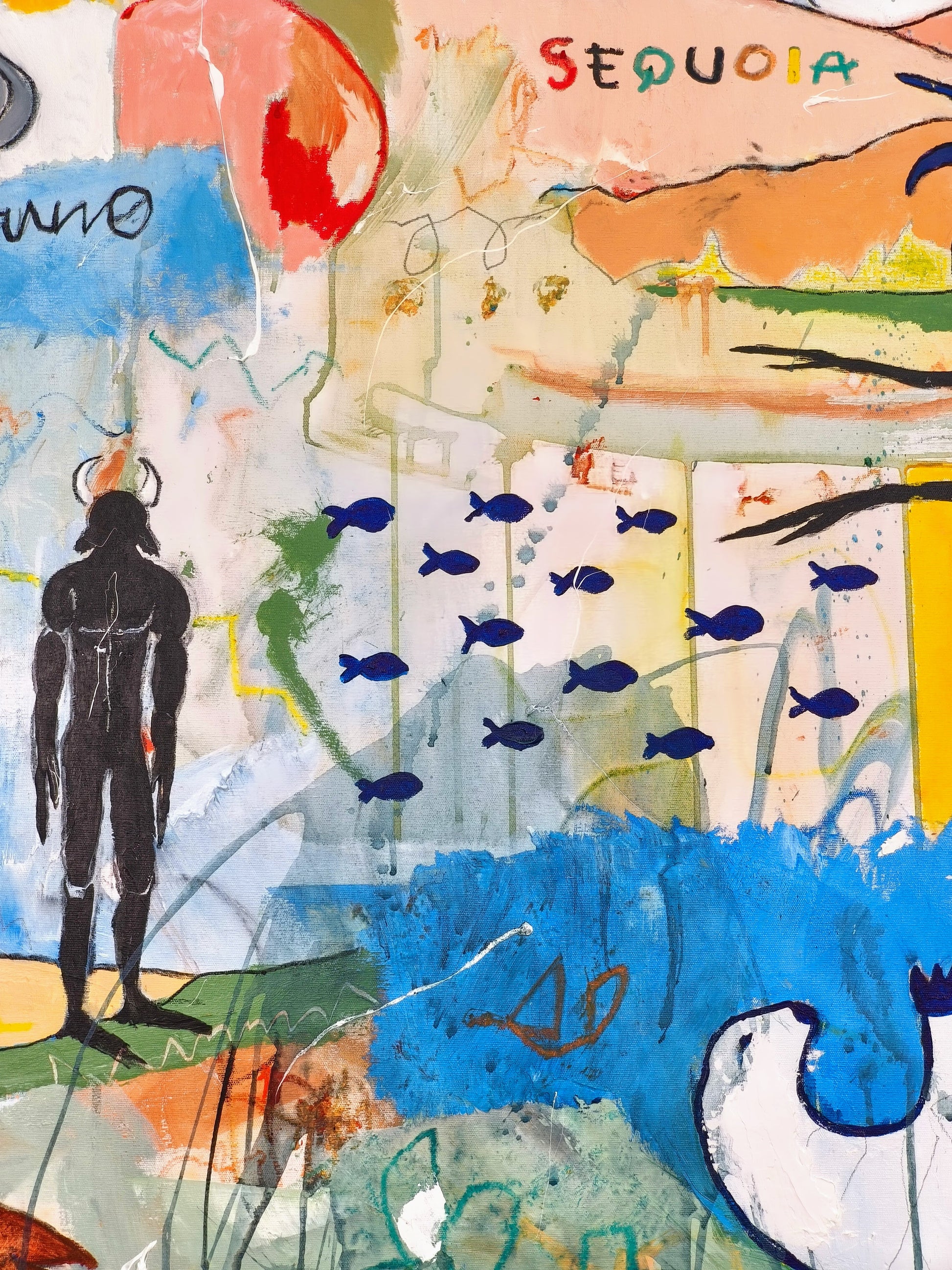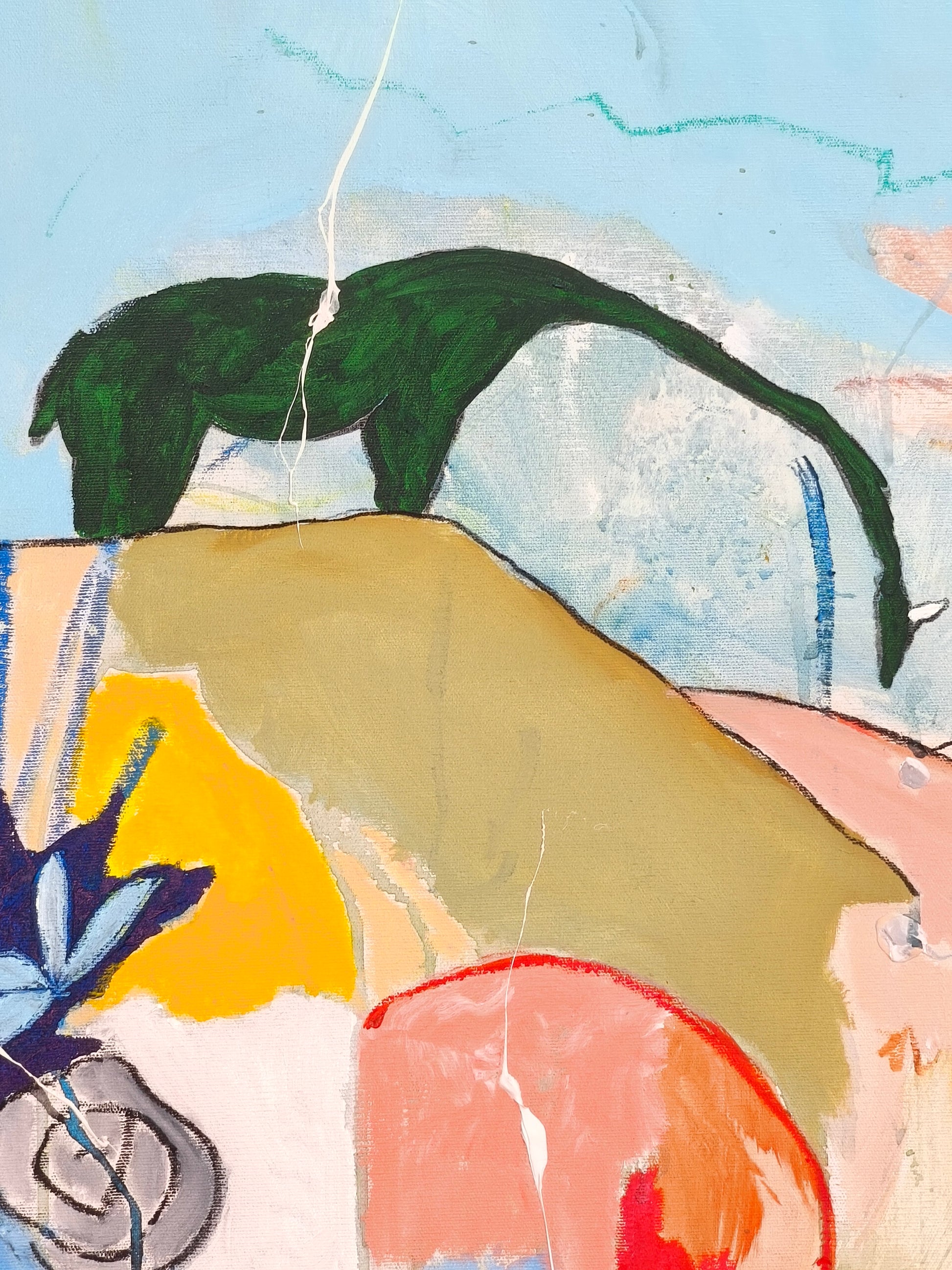 Pintura gestual, intuitiva, que deja que las cosas pasen y se apoya sobre lo que aparece. Aprovechando el accidente y aceptando las consecuencias.