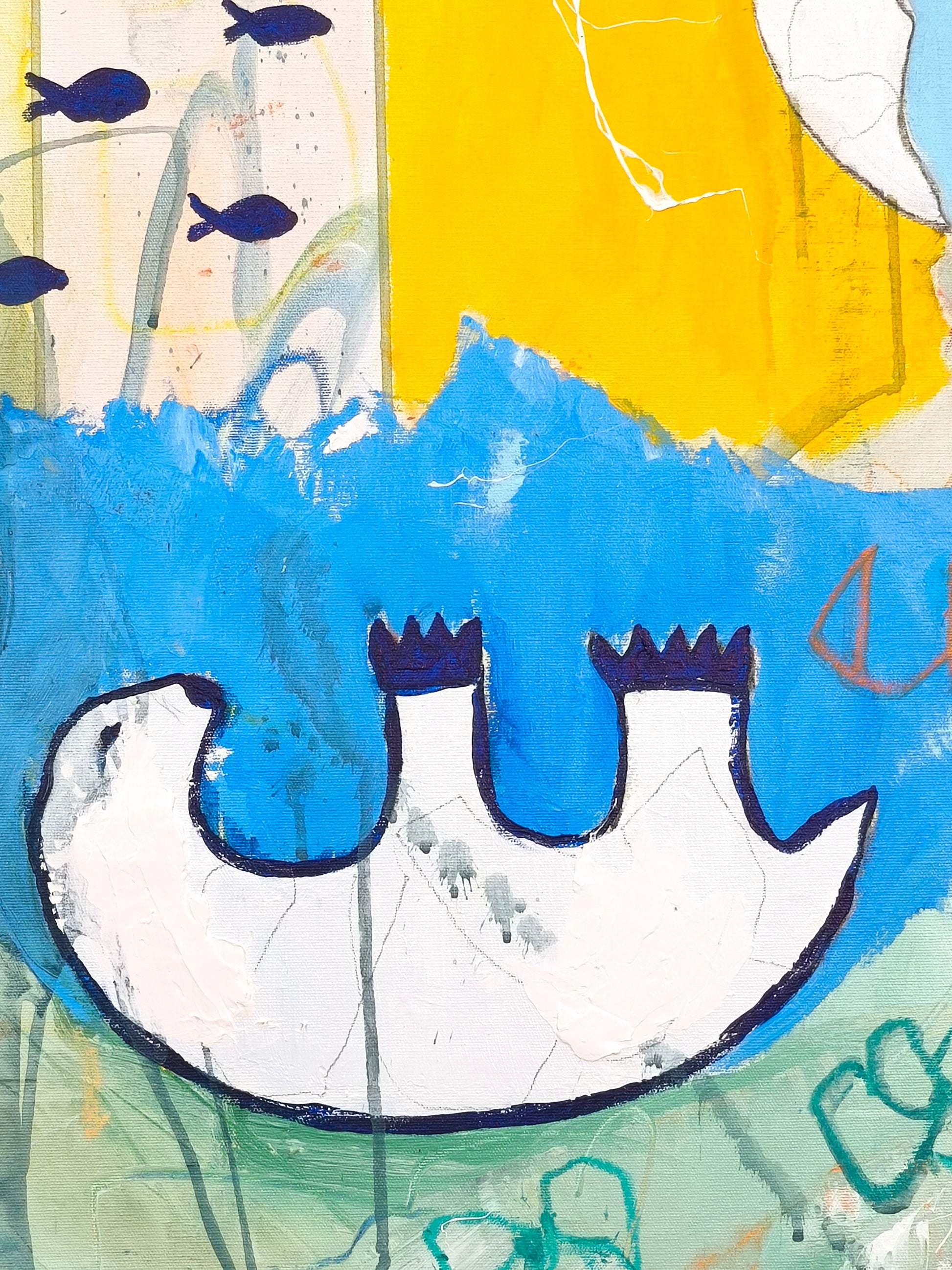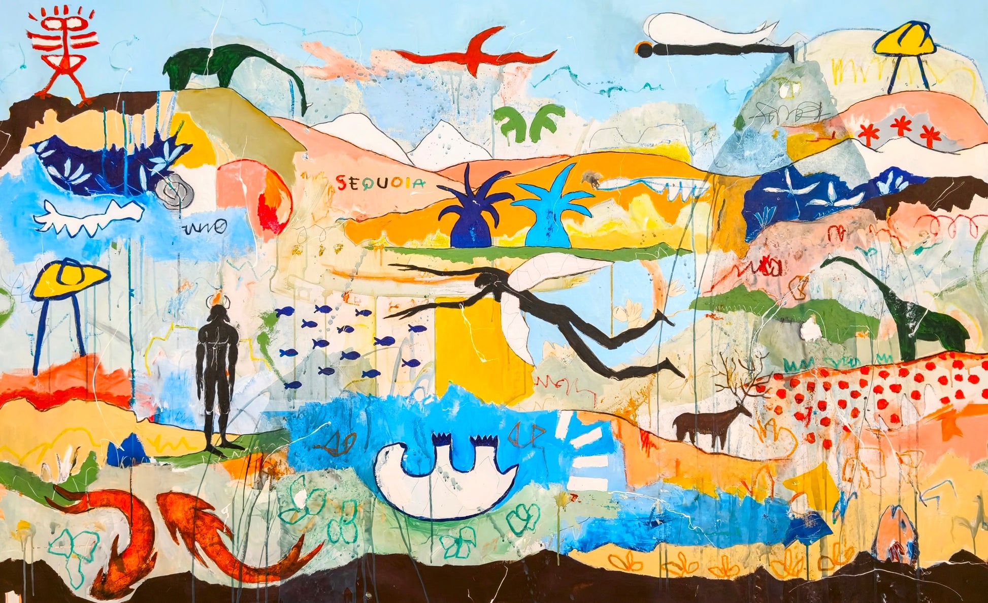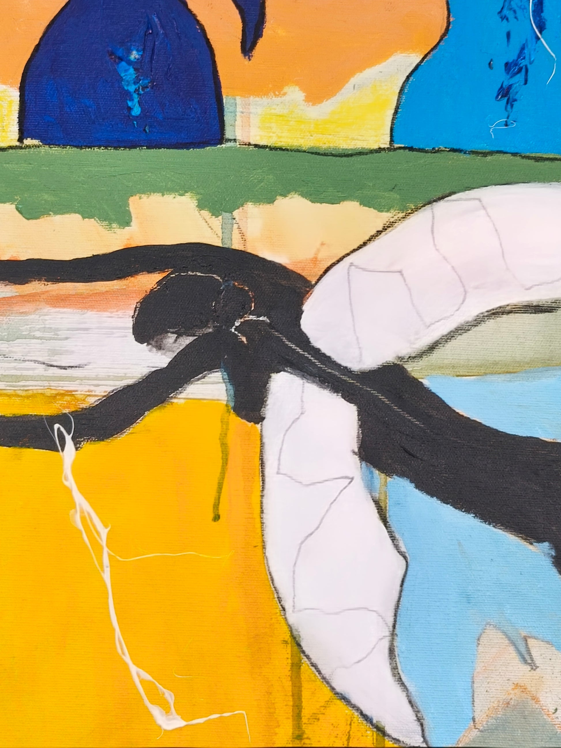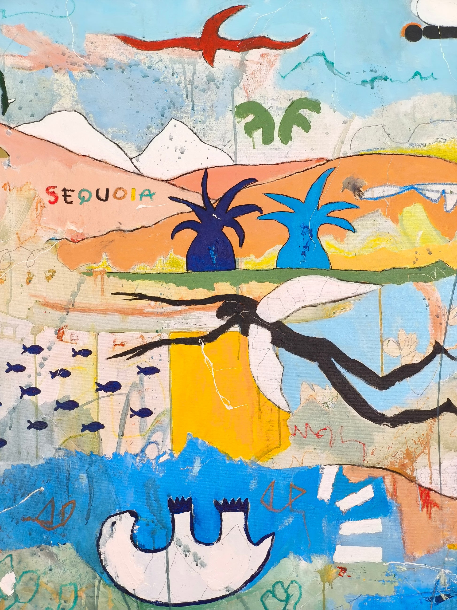 Pintura gestual, intuitiva, que deja que las cosas pasen y se apoya sobre lo que aparece. Aprovechando el accidente y aceptando las consecuencias.