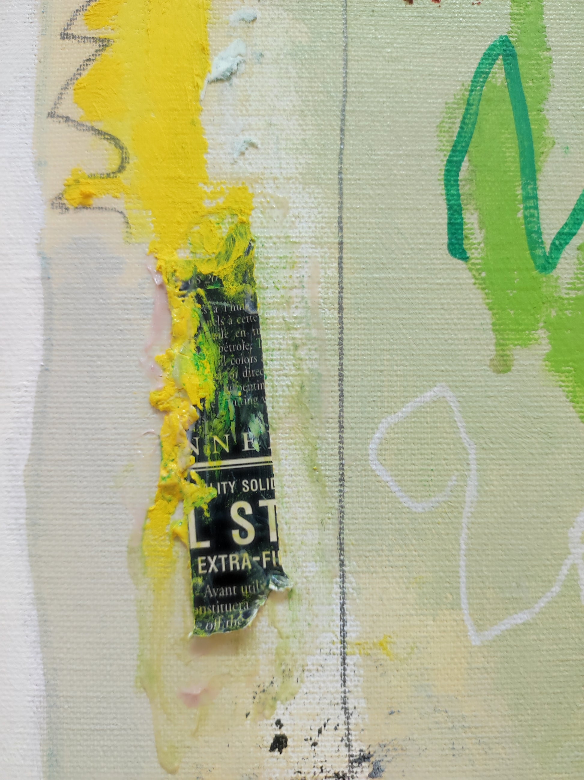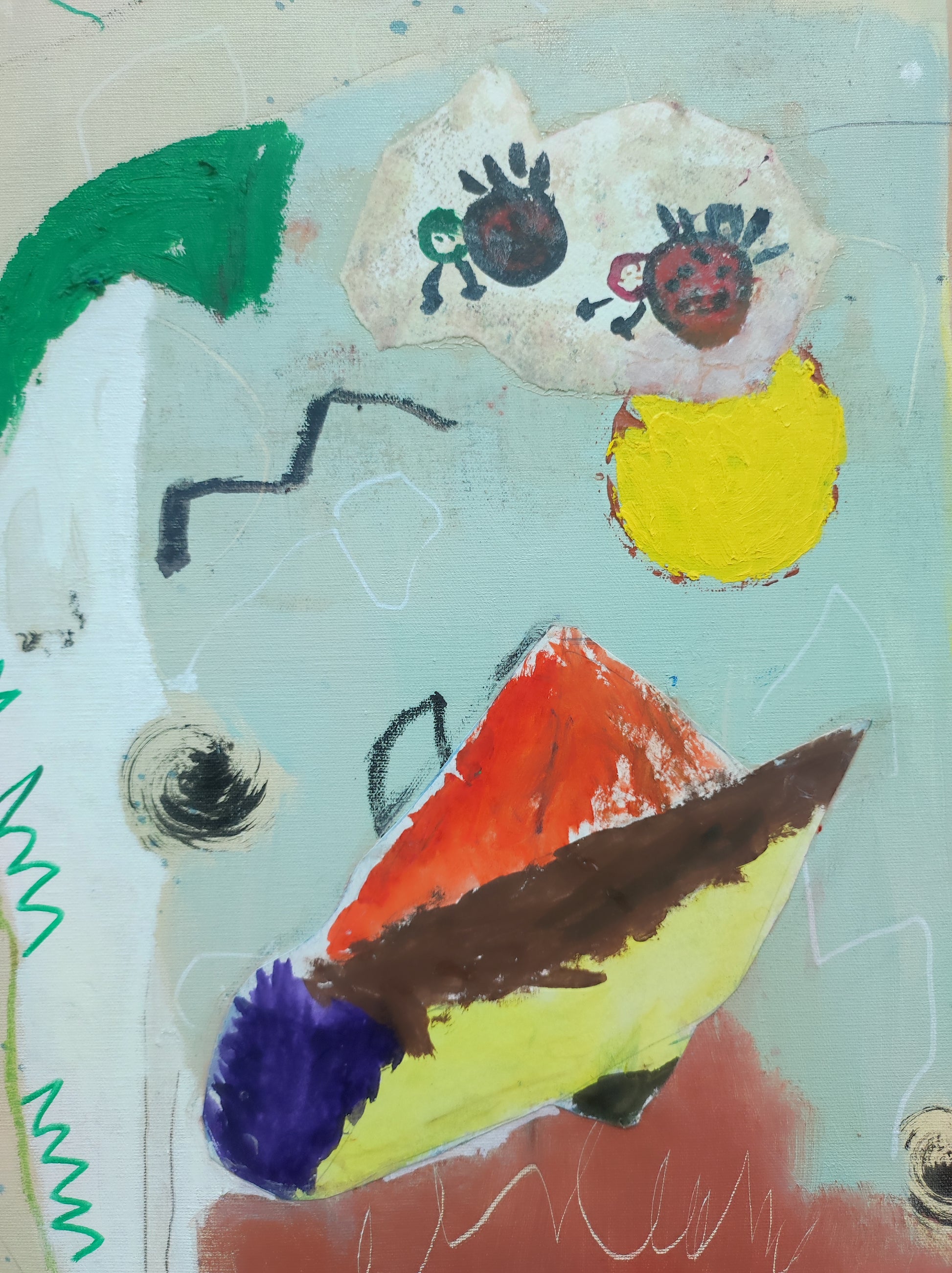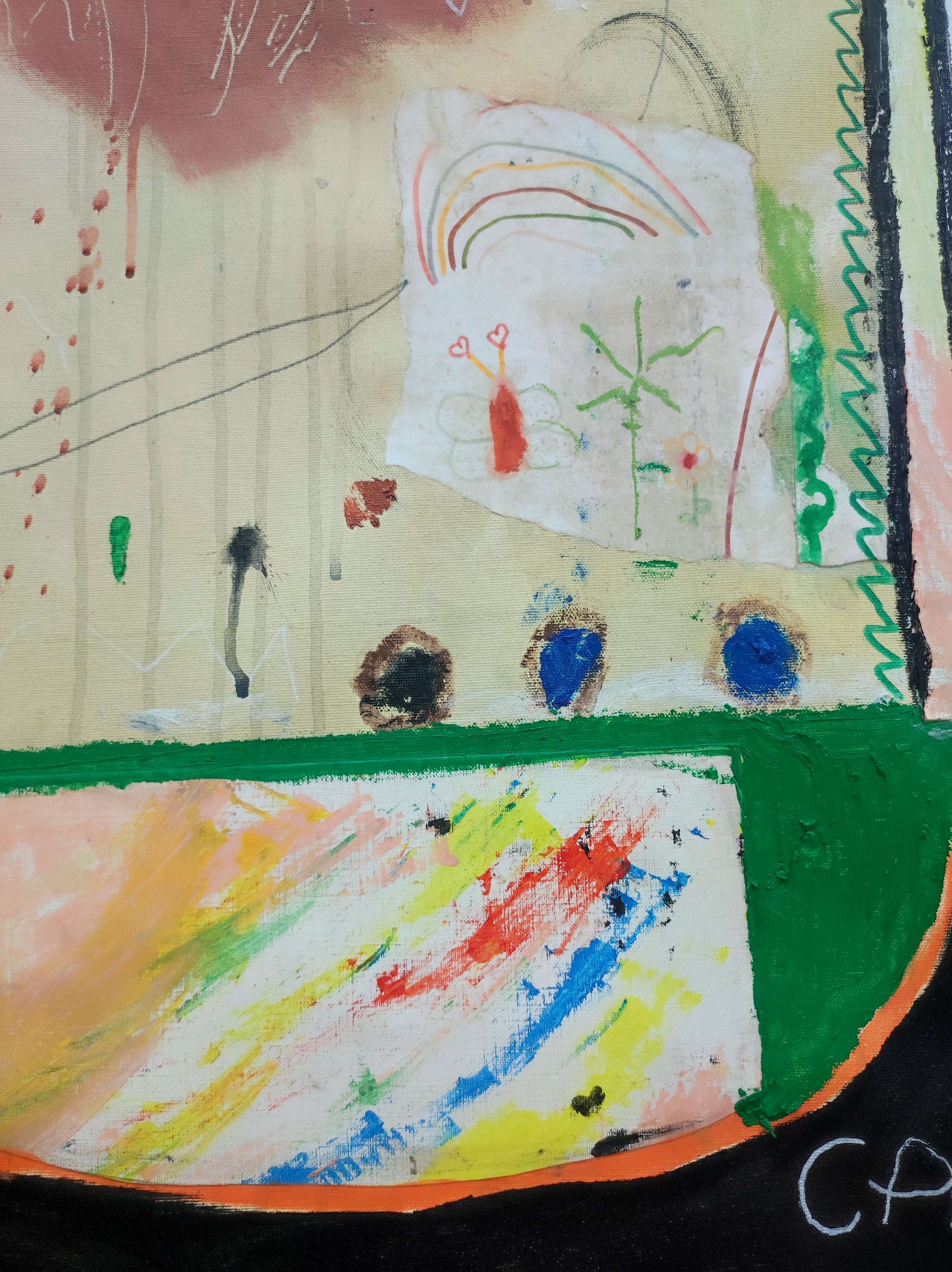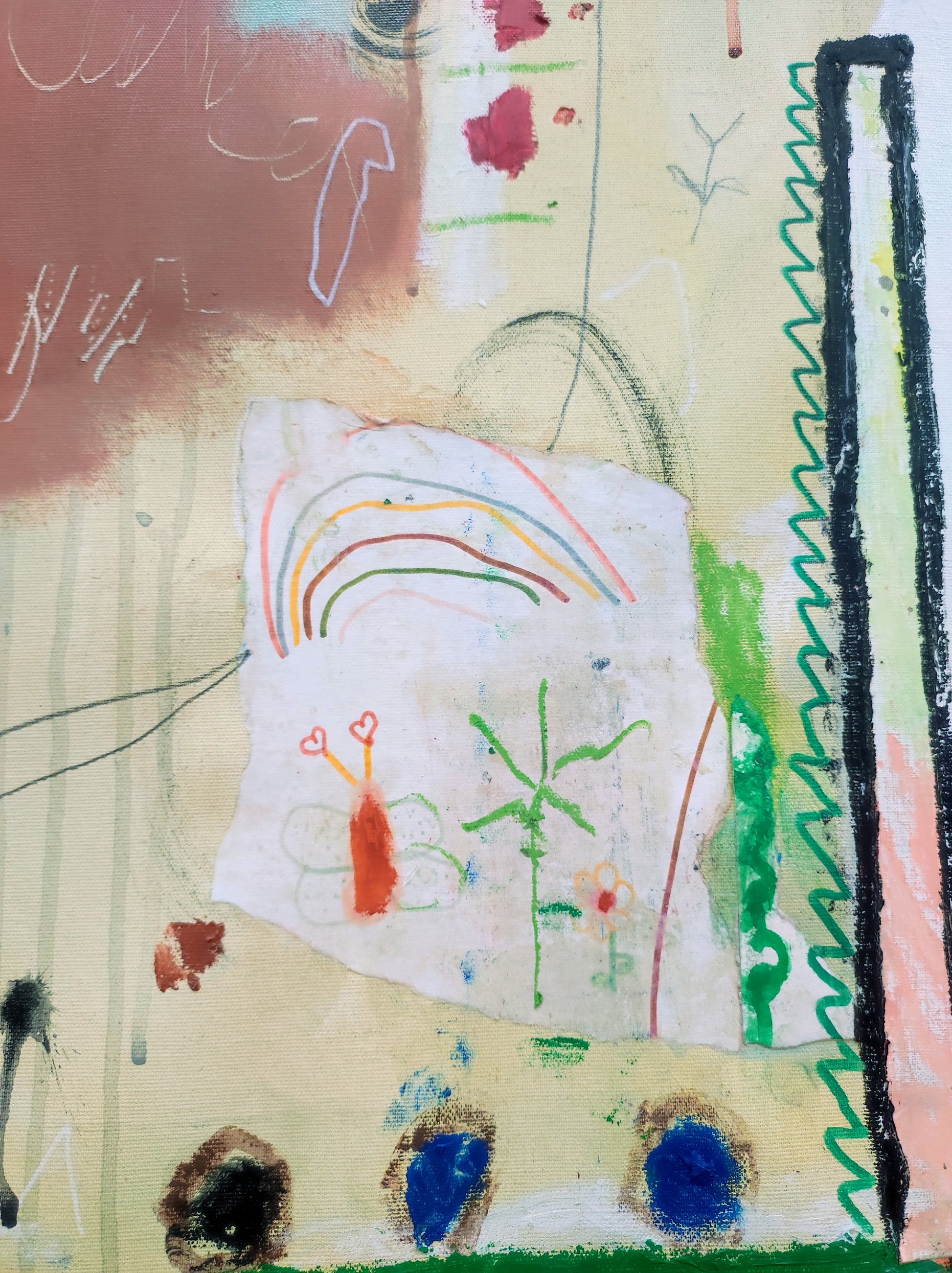 Pintura gestual, intuitiva, que incluye collage con papeles de hace muchos años.