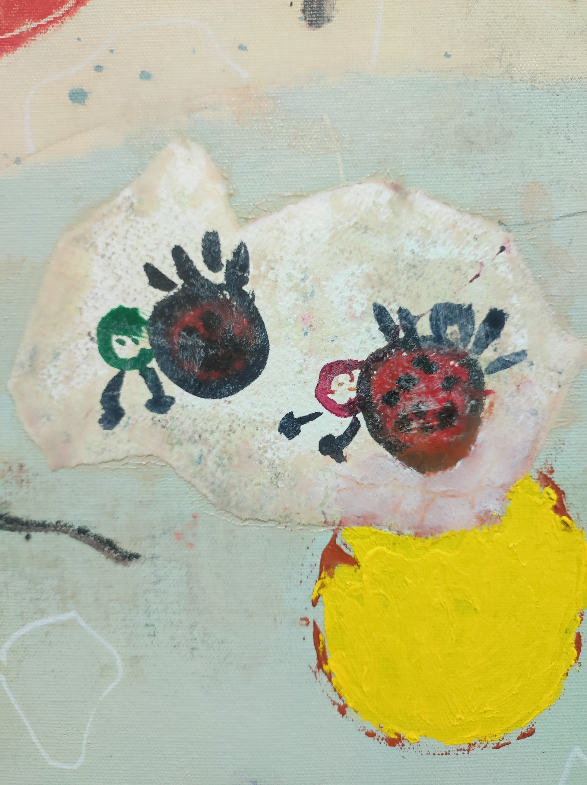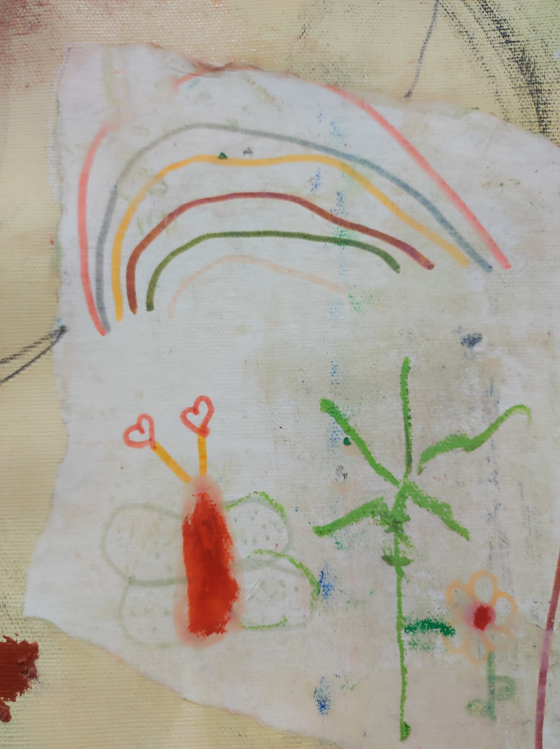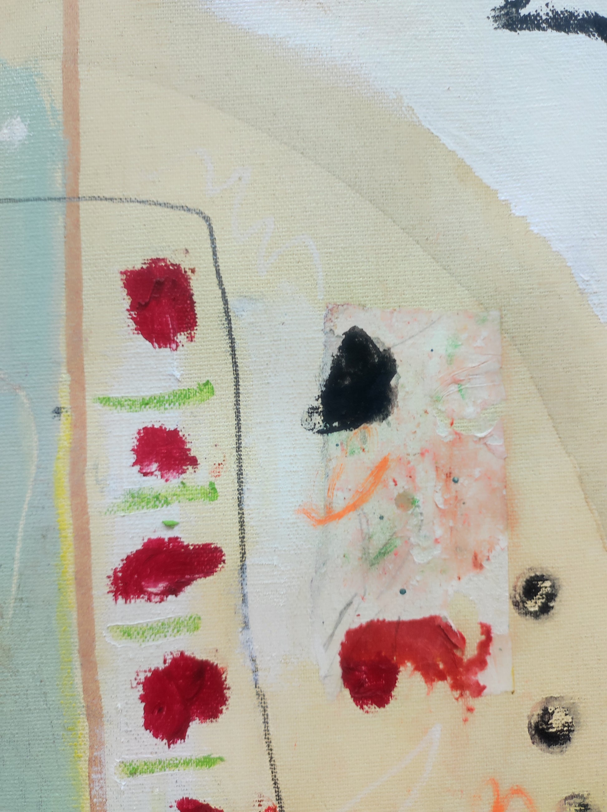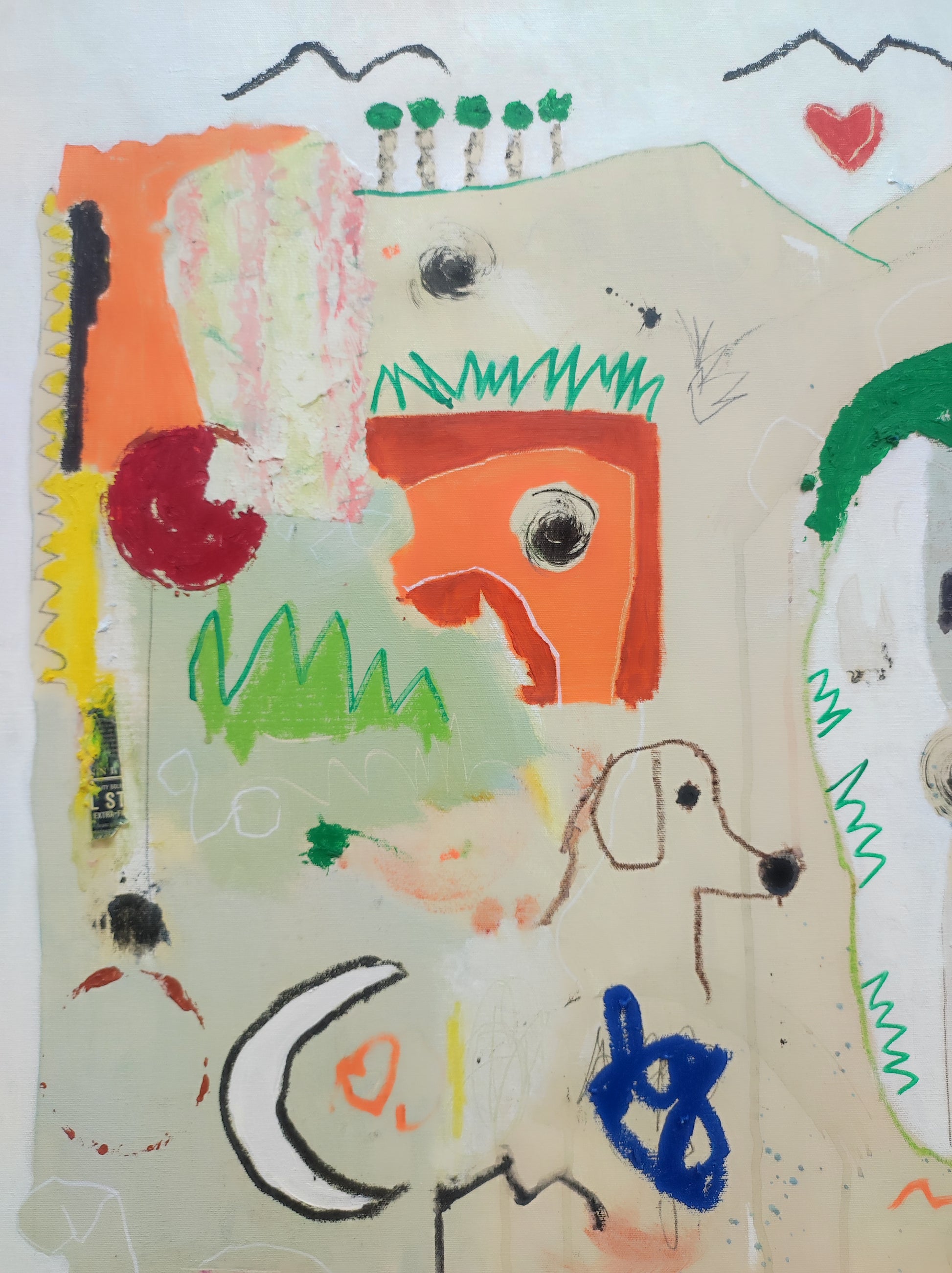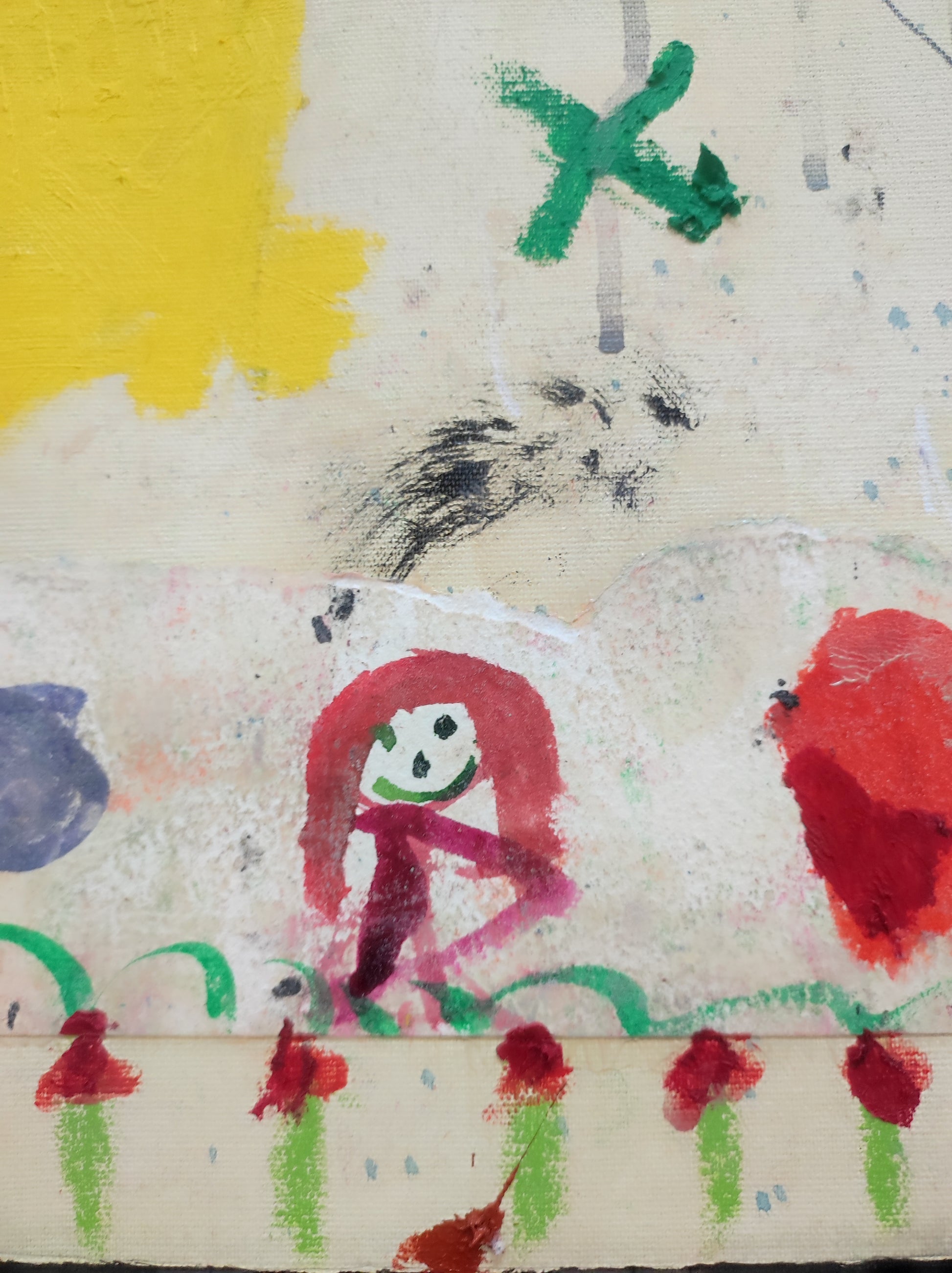 Pintura gestual, intuitiva, que incluye collage con papeles de hace muchos años.