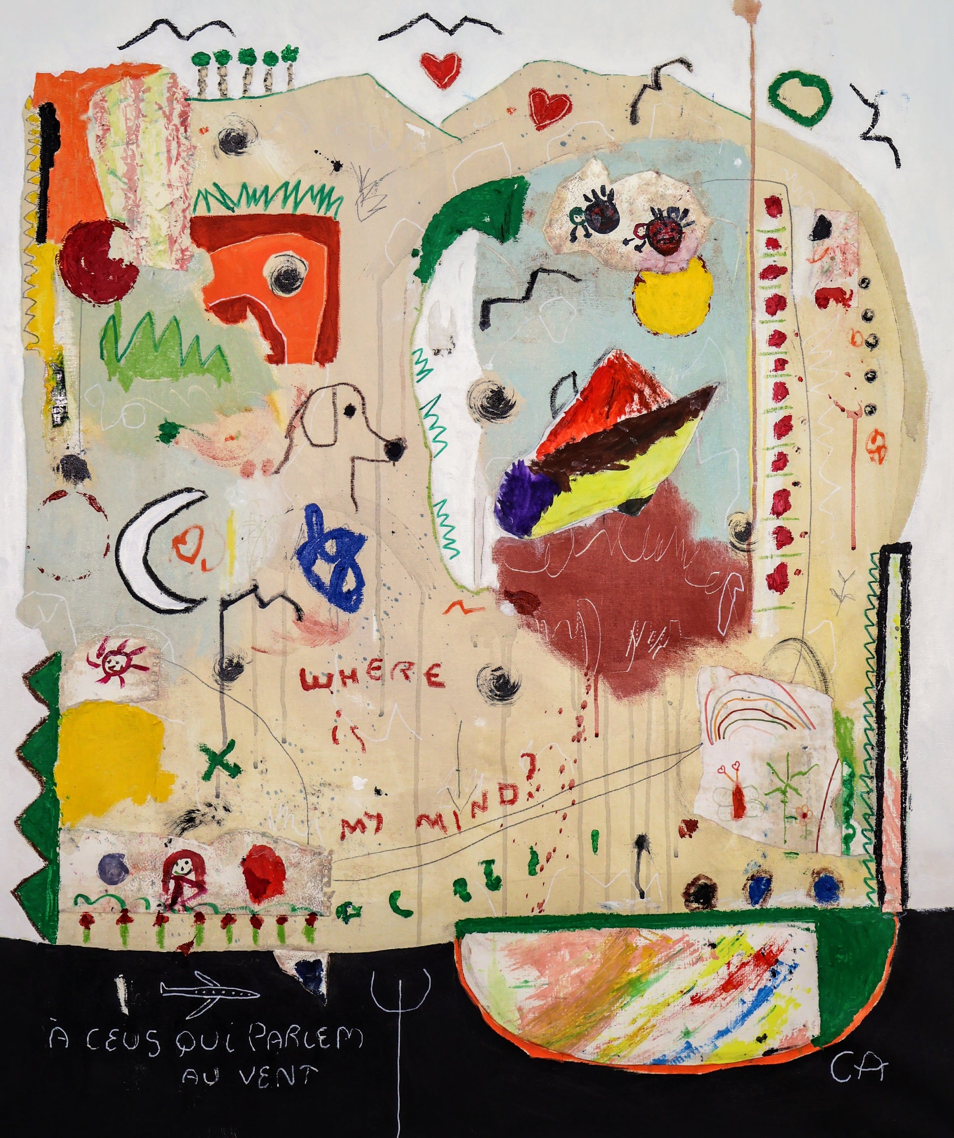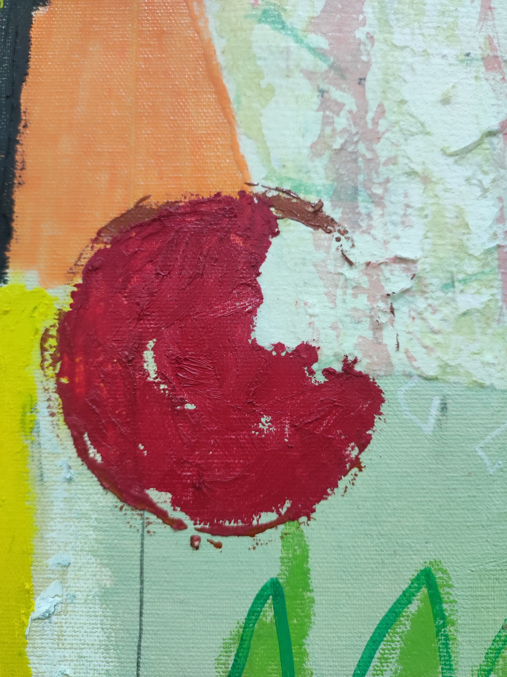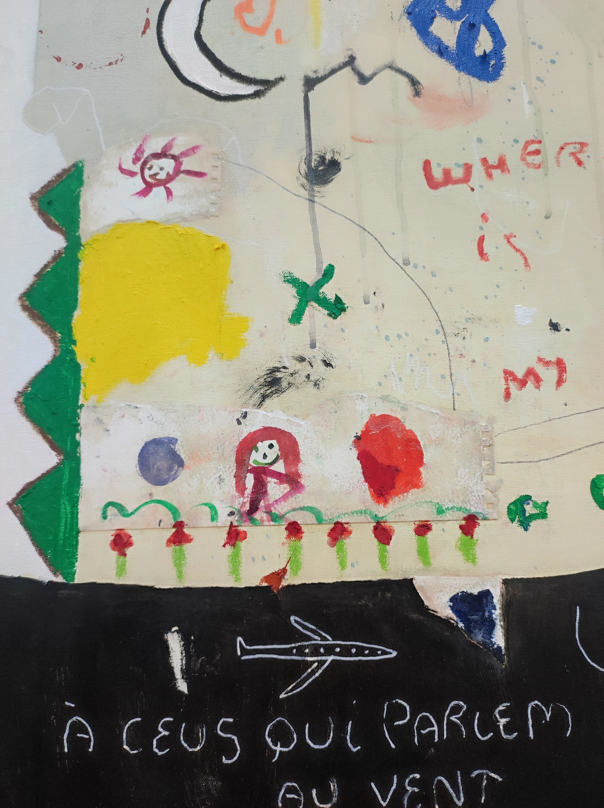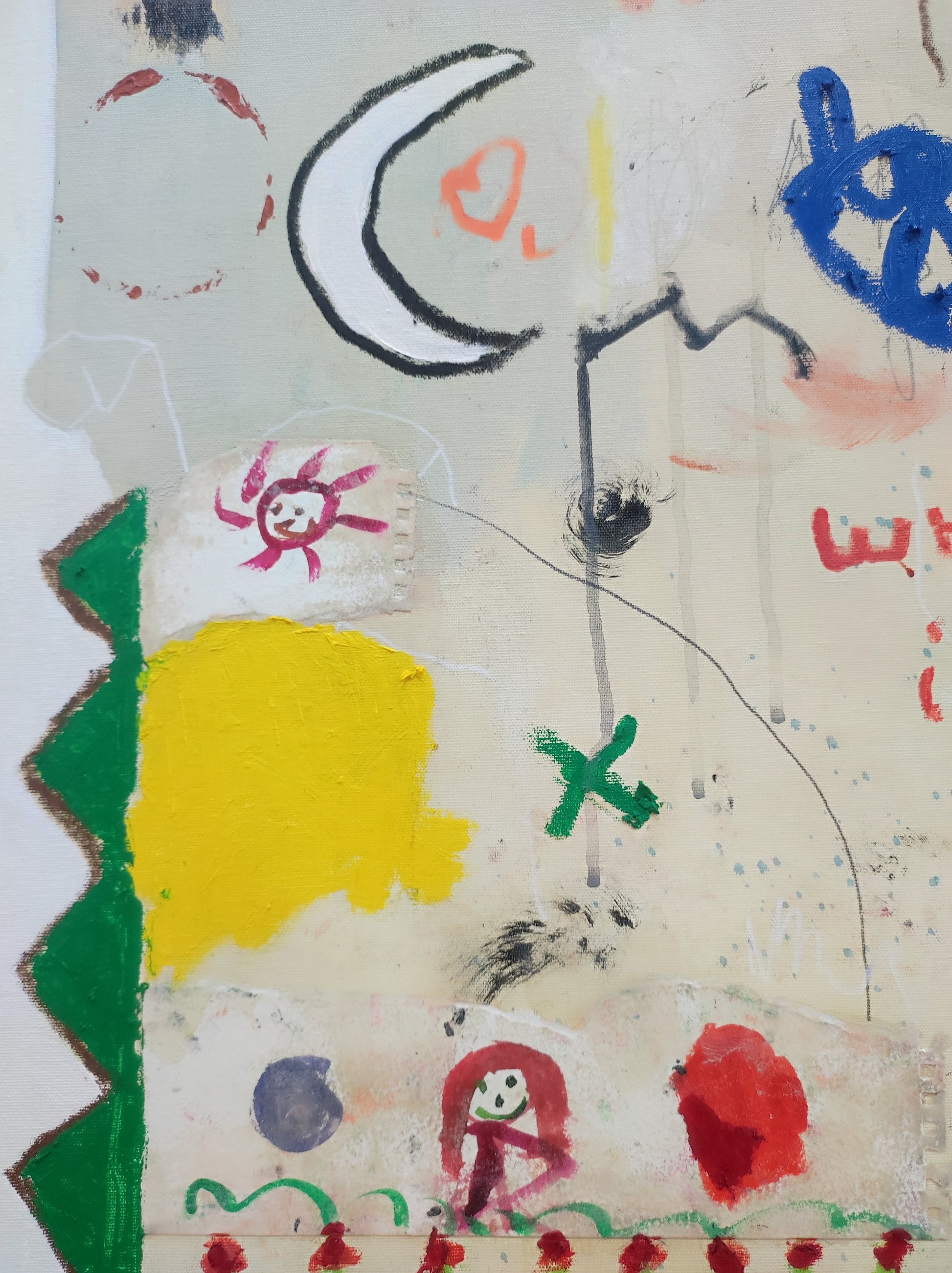 Pintura gestual, intuitiva, que incluye collage con papeles de hace muchos años.