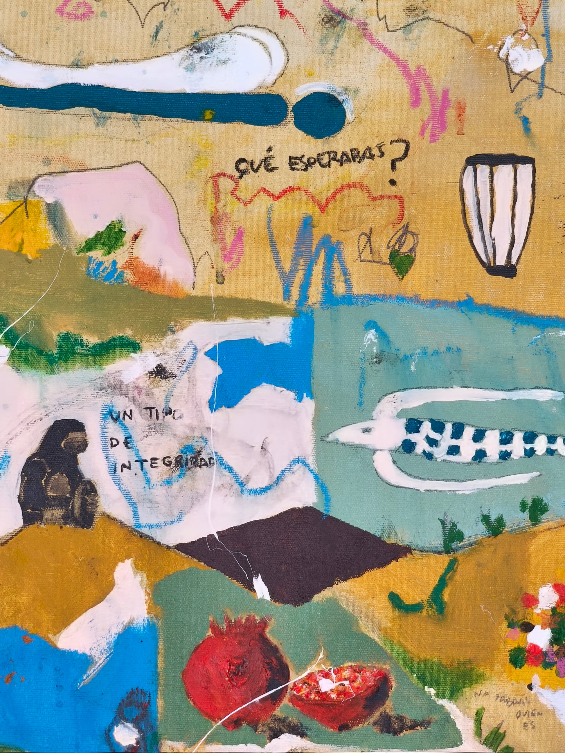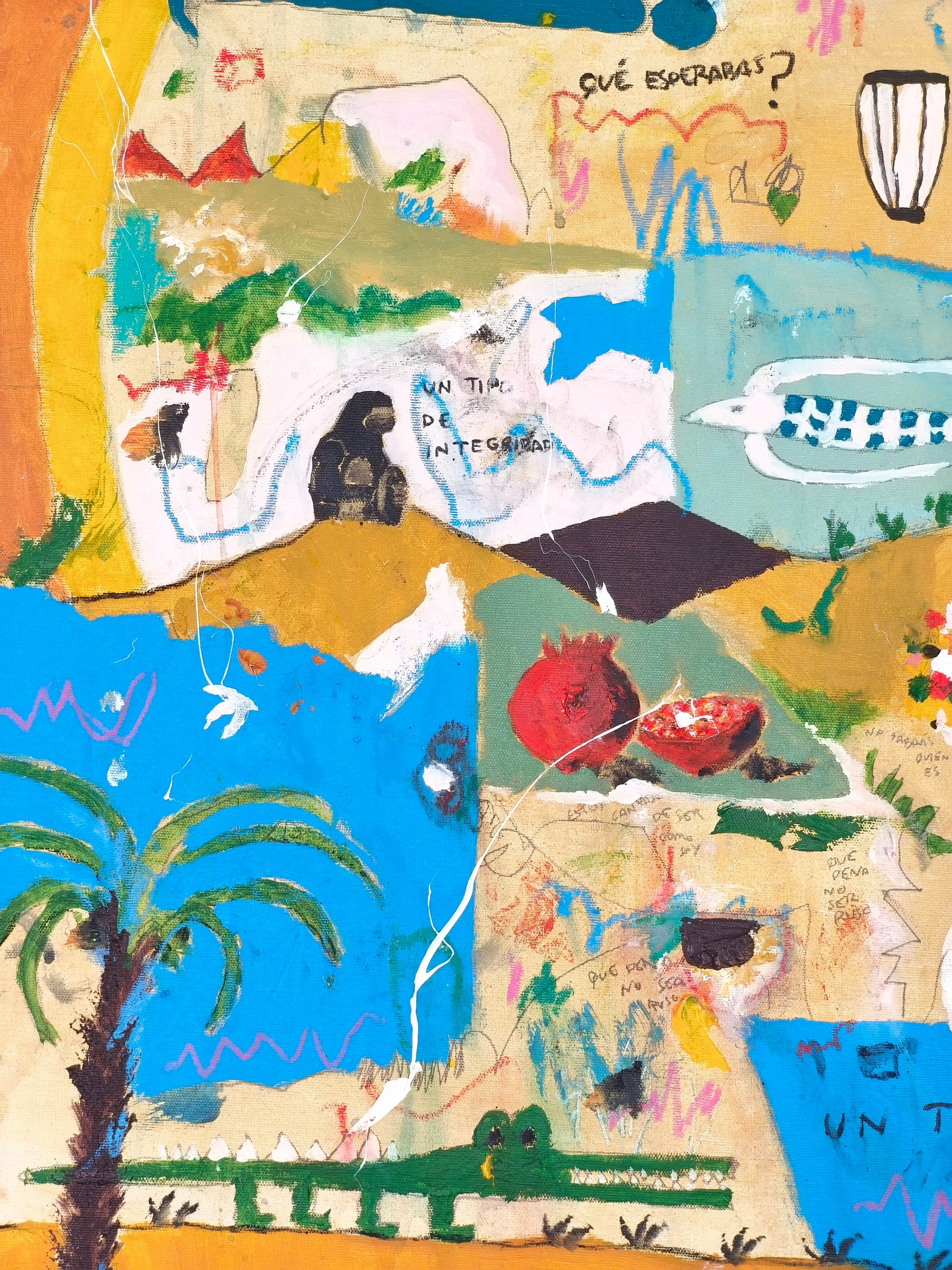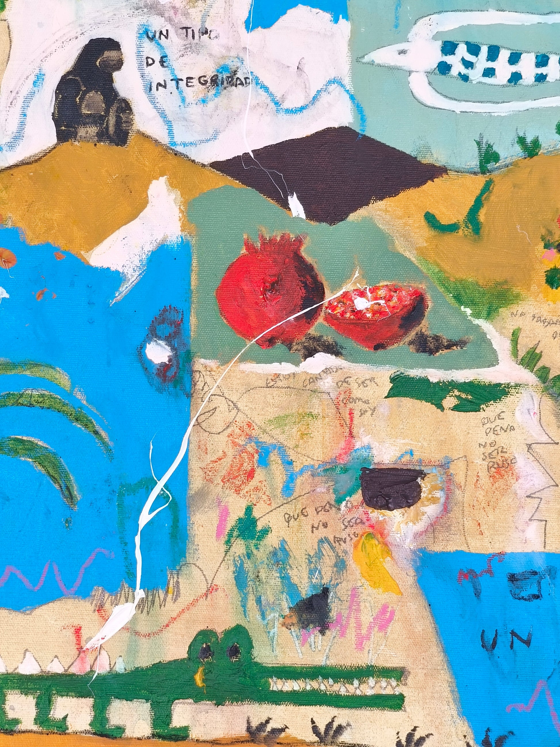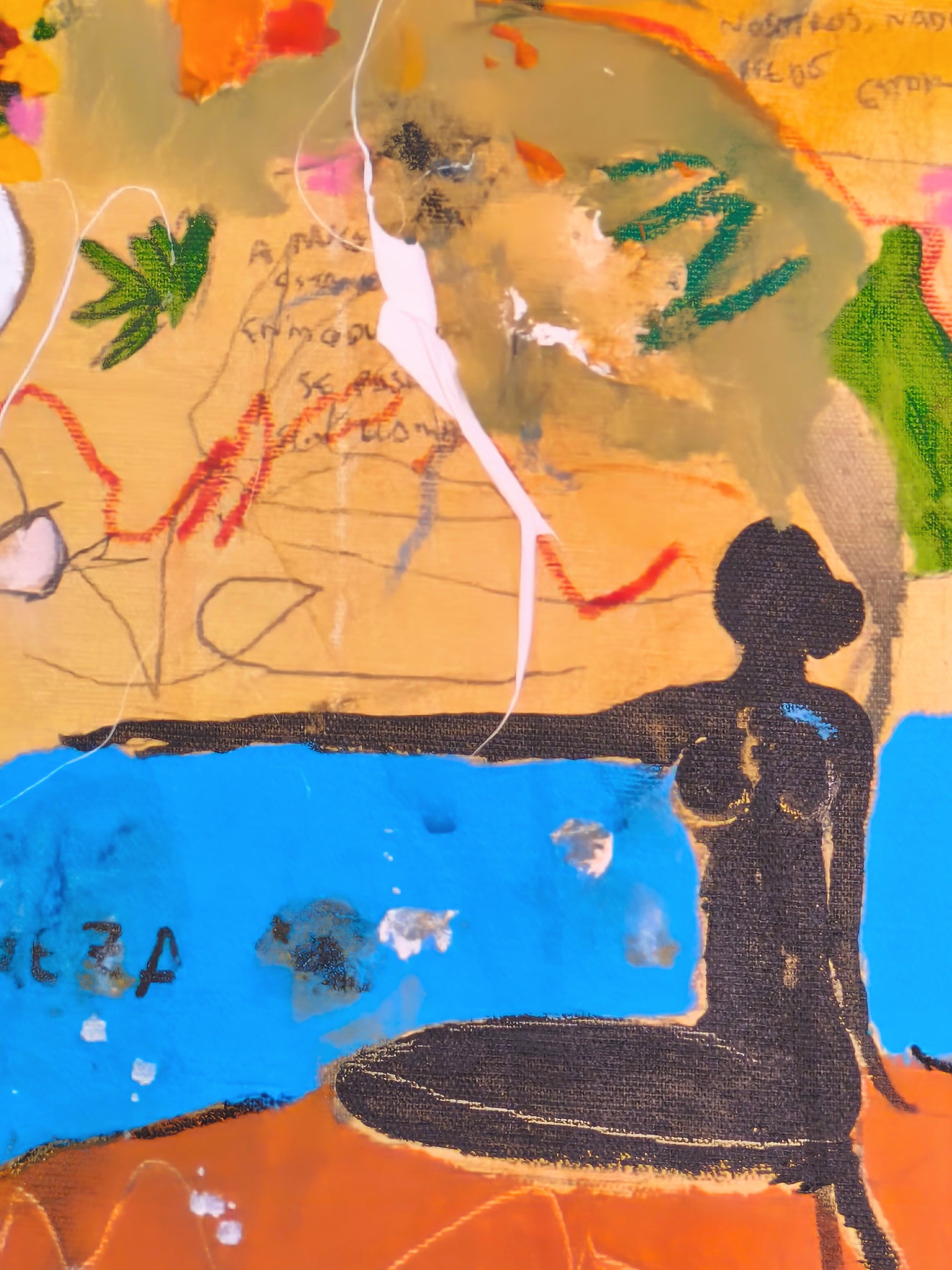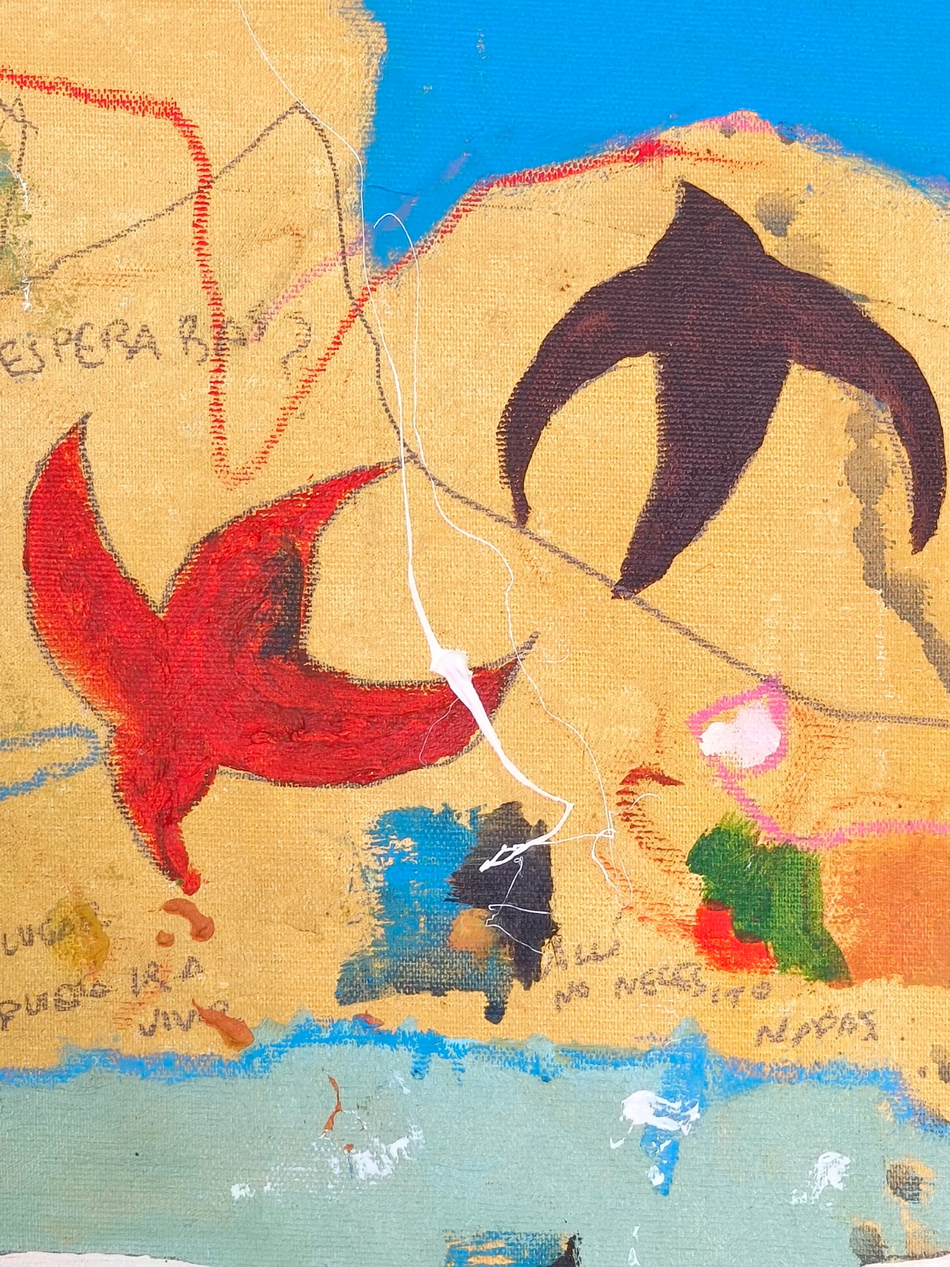 Técnica: acrílico, pigmentos, lápiz, carboncillo, gesso, ceras.
