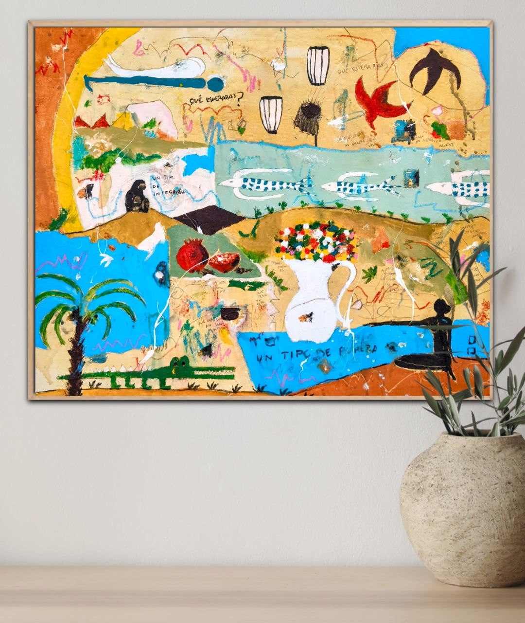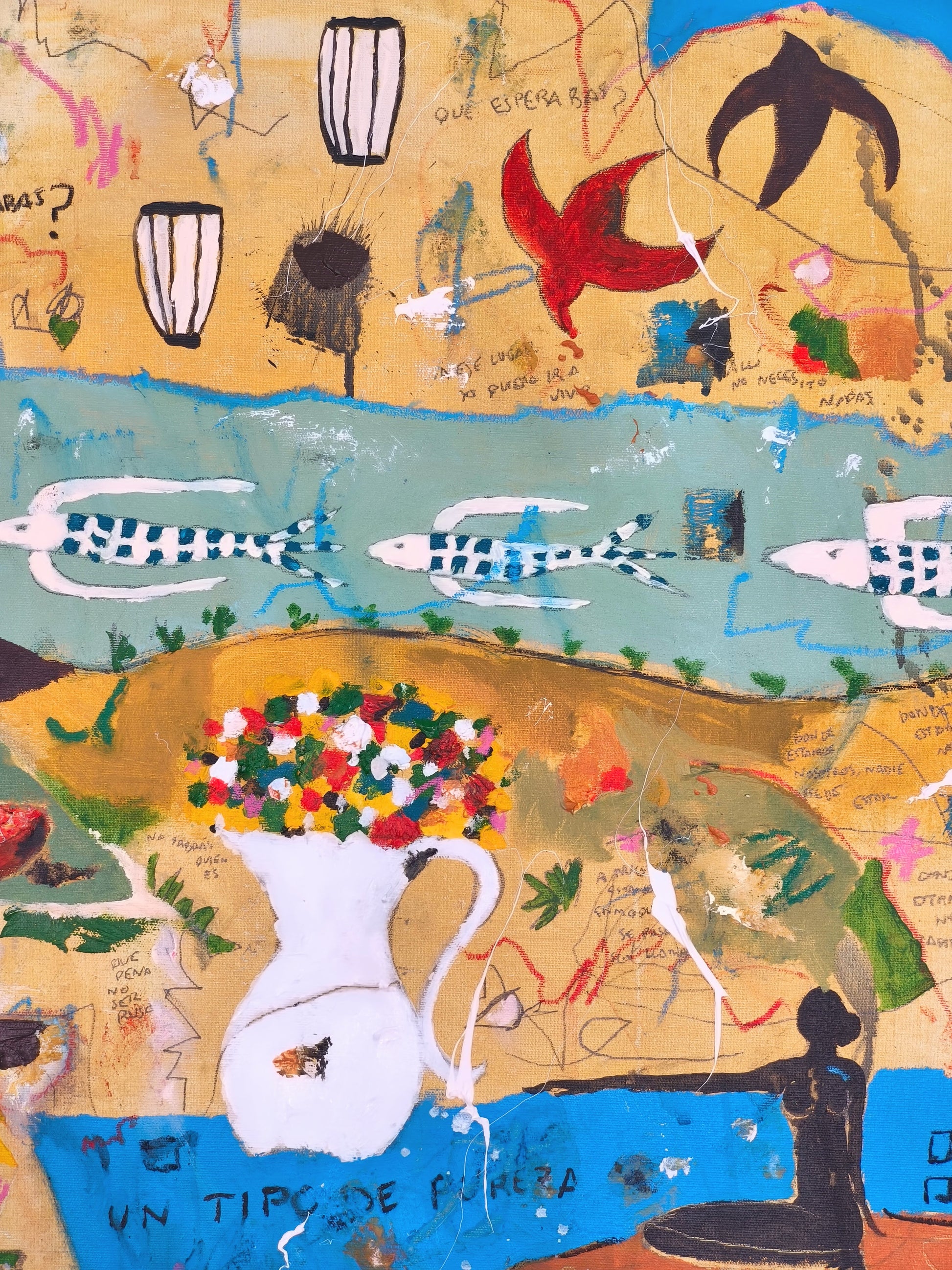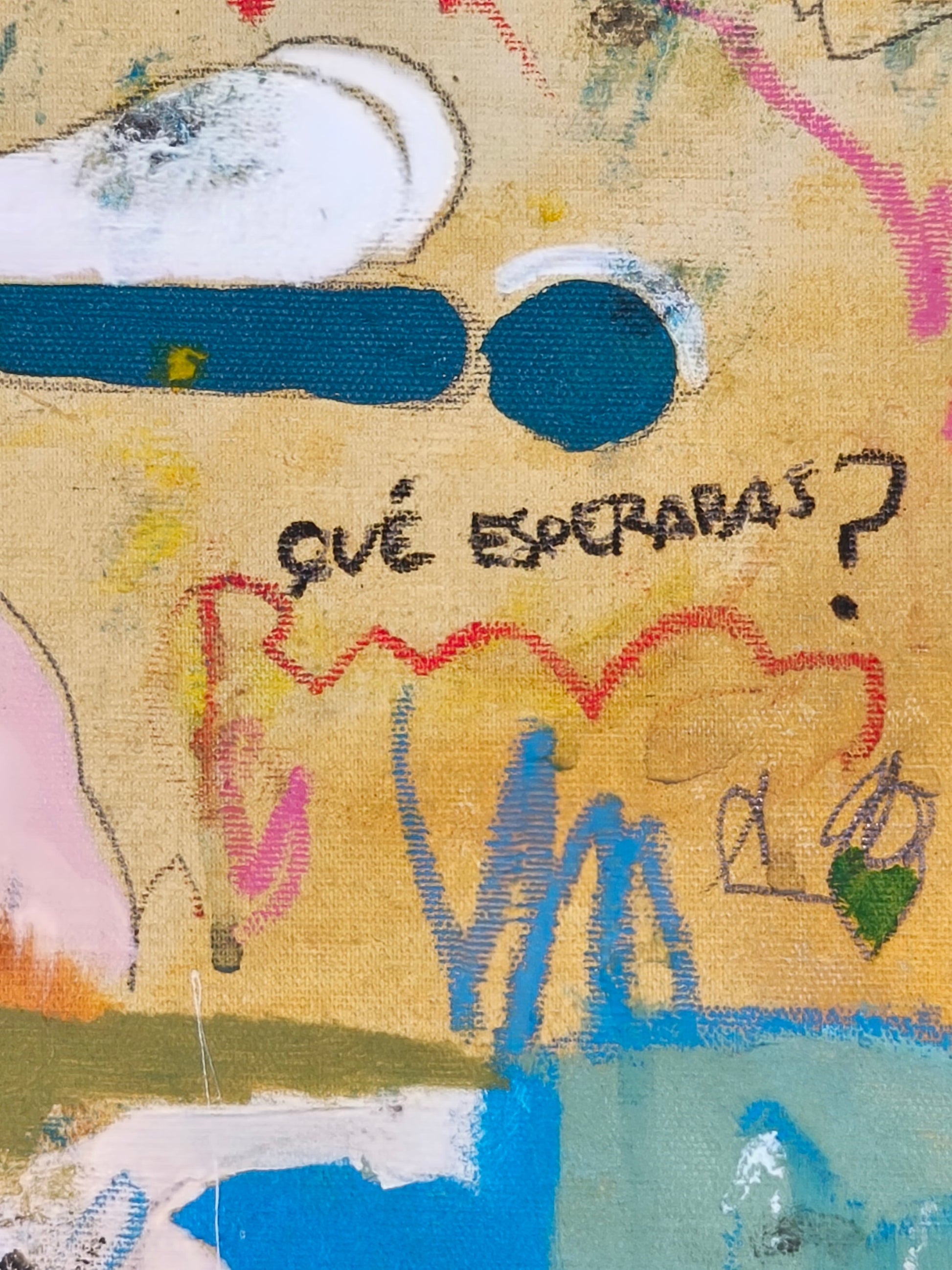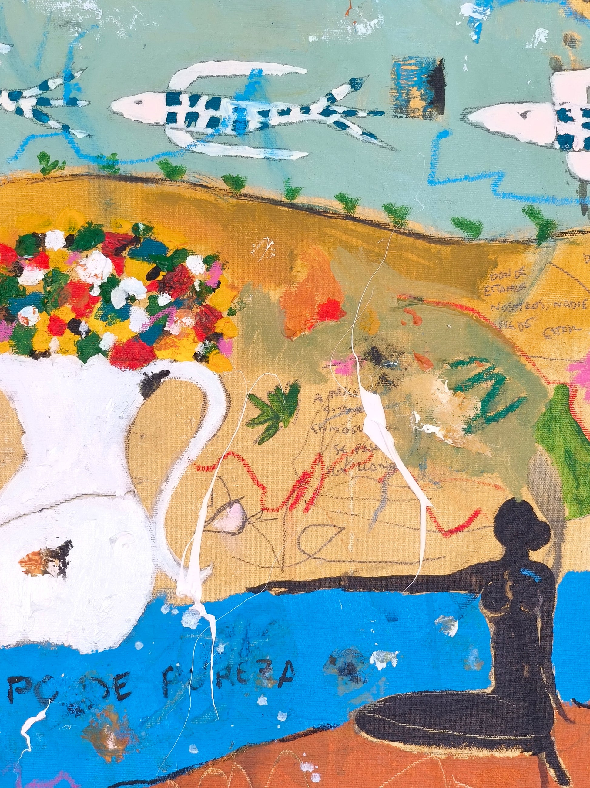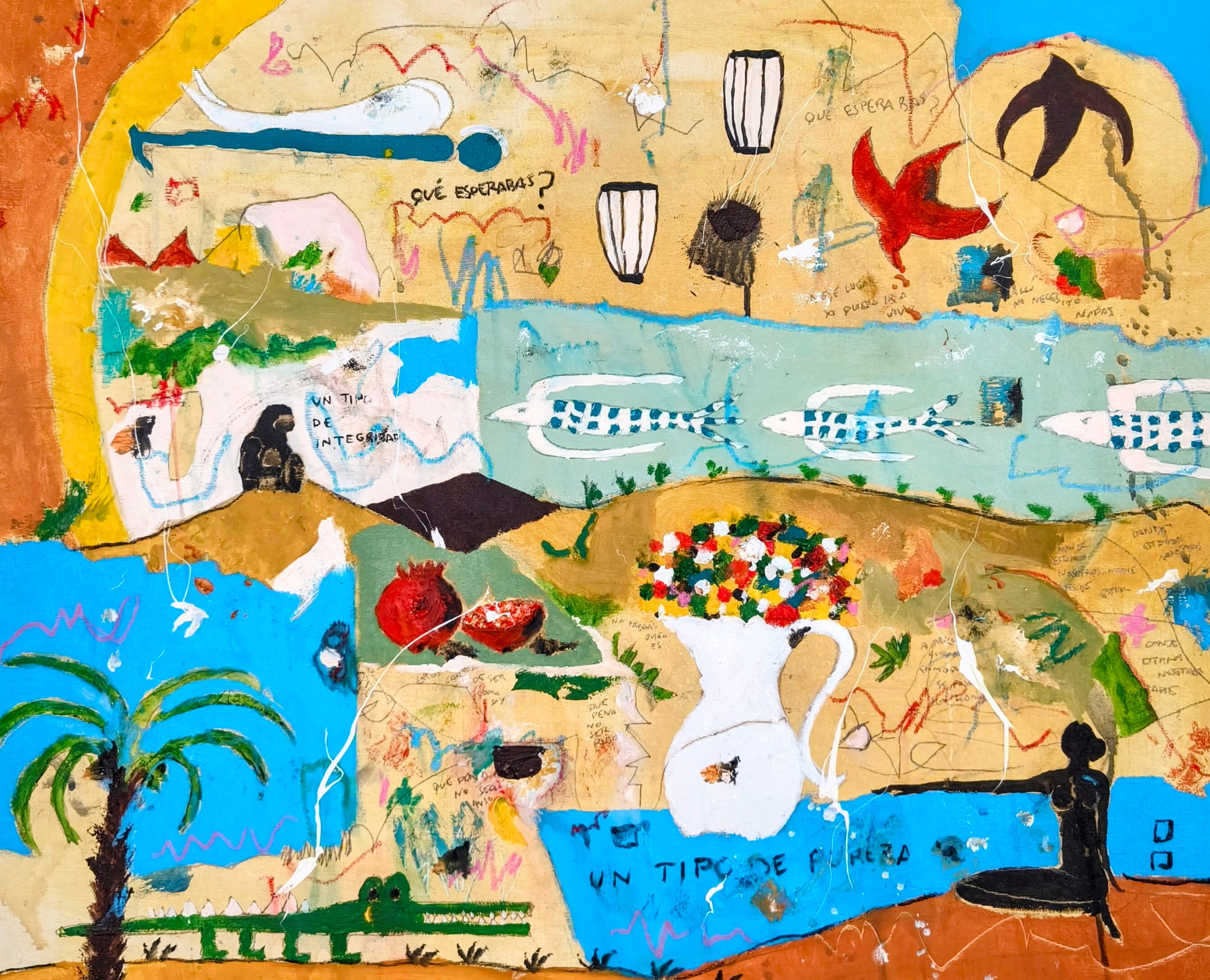 Técnica: acrílico, pigmentos, lápiz, carboncillo, gesso, ceras.