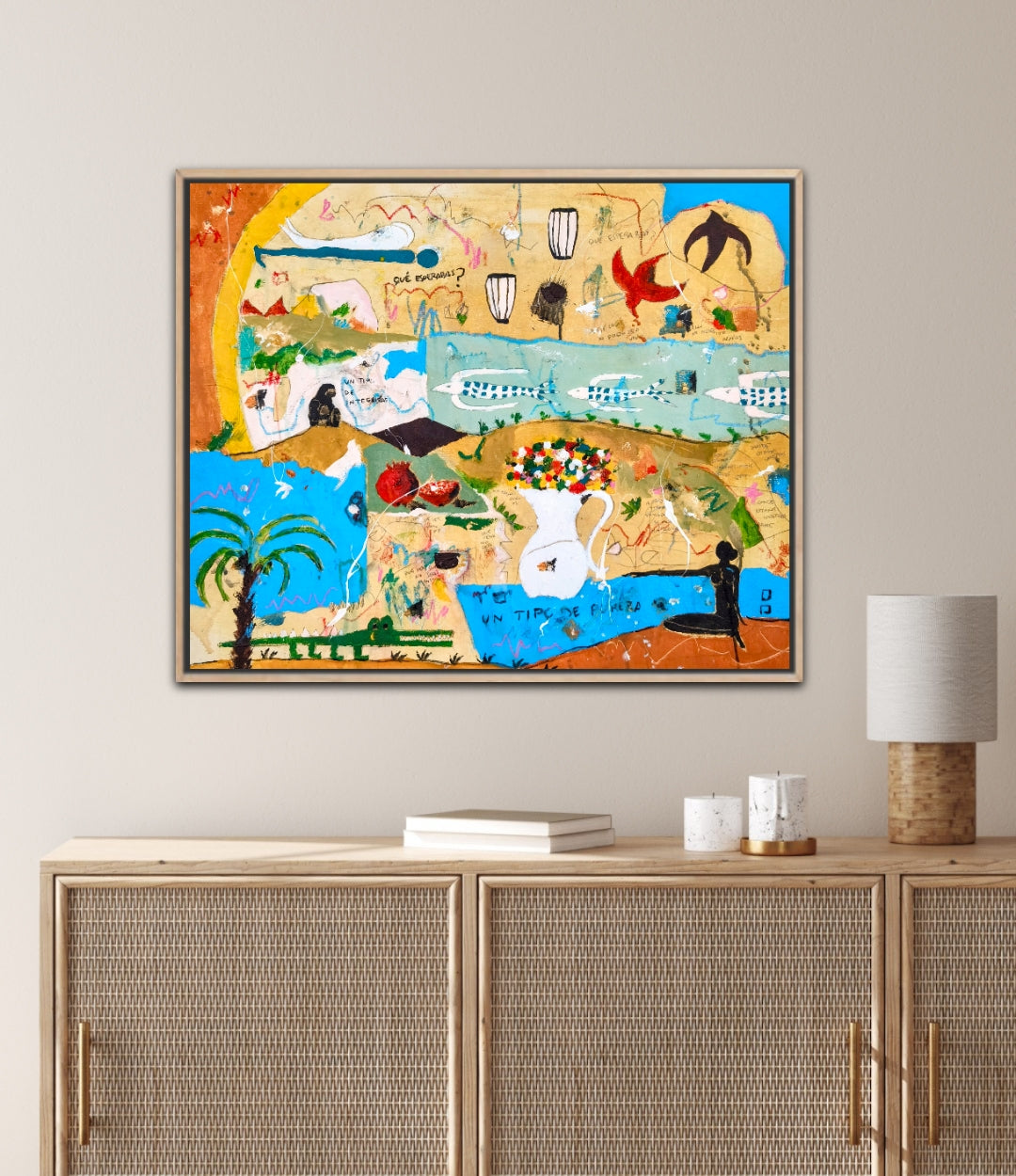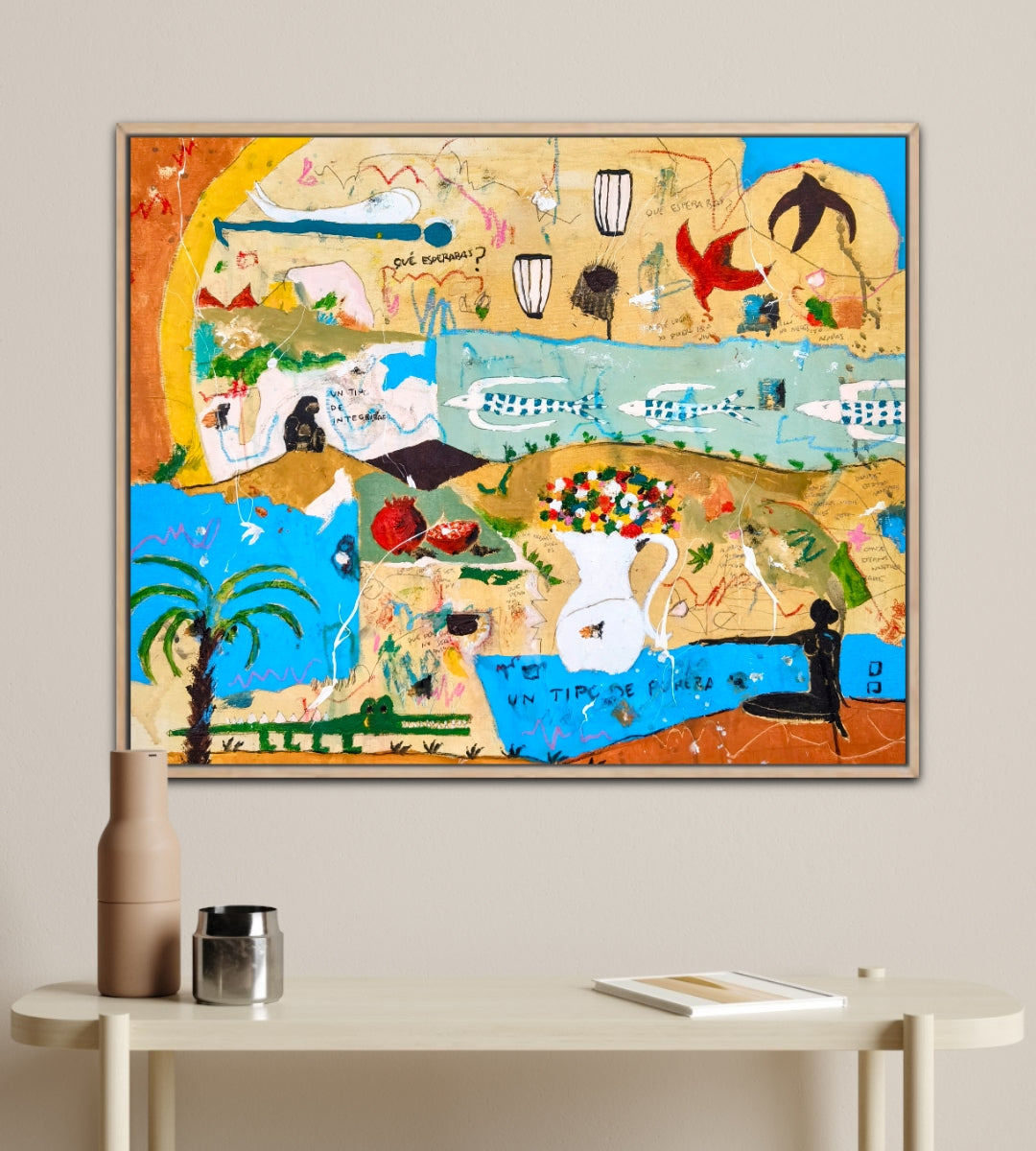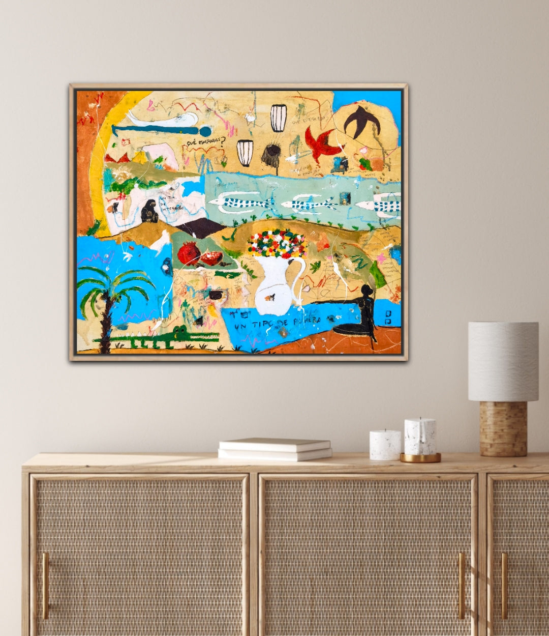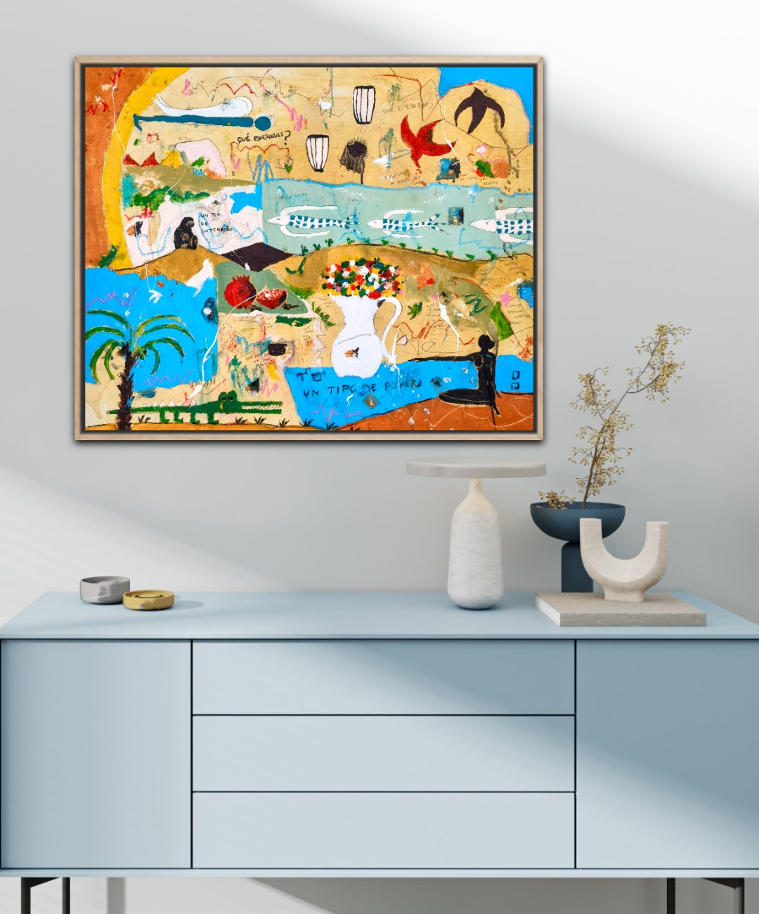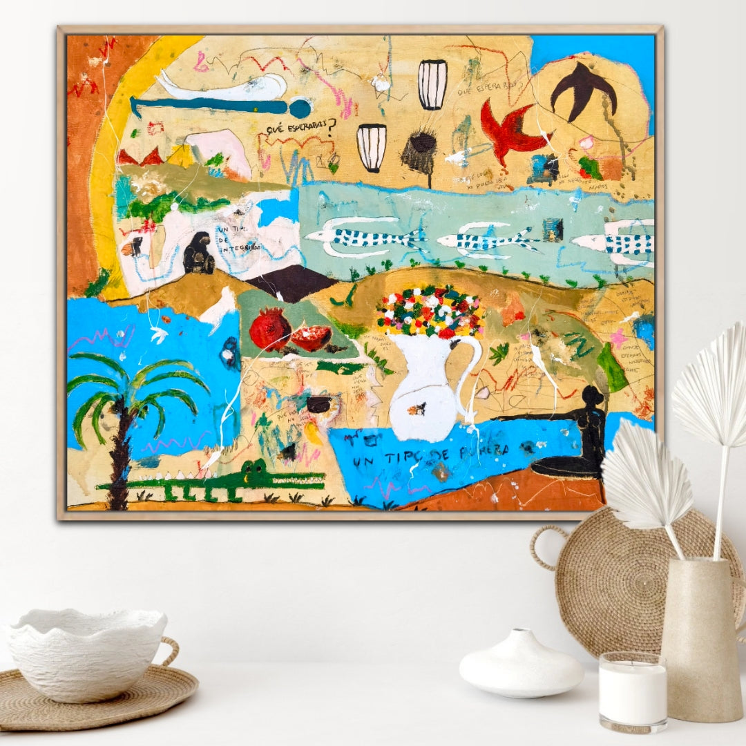 Técnica: acrílico, pigmentos, lápiz, carboncillo, gesso, ceras.