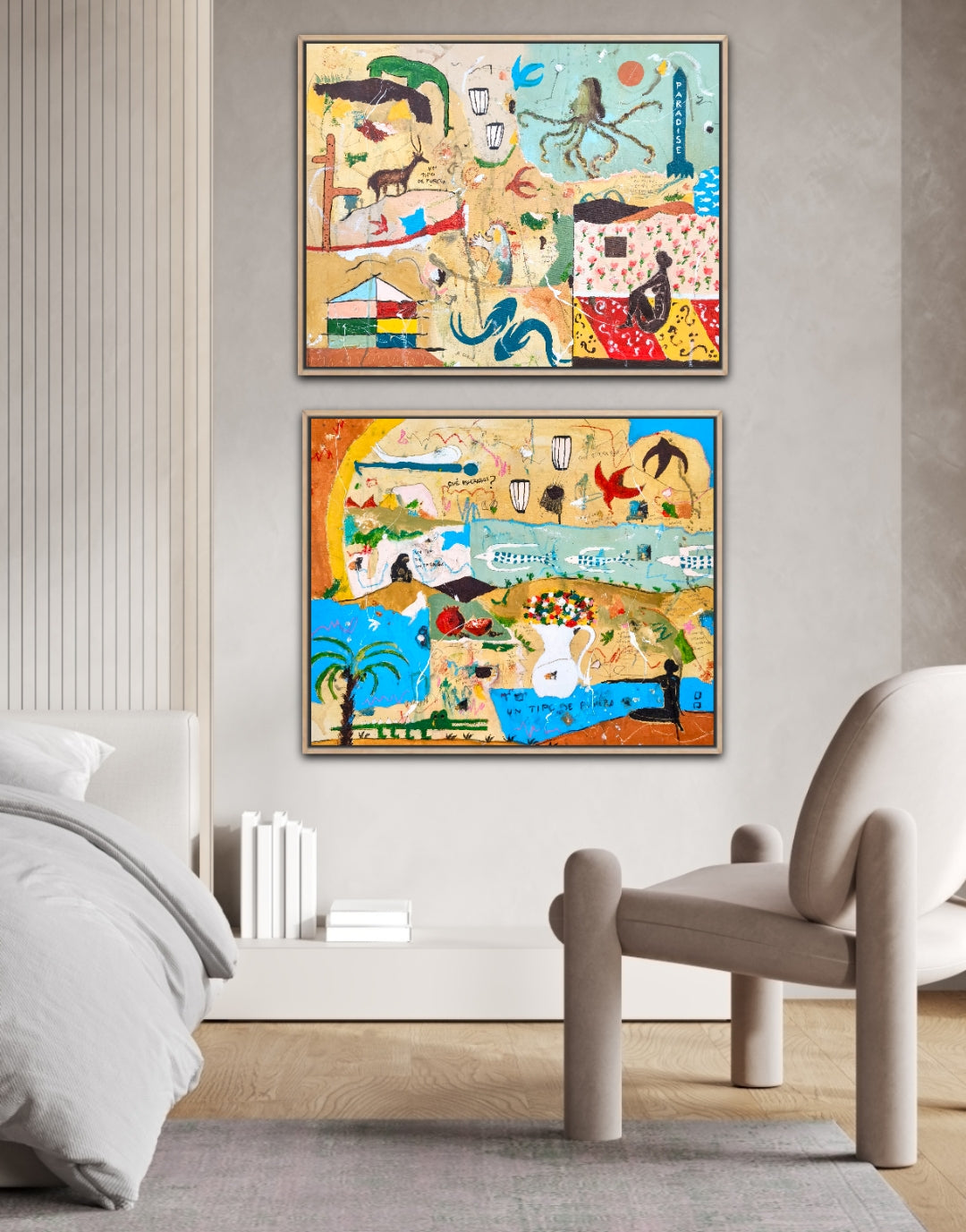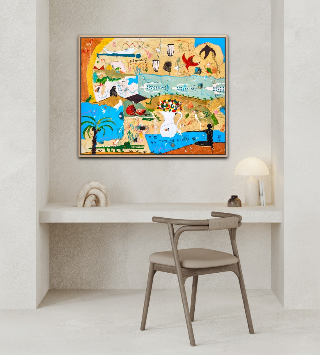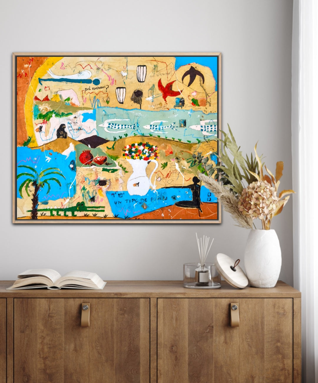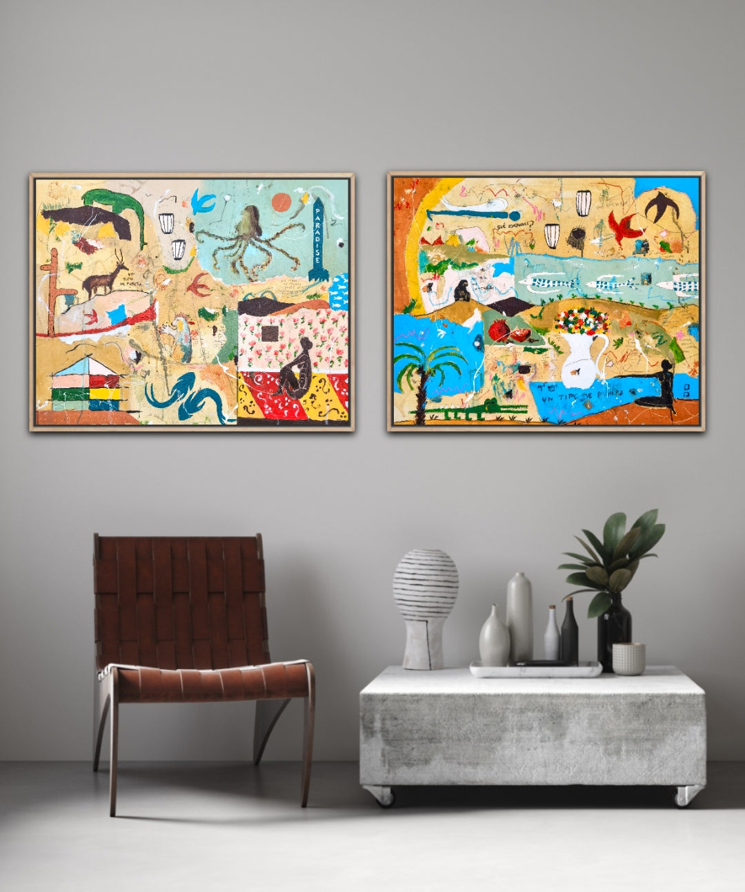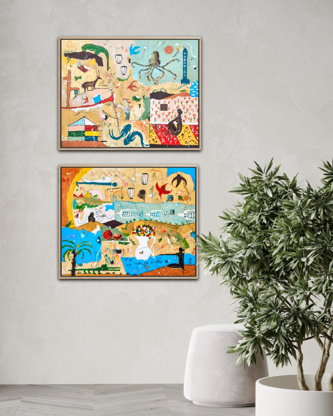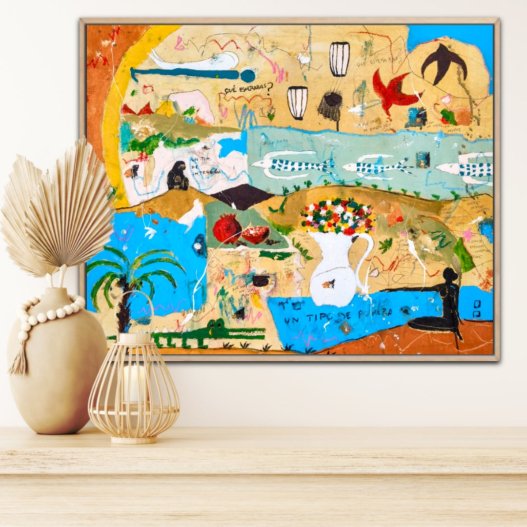 Técnica: acrílico, pigmentos, lápiz, carboncillo, gesso, ceras.