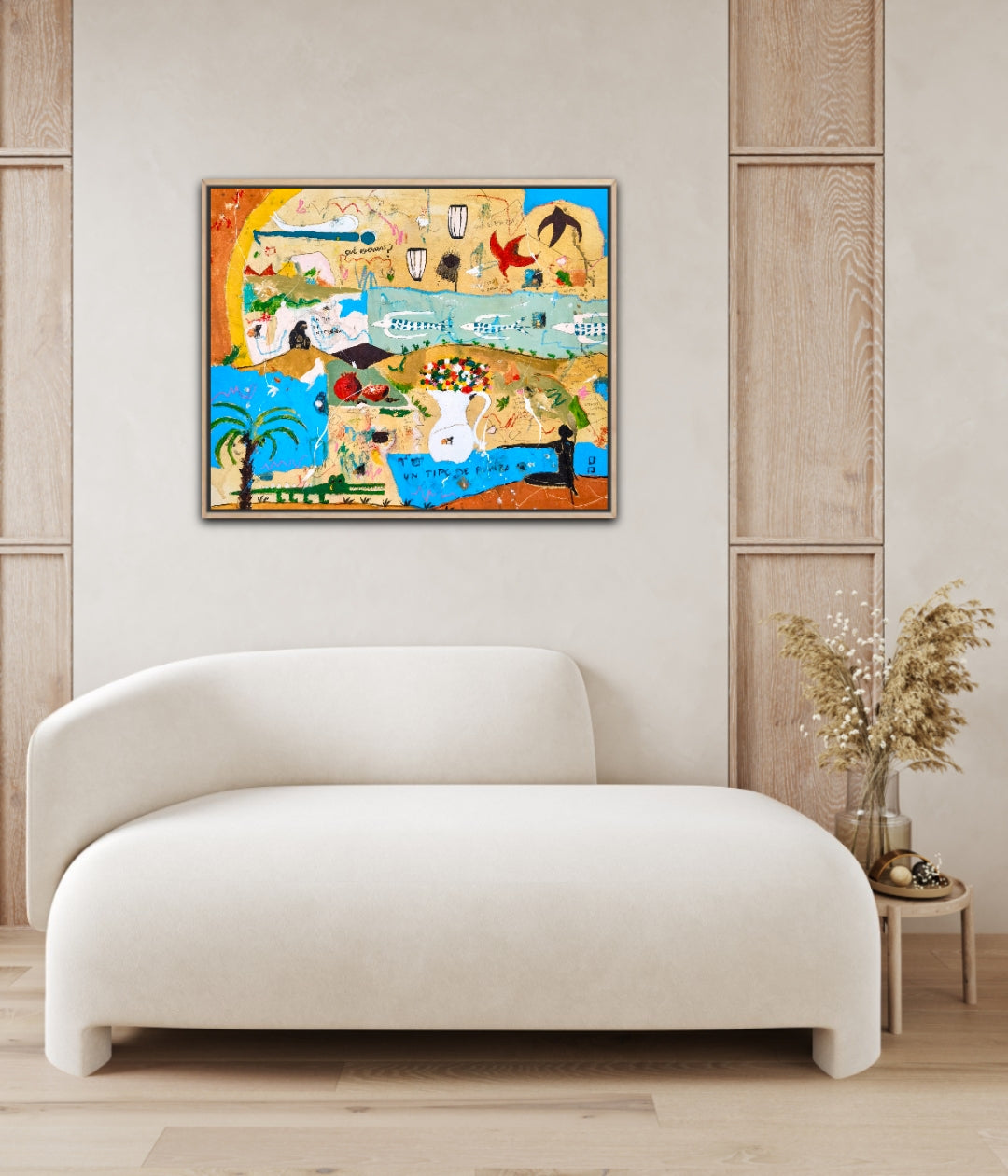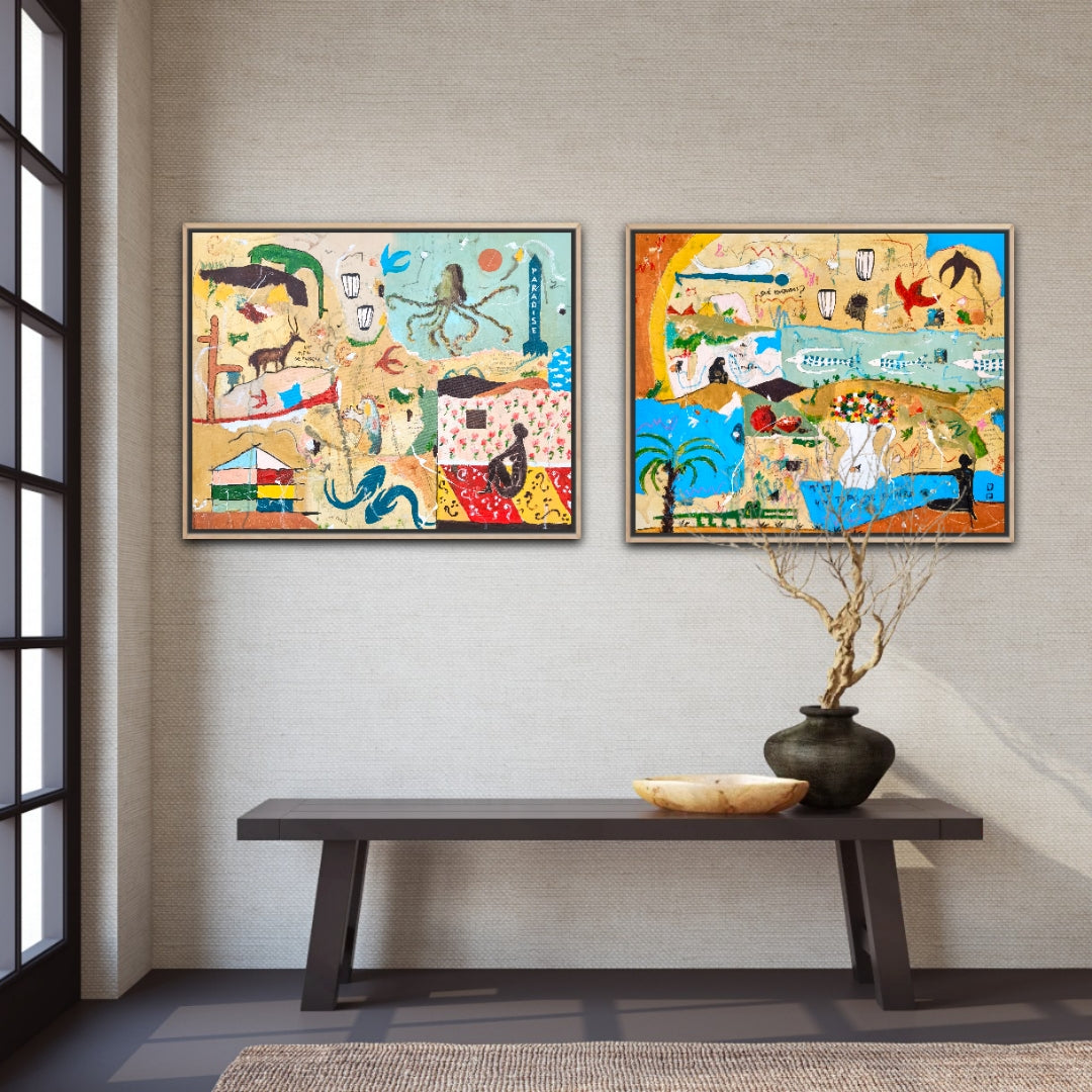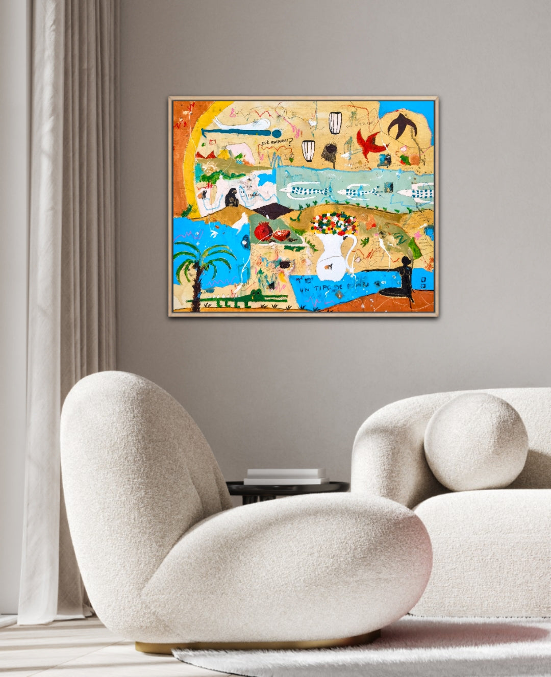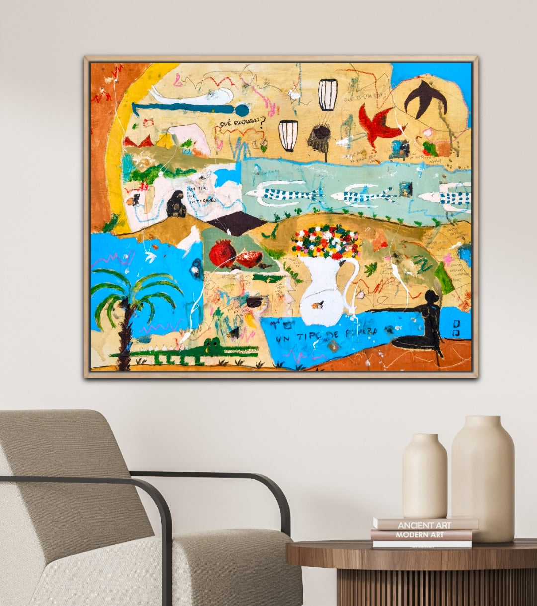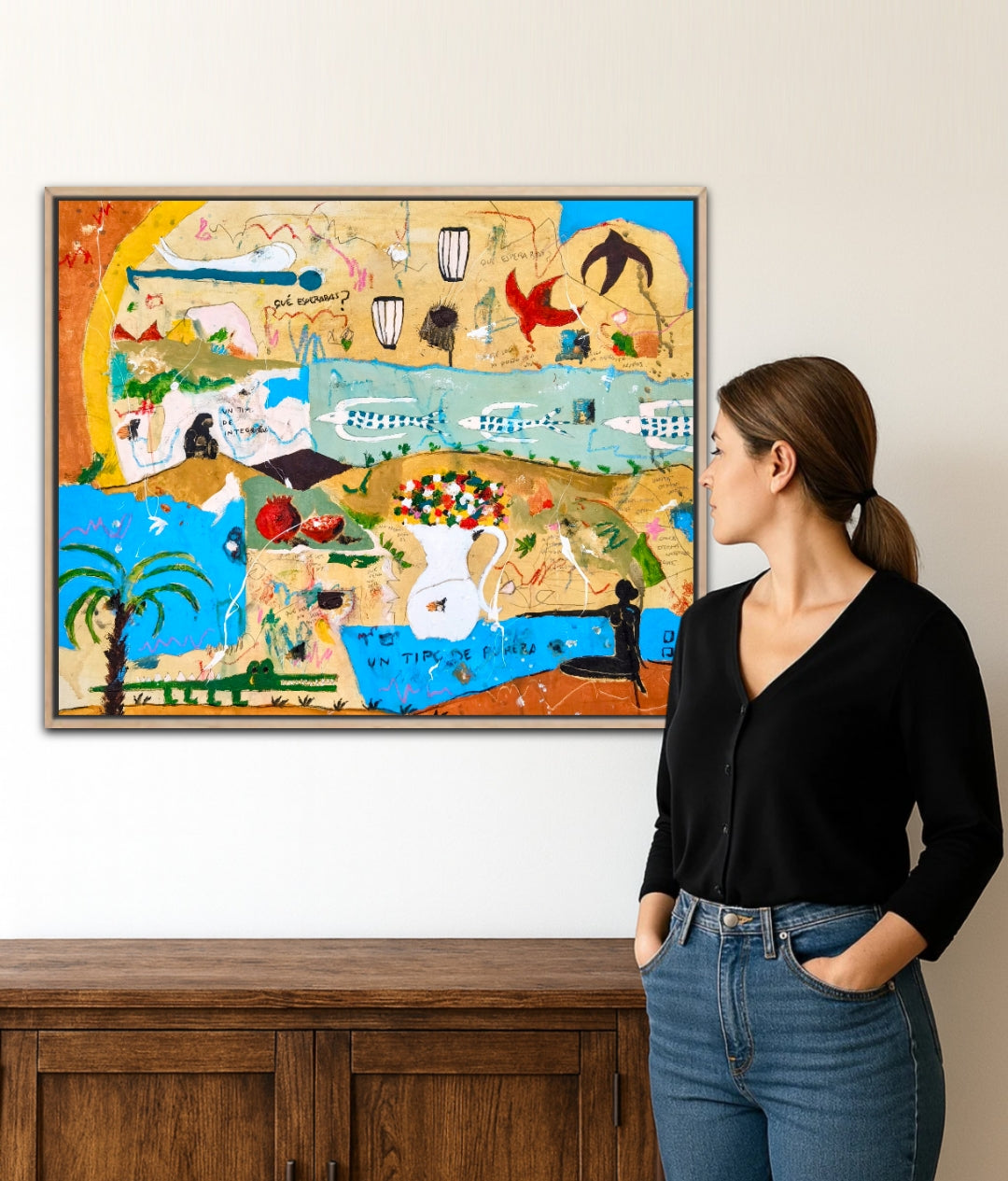 Técnica: acrílico, pigmentos, lápiz, carboncillo, gesso, ceras.