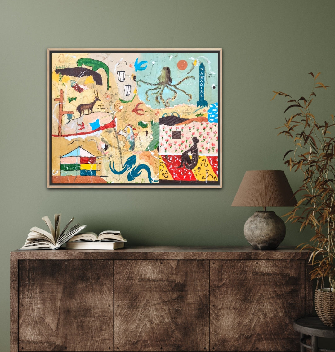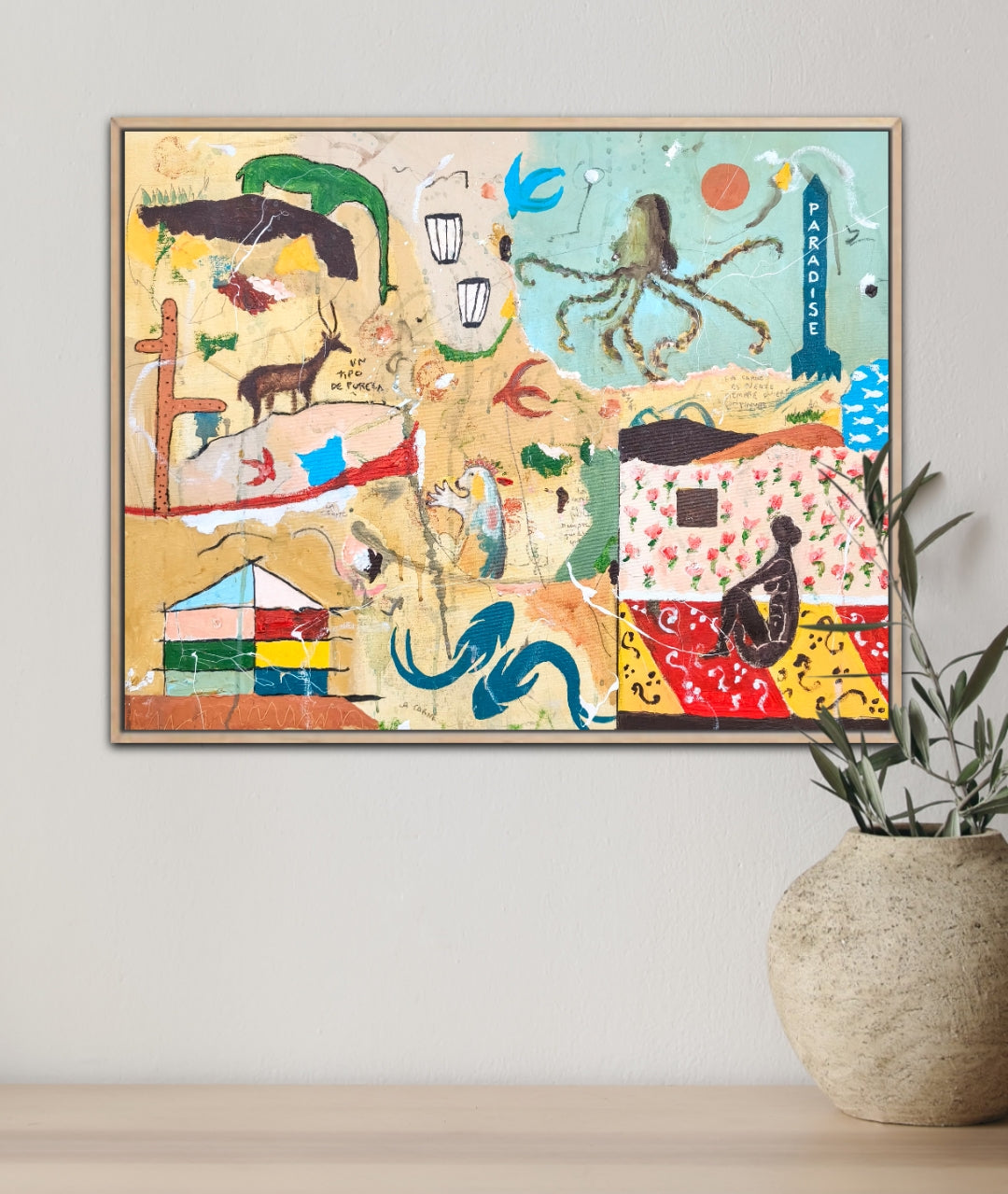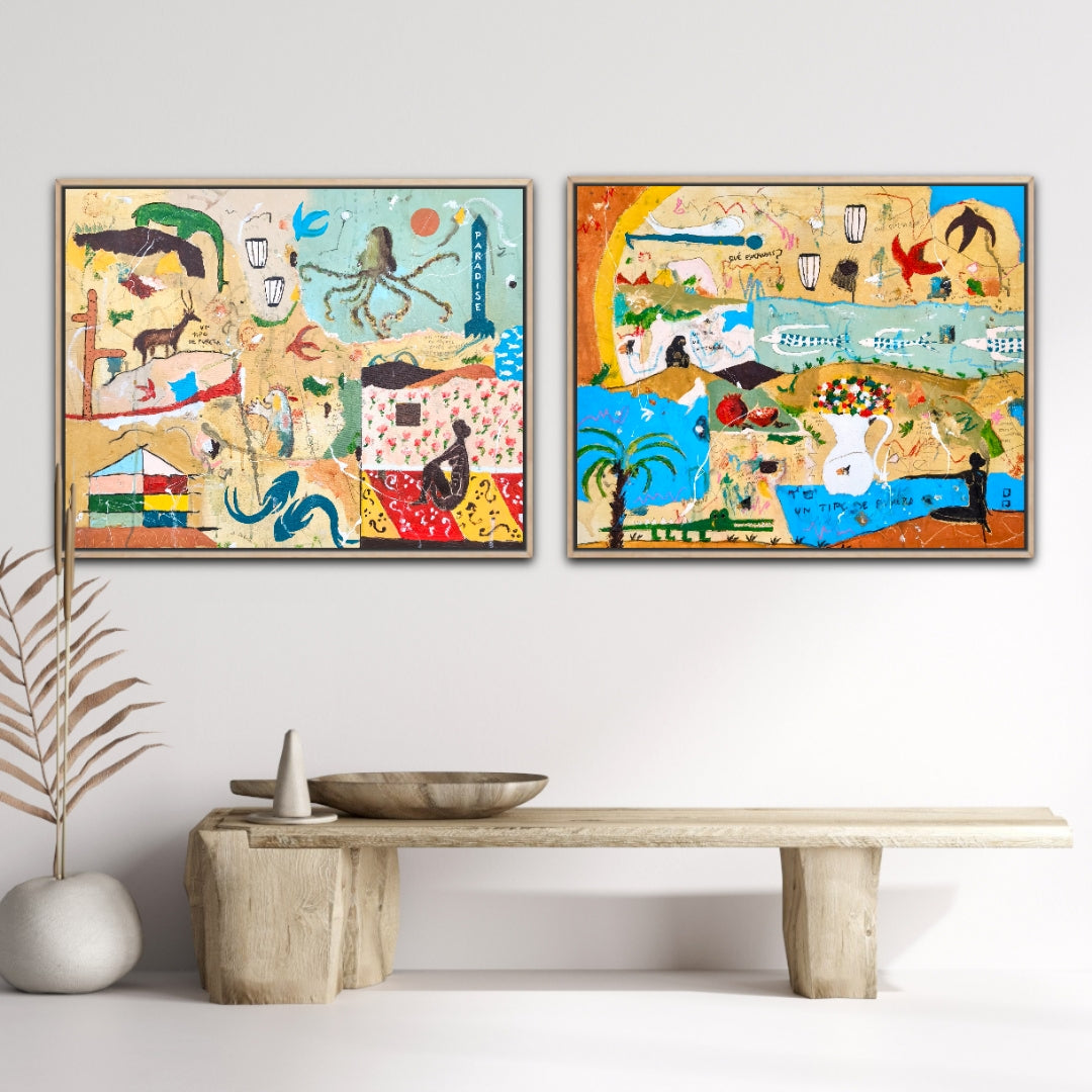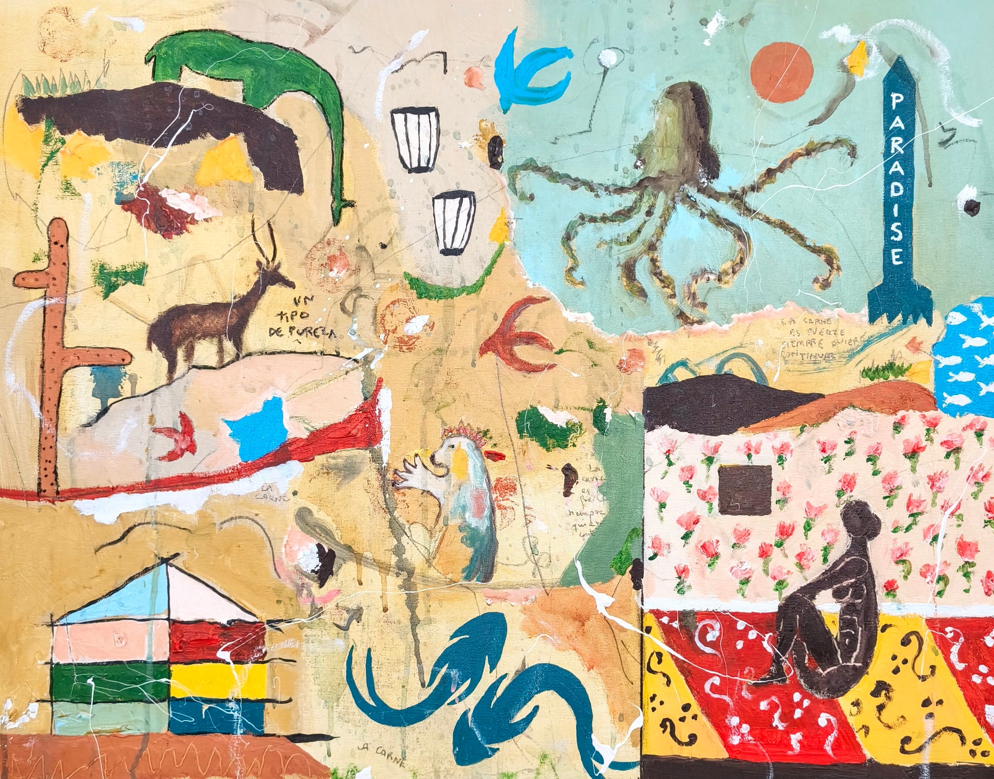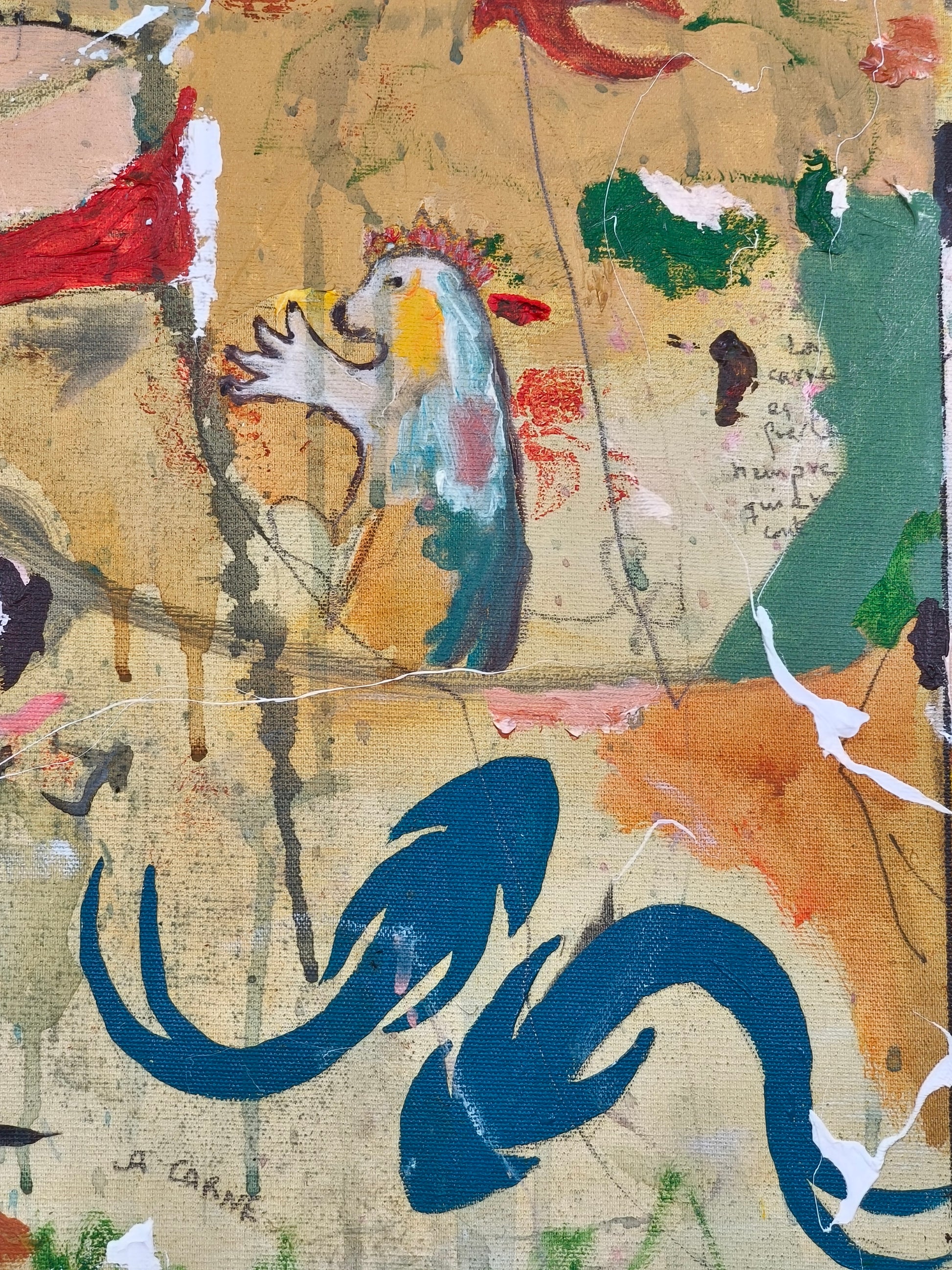 Técnica: acrílico, pigmentos, lápiz, carboncillo, gesso, ceras.
