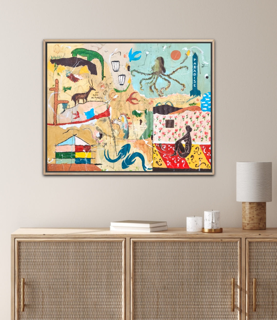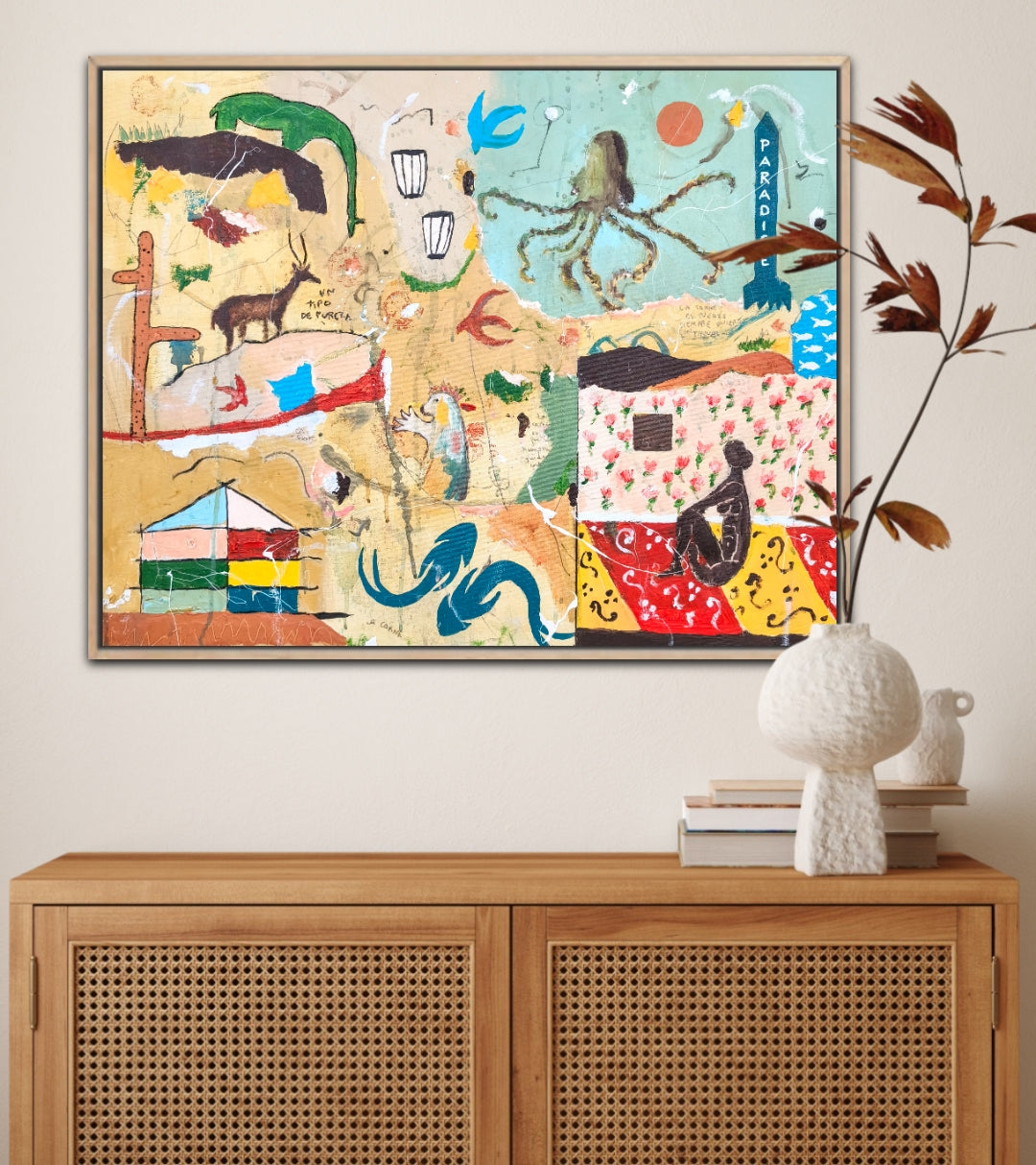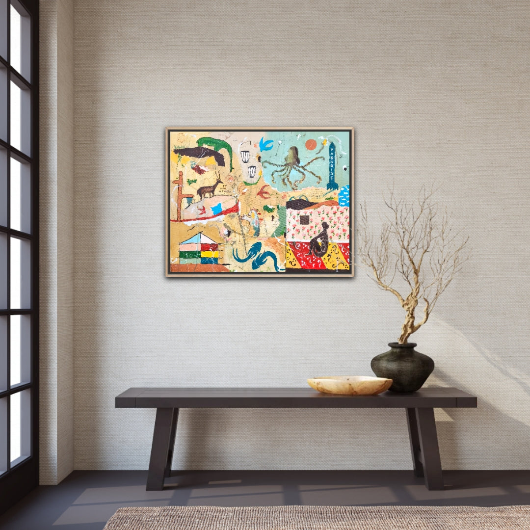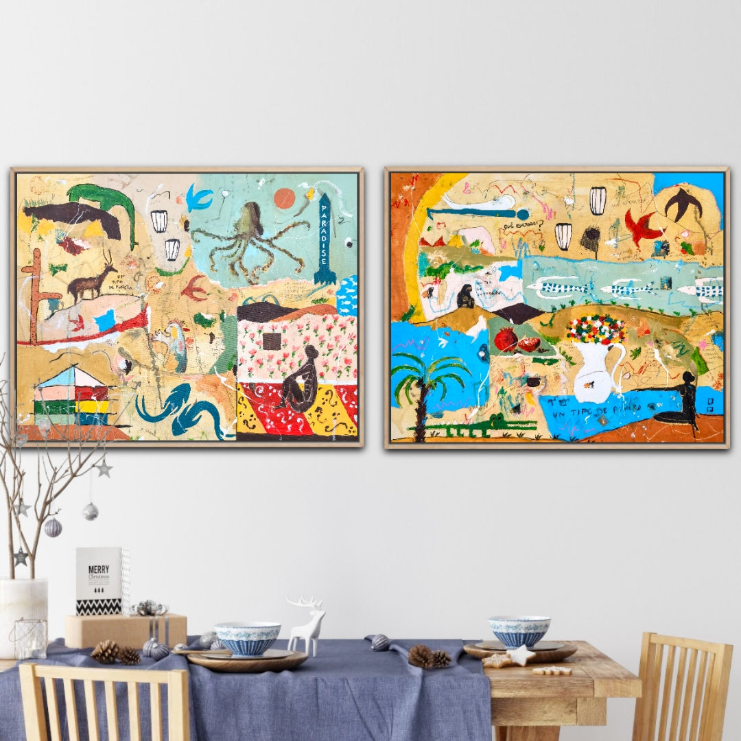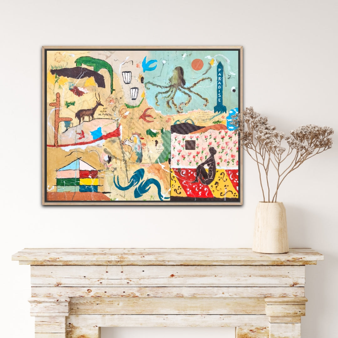 Técnica: acrílico, pigmentos, lápiz, carboncillo, gesso, ceras.