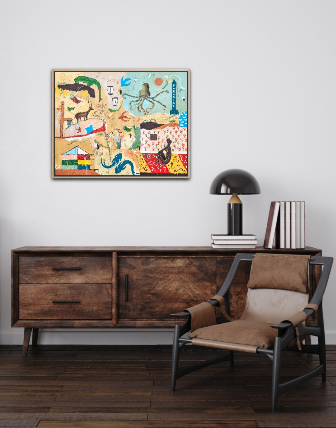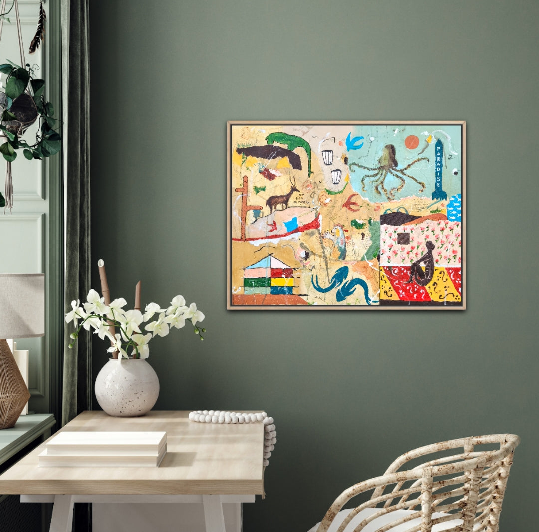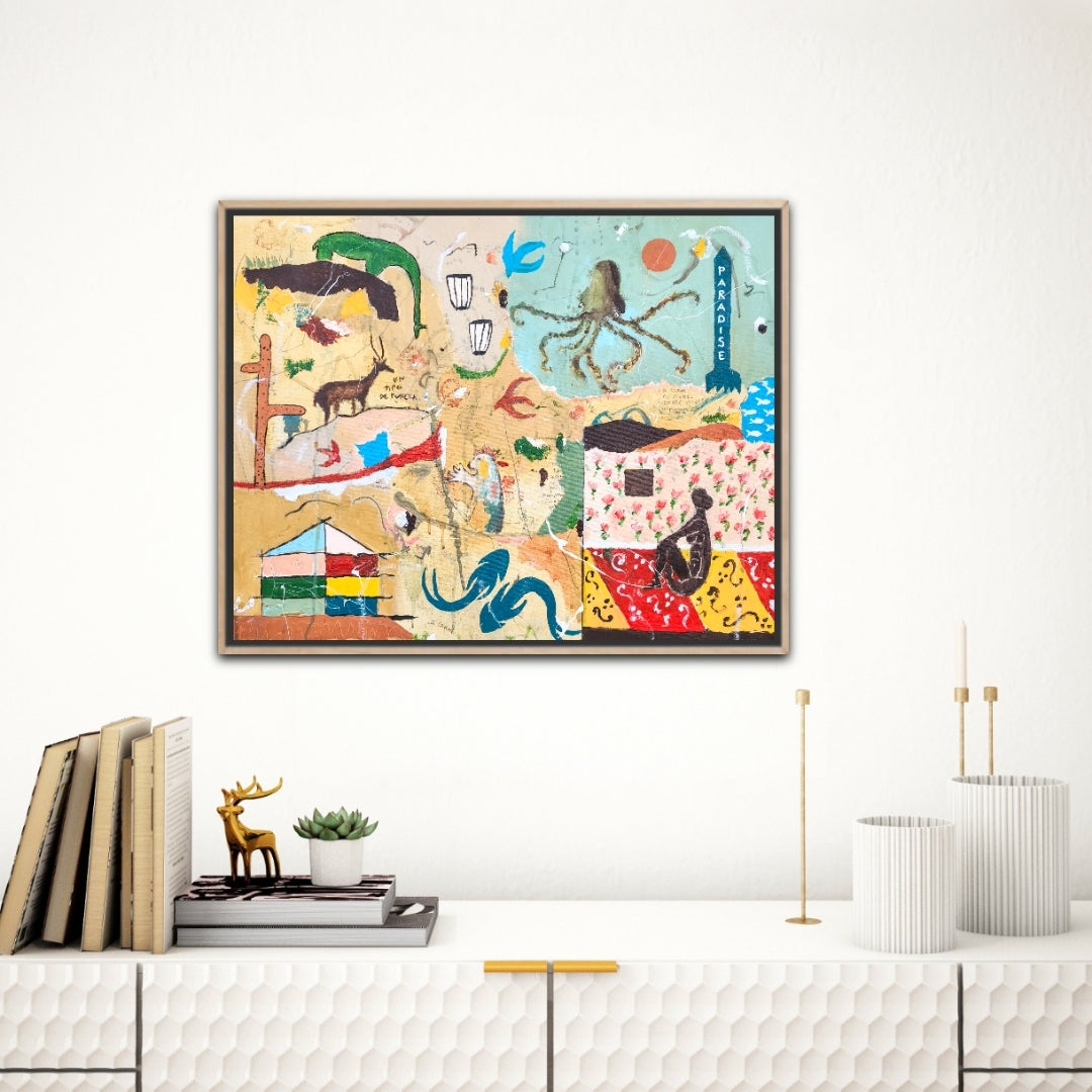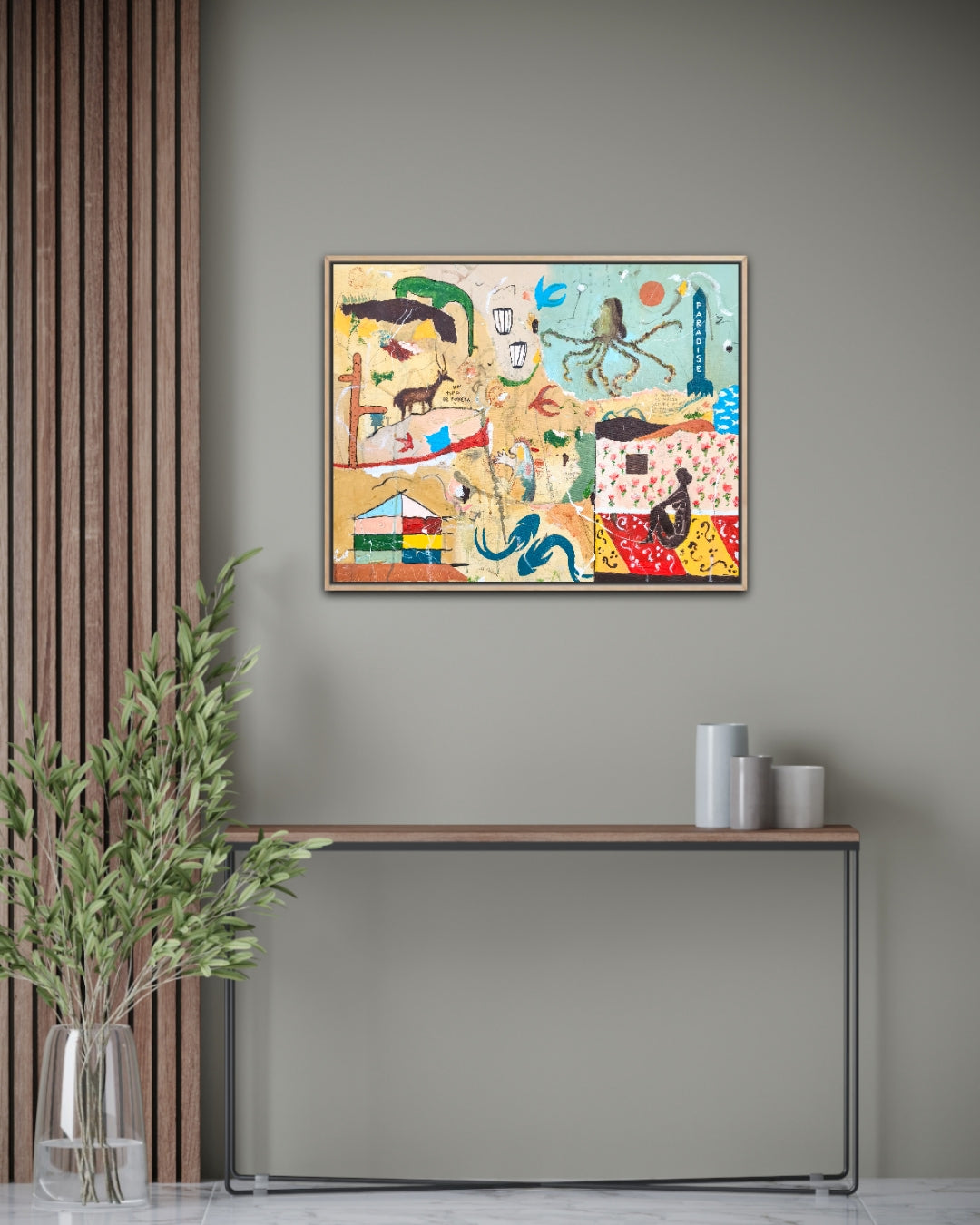 Técnica: acrílico, pigmentos, lápiz, carboncillo, gesso, ceras.