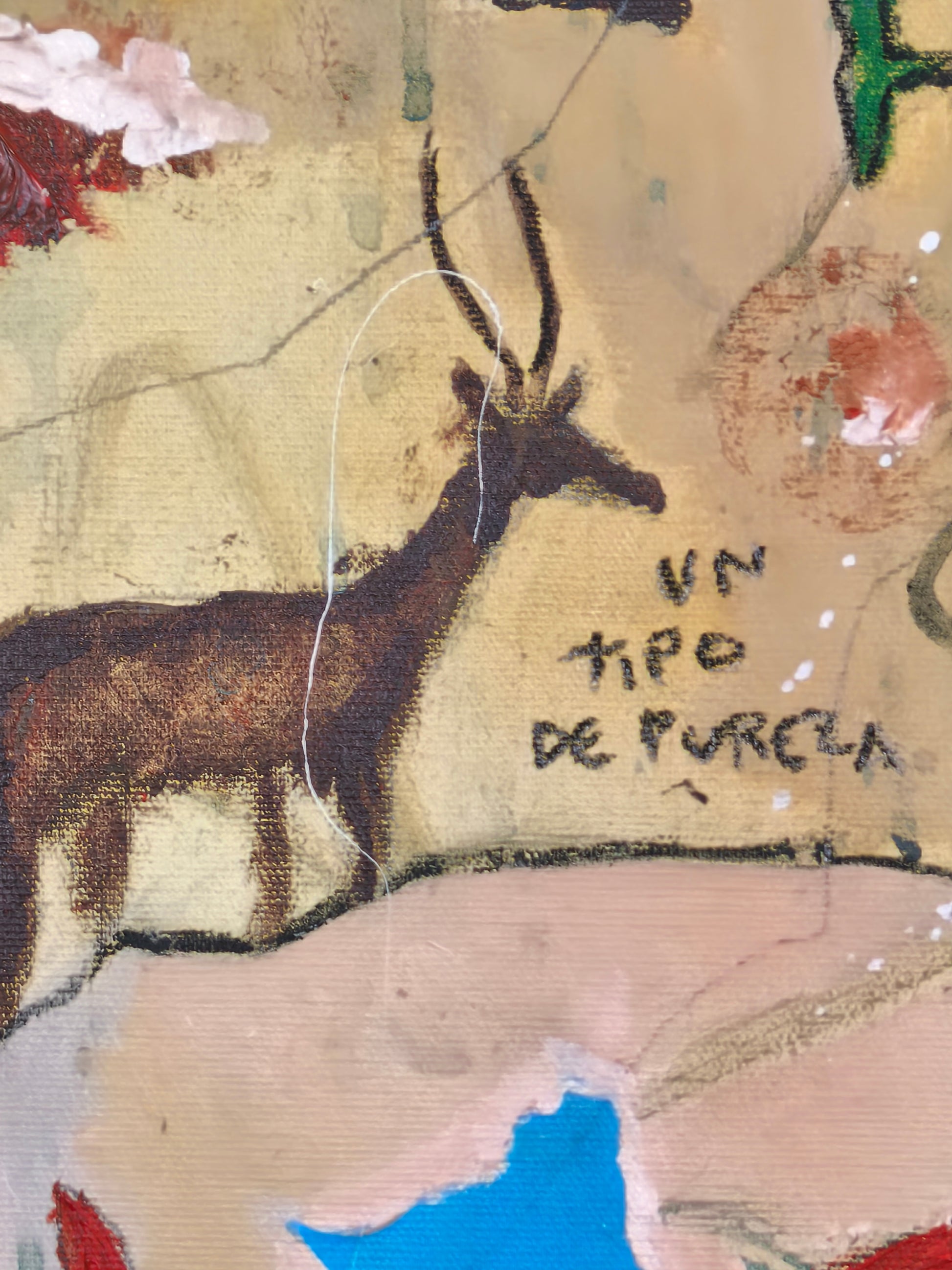 Pintura gestual, intuitiva, que deja que las cosas pasen y se apoya sobre lo que aparece. Aprovechando el accidente y aceptando las consecuencias.